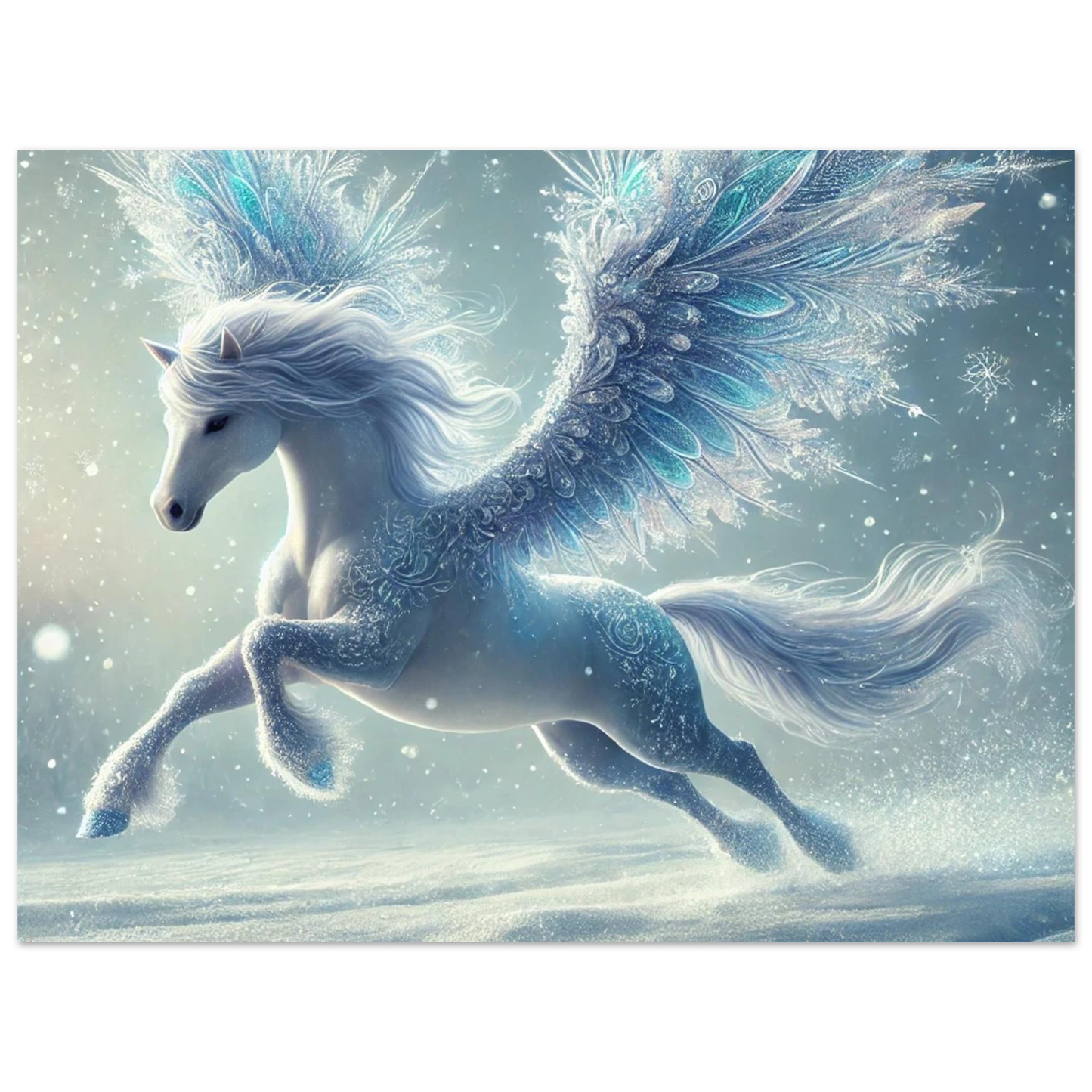Isaluna, das geflügelte Pferd aus Eis und Mondlicht, schwebt lautlos durch die tiefsten Winternächte. Ihr silberweißes Fell glitzert wie Schnee im Schein des Nordlichts, ihre Flügel hinterlassen schimmernde Träume am Himmel. Sie ist nicht nur Wächterin des Winters – sie bringt Licht in dunkle Zeiten und erinnert uns an die Kraft der Stille.