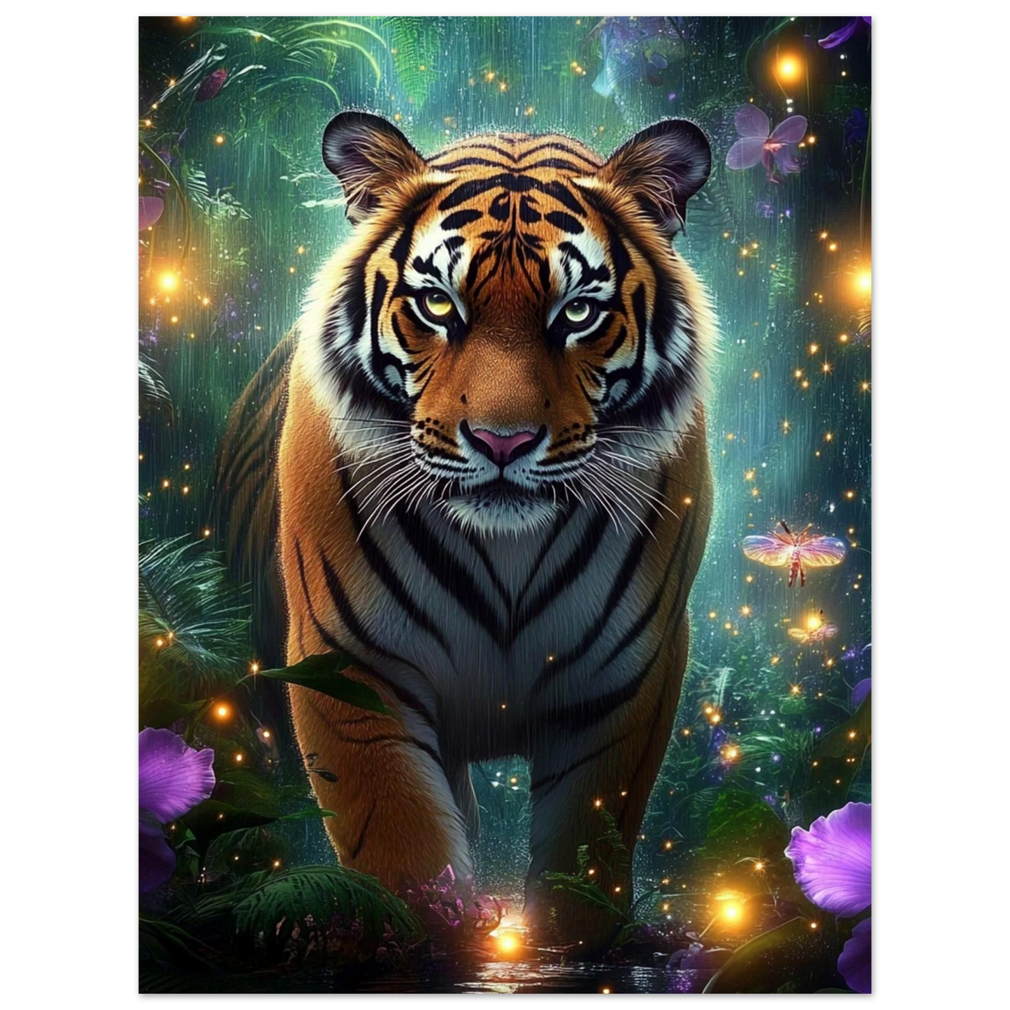 Tief im Herzen eines leuchtenden Dschungels lebt Lumitra – eine majestätische Tigerin mit uraltem Wissen. Umgeben von Glühwürmchenlicht wacht sie über den geheimen Wald und das Gleichgewicht der Natur. Wer ihrem prüfenden Blick begegnet, spürt Schutz, Ruhe – und vielleicht ein wenig Dschungelzauber.