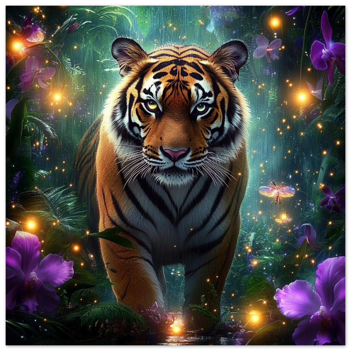Tief im Herzen eines leuchtenden Dschungels lebt Lumitra – eine majestätische Tigerin mit uraltem Wissen. Umgeben von Glühwürmchenlicht wacht sie über den geheimen Wald und das Gleichgewicht der Natur. Wer ihrem prüfenden Blick begegnet, spürt Schutz, Ruhe – und vielleicht ein wenig Dschungelzauber.