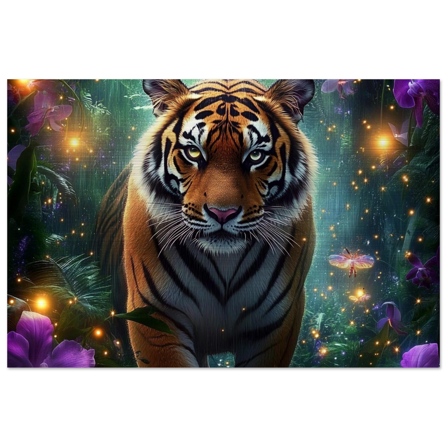 Tauche ein in die Tiefe des geheimen Urwalds – mit Lumitra, der majestätischen Dschungelwächterin. Ihre anmutige Erscheinung und das Leuchten ihrer Augen kommen auf gebürstetem Aluminium besonders kraftvoll zur Geltung. Die silberne Metallic-Oberfläche verleiht dem Motiv eine faszinierende Tiefe und Textur – wie das Glitzern von Glühwürmchen in der Nacht.