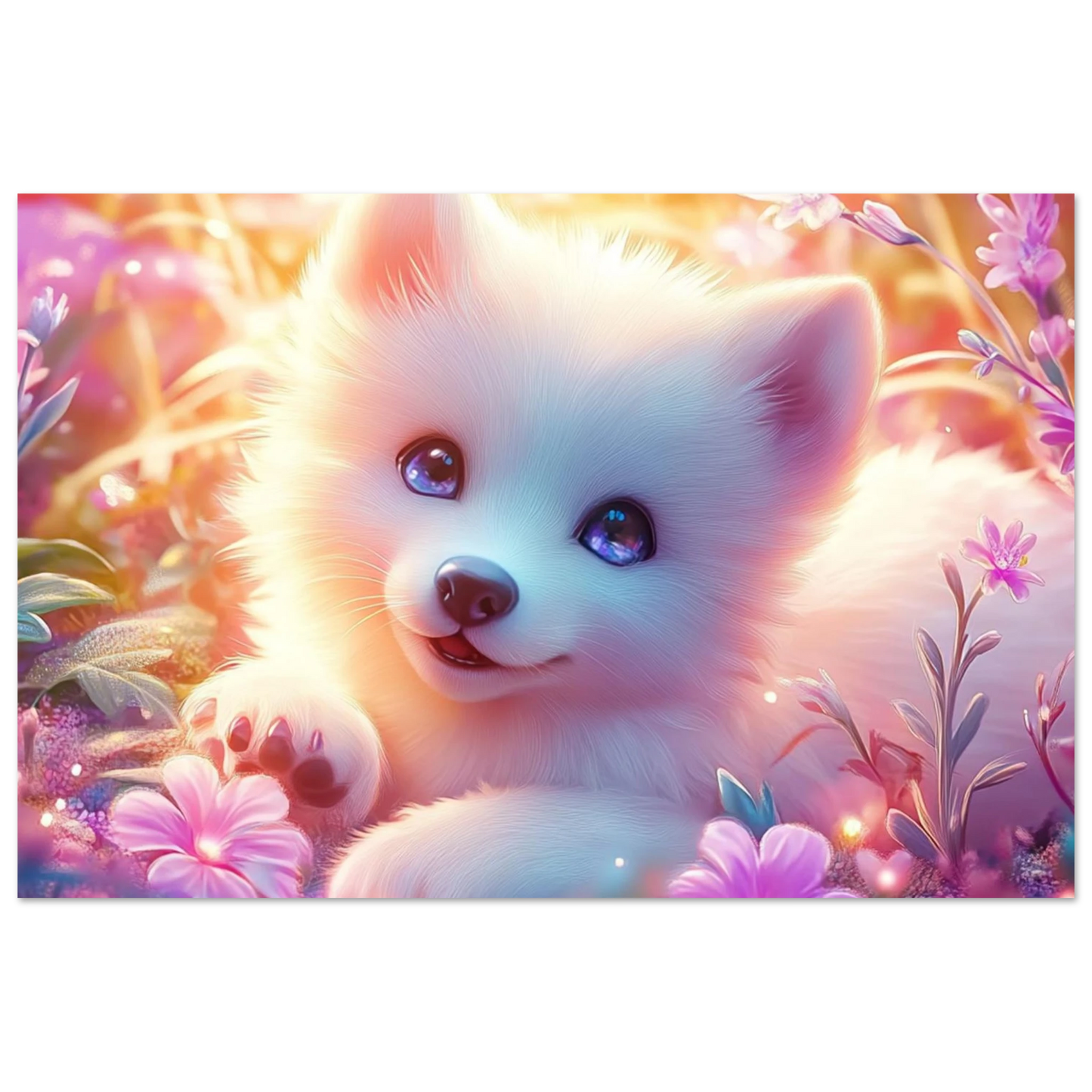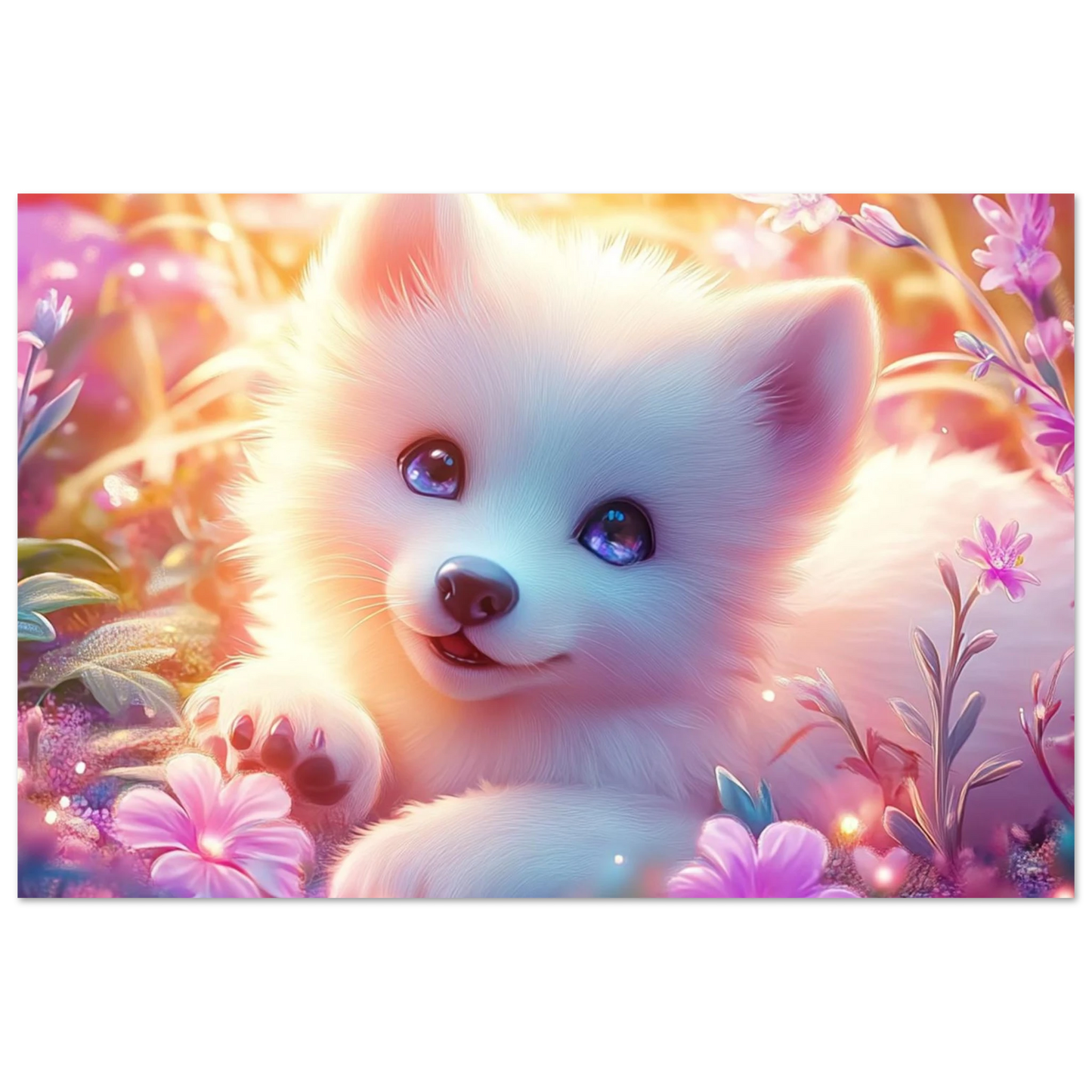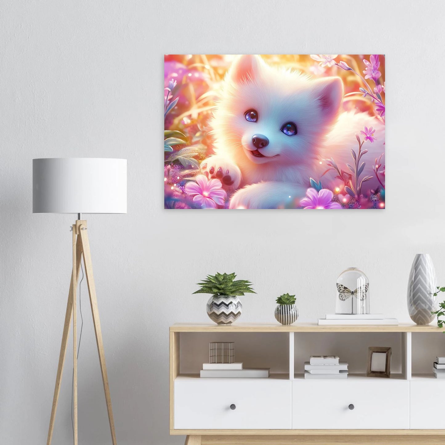 Lunani – der weiße Wolfswelpe aus dem Licht des Morgens – strahlt auf diesem eleganten Schaumstoffdruck in voller Leuchtkraft. Seine stille, hoffnungsvolle Präsenz kommt durch das glatte, matte Finish besonders gut zur Geltung und bringt eine warme, beruhigende Energie in dein Zuhause.
