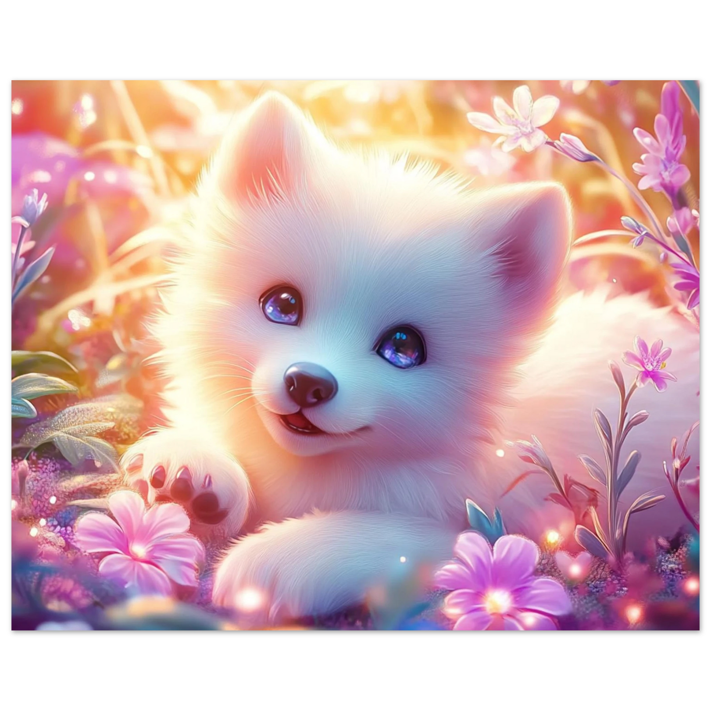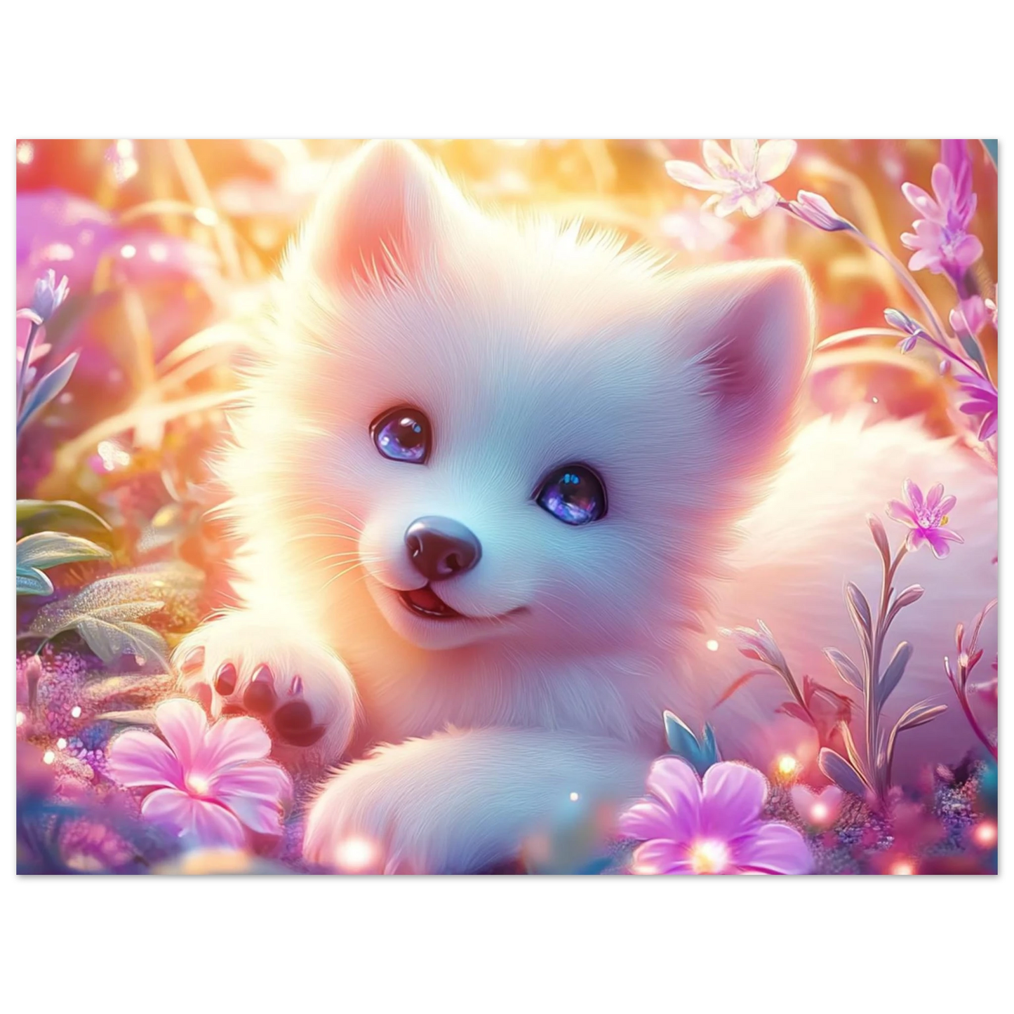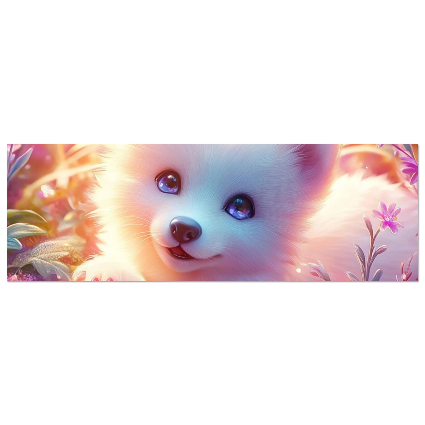 Lunani – der weiße Wolfswelpe aus dem Licht des Morgens – strahlt auf diesem eleganten Schaumstoffdruck in voller Leuchtkraft. Seine stille, hoffnungsvolle Präsenz kommt durch das glatte, matte Finish besonders gut zur Geltung und bringt eine warme, beruhigende Energie in dein Zuhause.