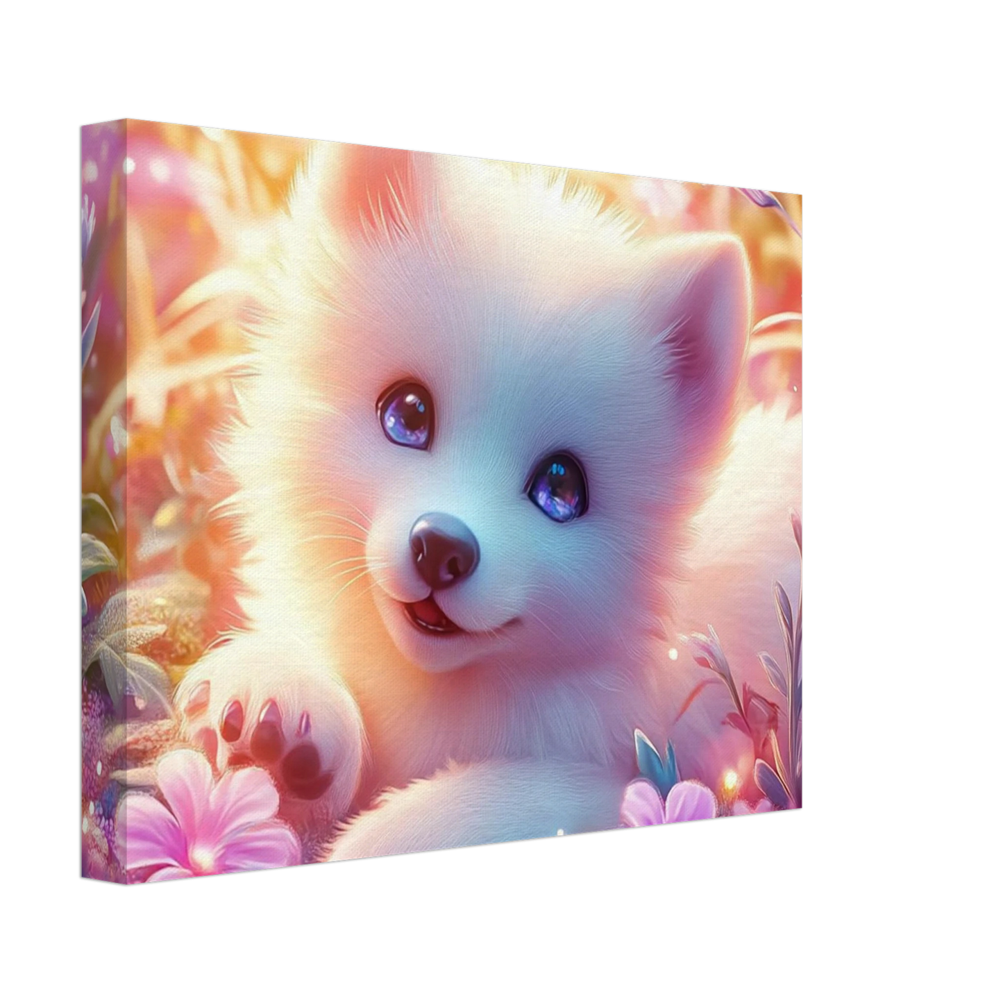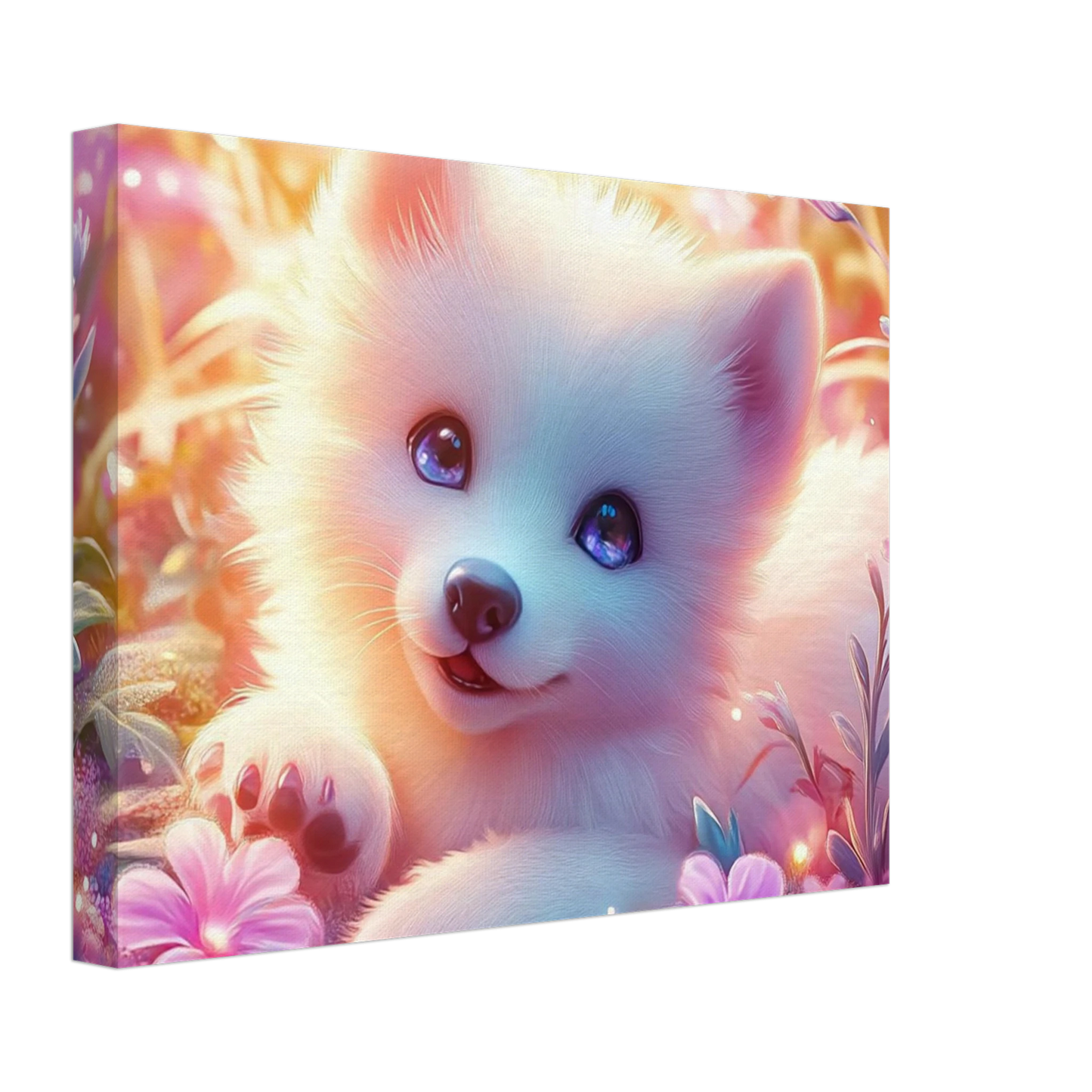 Lunani, der junge weiße Wolf mit einem Herz aus Licht, bringt Hoffnung und Geborgenheit in dein Zuhause. Geboren in einem Wald aus Morgentau und Blüten, erscheint er dort, wo Licht gebraucht wird – sein sanfter Blick berührt und lässt Herzen aufblühen. Diese ruhige Magie spiegelt sich in jedem Pinselstrich dieses Leinwandkunstwerks wider.