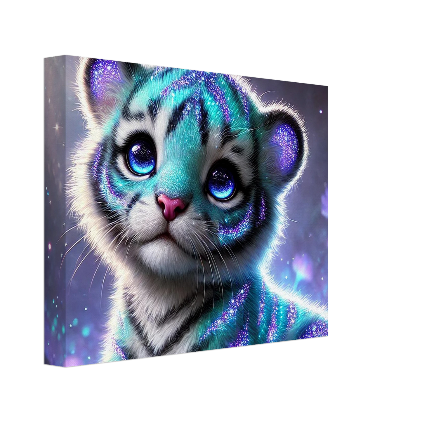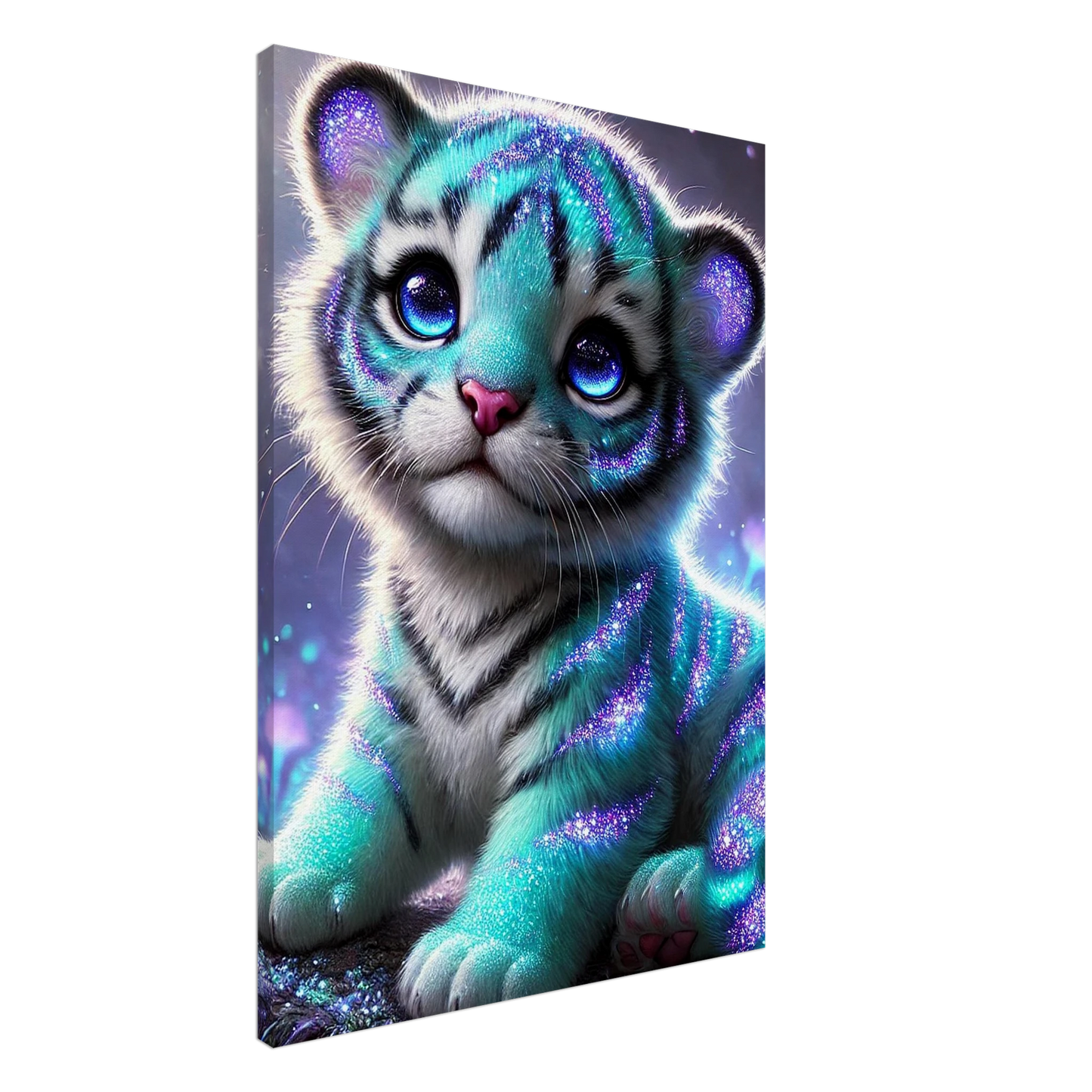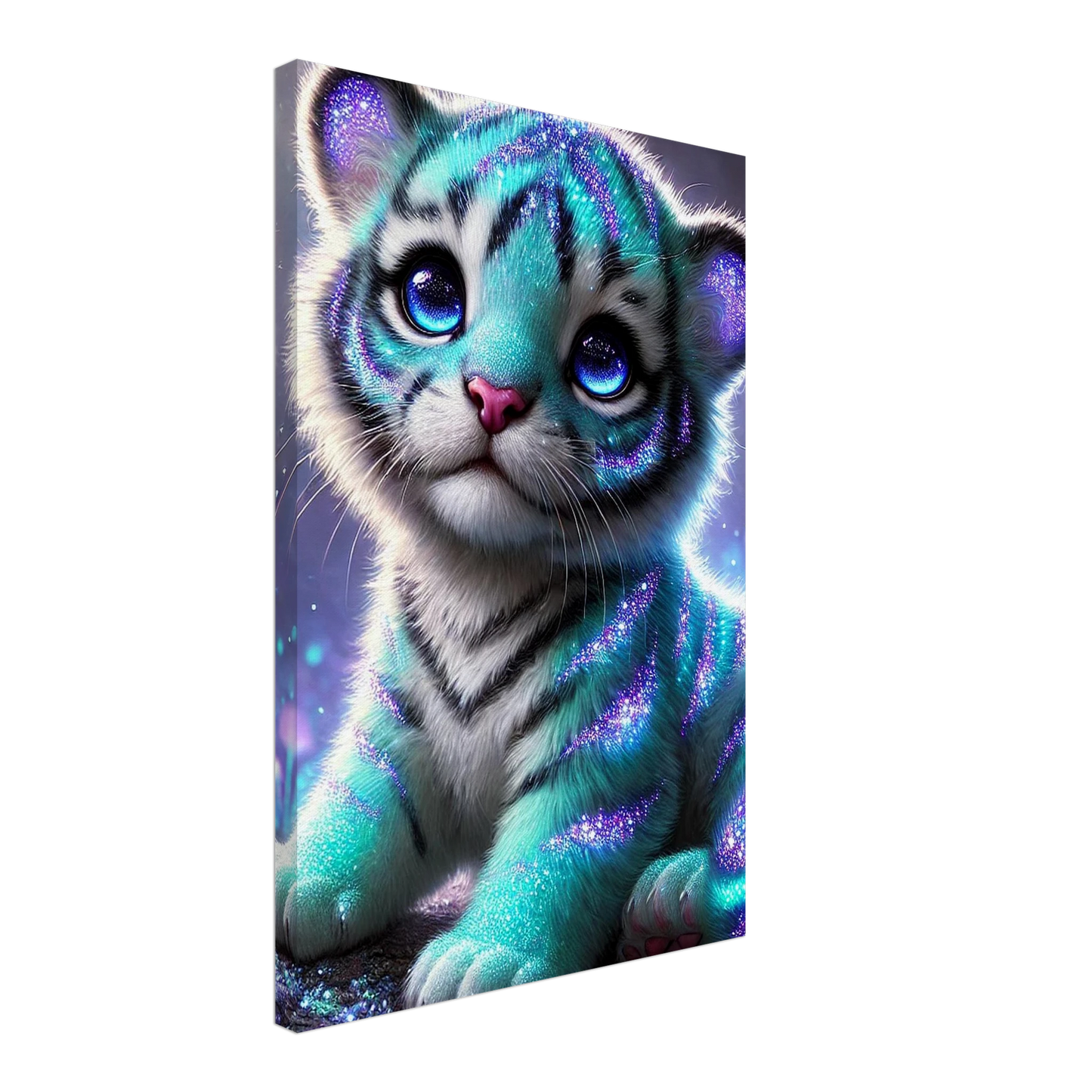 Zart, neugierig und von kosmischer Magie durchdrungen – Lunari ist ein magisches Tigerjunges, dessen Fell in Sternenlicht getaucht zu sein scheint. Geboren auf einem geheimen Pfad aus Mondblumen, trägt sie ein Leuchten in sich, das dunkle Wege erhellt und Herzen mit kindlicher Freude erfüllt.
