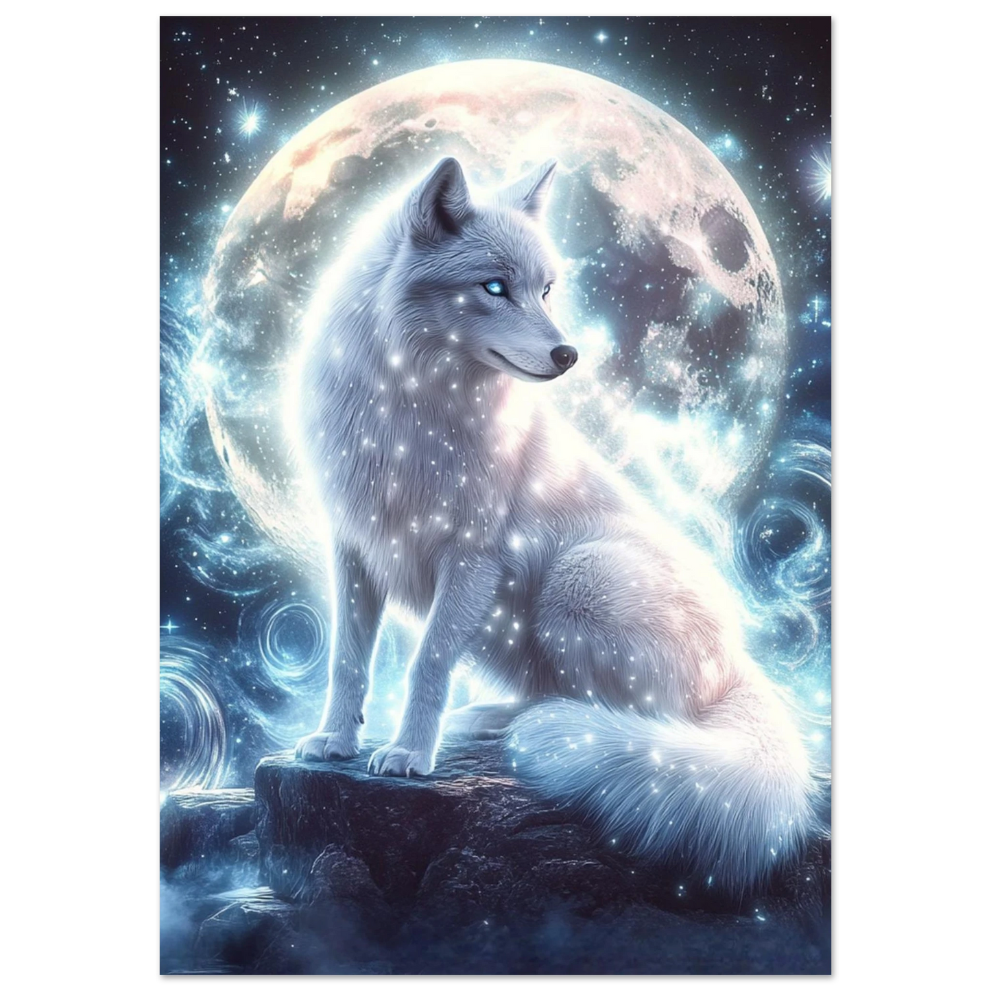 Lunaris, der silberweiße Wolf unter dem hellen Mondlicht, wird in dieser modernen Druckvariante zum stilvollen Mittelpunkt deiner Räume. Gedruckt auf federleichter PVC-Platte mit UV-Schutz wirkt sein sternenstaubgewebtes Fell besonders klar und leuchtend – ideal für helle, ruhige Wohnbereiche oder minimalistische Umgebungen.