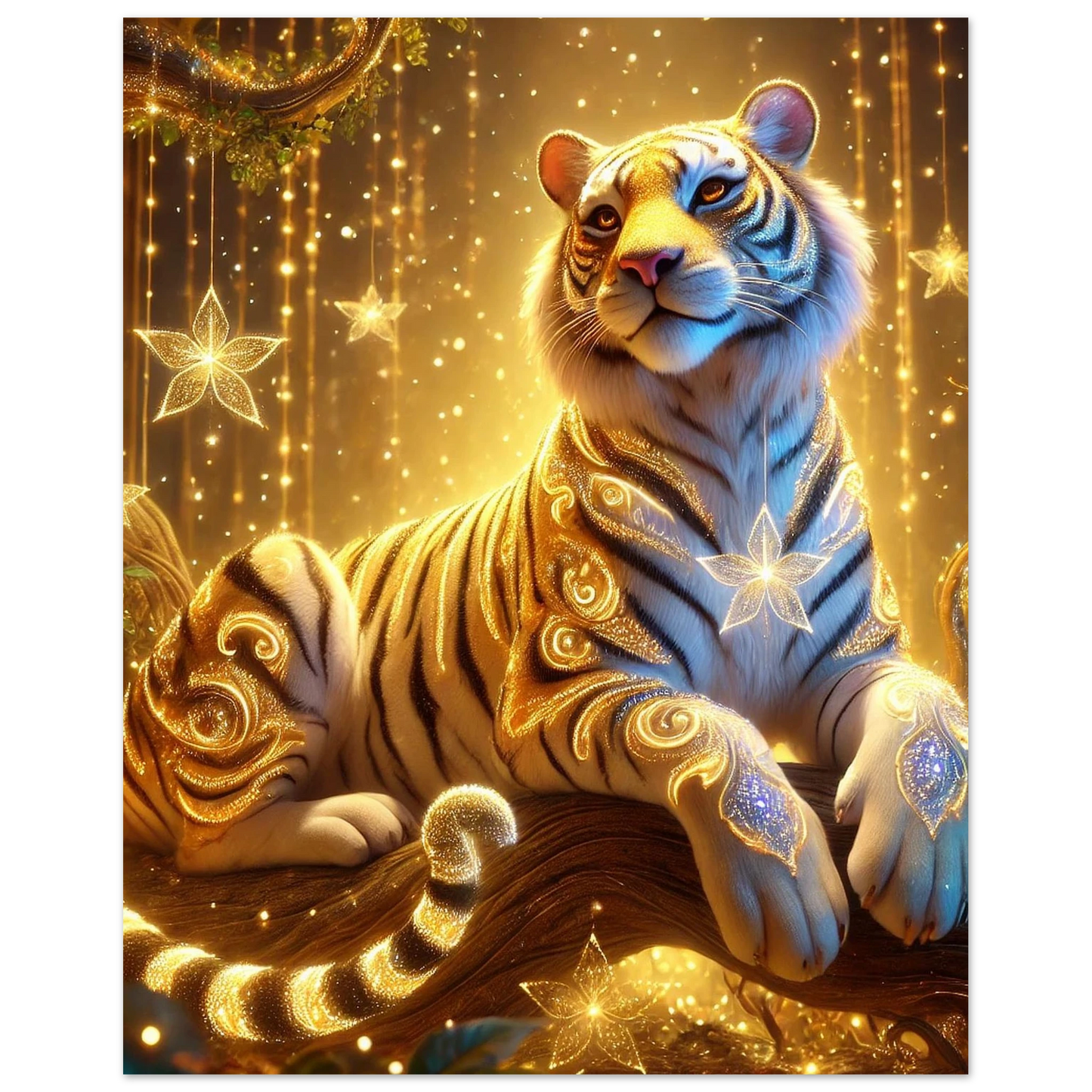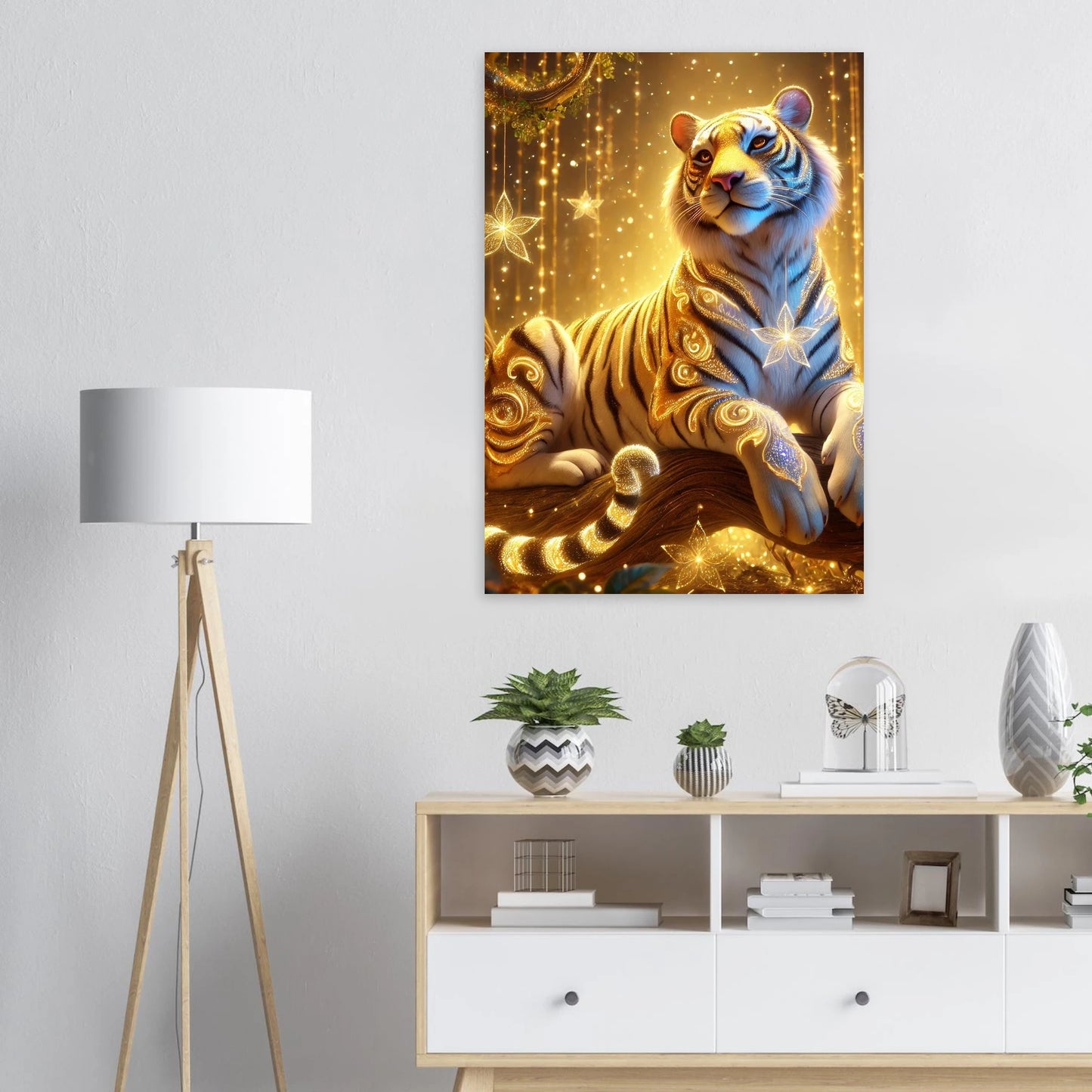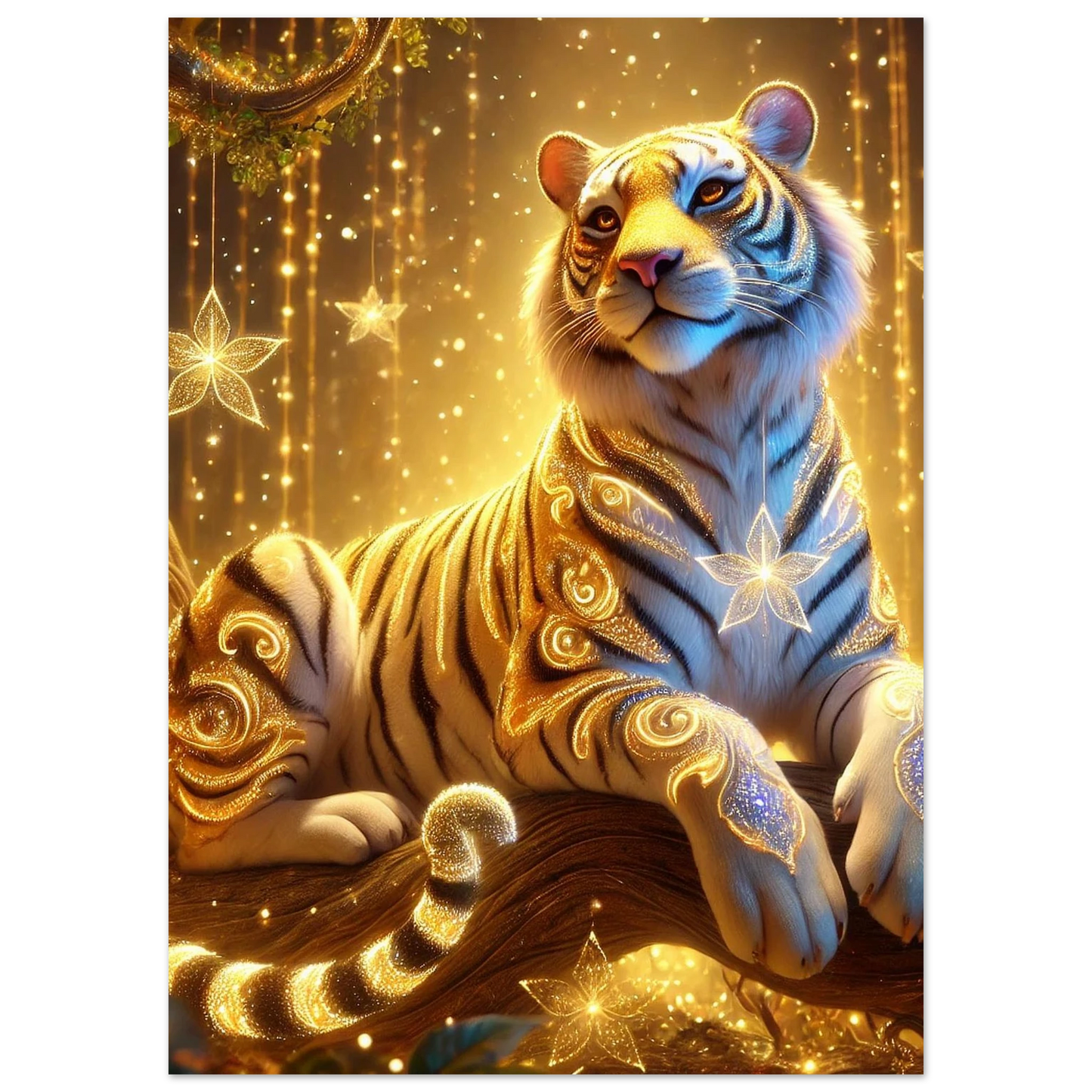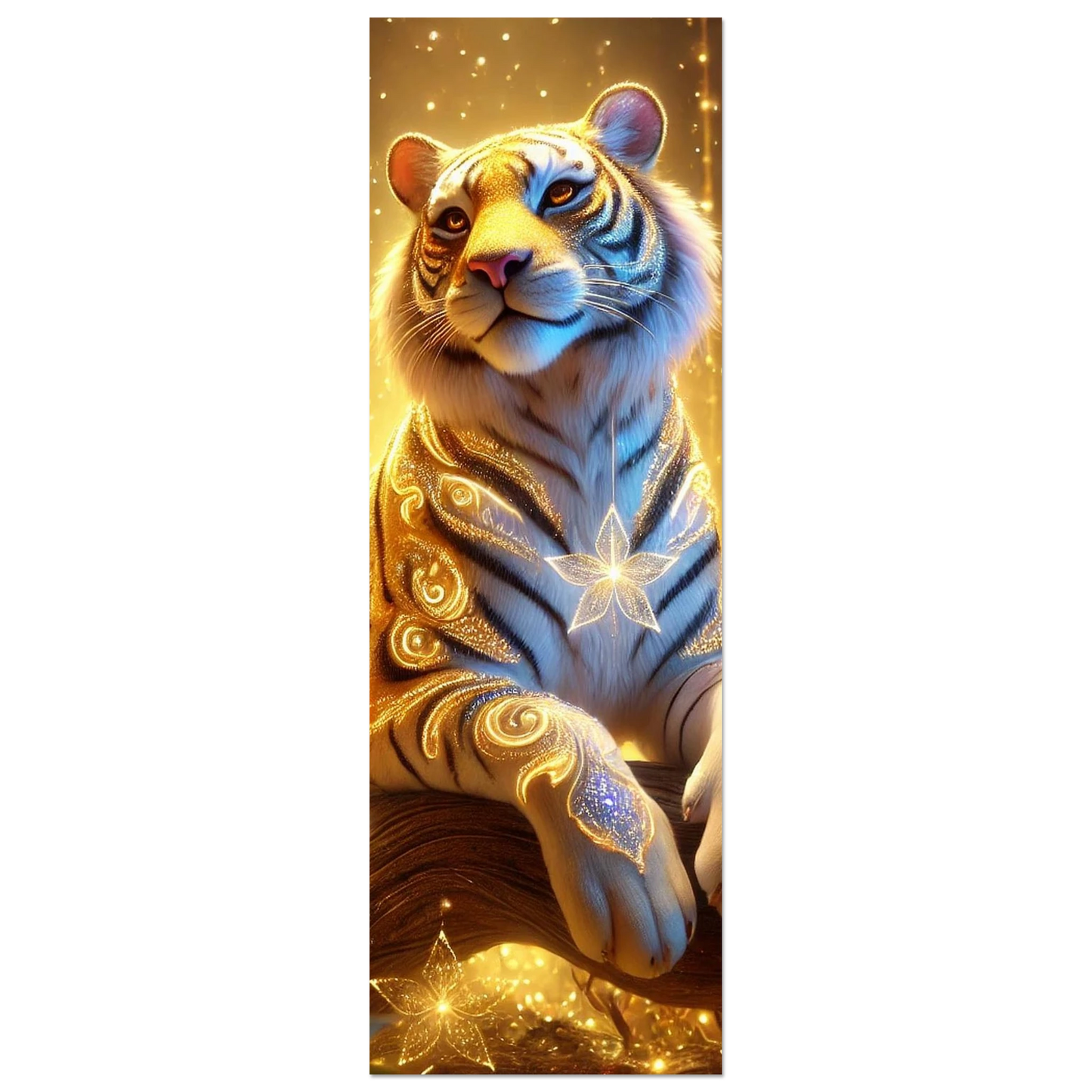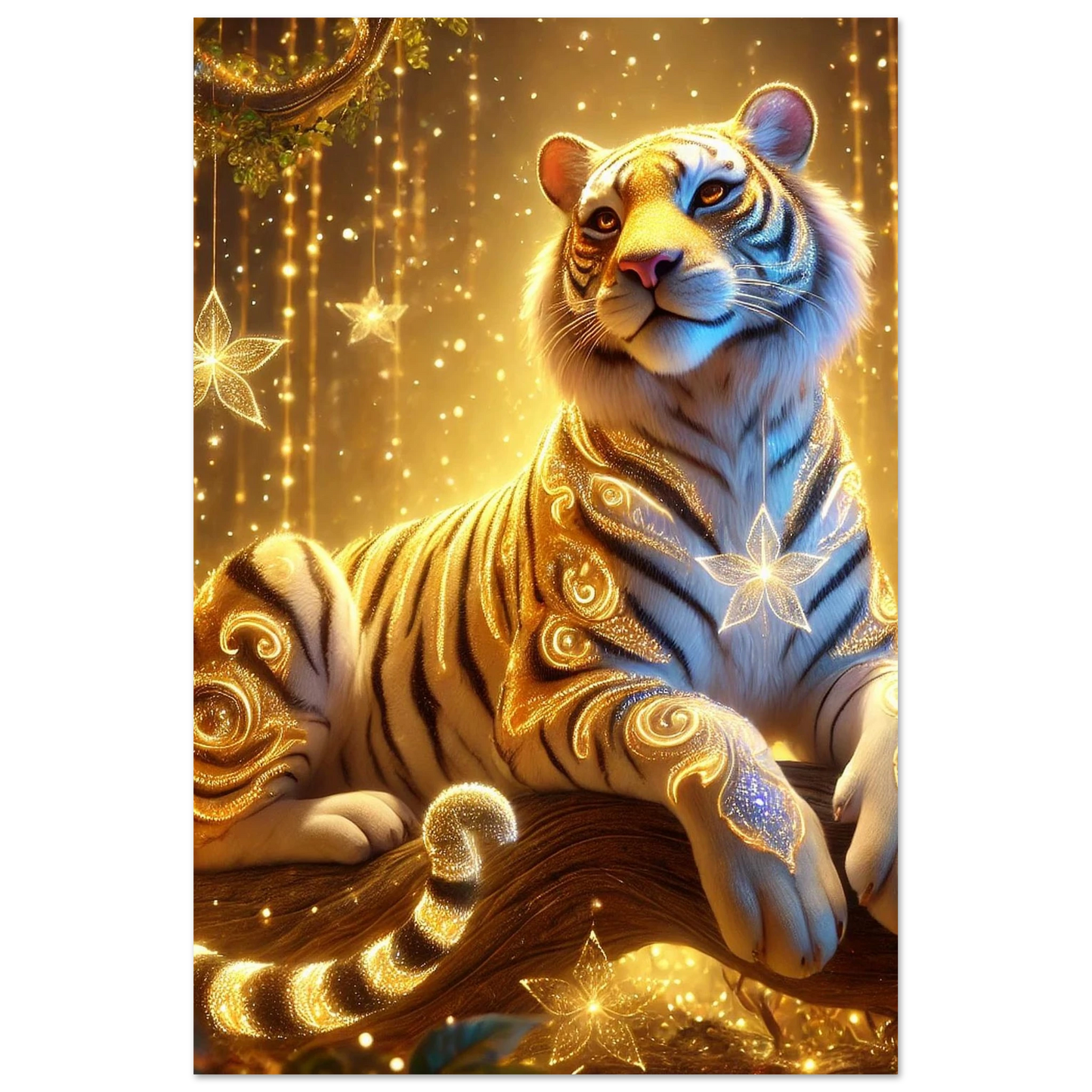 Tauche ein in die goldene Welt von Luxarion, dem majestätischen Tiger aus Sternenstaub und Sonnenlicht. Gedruckt auf leichter, aber robuster Schaumstoffplatte wird seine leuchtende Präsenz zu einem modernen Statement in jedem Raum – stilvoll, elegant und eindrucksvoll.