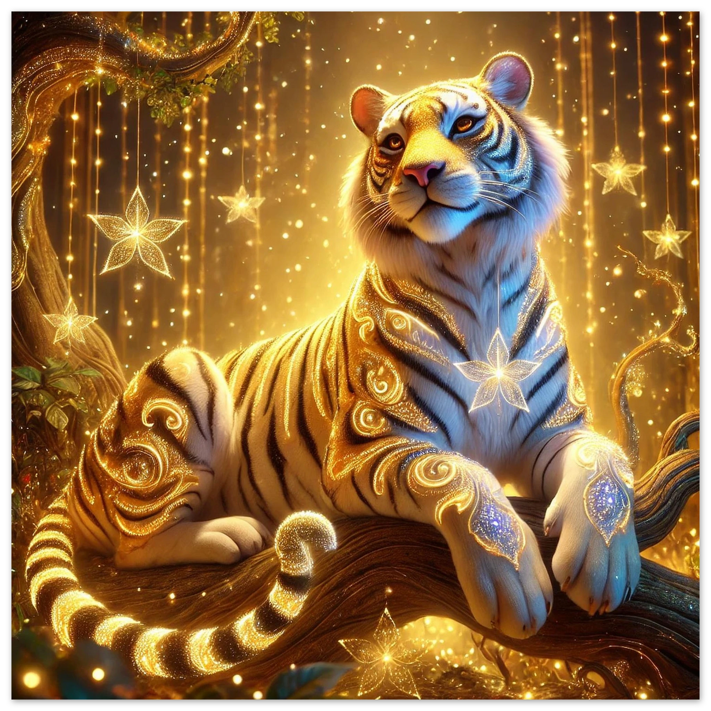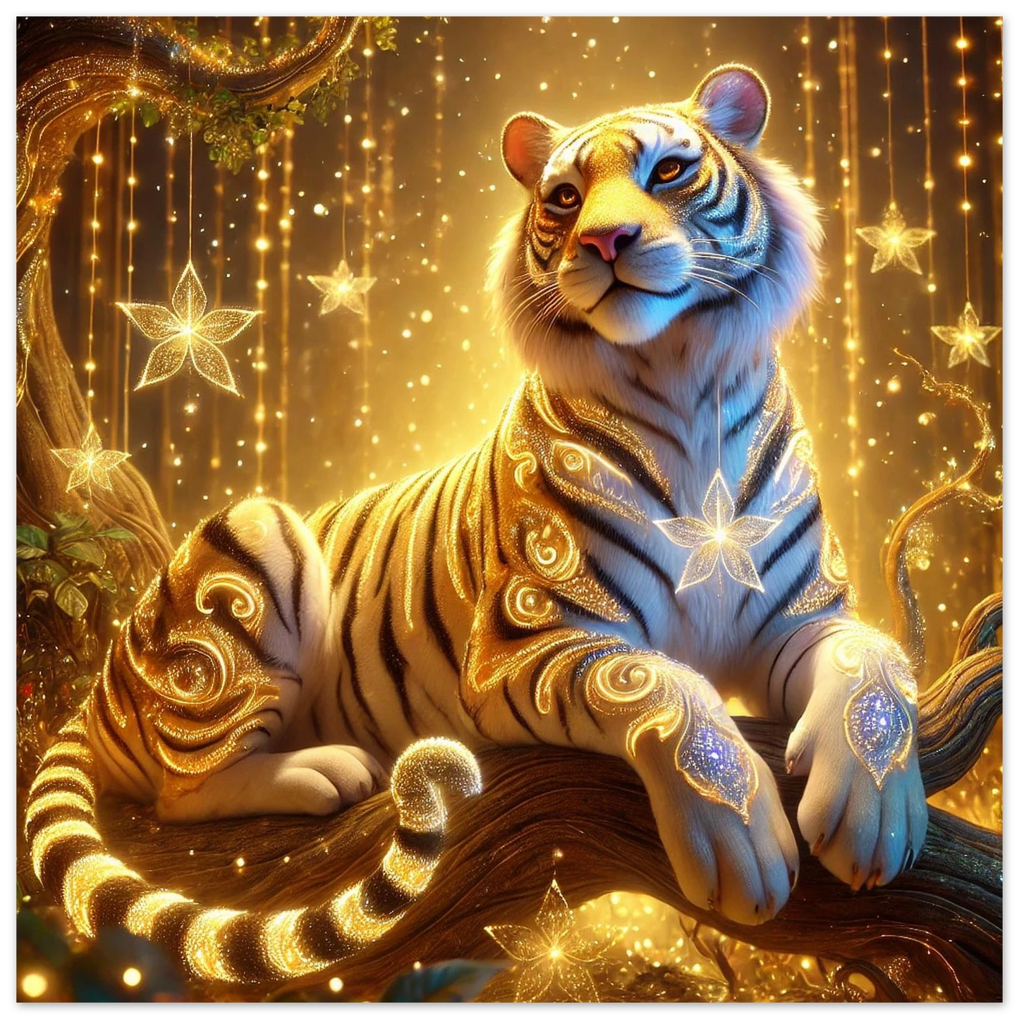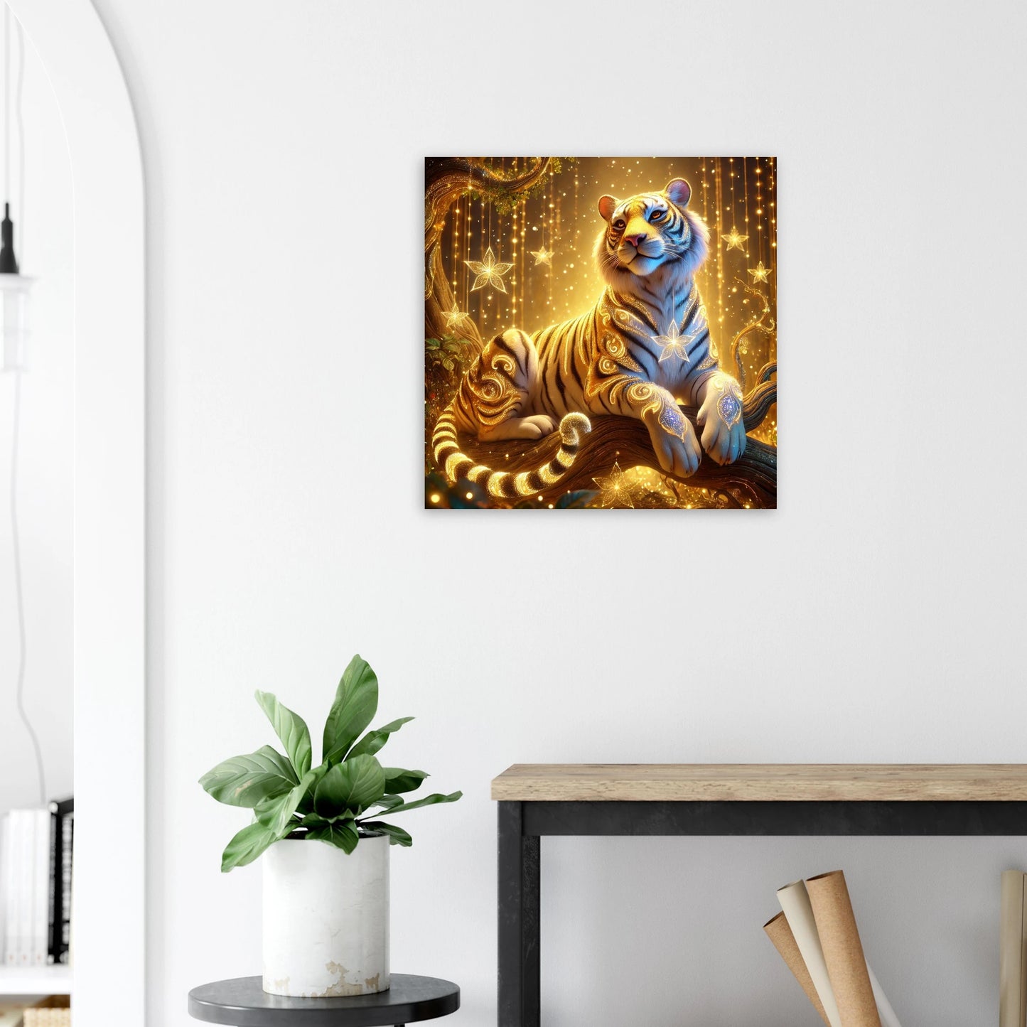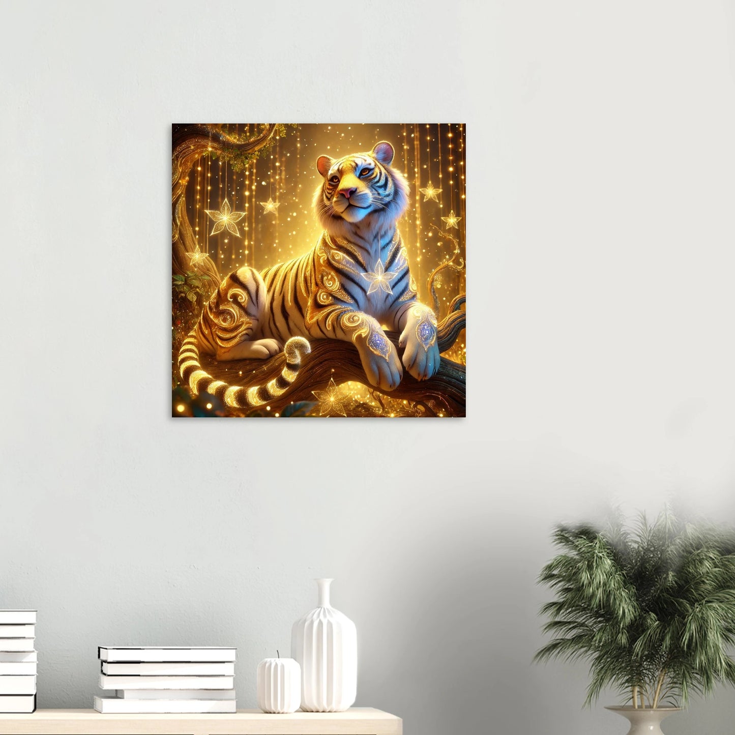 Tauche ein in die goldene Welt von Luxarion, dem majestätischen Tiger aus Sternenstaub und Sonnenlicht. Gedruckt auf leichter, aber robuster Schaumstoffplatte wird seine leuchtende Präsenz zu einem modernen Statement in jedem Raum – stilvoll, elegant und eindrucksvoll.