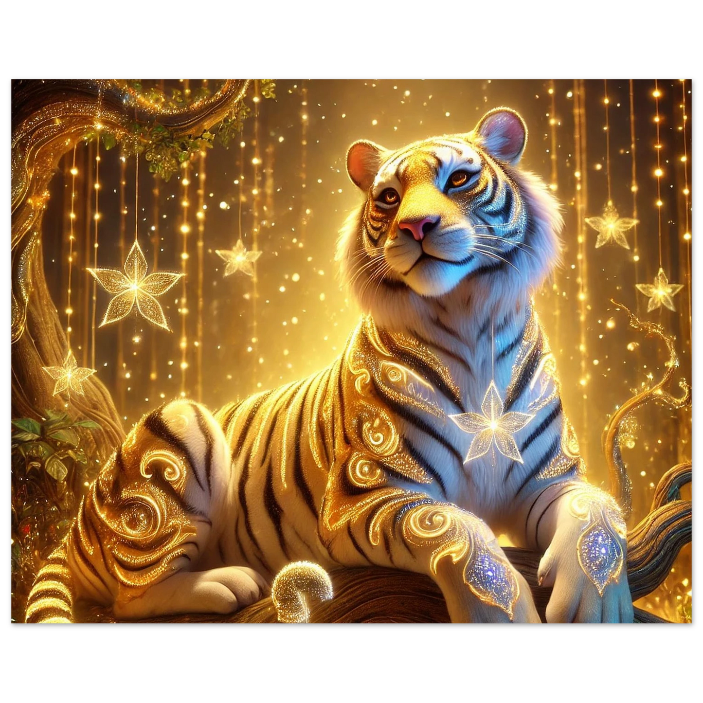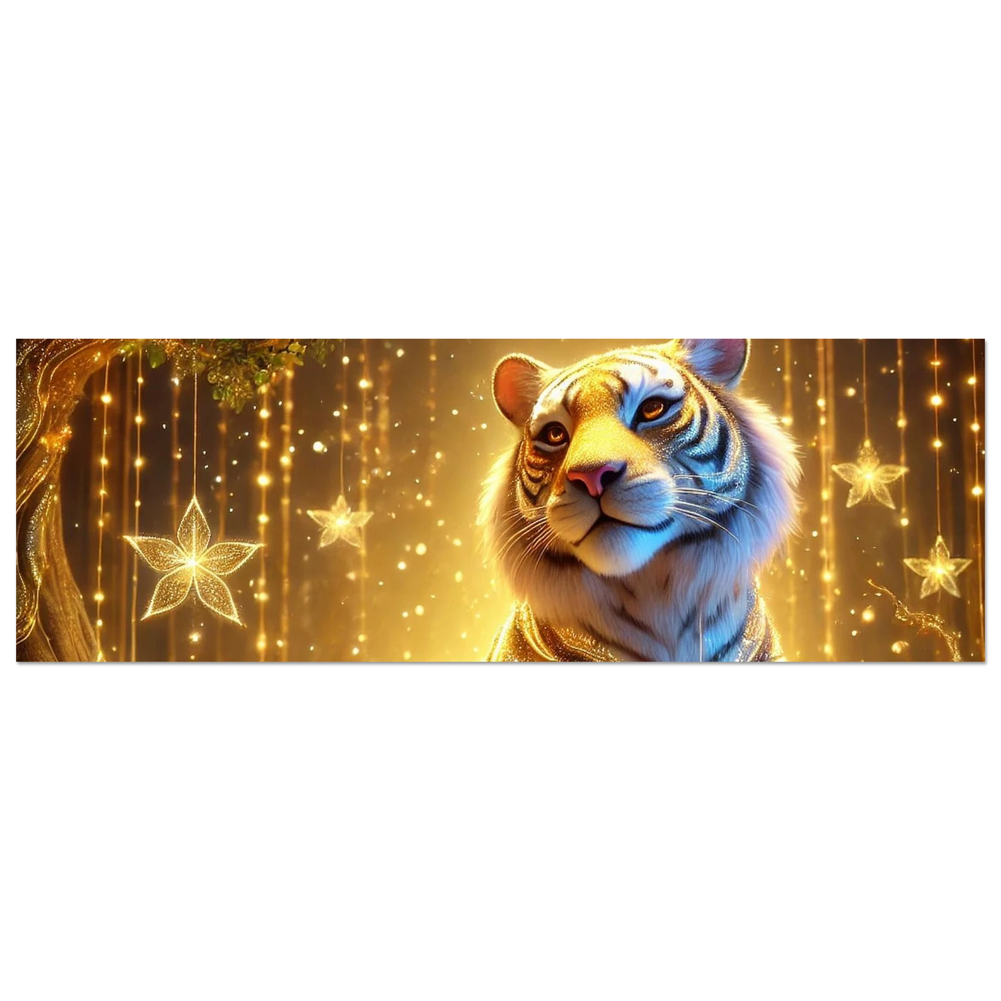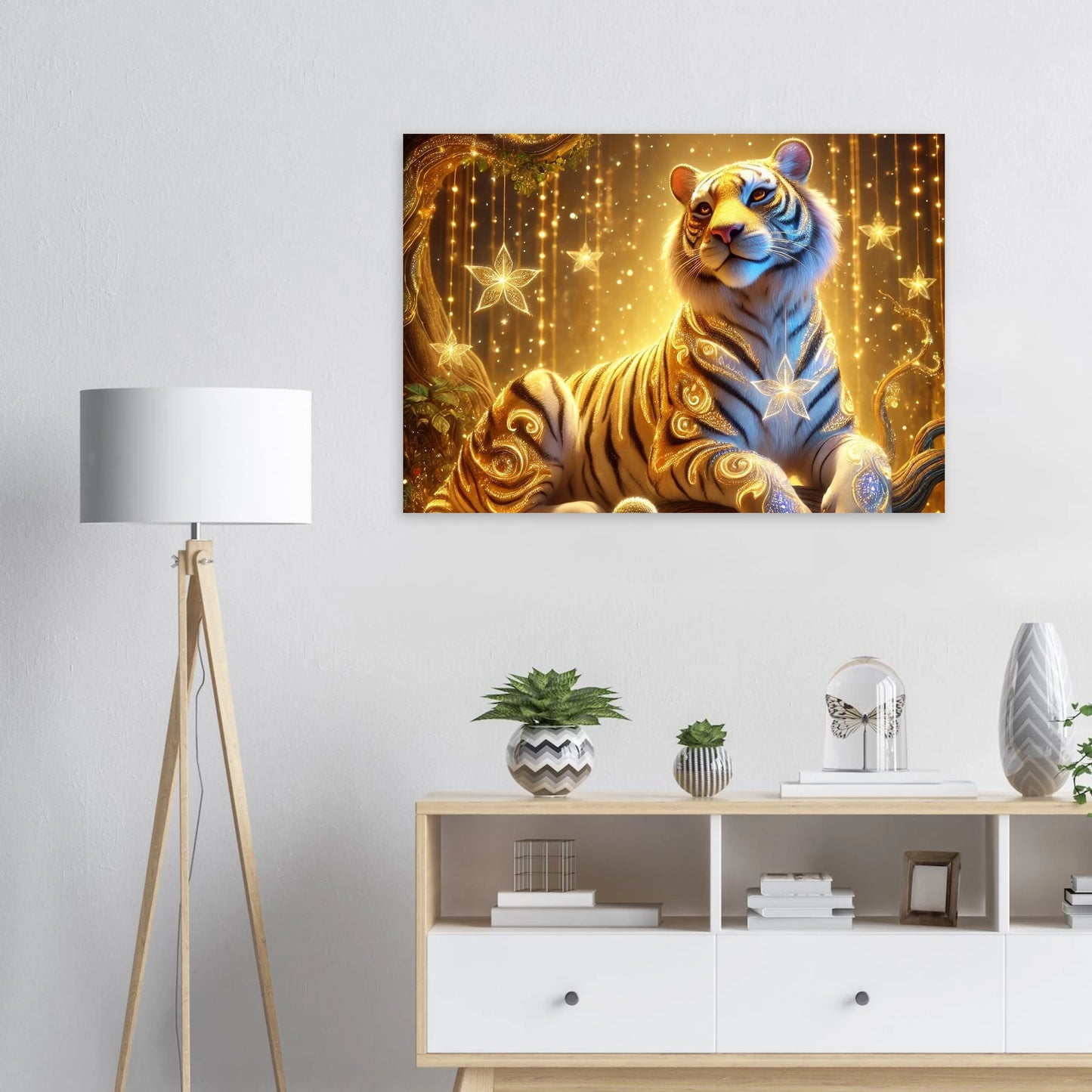 Tauche ein in die goldene Welt von Luxarion, dem majestätischen Tiger aus Sternenstaub und Sonnenlicht. Gedruckt auf leichter, aber robuster Schaumstoffplatte wird seine leuchtende Präsenz zu einem modernen Statement in jedem Raum – stilvoll, elegant und eindrucksvoll.