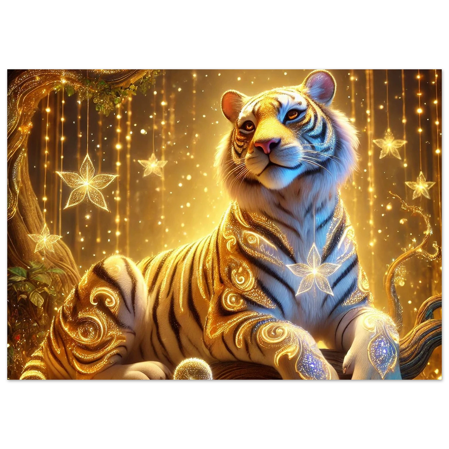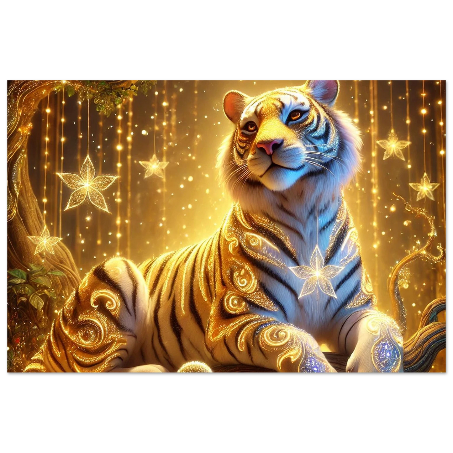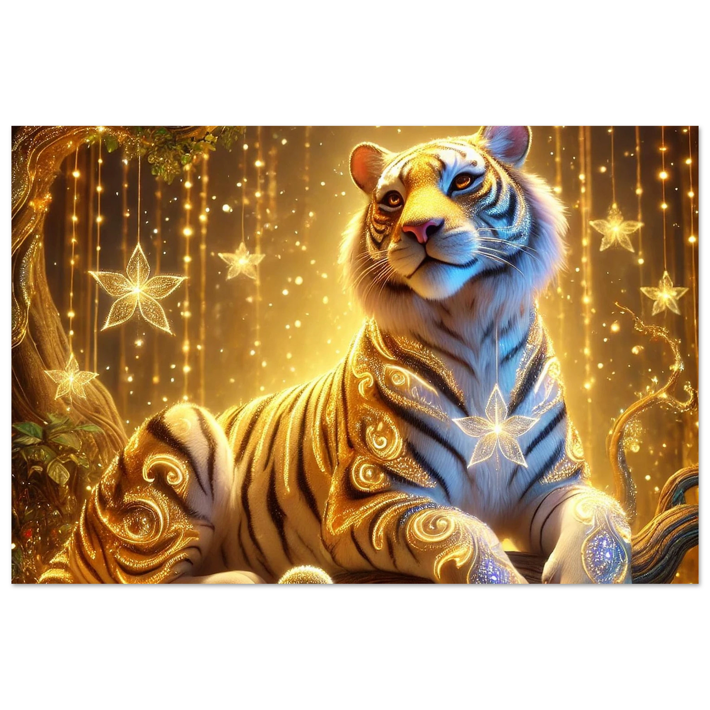 Tauche ein in die goldene Welt von Luxarion, dem majestätischen Tiger aus Sternenstaub und Sonnenlicht. Gedruckt auf leichter, aber robuster Schaumstoffplatte wird seine leuchtende Präsenz zu einem modernen Statement in jedem Raum – stilvoll, elegant und eindrucksvoll.