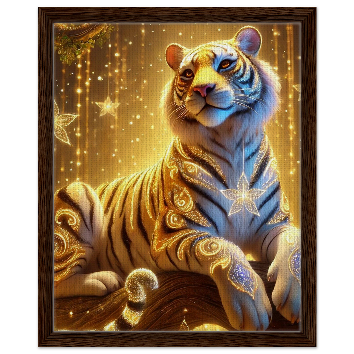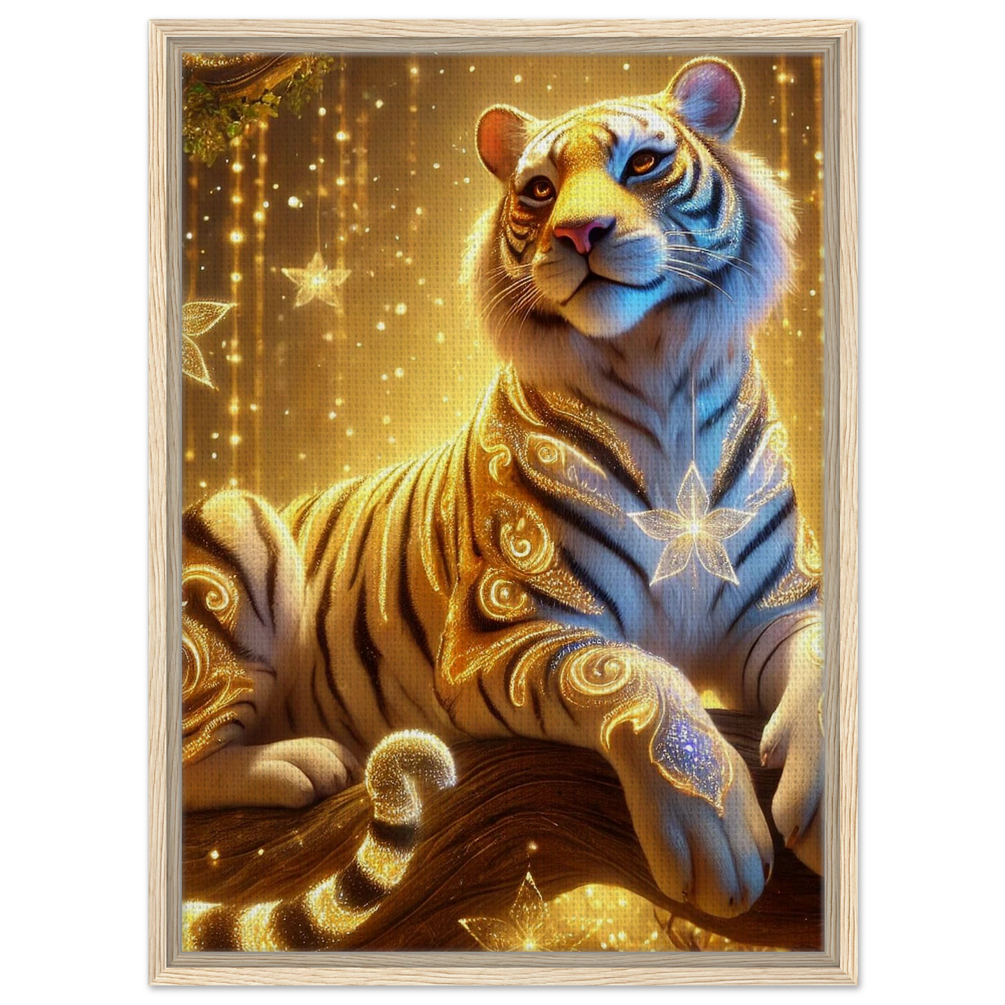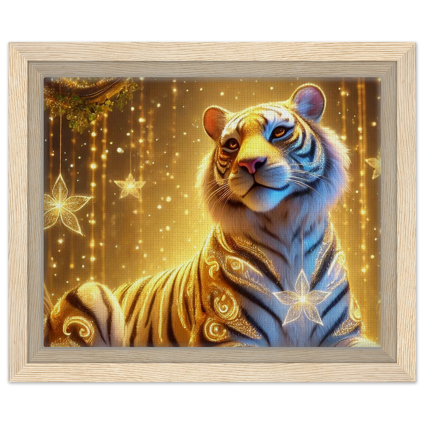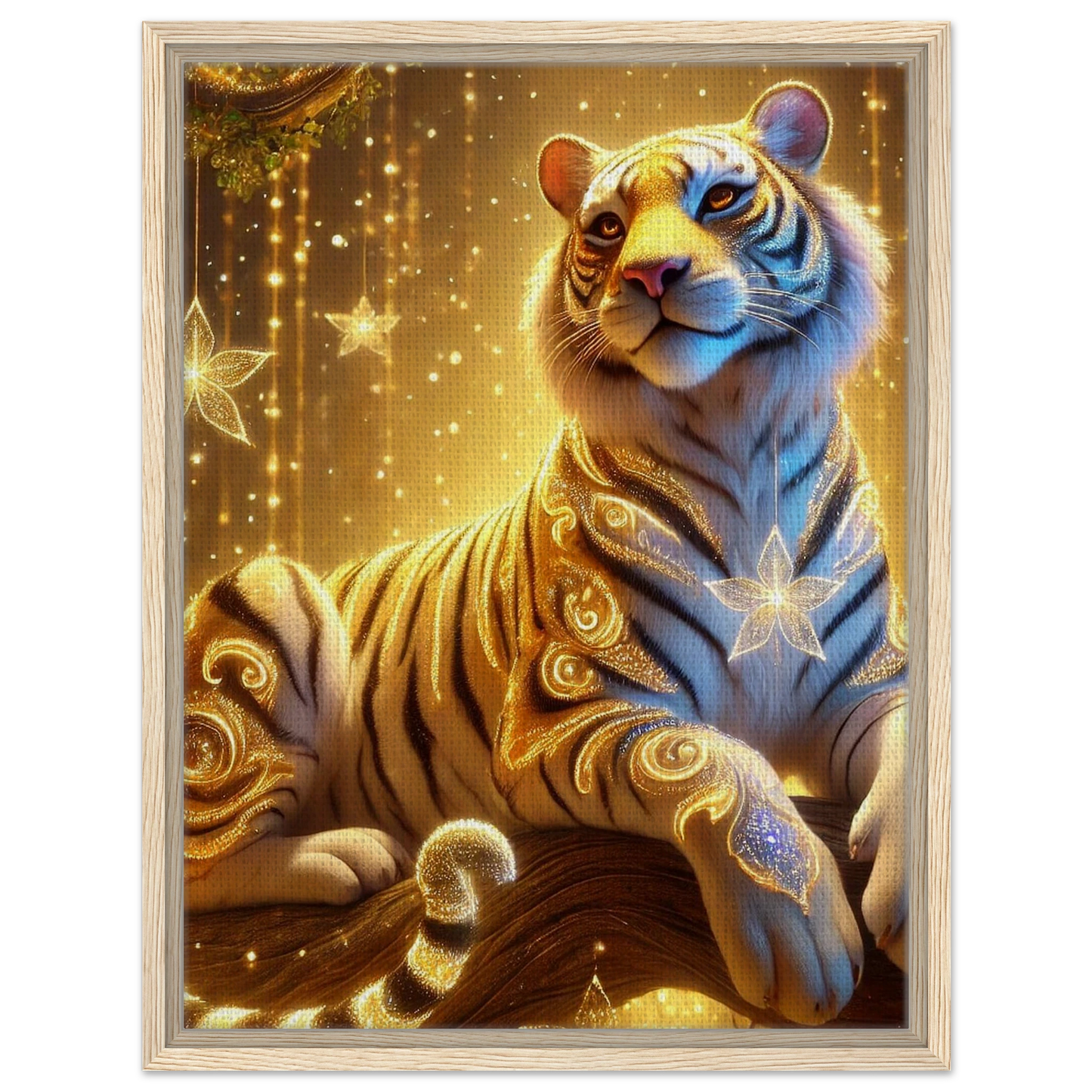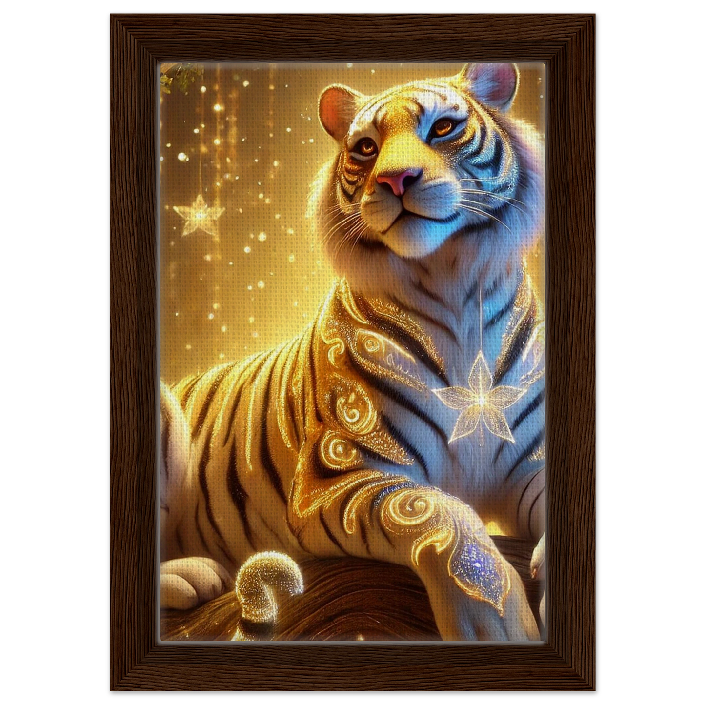 Luxarion, der Tiger aus Licht und Sternenstaub, ruht unter einem Himmelszelt aus Gold und Magie. Seine Präsenz schenkt jedem Raum Wärme, Klarheit und ein Gefühl tiefer Ruhe. Dieser gerahmte Leinwanddruck bringt seine leuchtende Energie in dein Zuhause – in einem hochwertigen Rahmen aus FSC-zertifiziertem Holz.