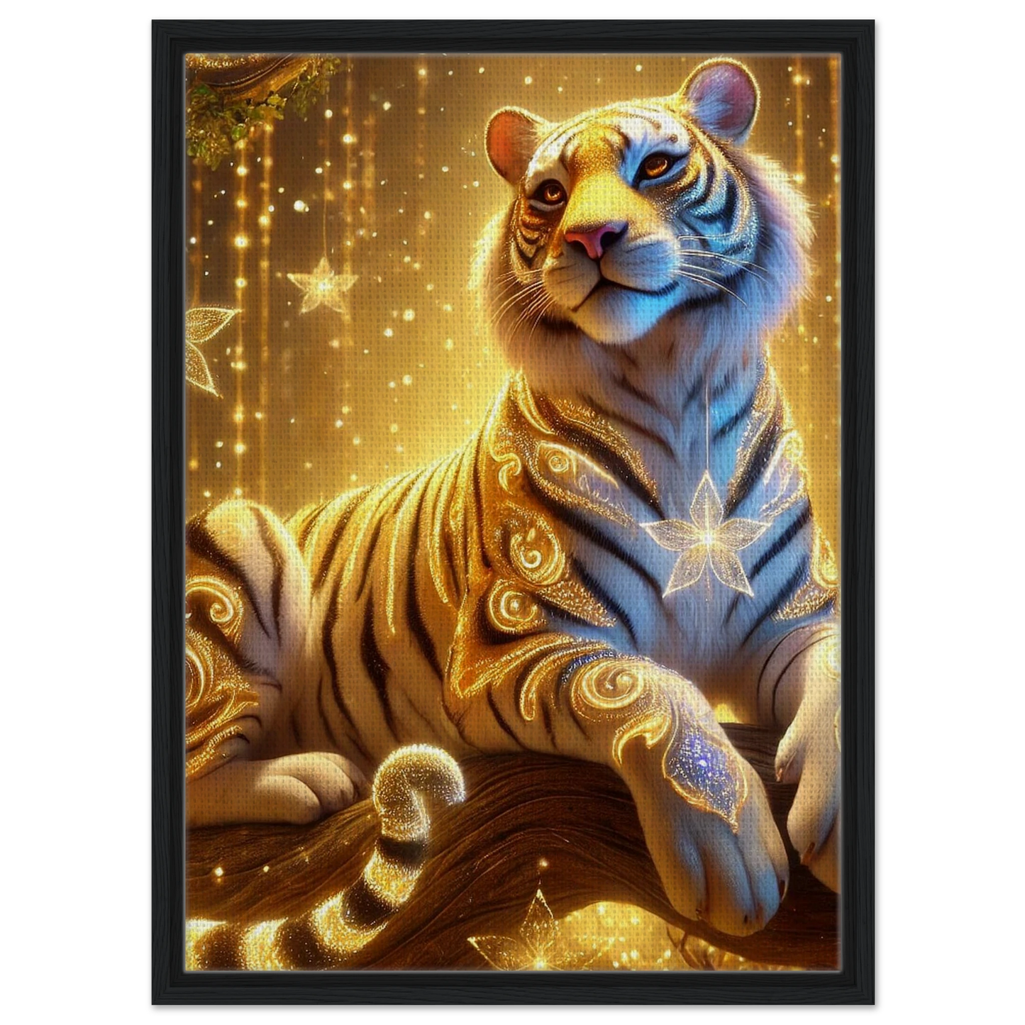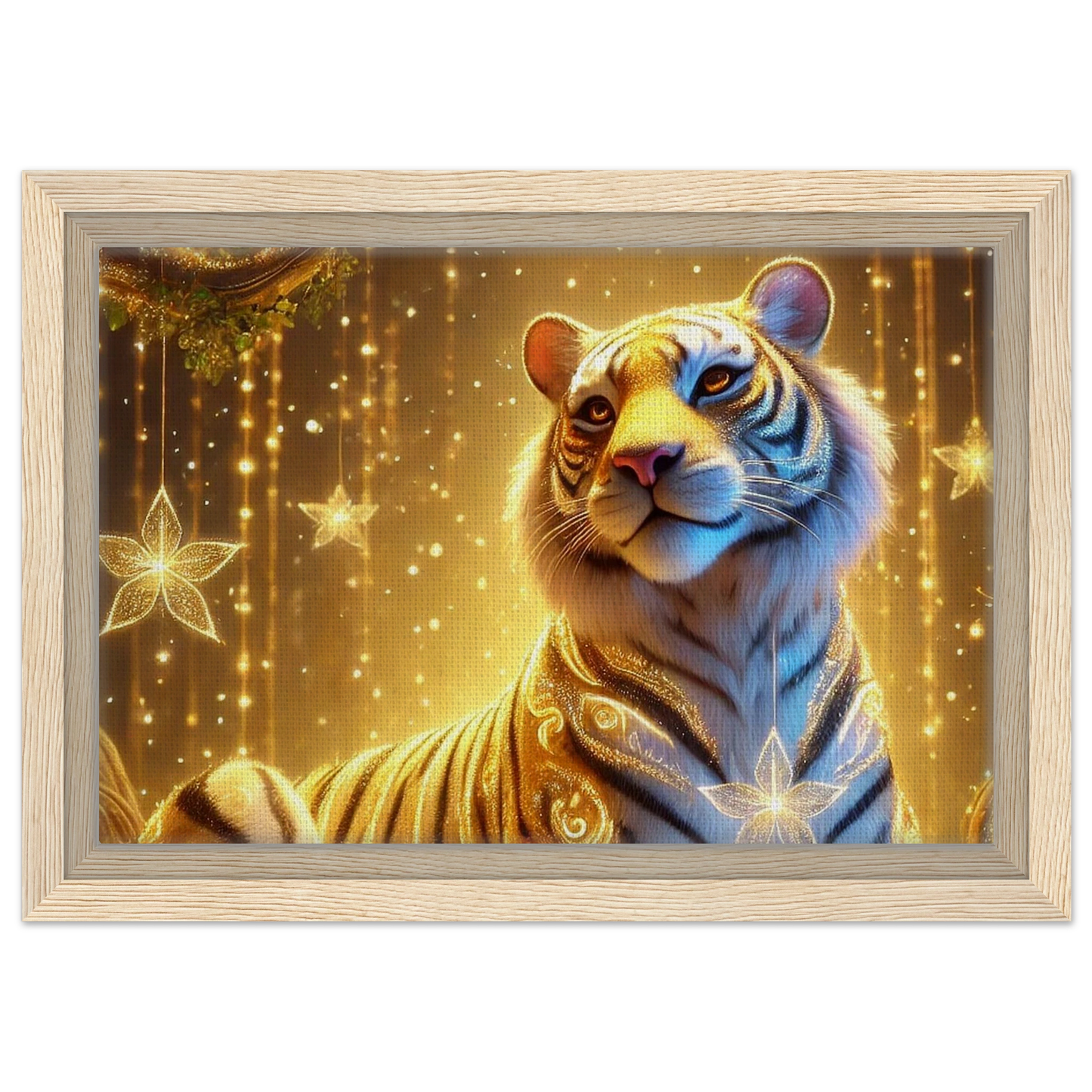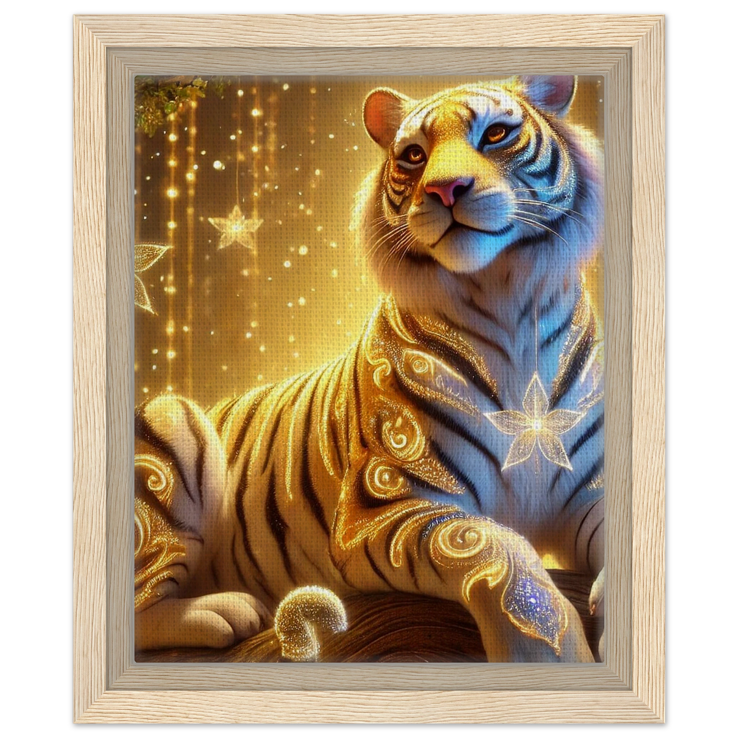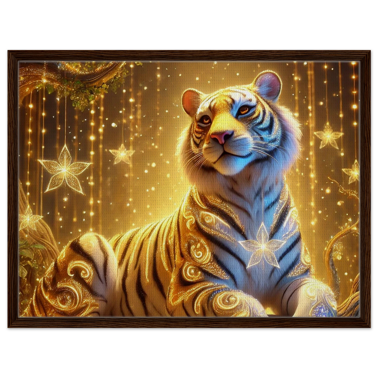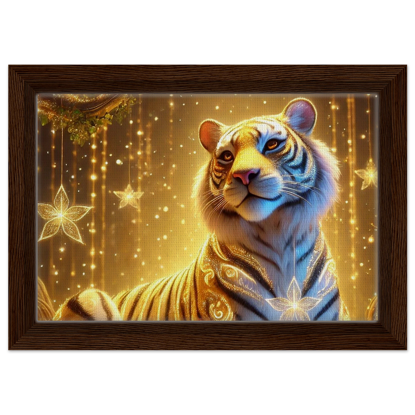 Luxarion, der Tiger aus Licht und Sternenstaub, ruht unter einem Himmelszelt aus Gold und Magie. Seine Präsenz schenkt jedem Raum Wärme, Klarheit und ein Gefühl tiefer Ruhe. Dieser gerahmte Leinwanddruck bringt seine leuchtende Energie in dein Zuhause – in einem hochwertigen Rahmen aus FSC-zertifiziertem Holz.