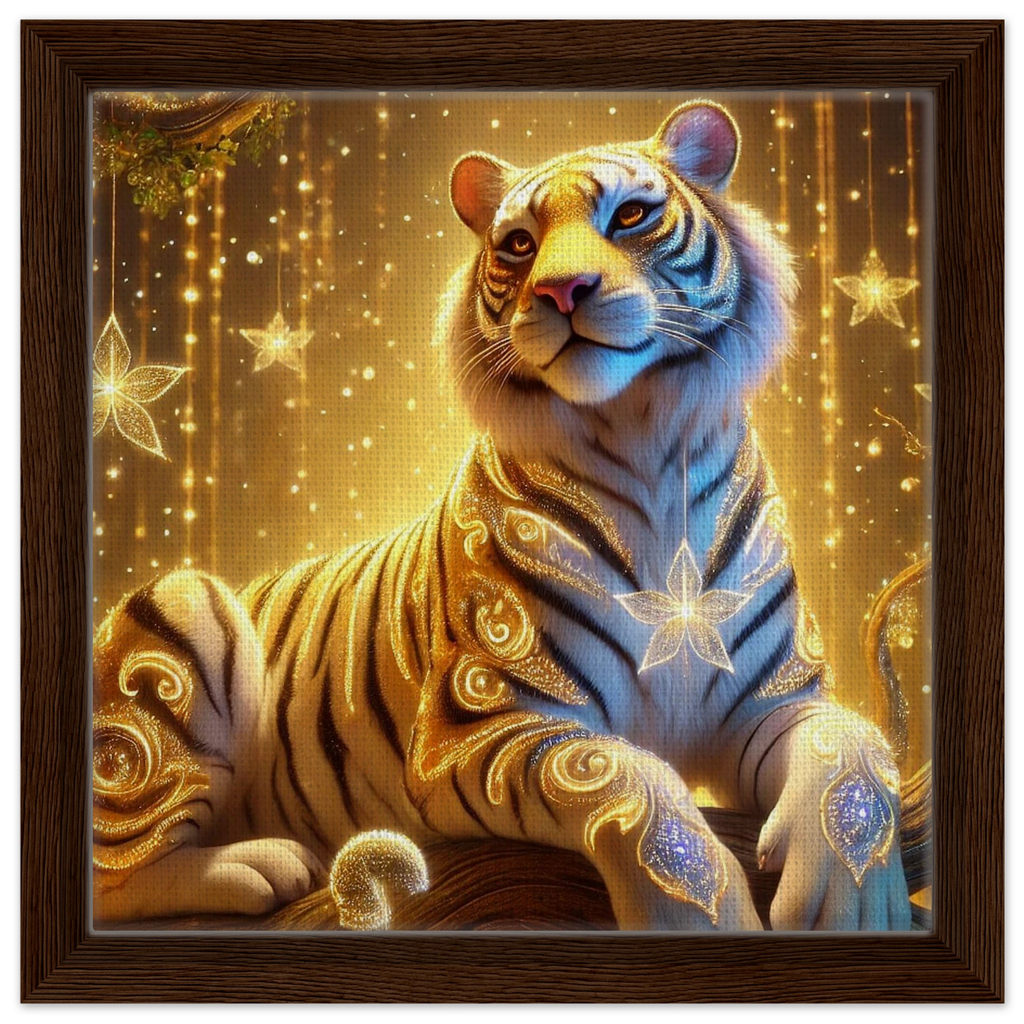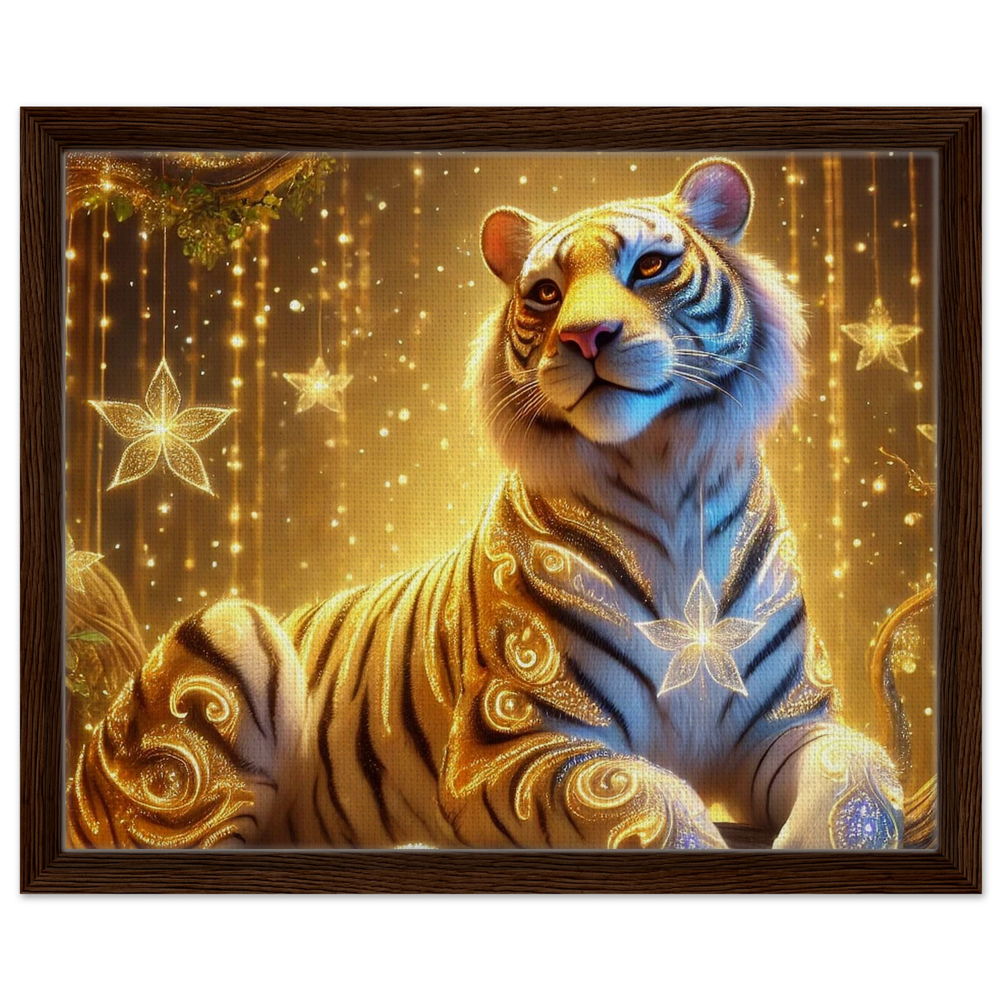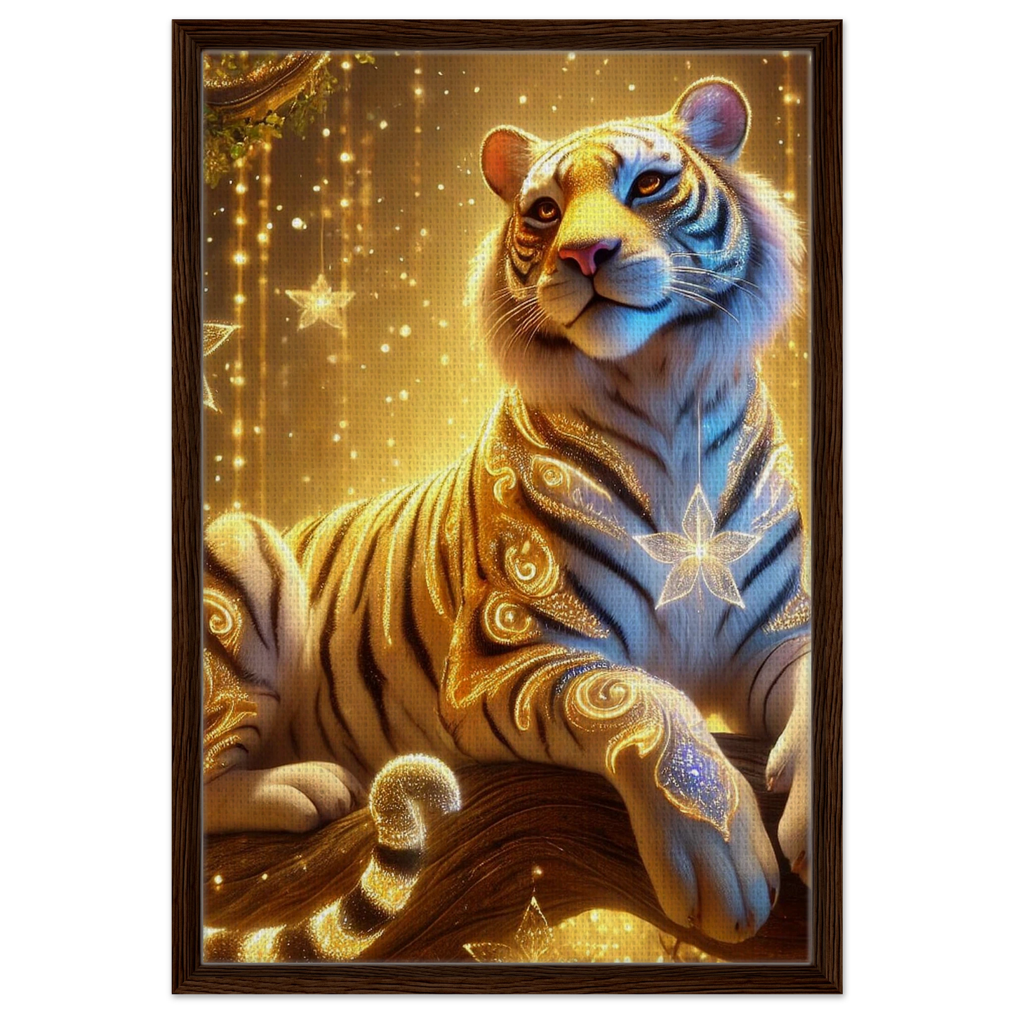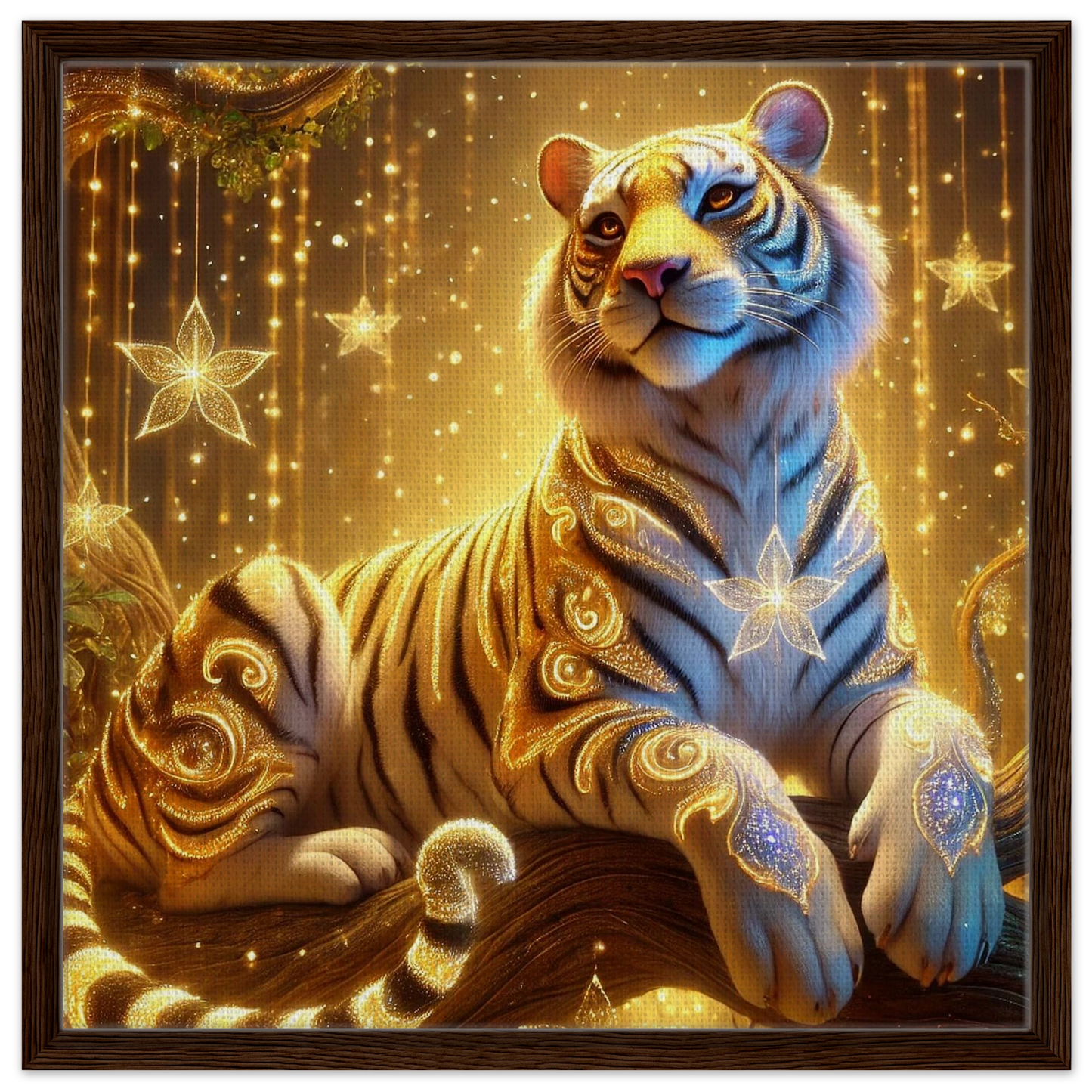 Luxarion, der Tiger aus Licht und Sternenstaub, ruht unter einem Himmelszelt aus Gold und Magie. Seine Präsenz schenkt jedem Raum Wärme, Klarheit und ein Gefühl tiefer Ruhe. Dieser gerahmte Leinwanddruck bringt seine leuchtende Energie in dein Zuhause – in einem hochwertigen Rahmen aus FSC-zertifiziertem Holz.