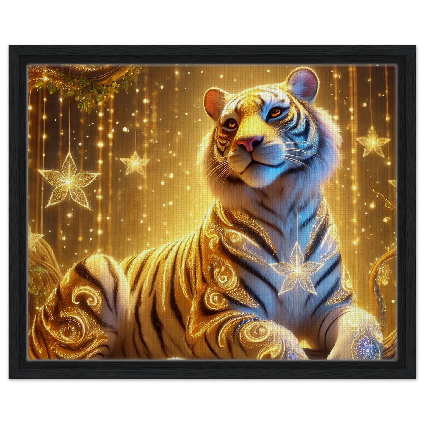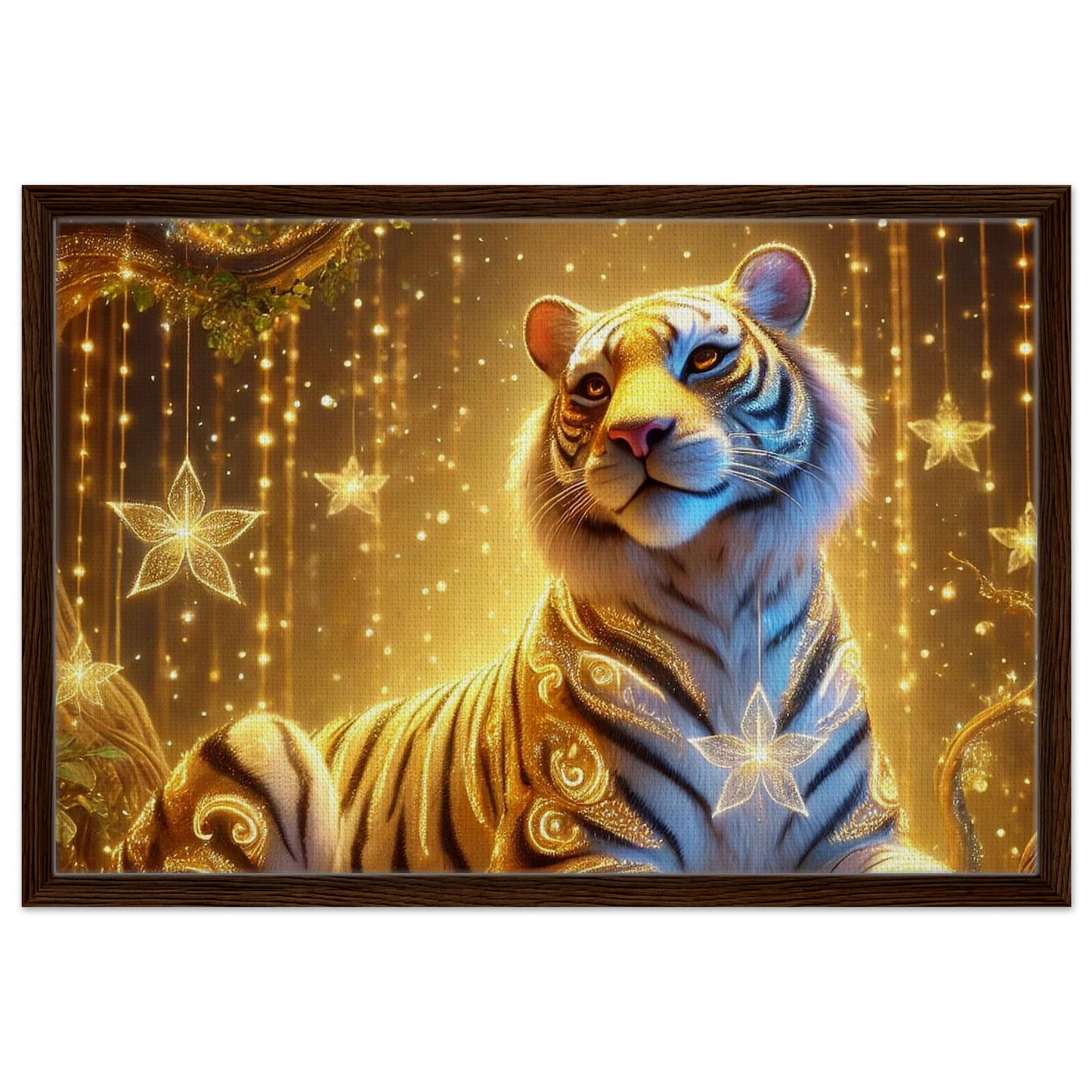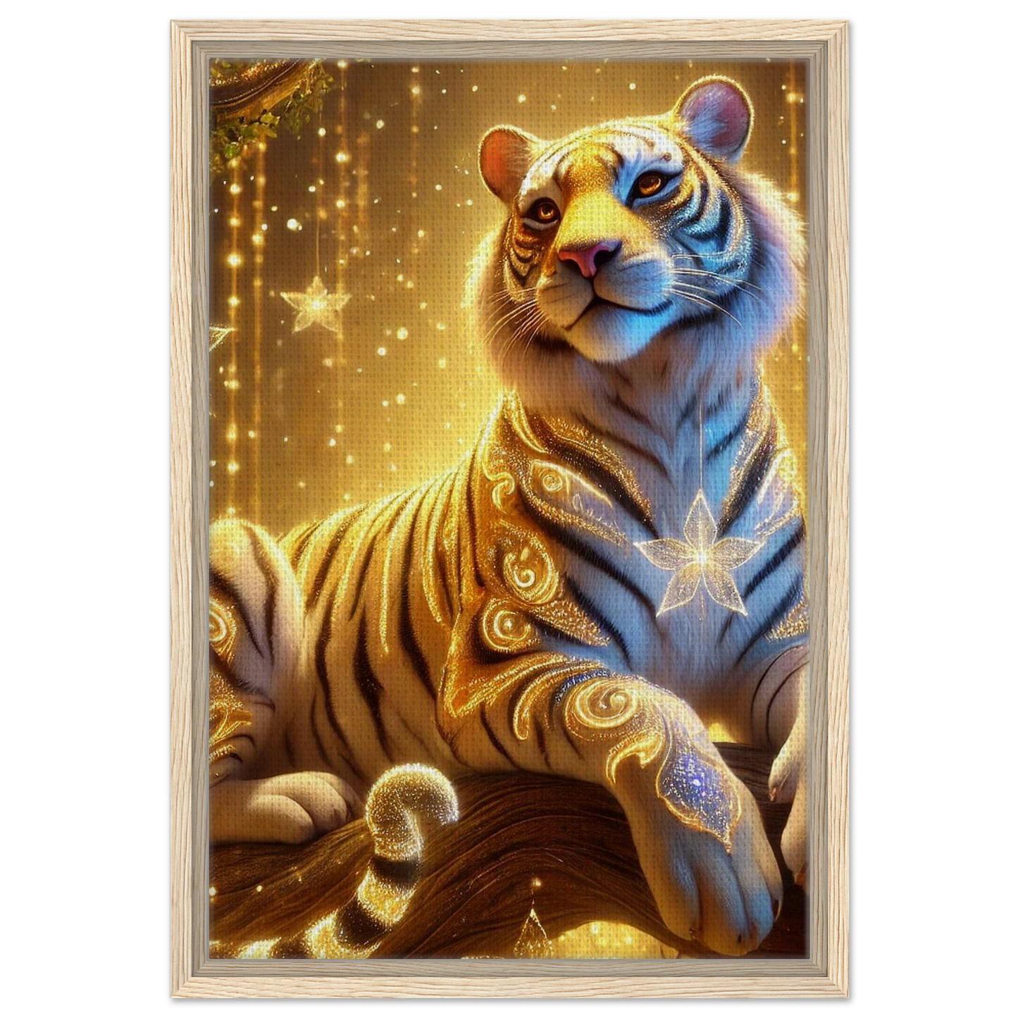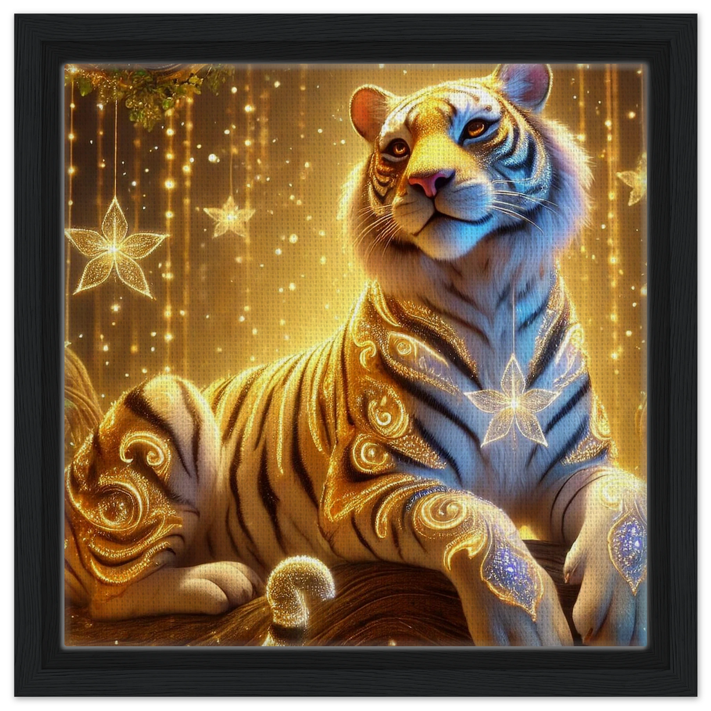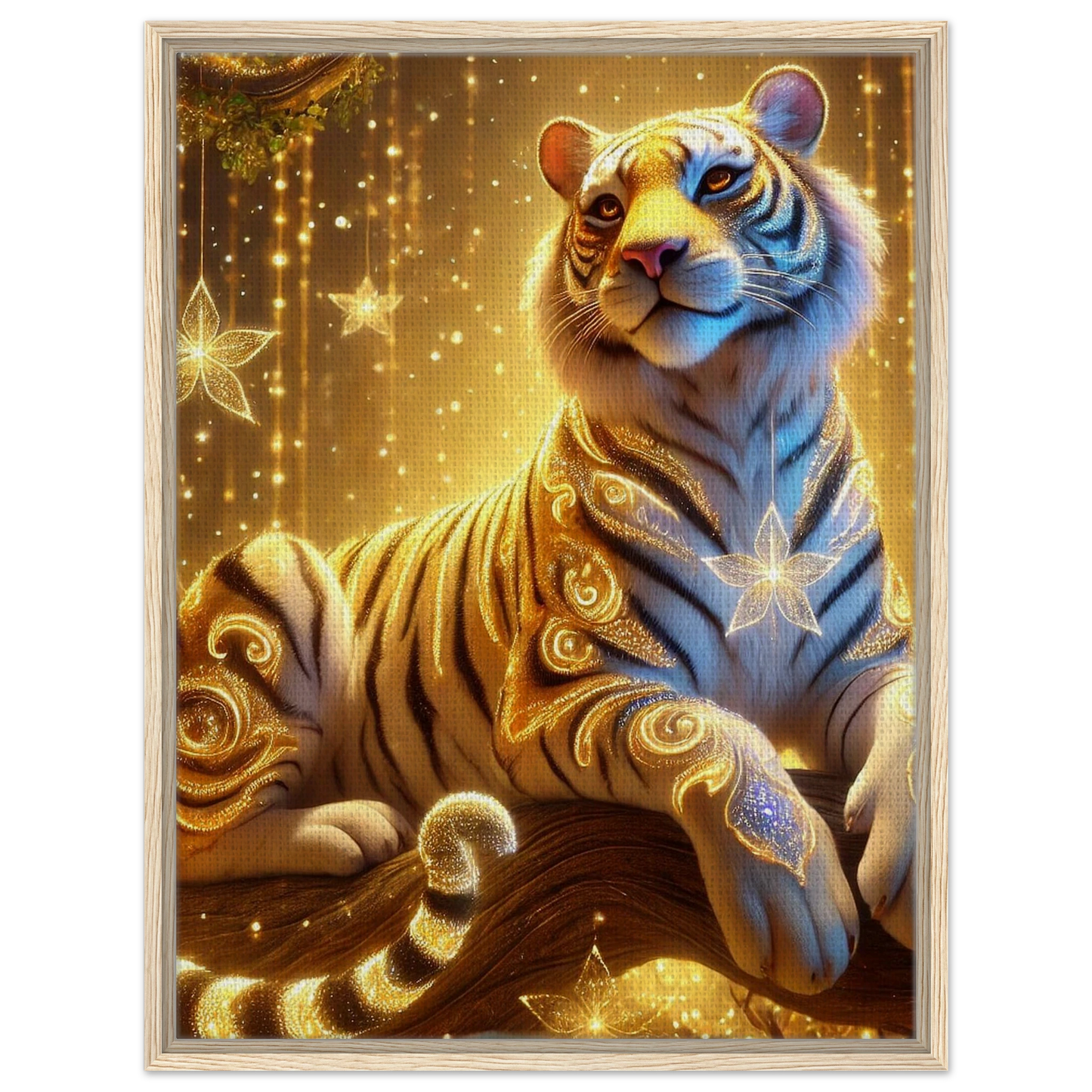 Luxarion, der Tiger aus Licht und Sternenstaub, ruht unter einem Himmelszelt aus Gold und Magie. Seine Präsenz schenkt jedem Raum Wärme, Klarheit und ein Gefühl tiefer Ruhe. Dieser gerahmte Leinwanddruck bringt seine leuchtende Energie in dein Zuhause – in einem hochwertigen Rahmen aus FSC-zertifiziertem Holz.