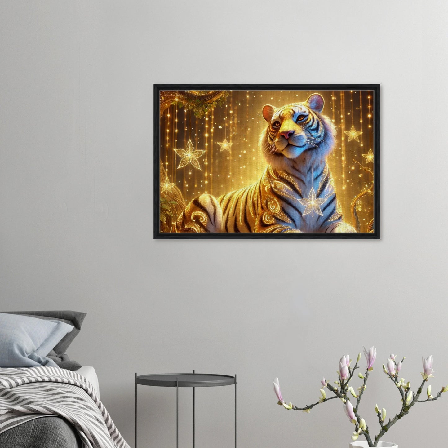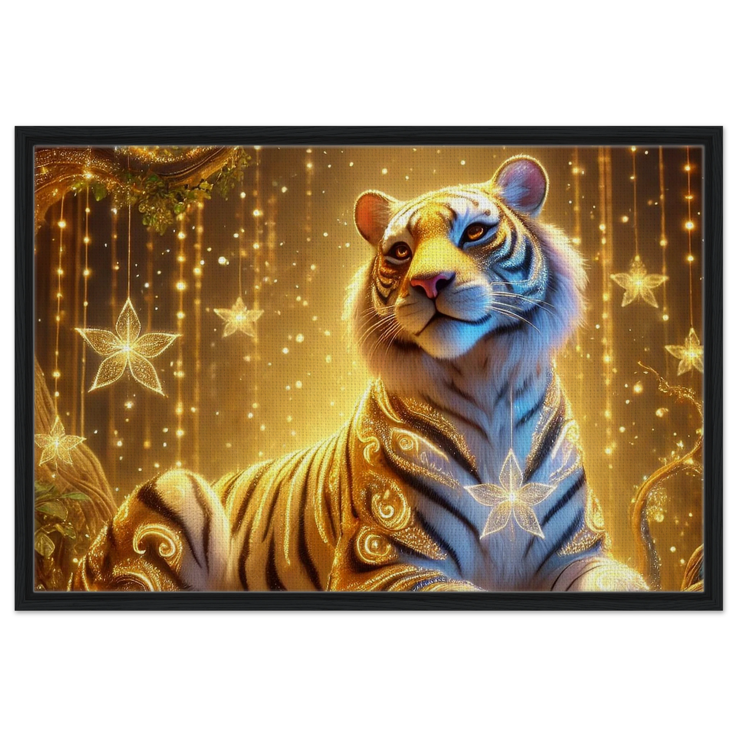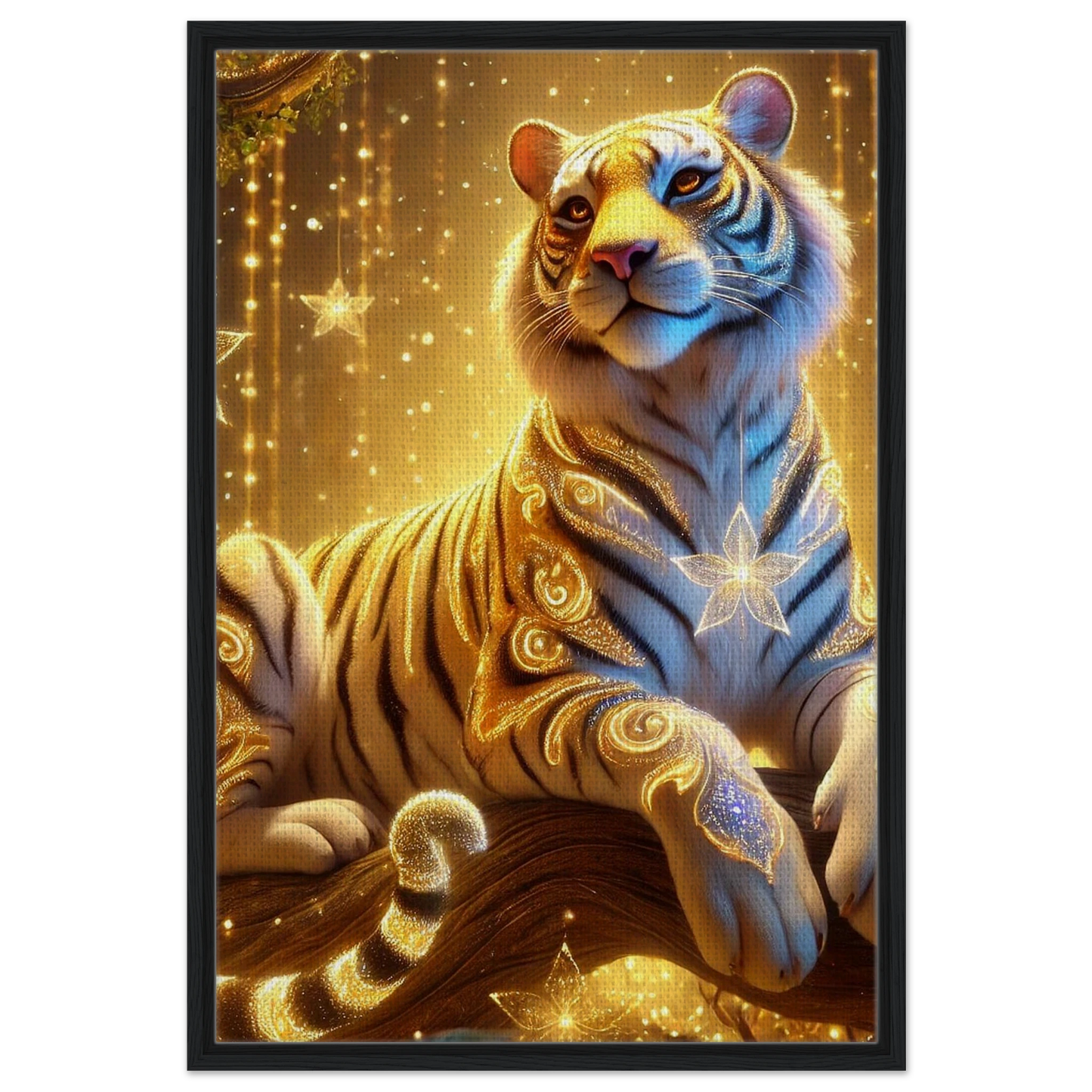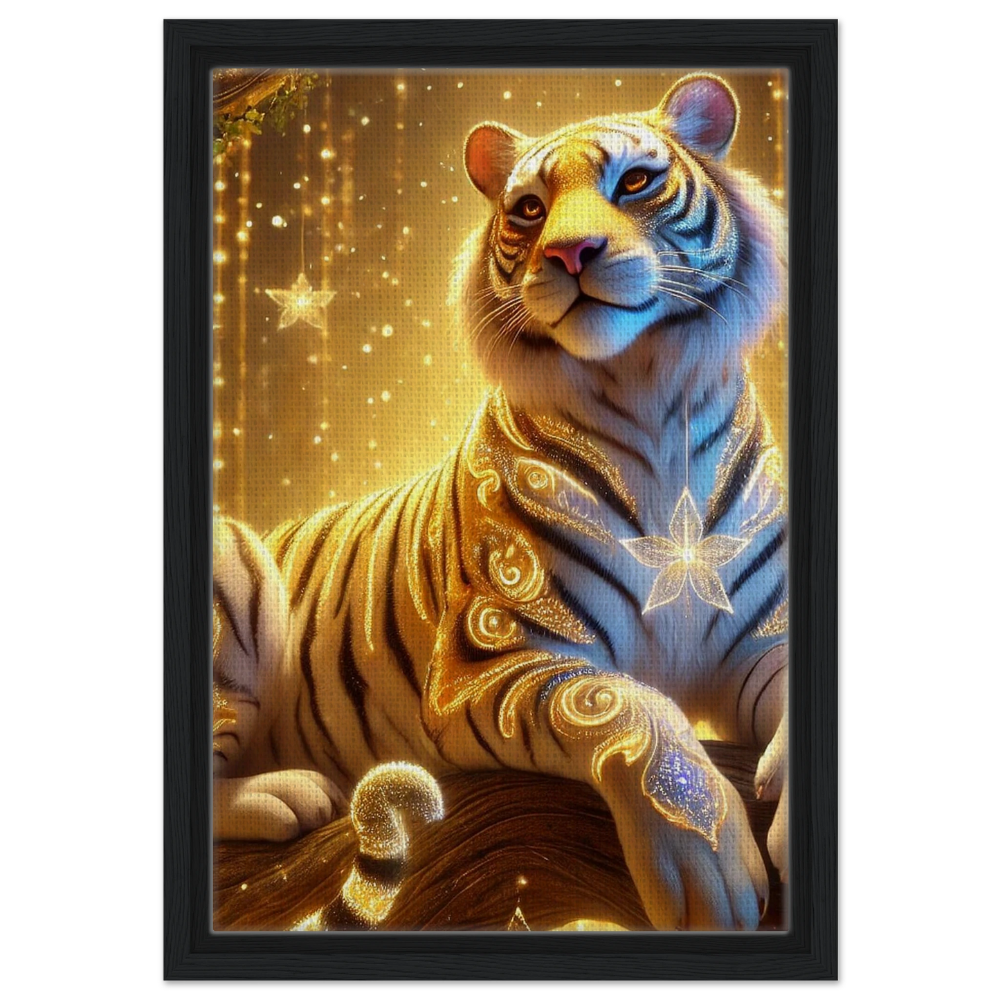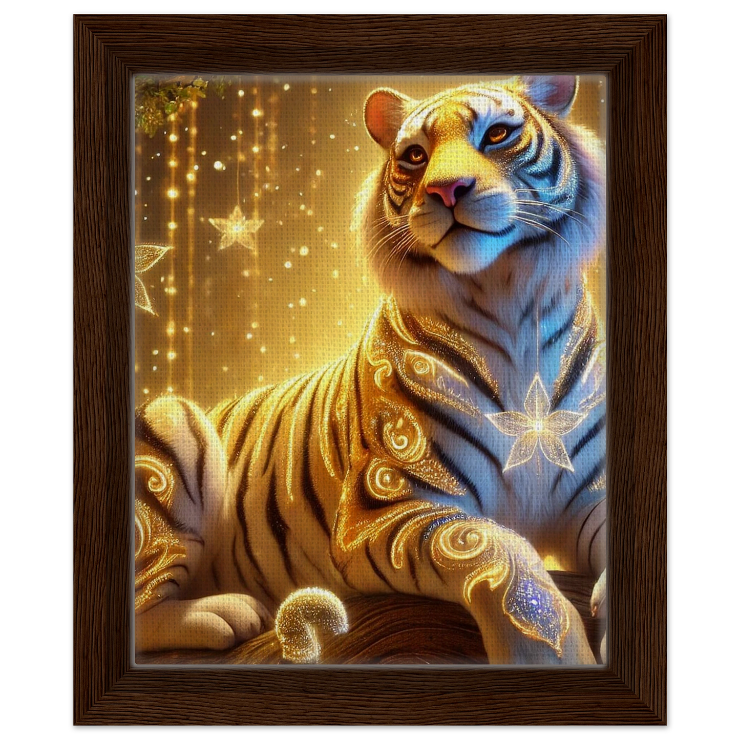 Luxarion, der Tiger aus Licht und Sternenstaub, ruht unter einem Himmelszelt aus Gold und Magie. Seine Präsenz schenkt jedem Raum Wärme, Klarheit und ein Gefühl tiefer Ruhe. Dieser gerahmte Leinwanddruck bringt seine leuchtende Energie in dein Zuhause – in einem hochwertigen Rahmen aus FSC-zertifiziertem Holz.