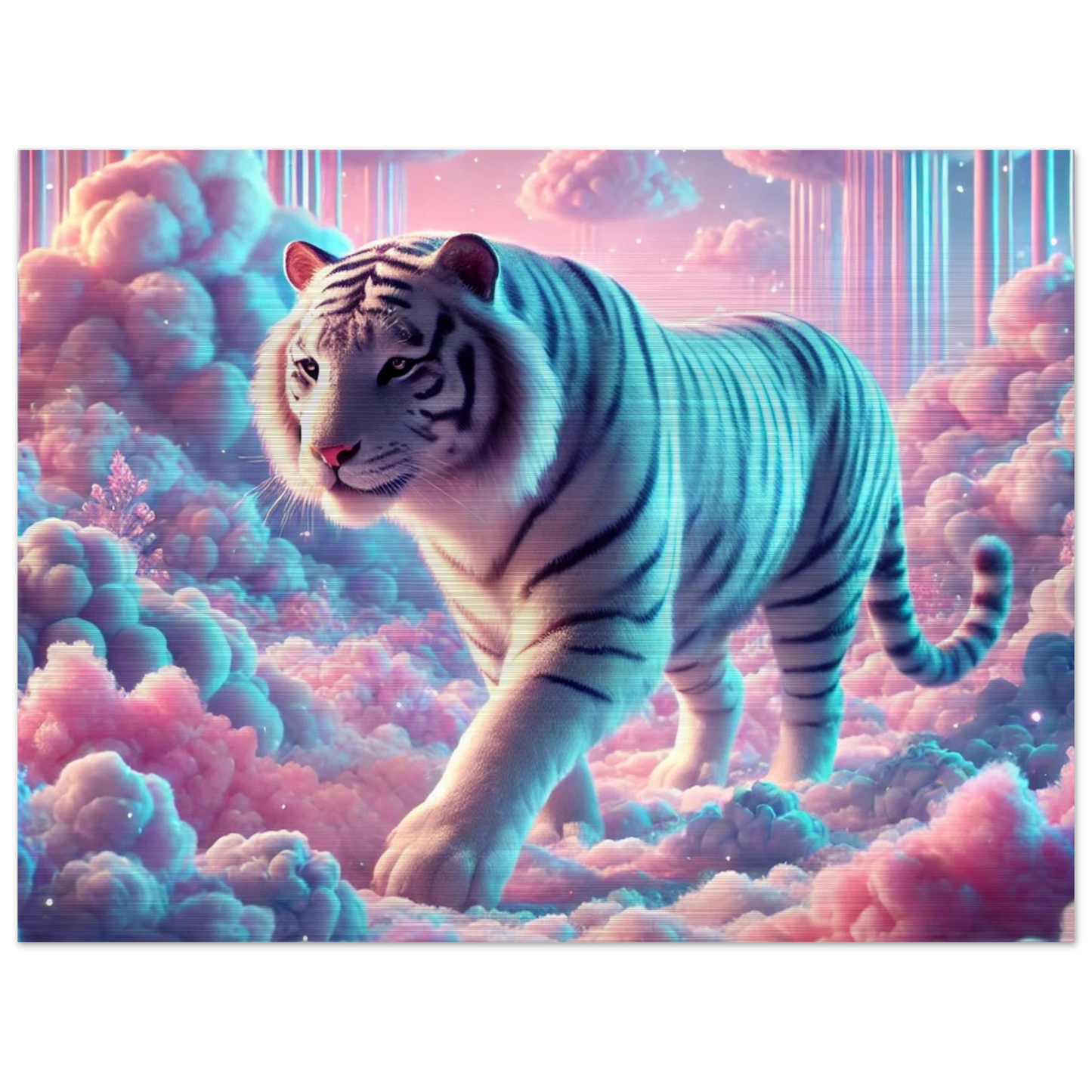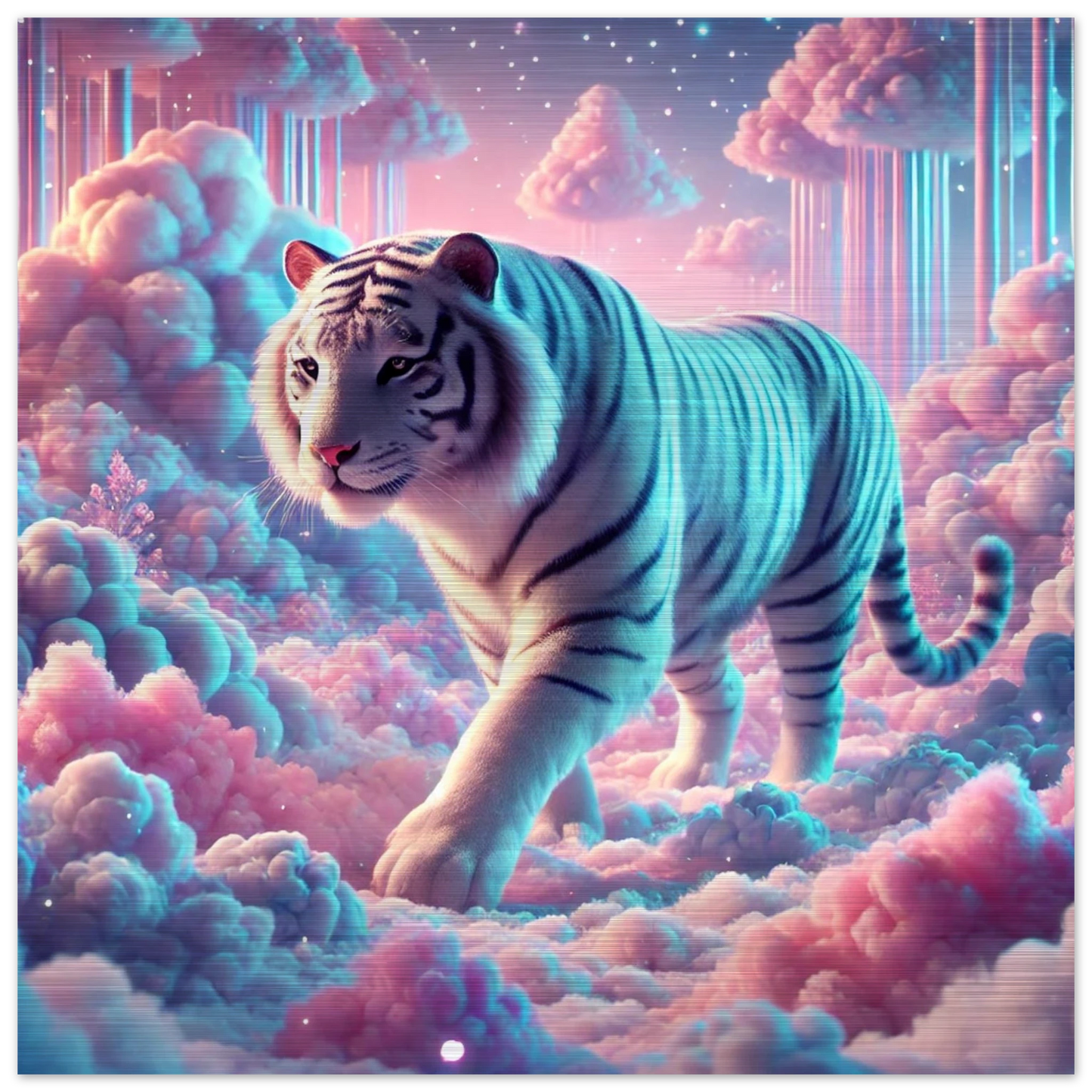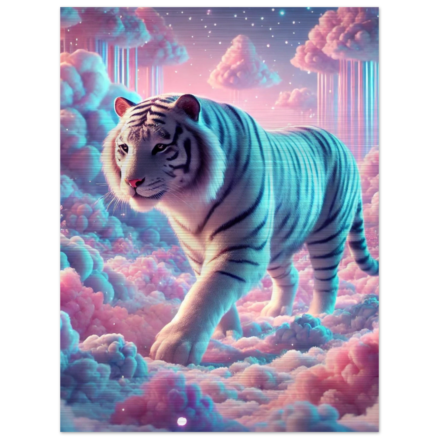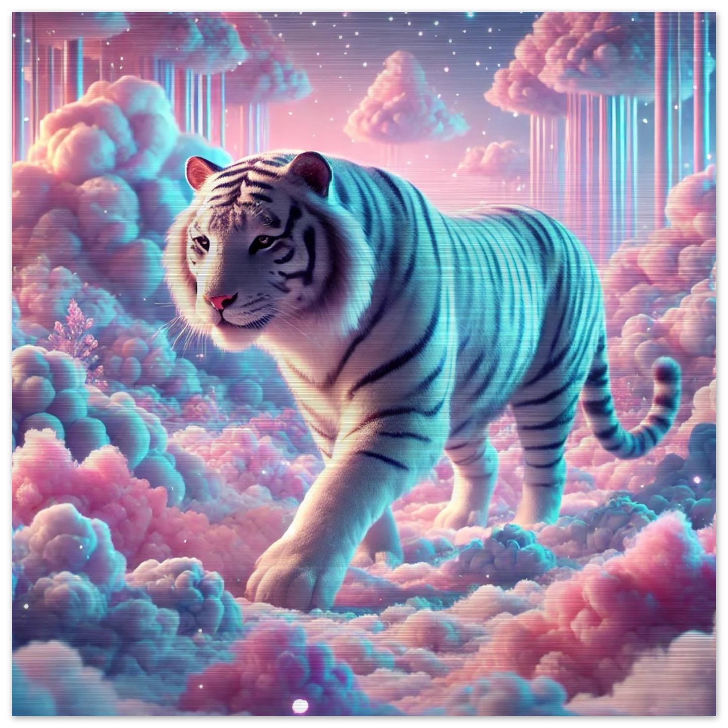 Neburo – ein majestätischer Tiger aus Traum und Wolke, geboren im Dämmerlicht zwischen den Welten. Seine weißen Streifen leuchten wie Sternenstaub auf Wattewolken, und sein Blick bringt Klarheit für jene, die zwischen Fantasie und Realität wandern.