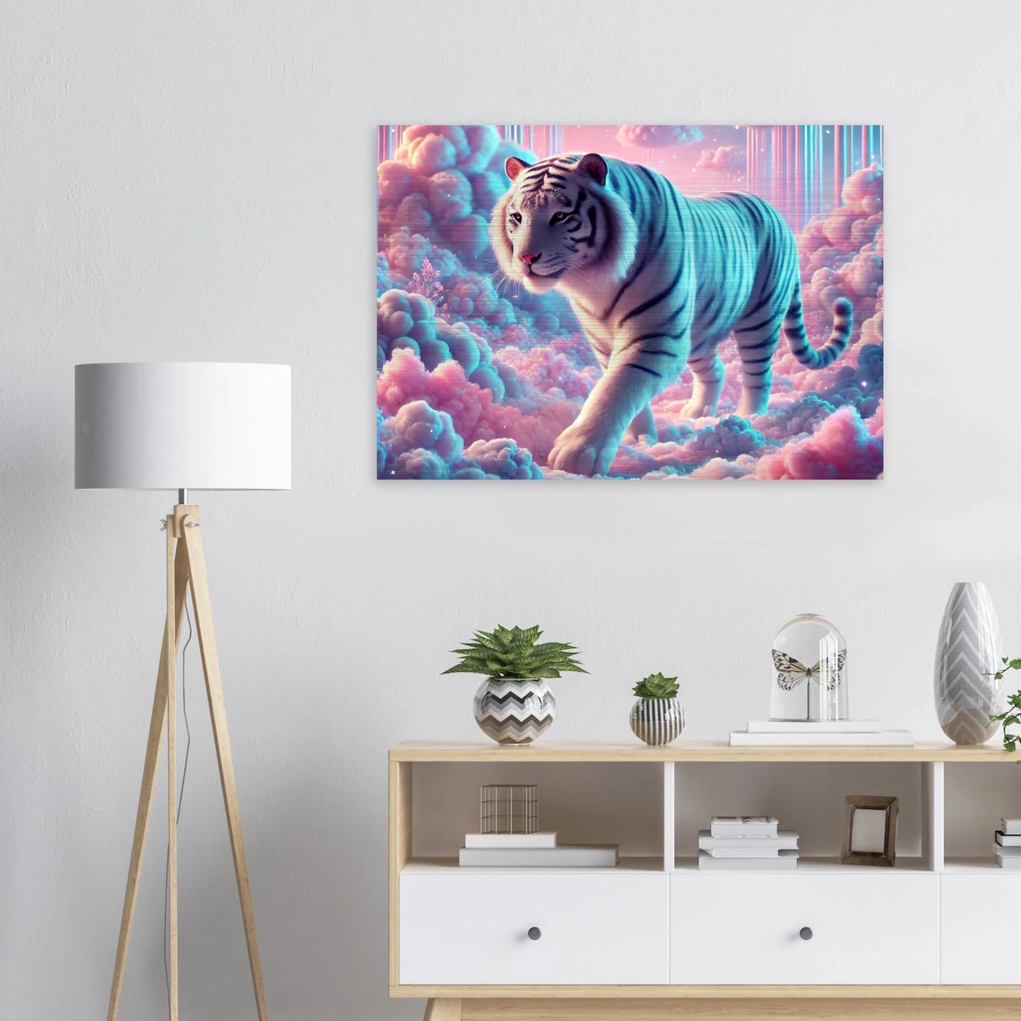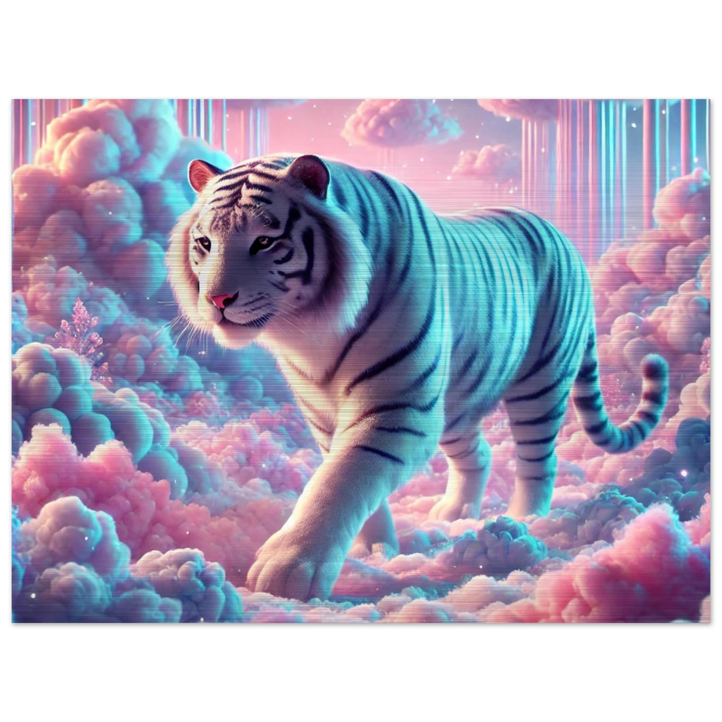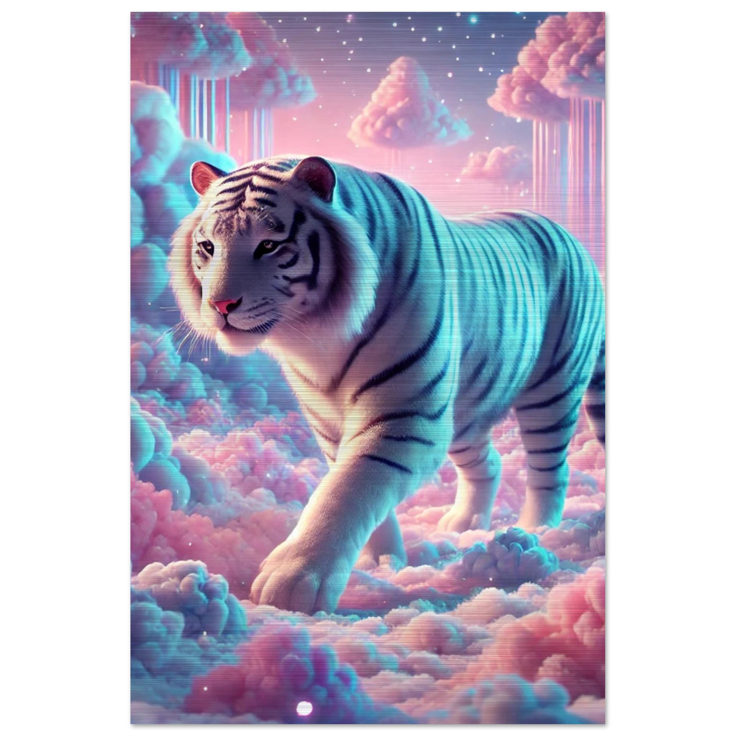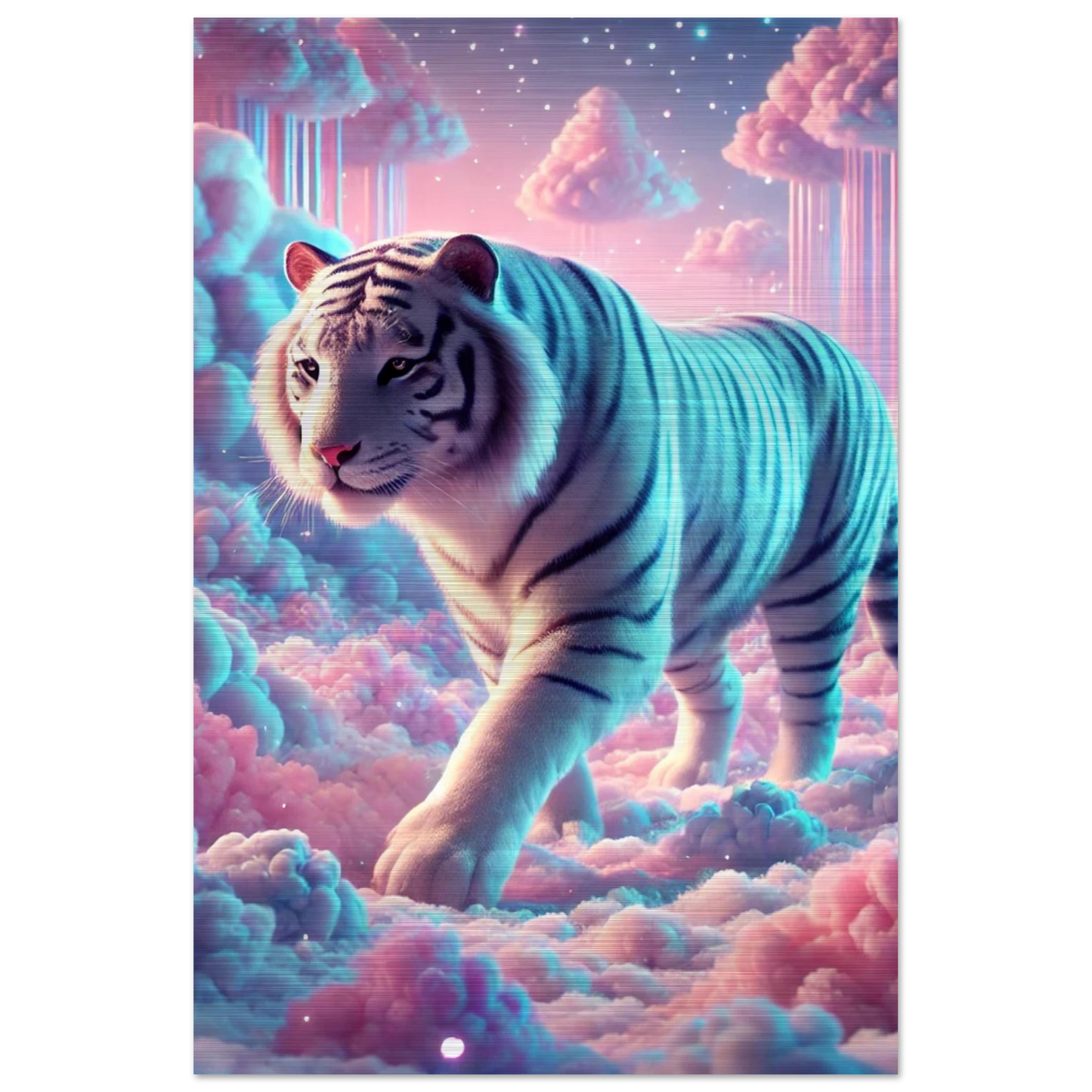 Neburo – ein majestätischer Tiger aus Traum und Wolke, geboren im Dämmerlicht zwischen den Welten. Seine weißen Streifen leuchten wie Sternenstaub auf Wattewolken, und sein Blick bringt Klarheit für jene, die zwischen Fantasie und Realität wandern.