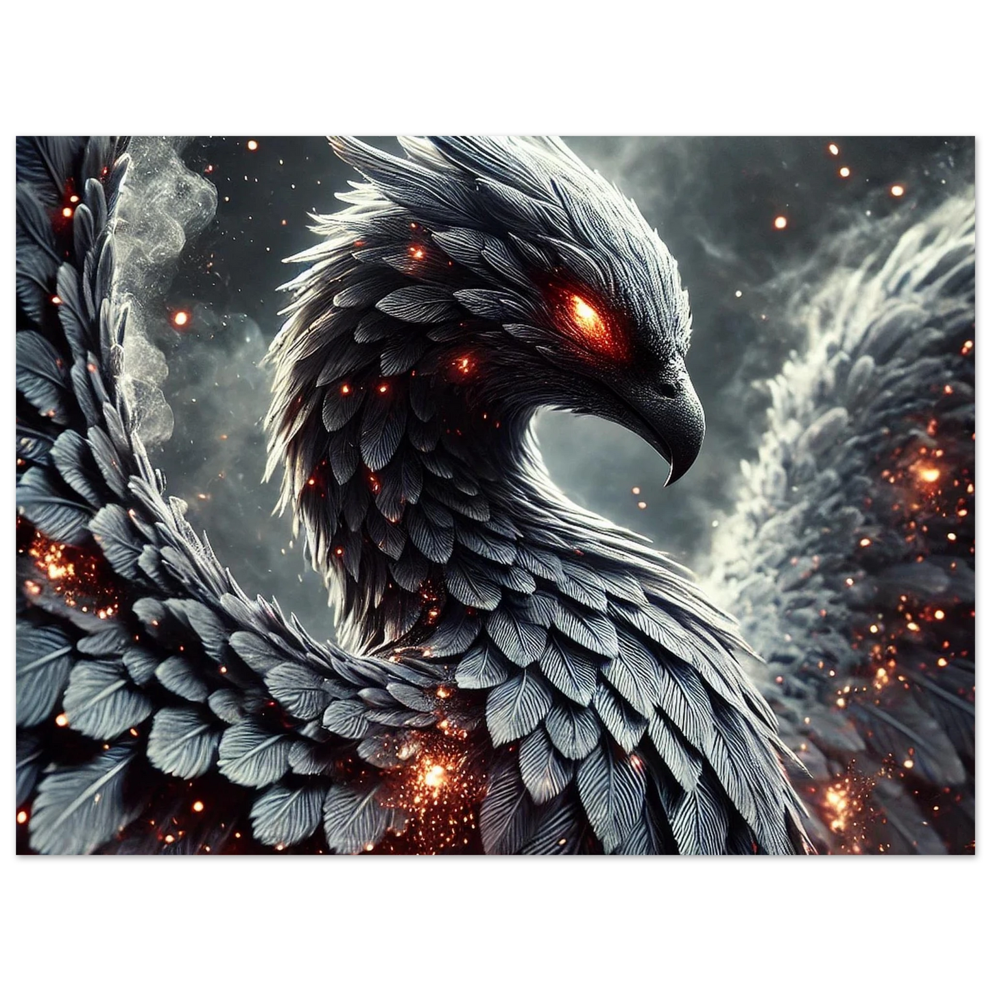 In der Tiefe der Dunkelheit, dort wo keine Sonne scheint und das Feuer nur im Herzen lodert, erhebt sich Noctaryon. Sein Gefieder ist schwarz wie die Nacht, durchzogen von glutroten Linien wie flüssige Glut. Seine leuchtenden Augen erinnern an Glimmer in der Asche – still, stark und wachsam.