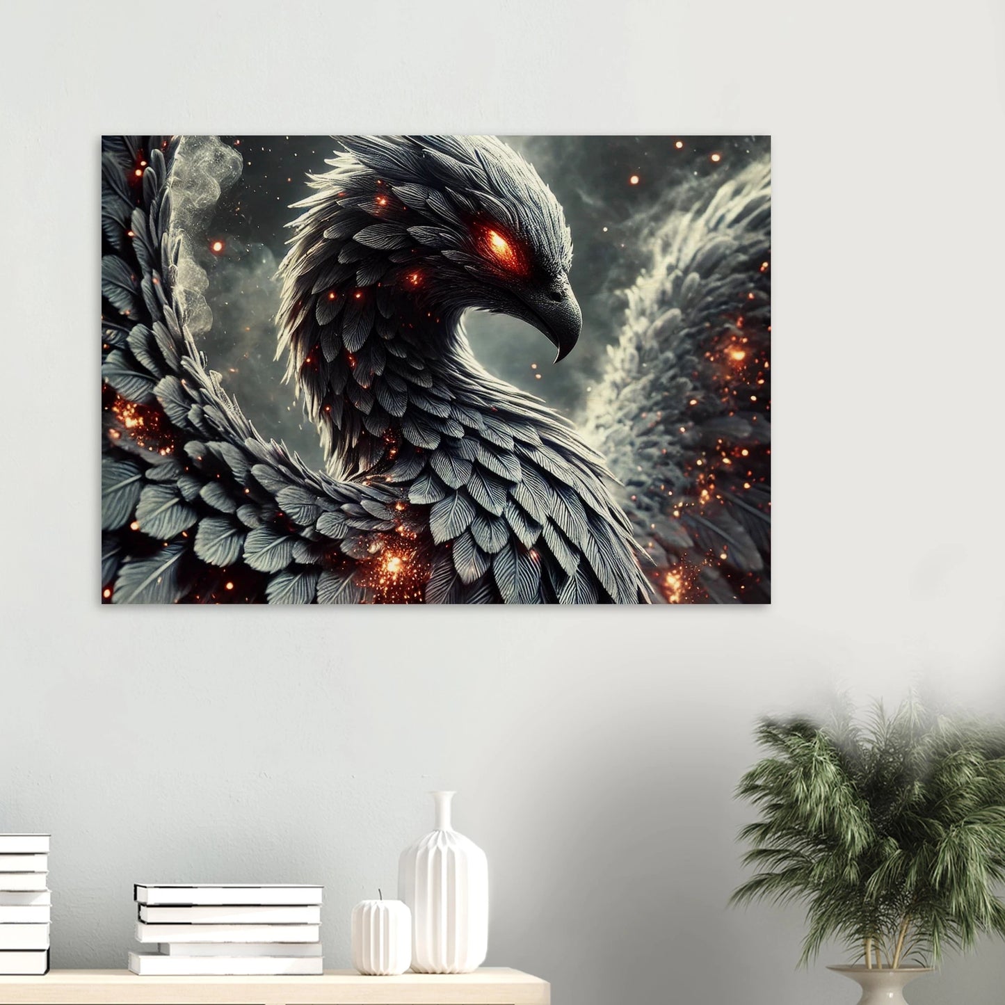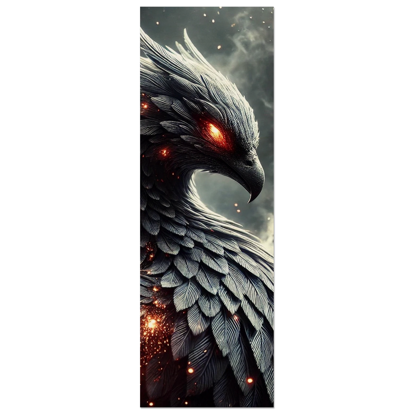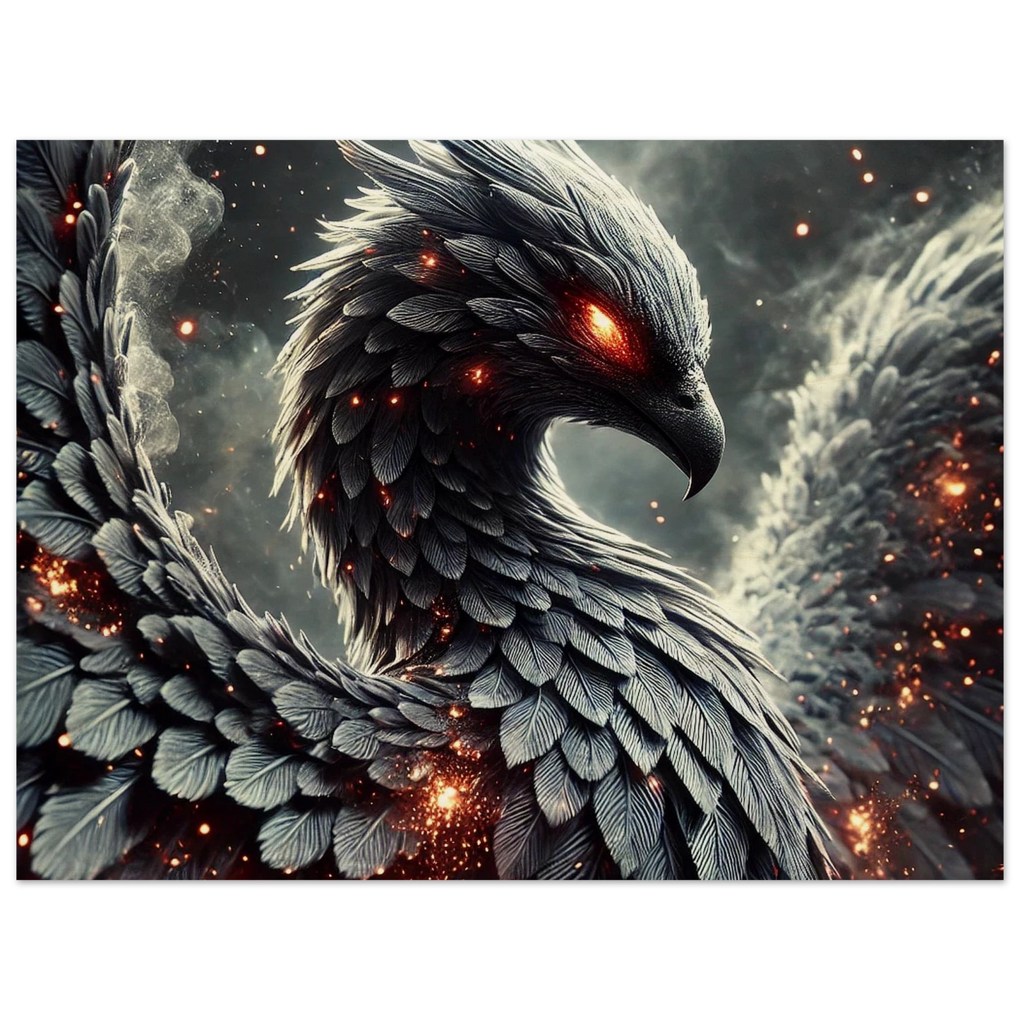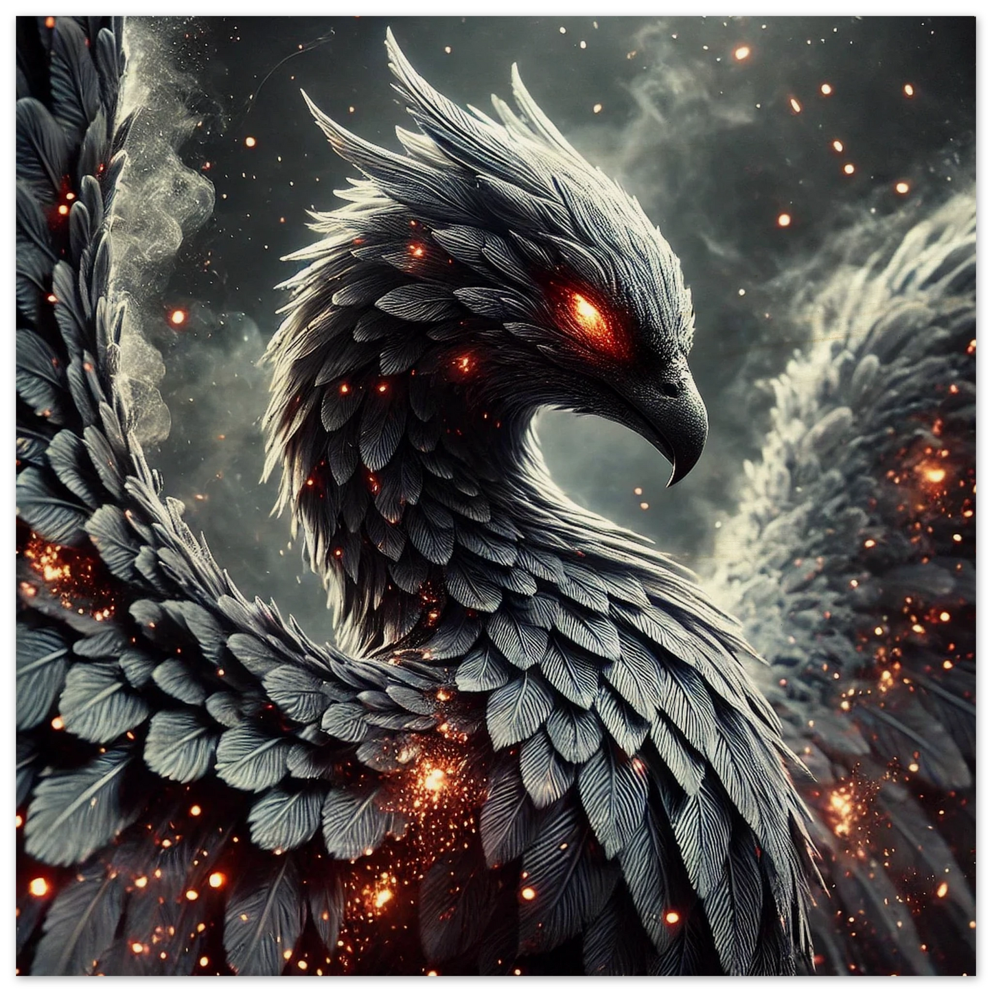 Noctaryon – geboren aus Flammenasche und tiefer Nacht, gleitet er durch die Dunkelheit wie ein stiller Wächter aus einer vergessenen Welt. In seinem schwarzen Gefieder lodert glühendes Rot, in seinen Augen flackert der Funke der Erneuerung. Er ist das leise Versprechen, dass selbst aus der tiefsten Stille ein neues Feuer entstehen kann.
