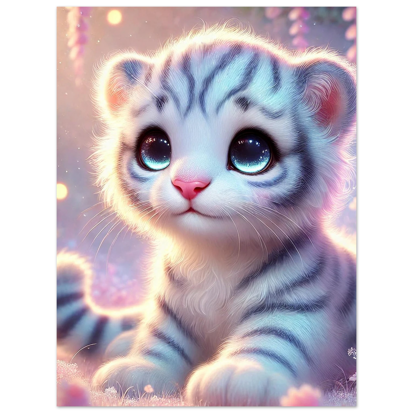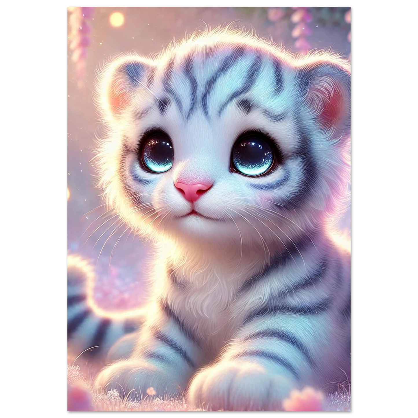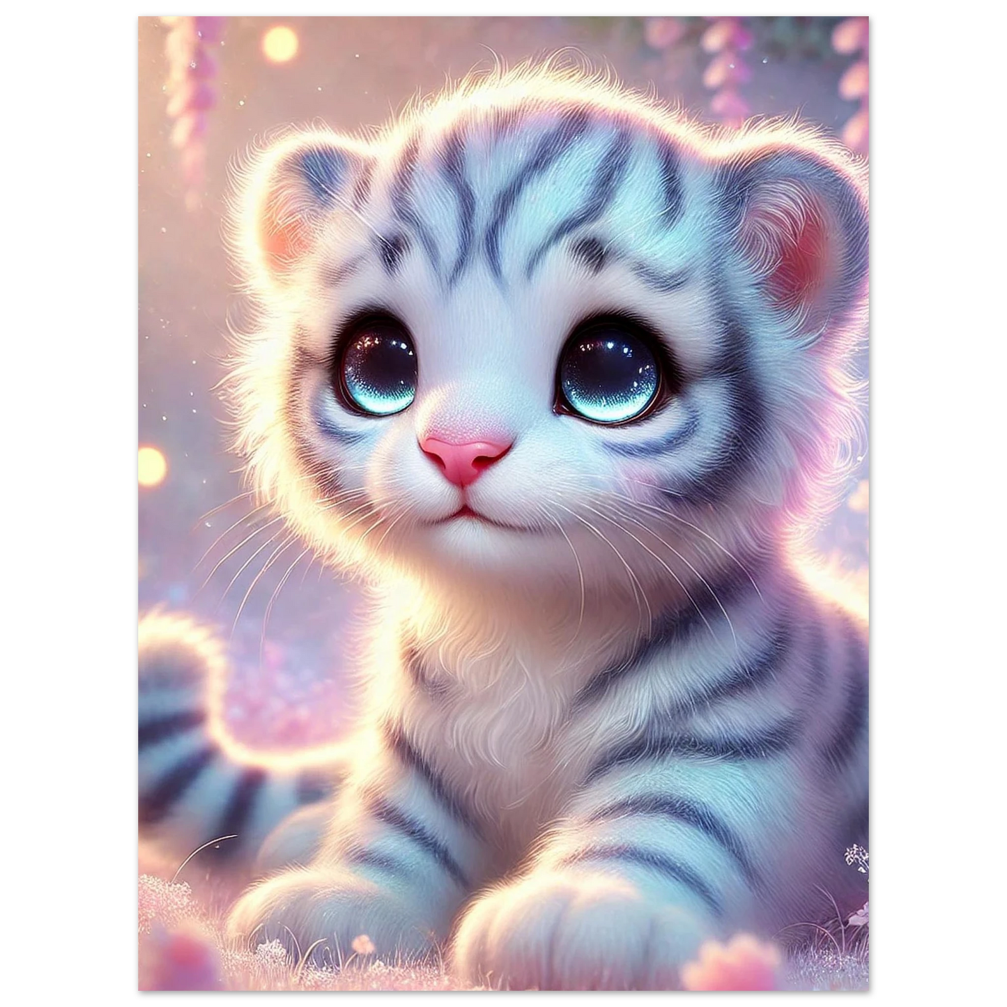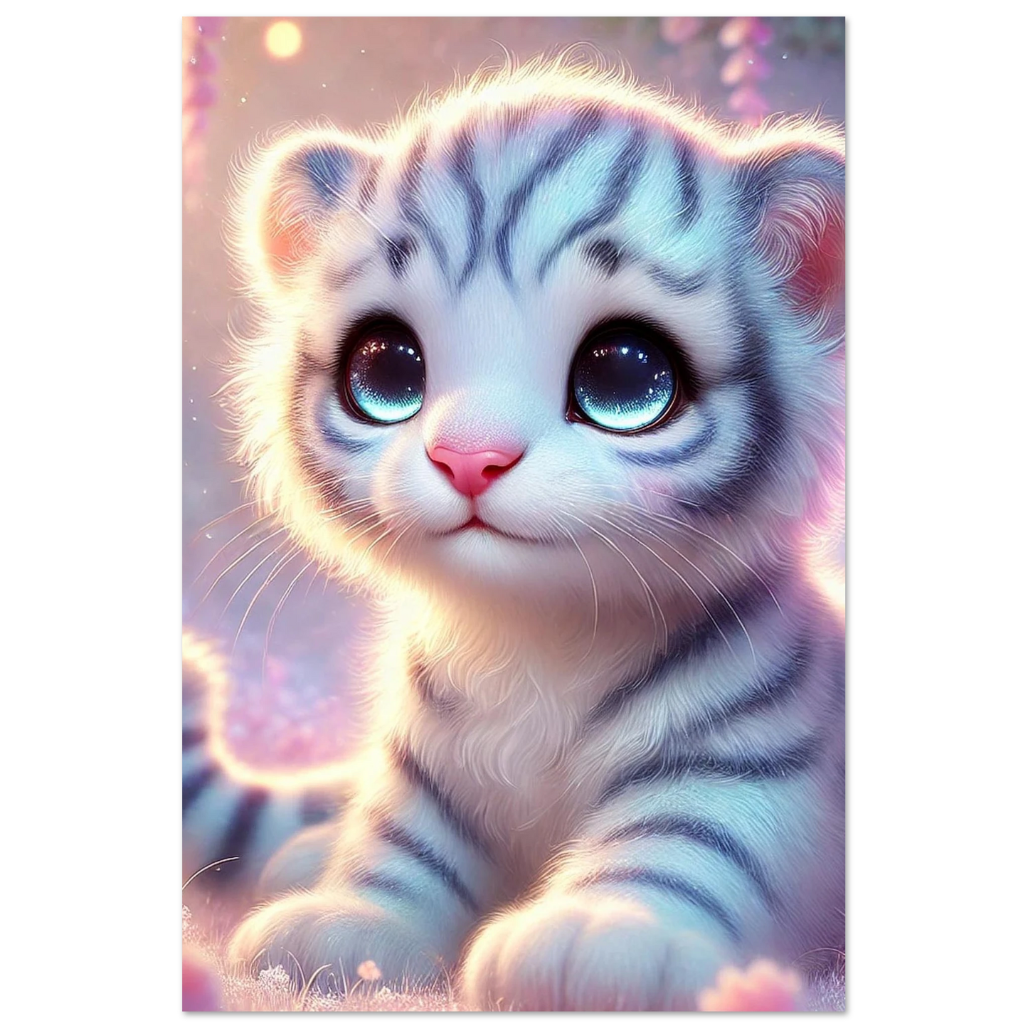 Nuala, das kleine weiße Tigerjunges mit lavendelfarbenen Streifen, ist wie ein lebendiges Frühlingsmärchen – sanft, neugierig und voller Hoffnung. Geboren in einem Tal ewiger Blüten, bringt sie mit jedem Blick Wärme und Leichtigkeit in dein Zuhause.