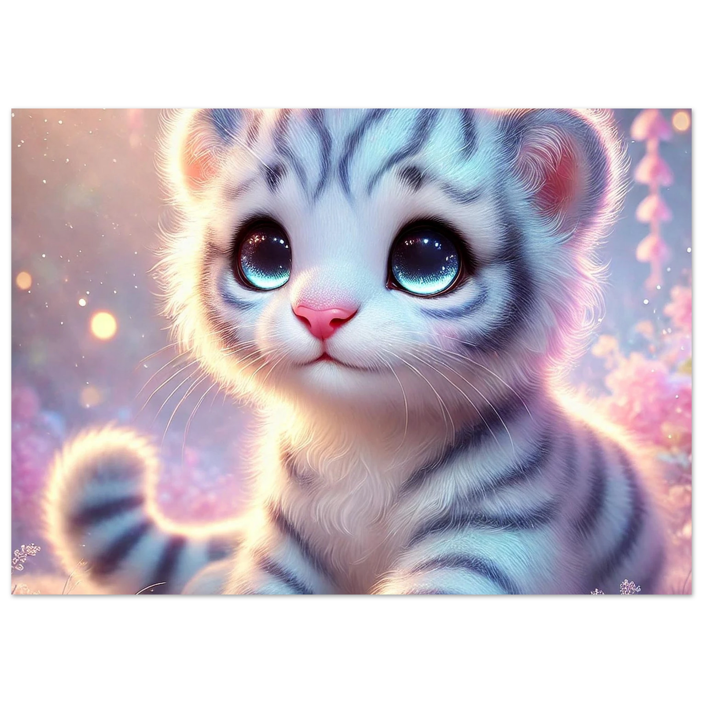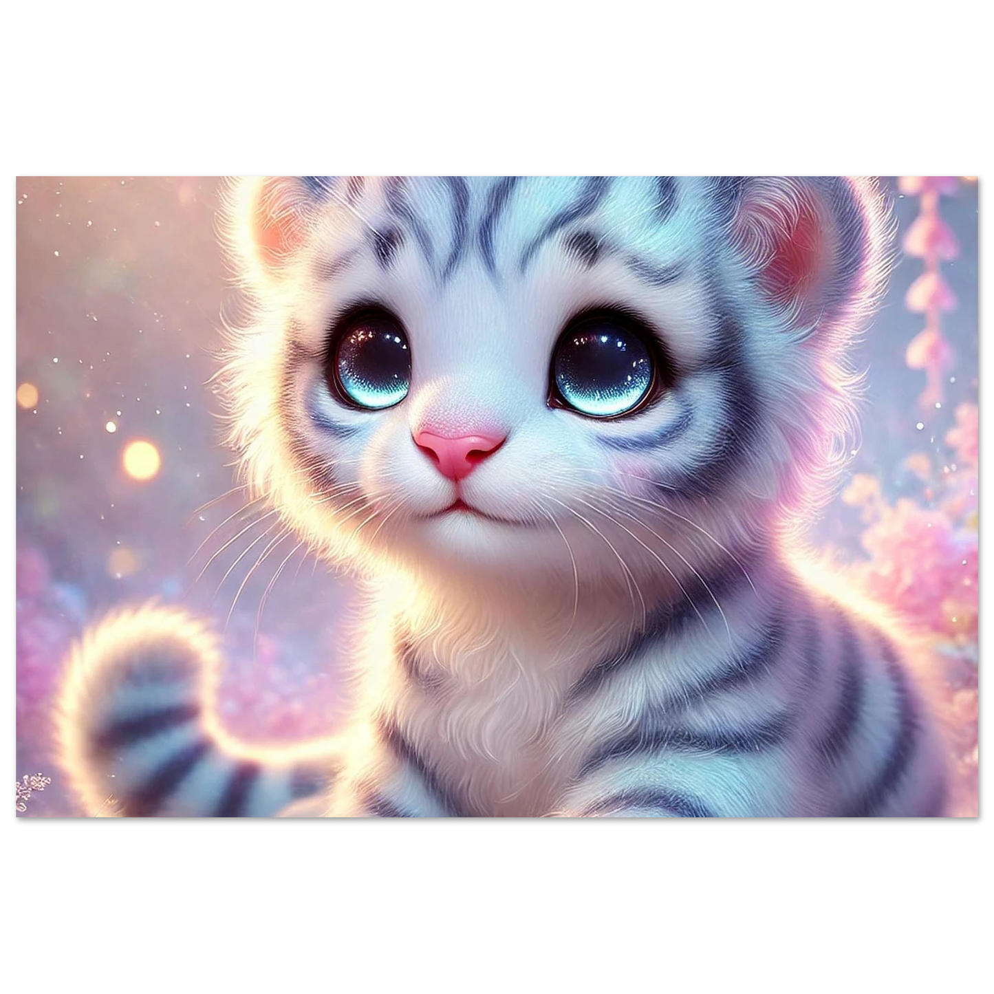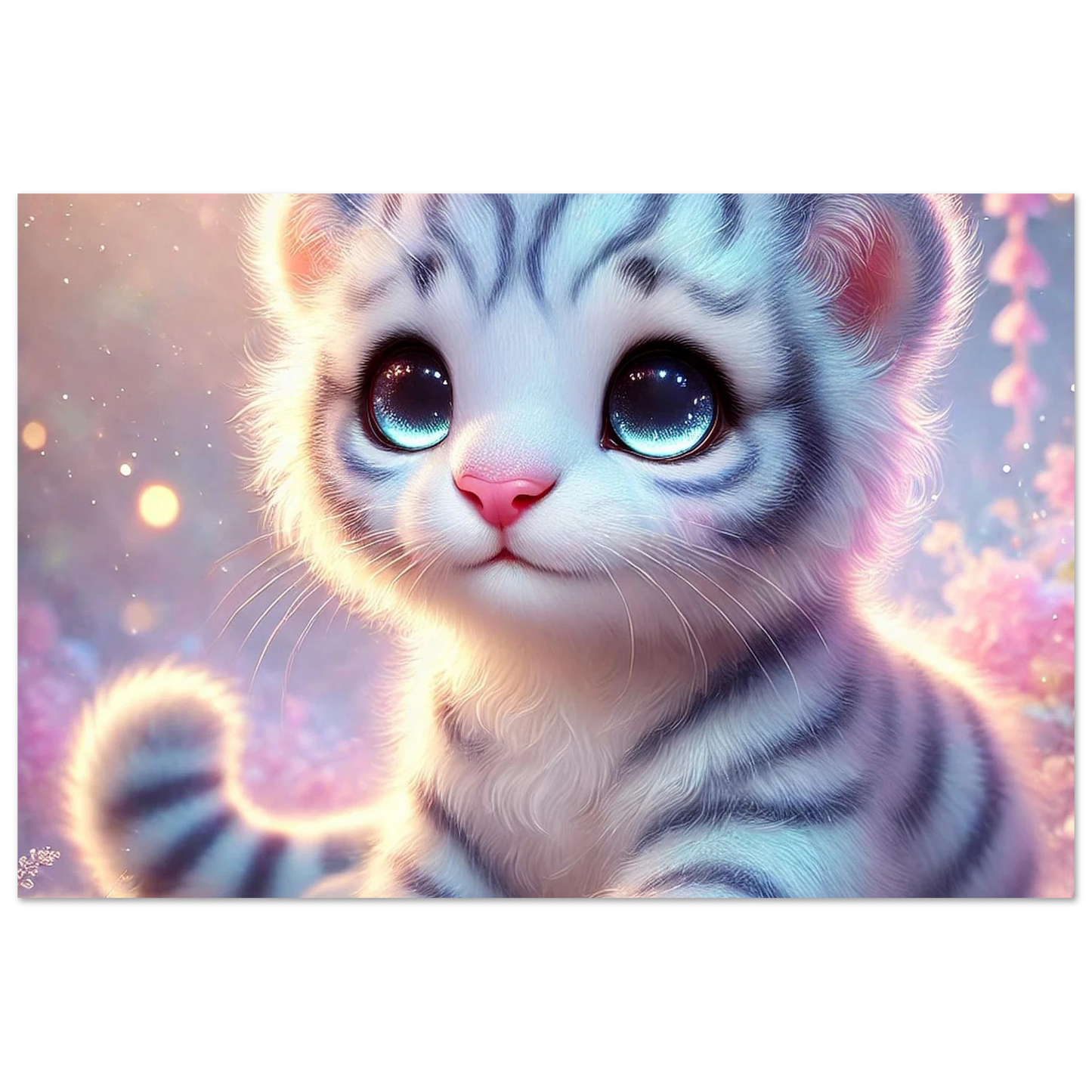 Nuala, das kleine weiße Tigerjunges mit lavendelfarbenen Streifen, ist wie ein lebendiges Frühlingsmärchen – sanft, neugierig und voller Hoffnung. Geboren in einem Tal ewiger Blüten, bringt sie mit jedem Blick Wärme und Leichtigkeit in dein Zuhause.