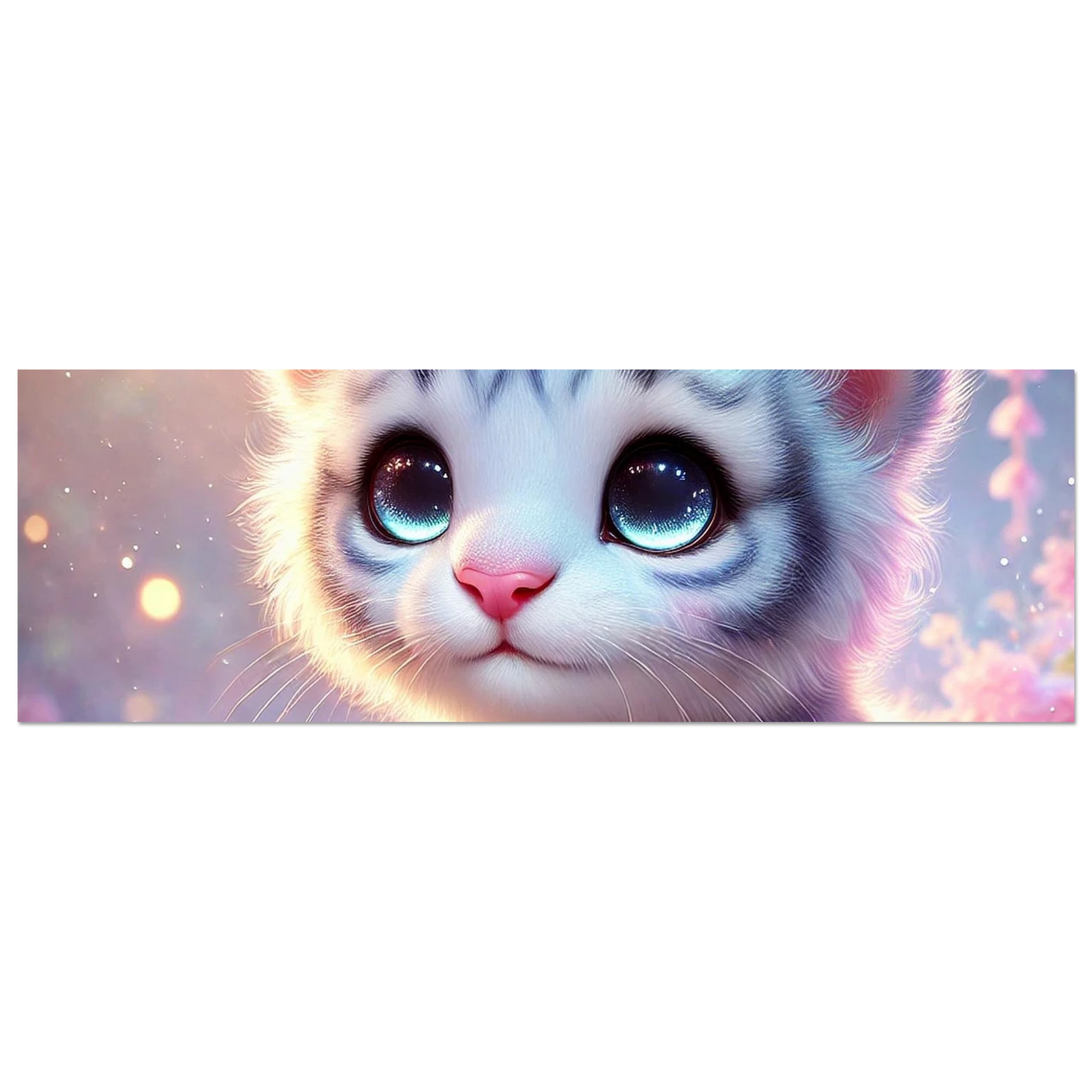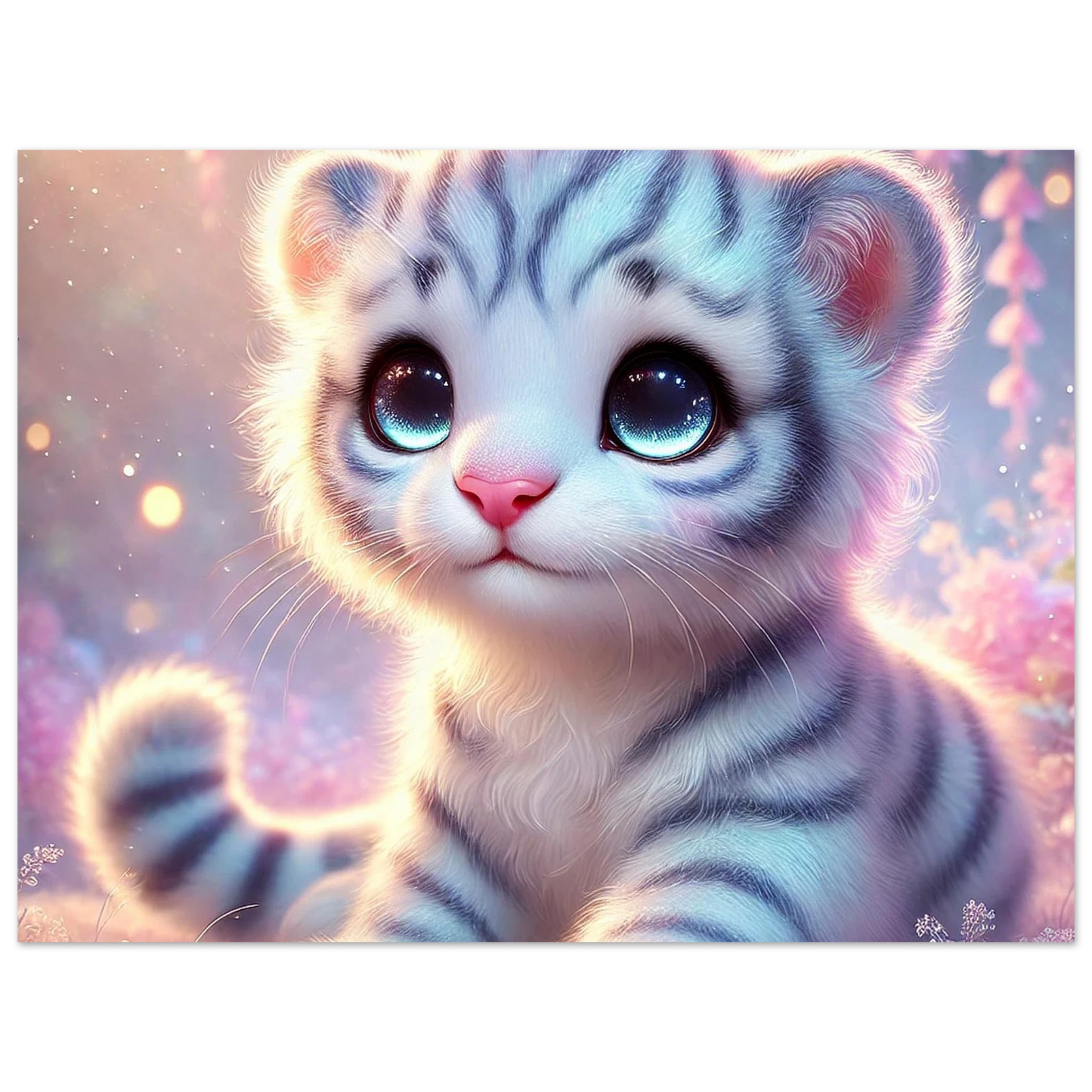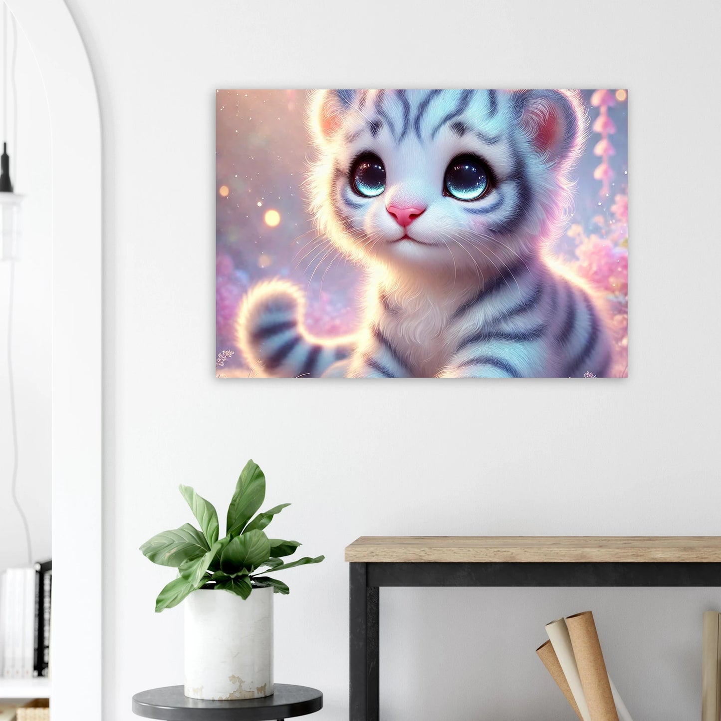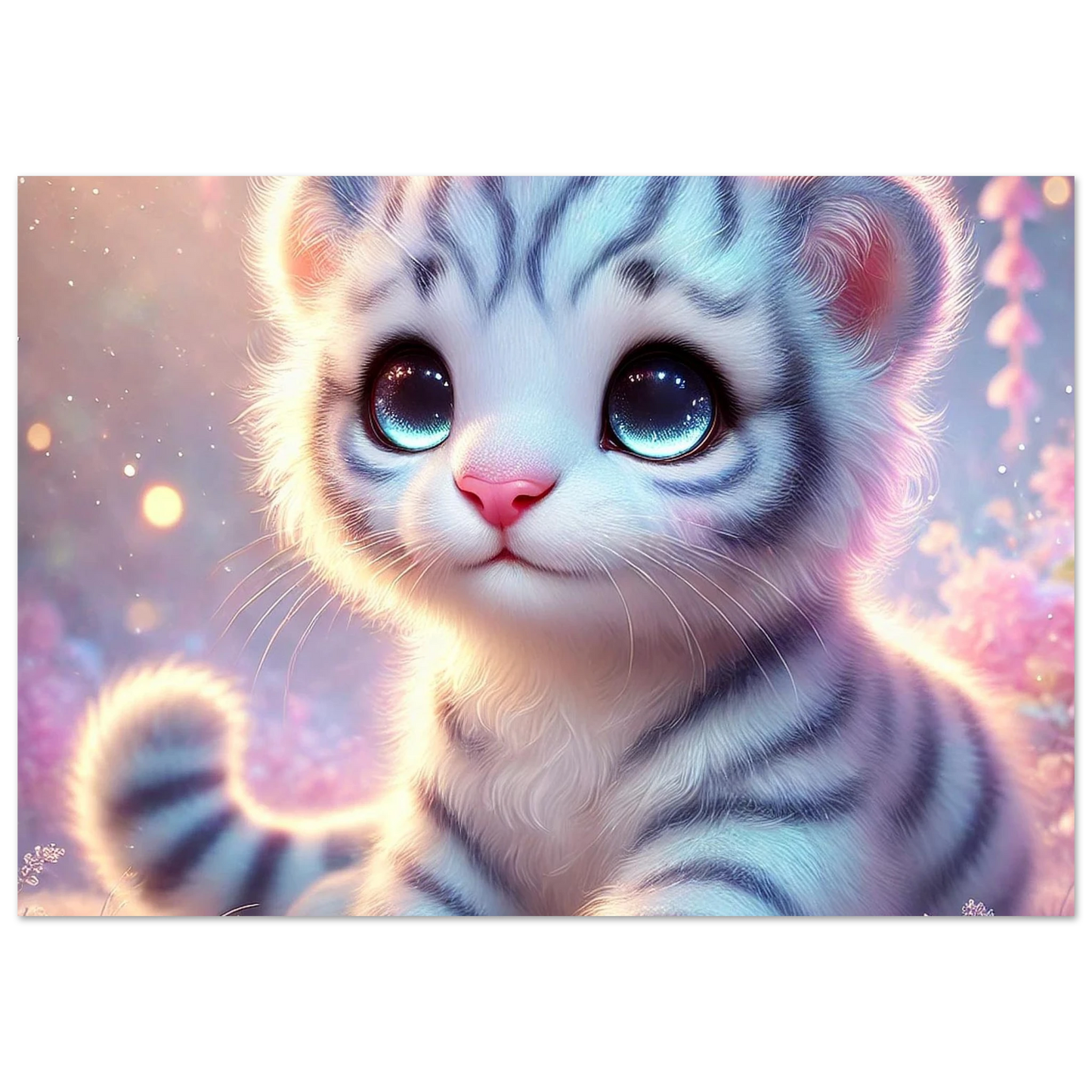 Nuala, das kleine weiße Tigerjunges mit lavendelfarbenen Streifen, ist wie ein lebendiges Frühlingsmärchen – sanft, neugierig und voller Hoffnung. Geboren in einem Tal ewiger Blüten, bringt sie mit jedem Blick Wärme und Leichtigkeit in dein Zuhause.
