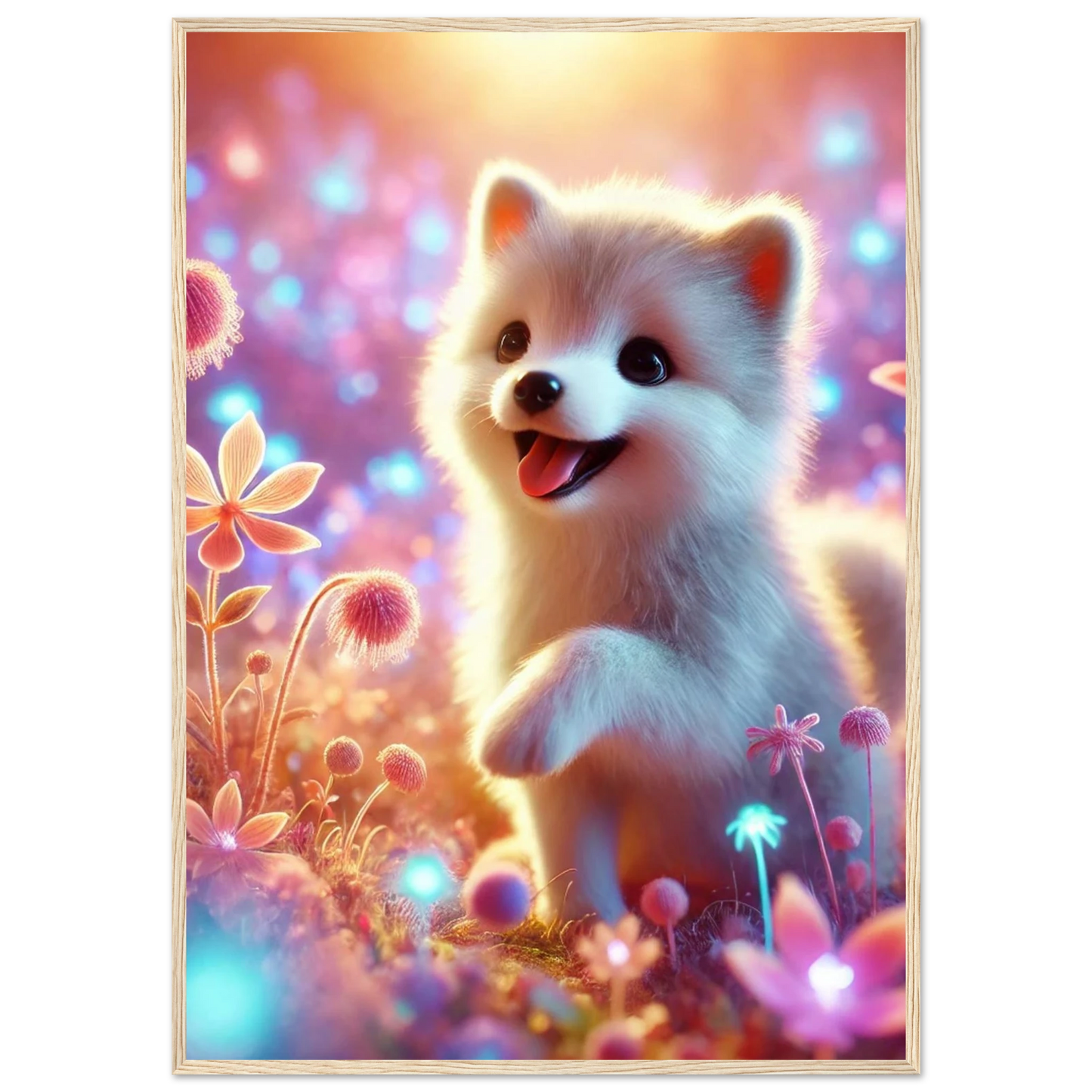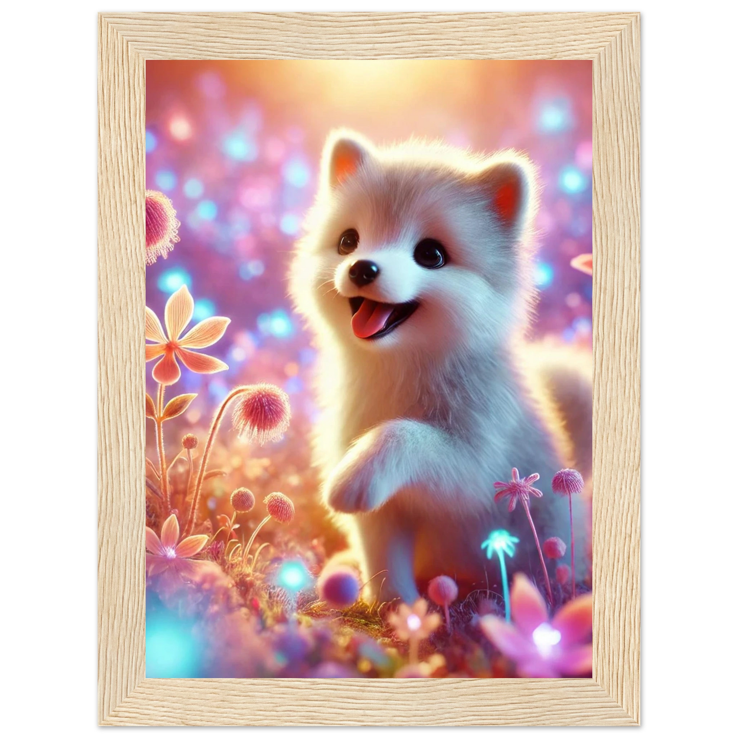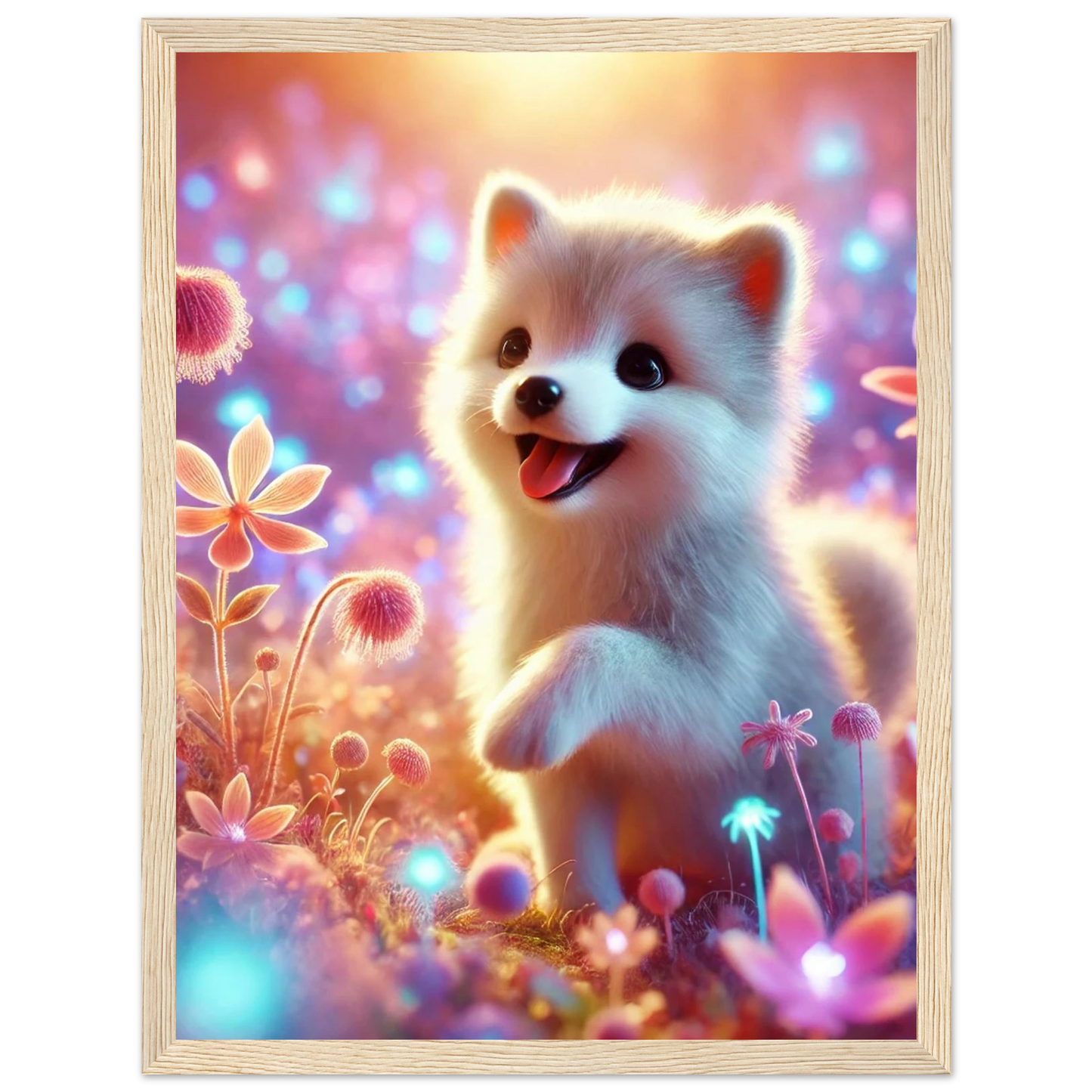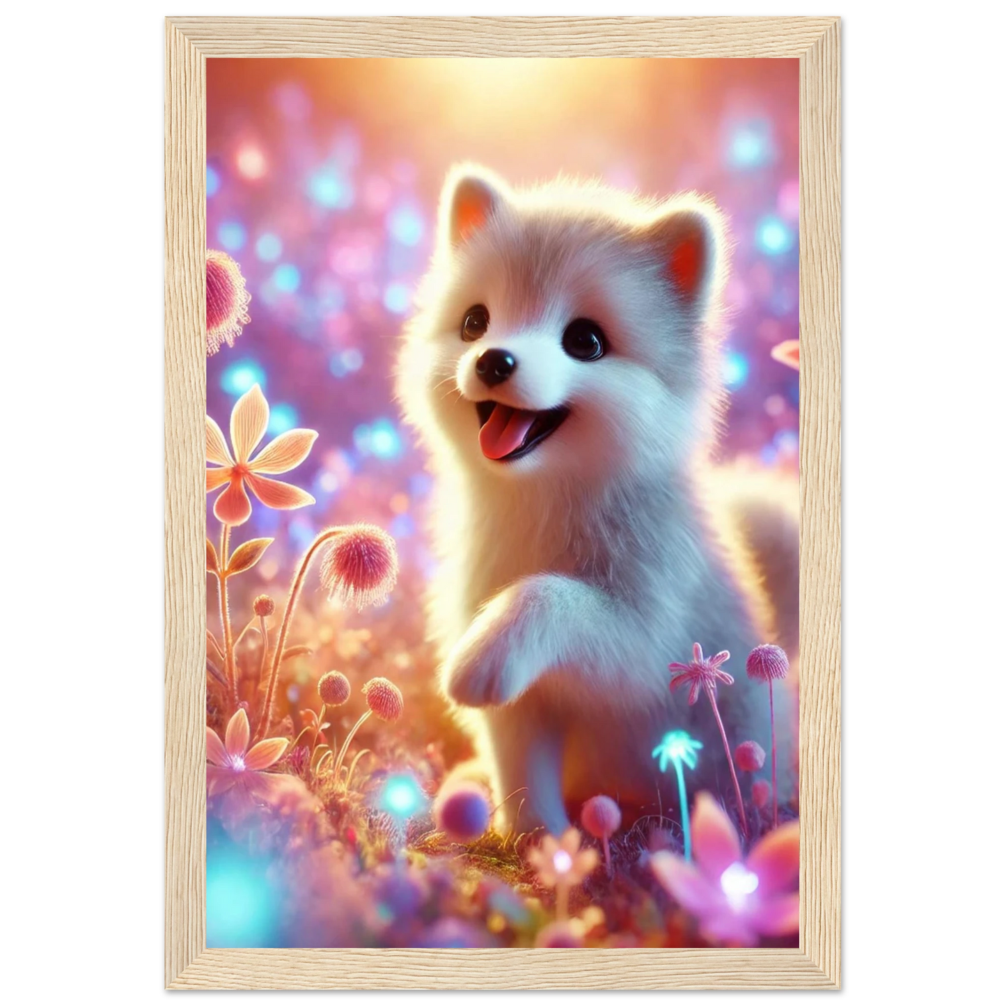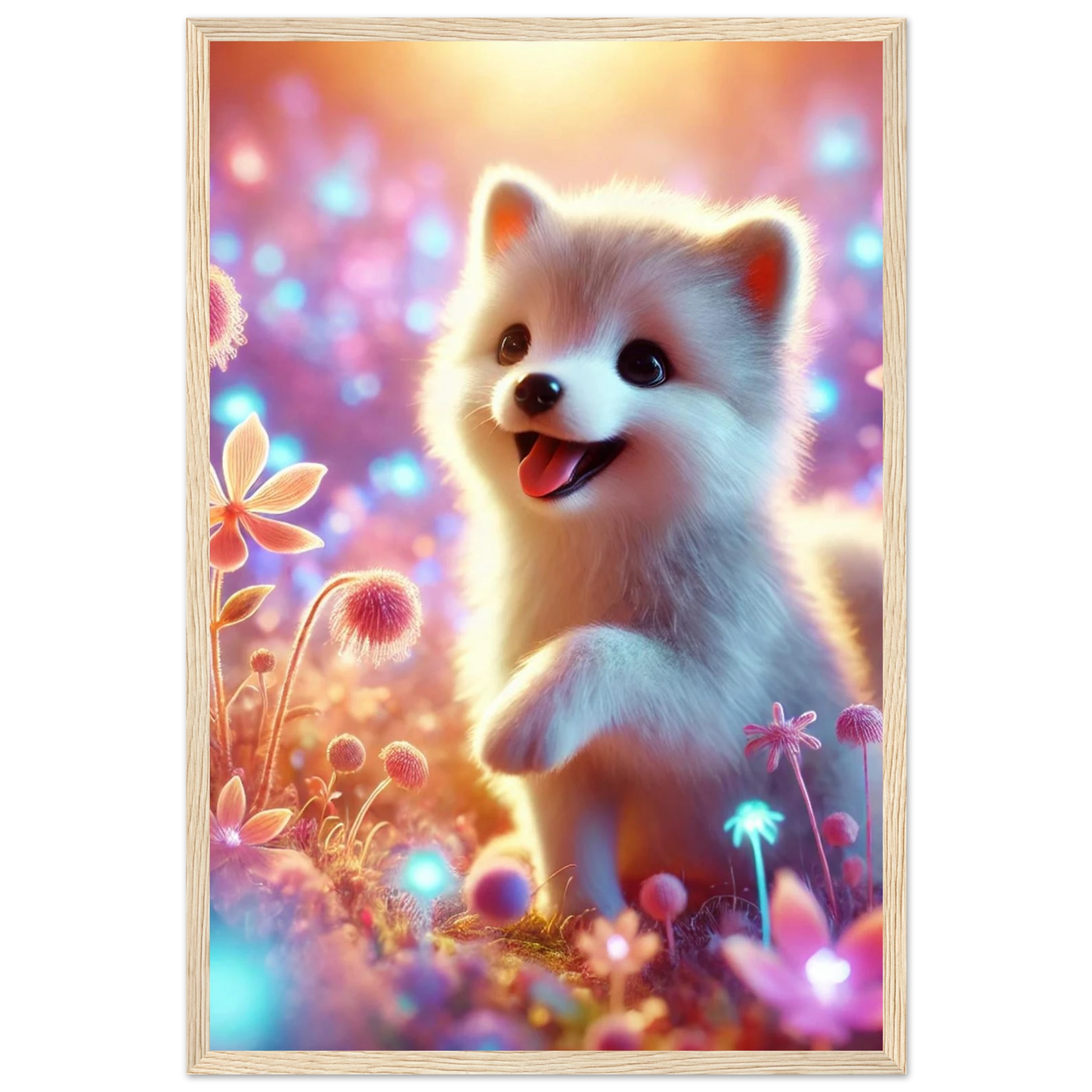 Hol dir Licht, Wärme und pure Lebensfreude an deine Wände – mit diesem detailreichen, holzgerahmten Kunstdruck von Nuki, dem kleinen Wolfswelpen, der das Strahlen eines goldenen Morgens in sich trägt.