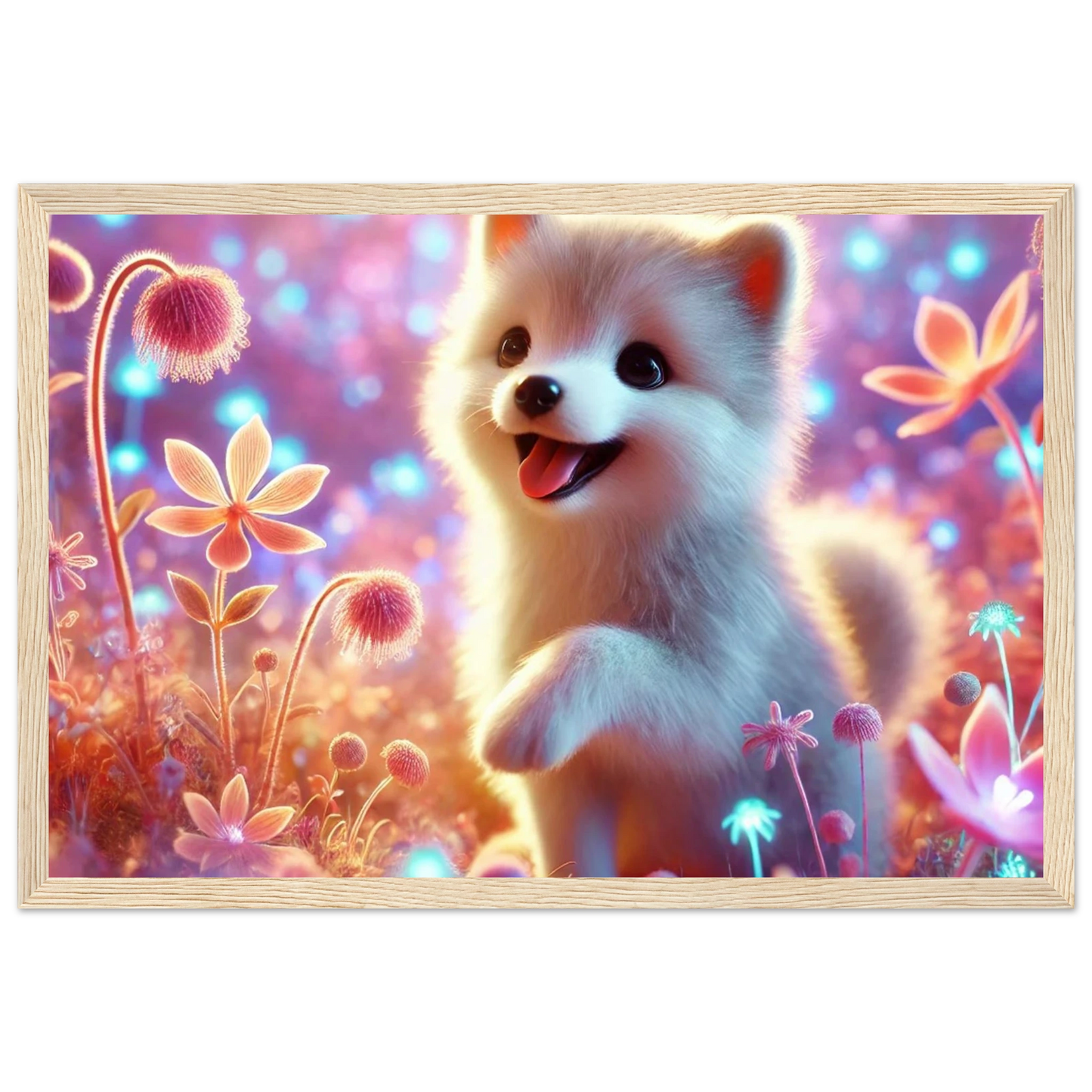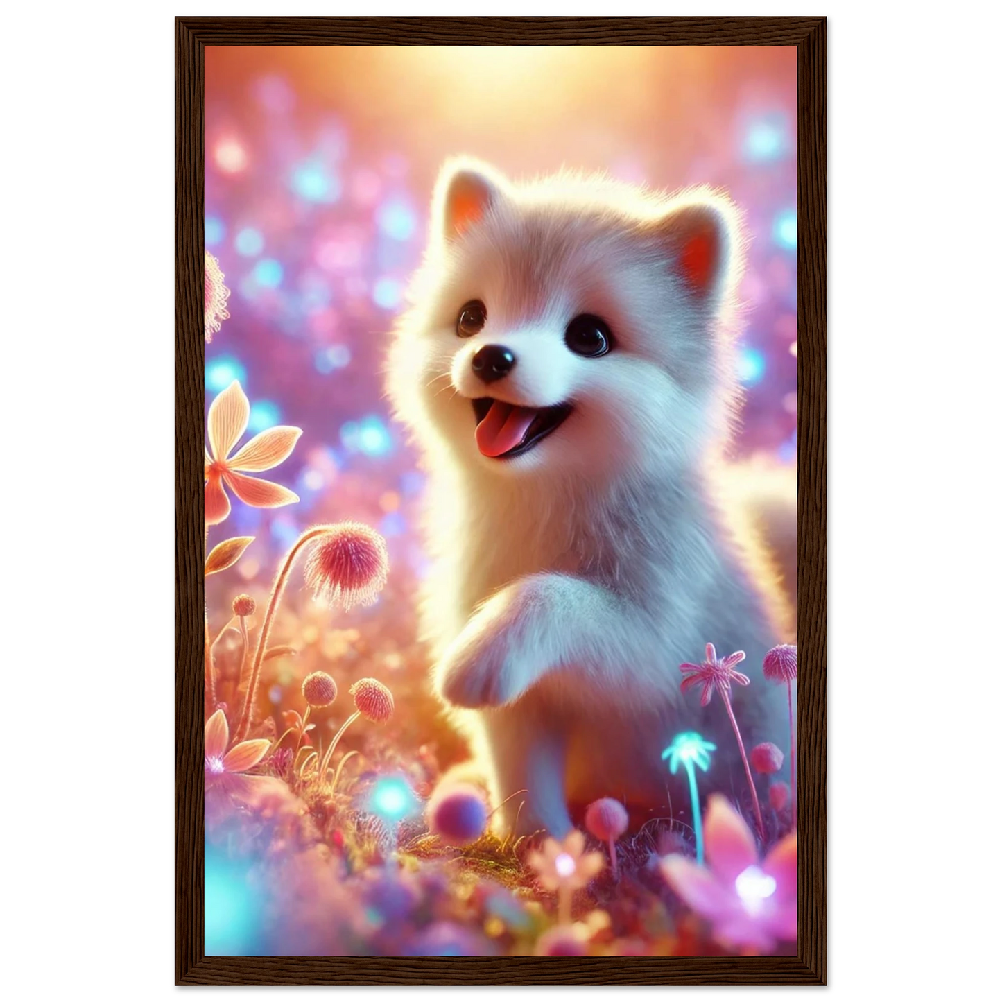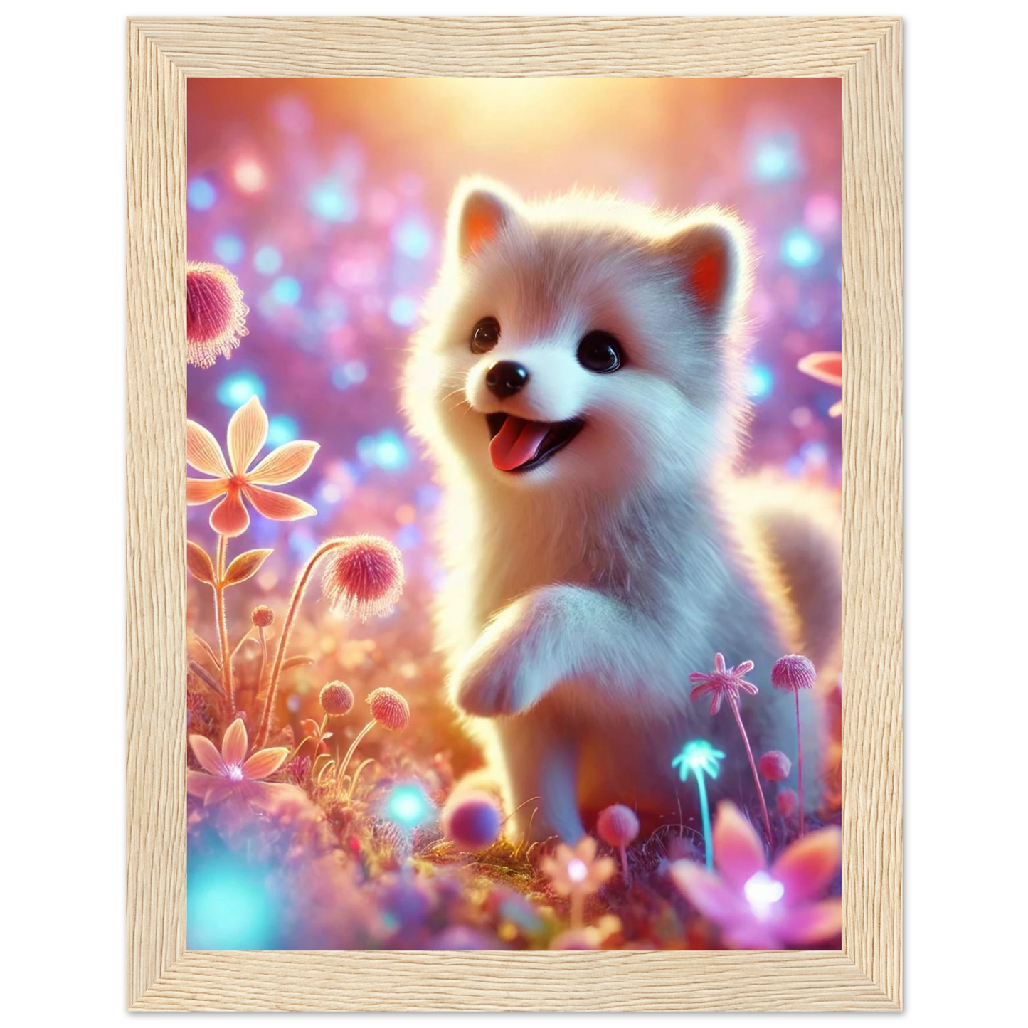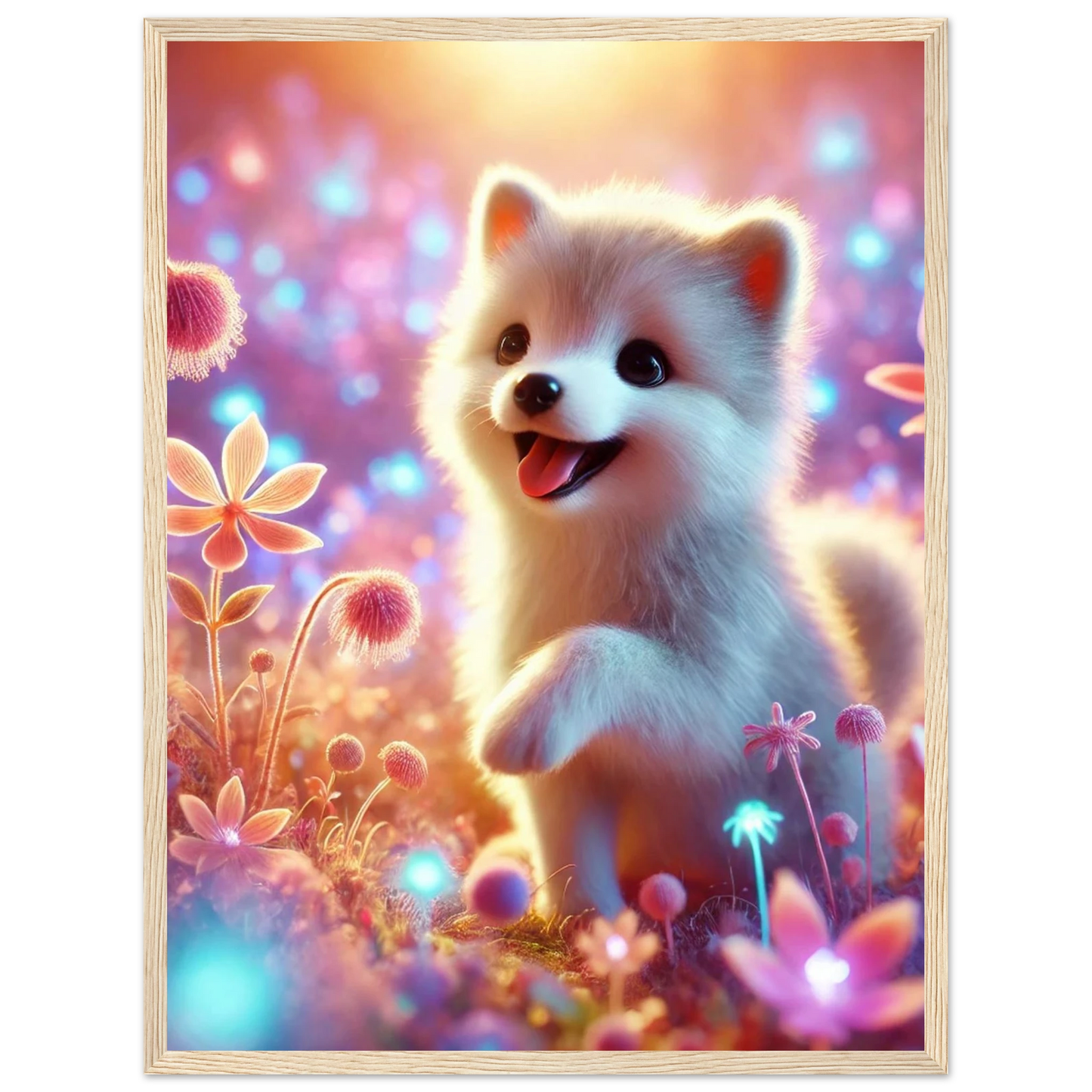Hol dir Licht, Wärme und pure Lebensfreude an deine Wände – mit diesem detailreichen, holzgerahmten Kunstdruck von Nuki, dem kleinen Wolfswelpen, der das Strahlen eines goldenen Morgens in sich trägt.