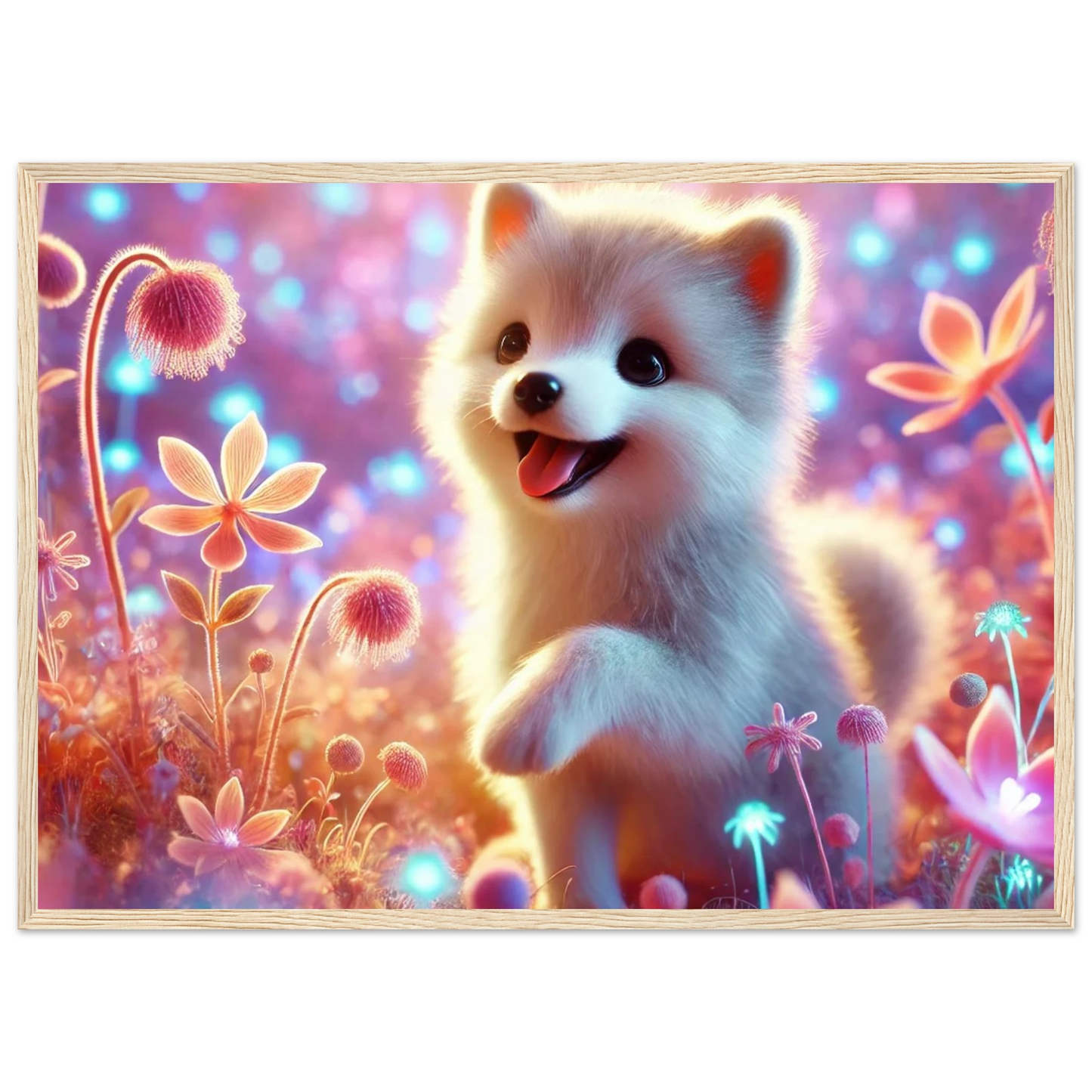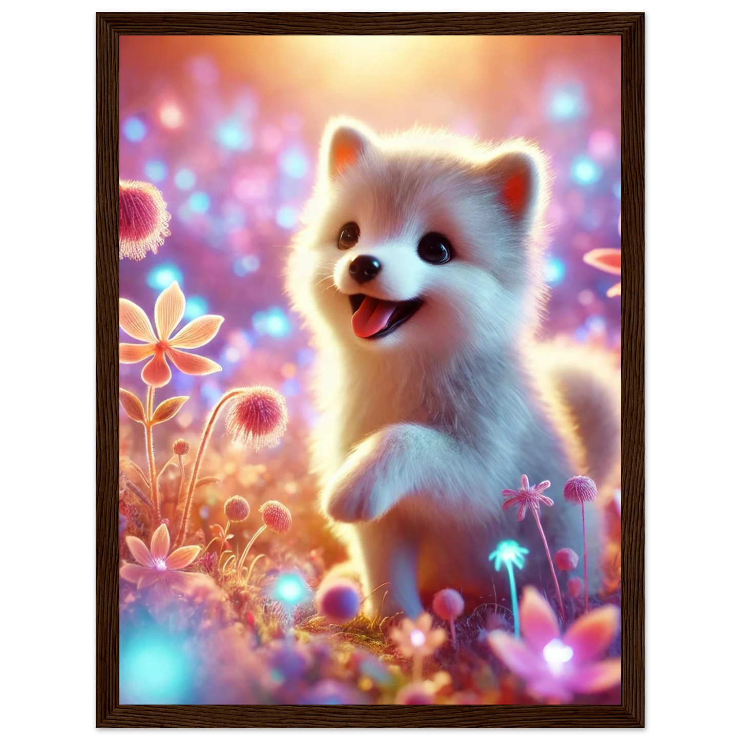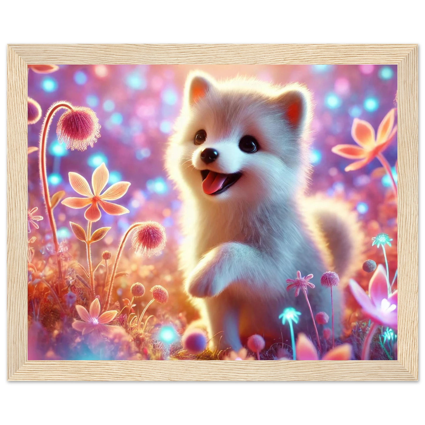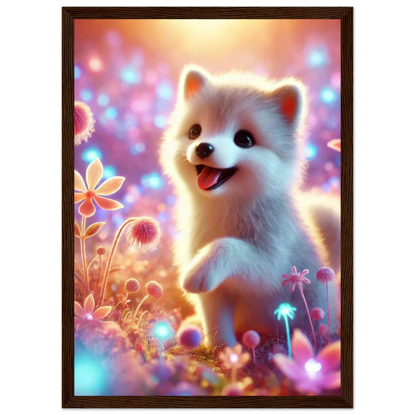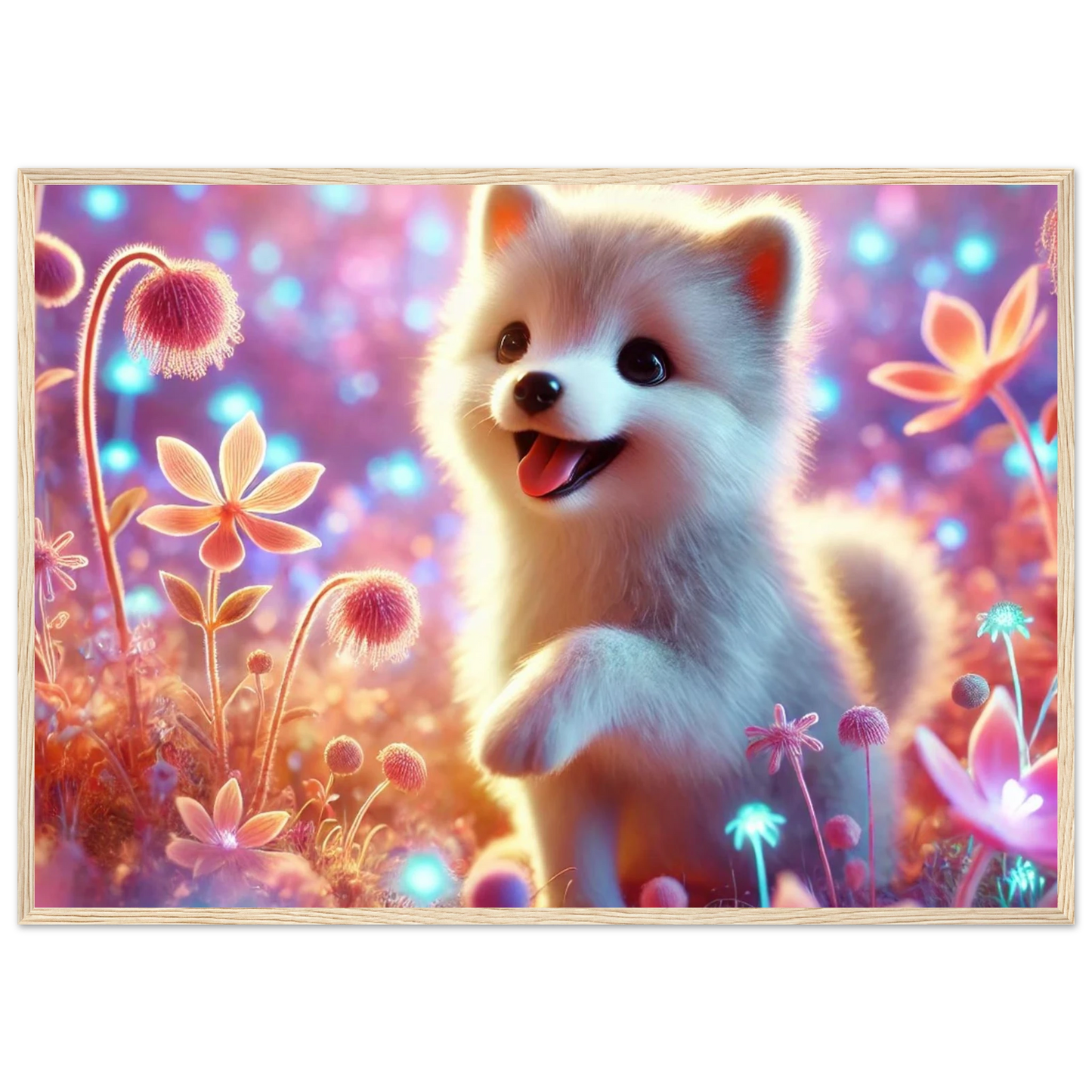 Hol dir Licht, Wärme und pure Lebensfreude an deine Wände – mit diesem detailreichen, holzgerahmten Kunstdruck von Nuki, dem kleinen Wolfswelpen, der das Strahlen eines goldenen Morgens in sich trägt.