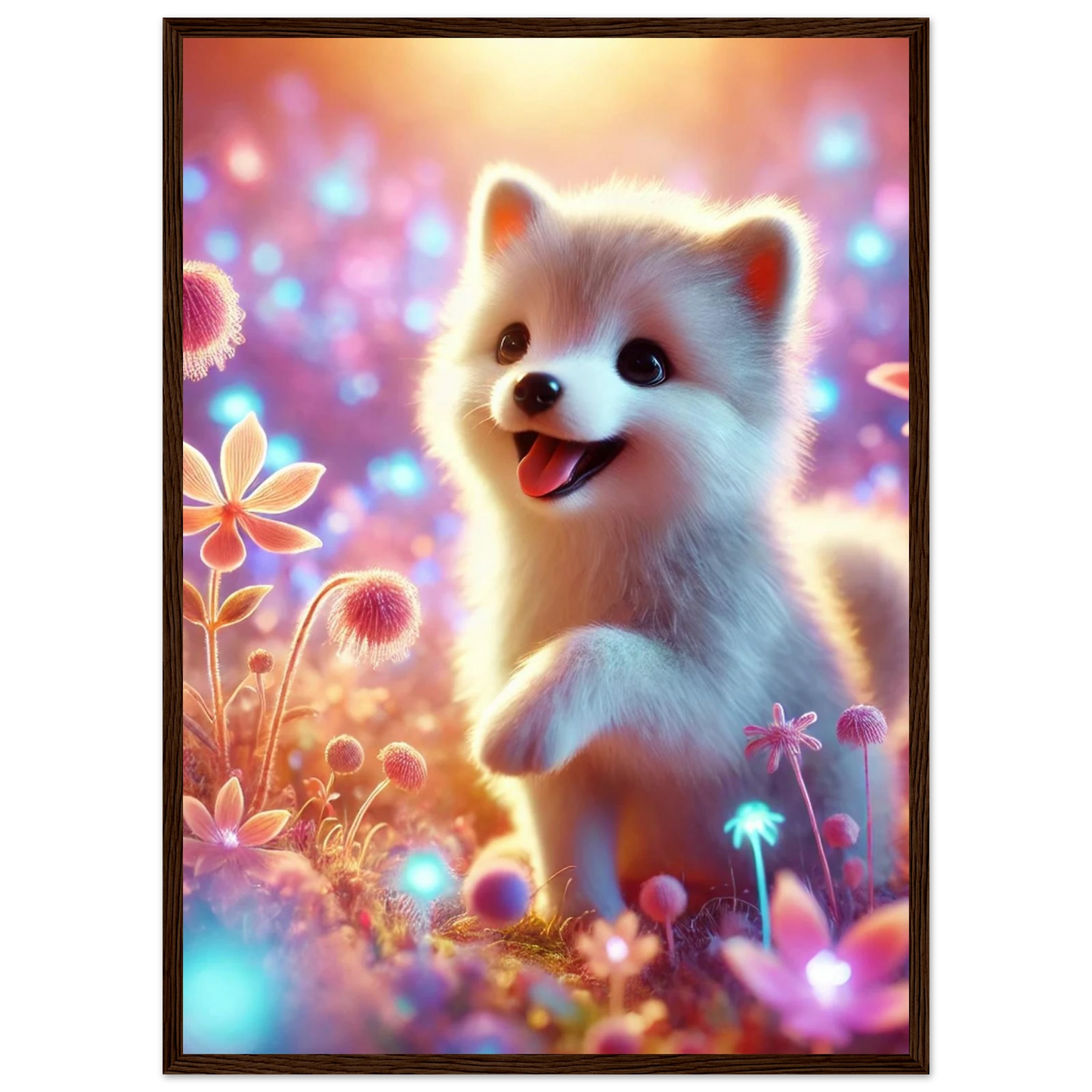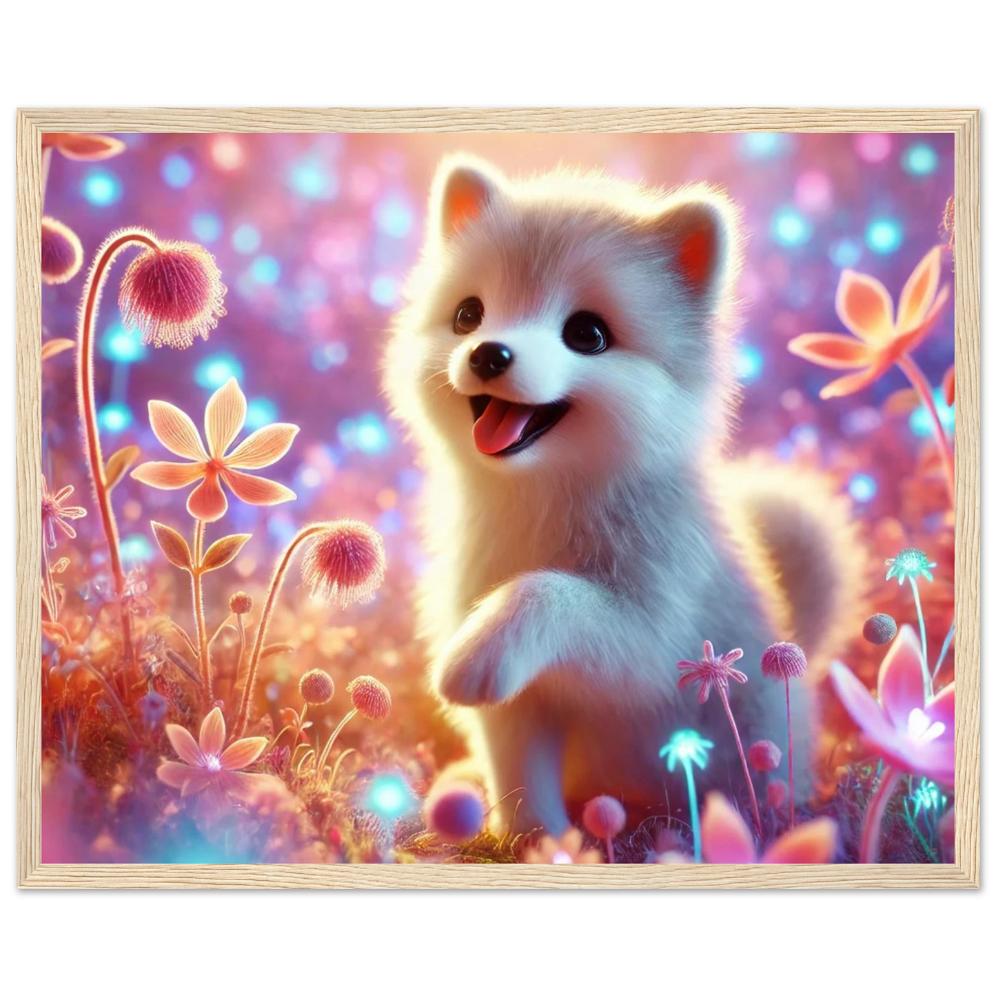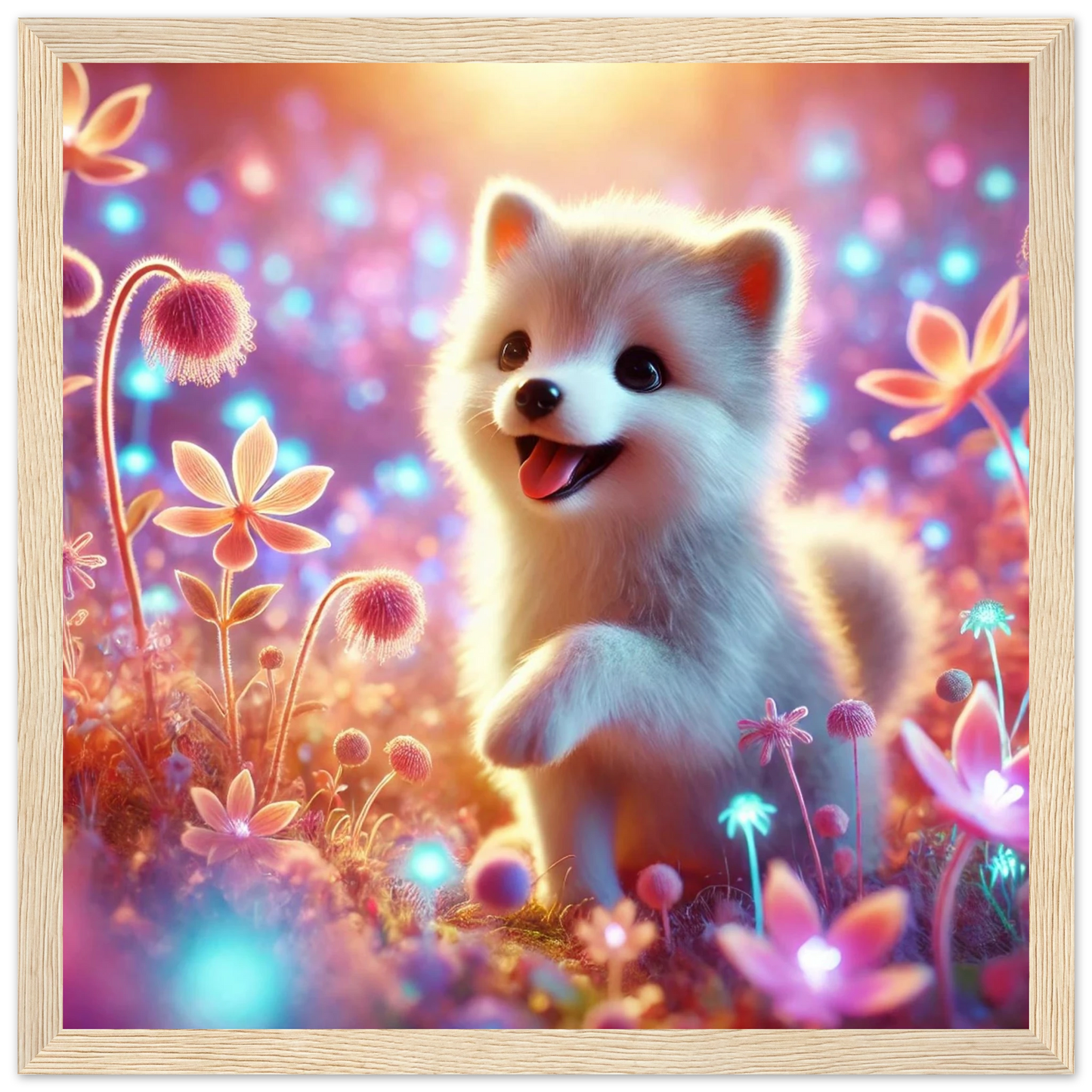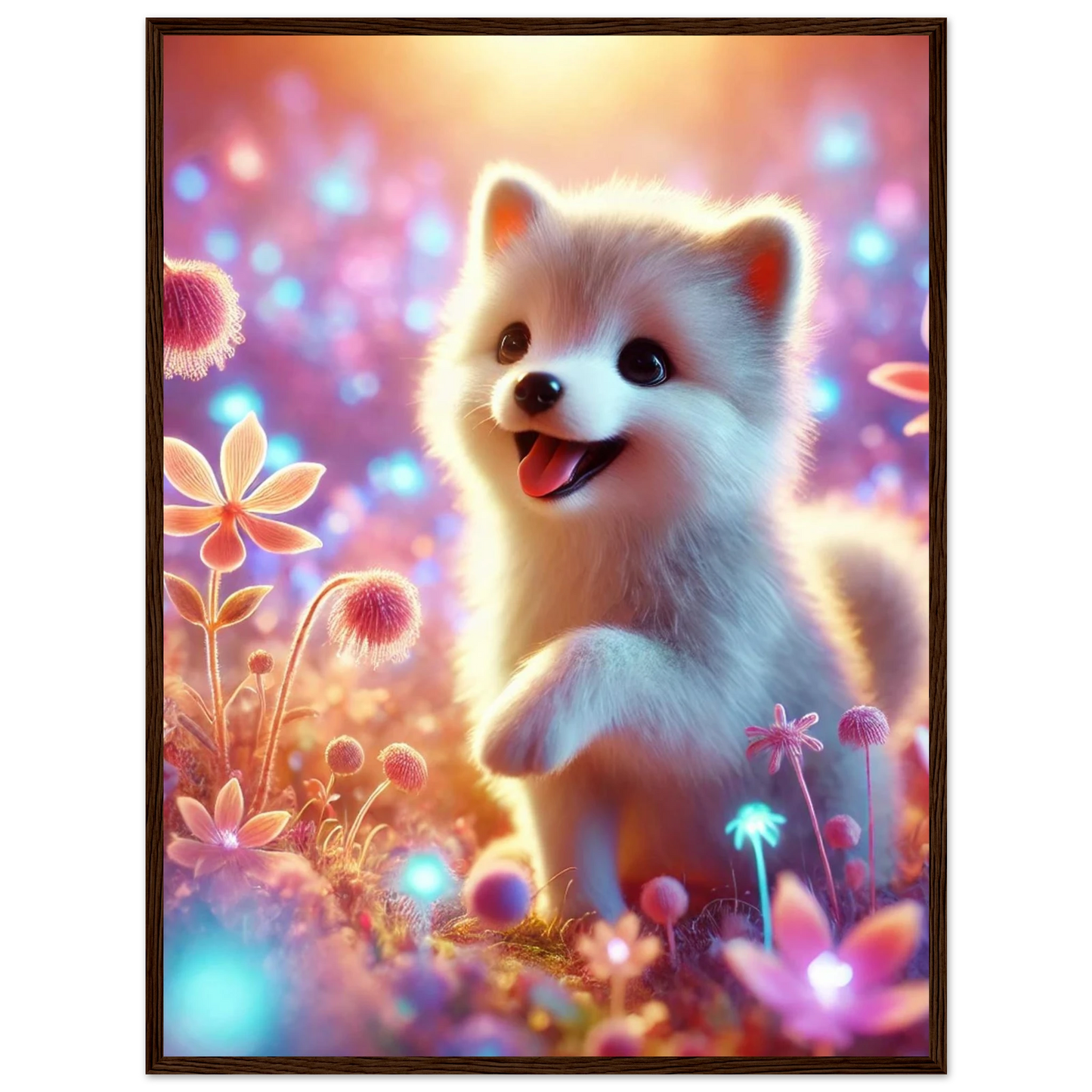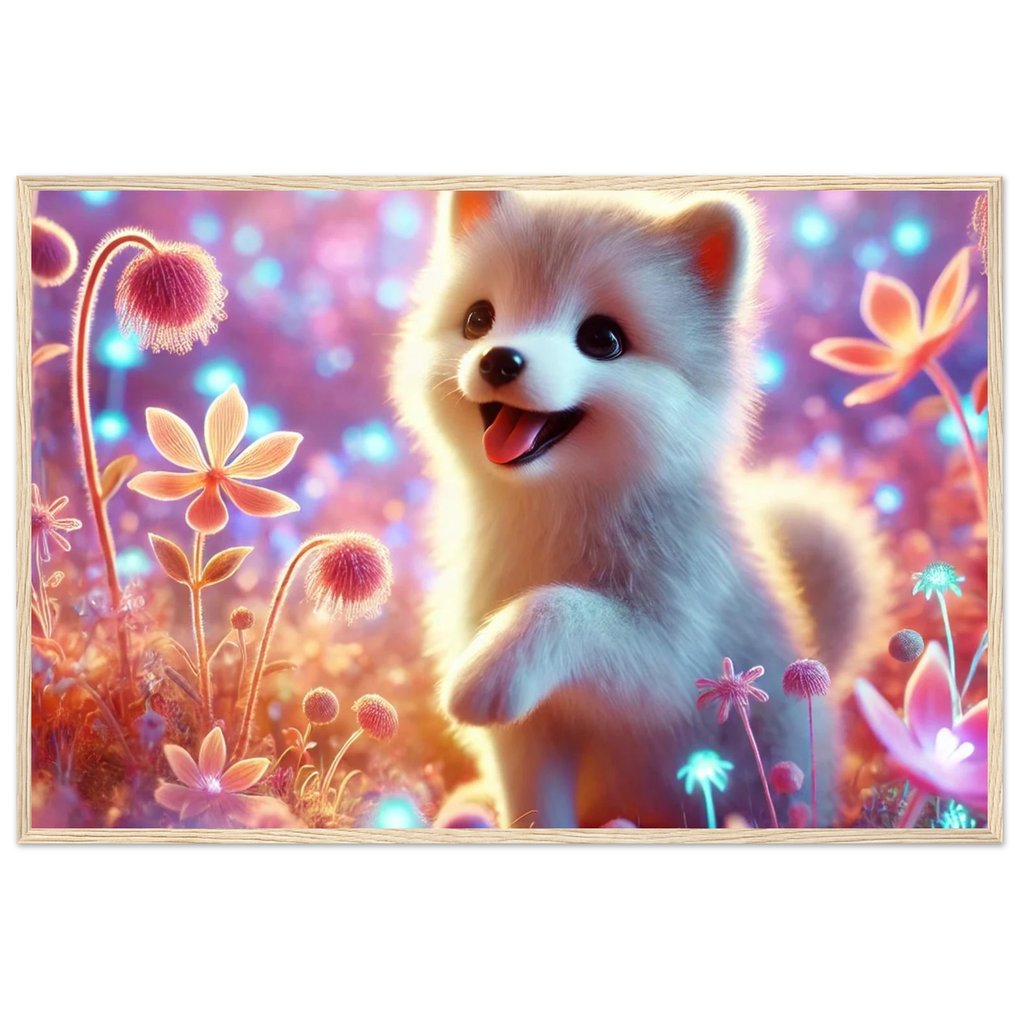 Hol dir Licht, Wärme und pure Lebensfreude an deine Wände – mit diesem detailreichen, holzgerahmten Kunstdruck von Nuki, dem kleinen Wolfswelpen, der das Strahlen eines goldenen Morgens in sich trägt.