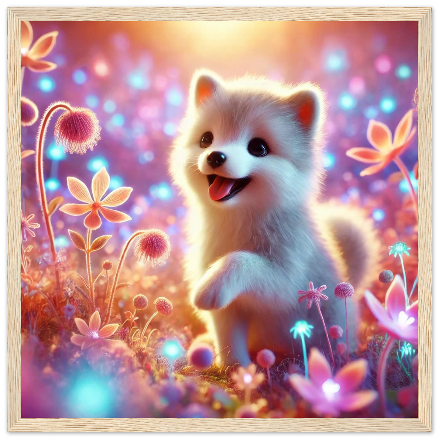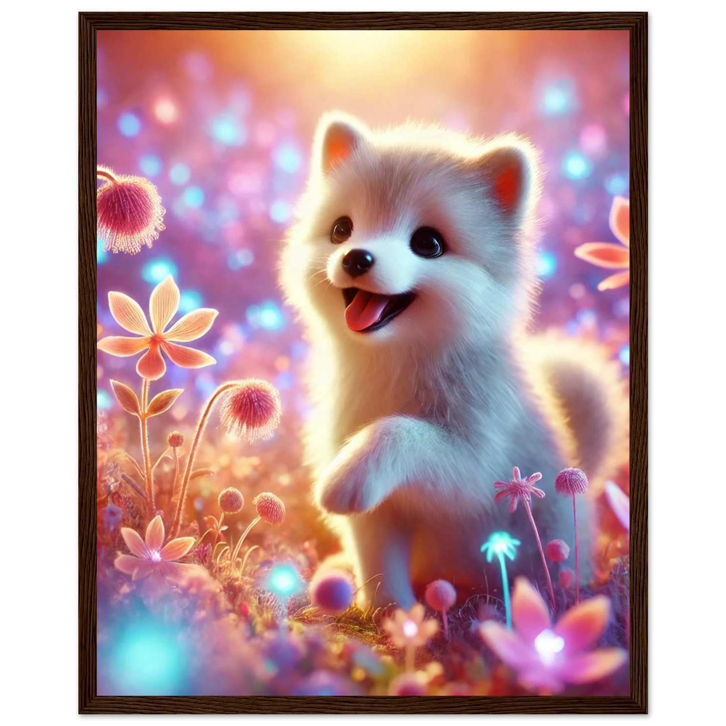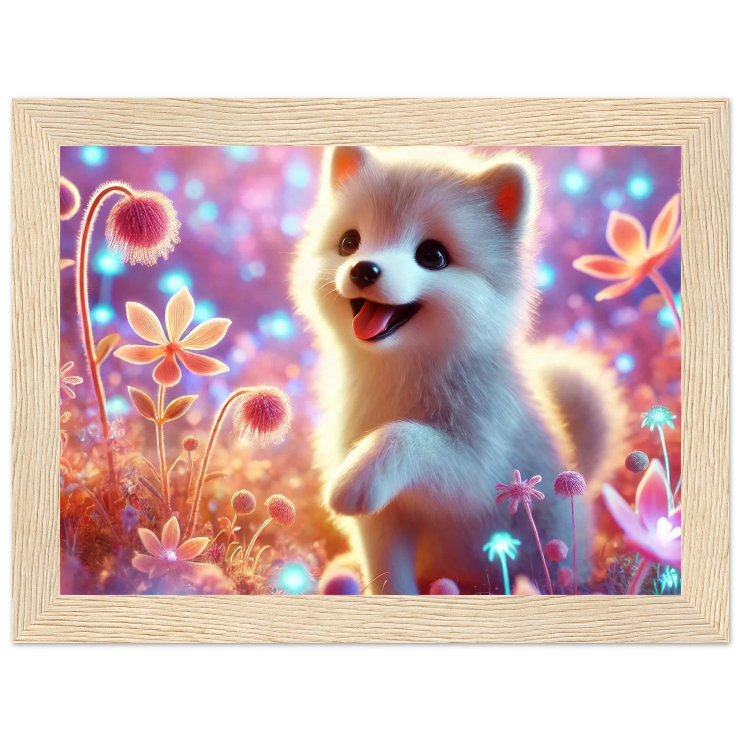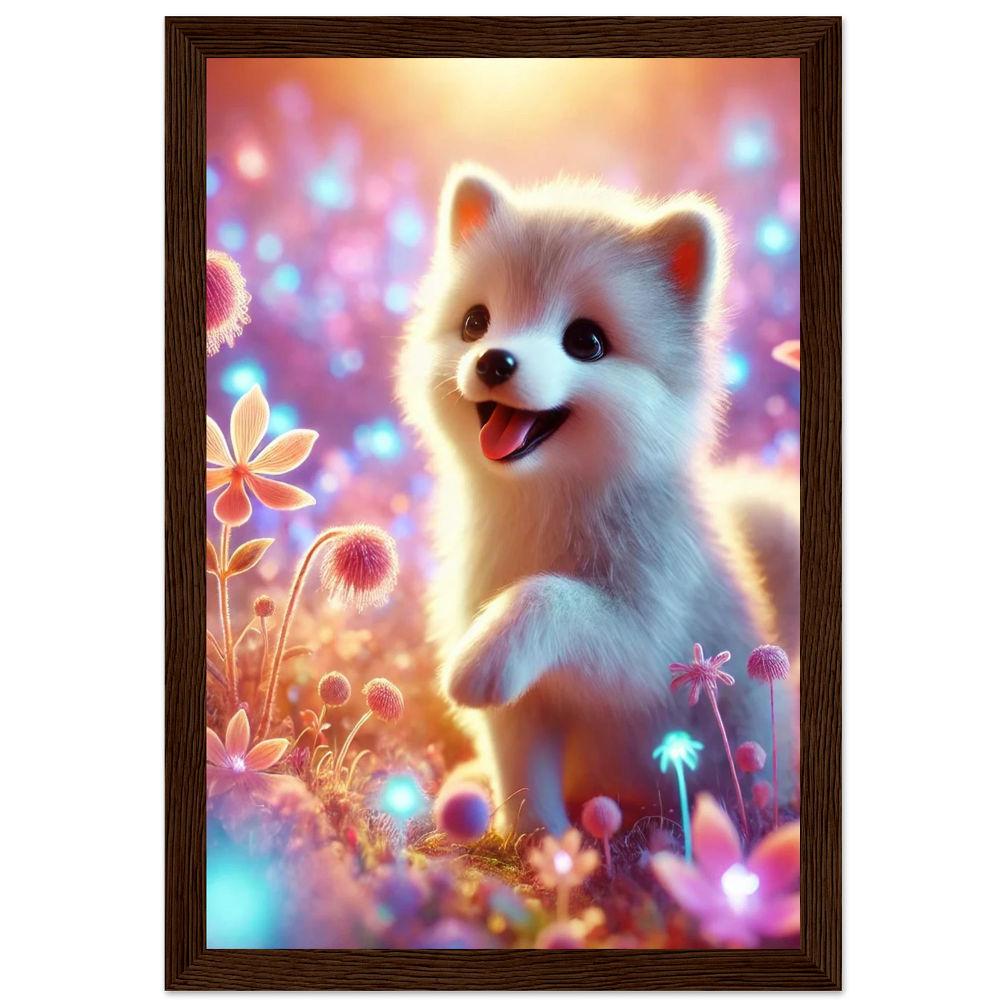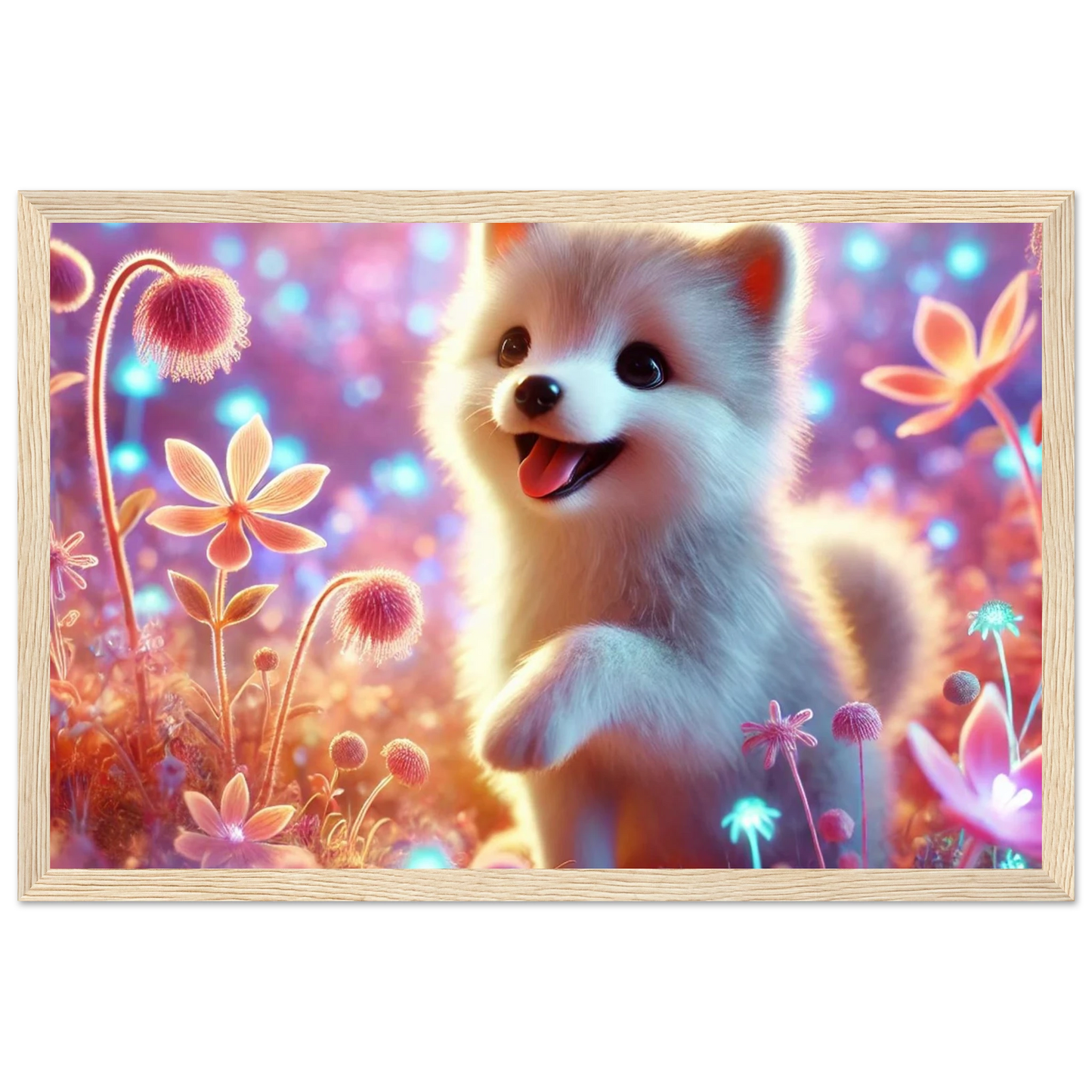 Hol dir Licht, Wärme und pure Lebensfreude an deine Wände – mit diesem detailreichen, holzgerahmten Kunstdruck von Nuki, dem kleinen Wolfswelpen, der das Strahlen eines goldenen Morgens in sich trägt.
