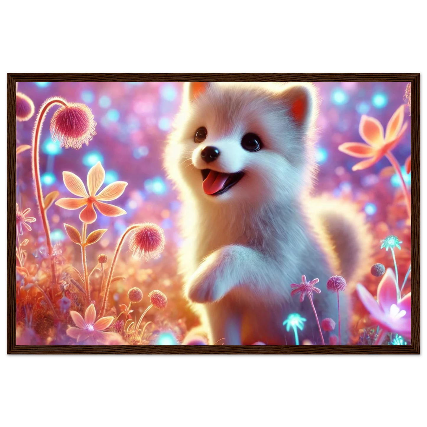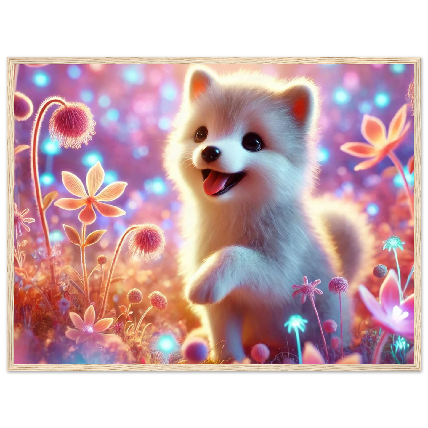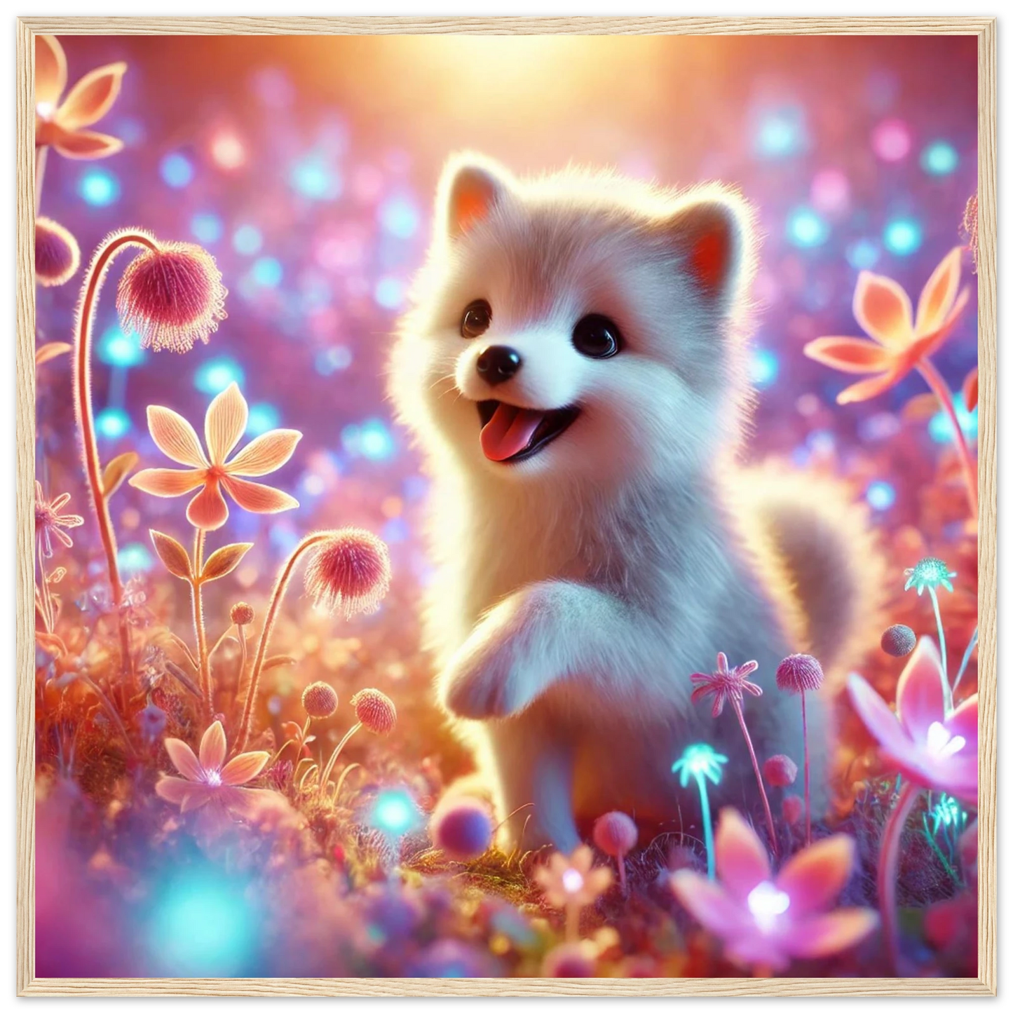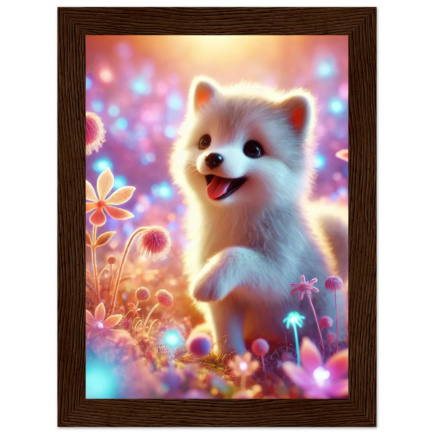 Hol dir Licht, Wärme und pure Lebensfreude an deine Wände – mit diesem detailreichen, holzgerahmten Kunstdruck von Nuki, dem kleinen Wolfswelpen, der das Strahlen eines goldenen Morgens in sich trägt.