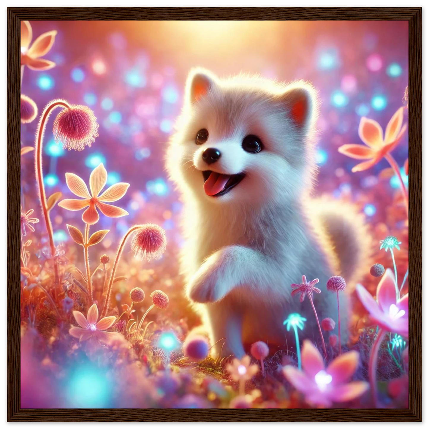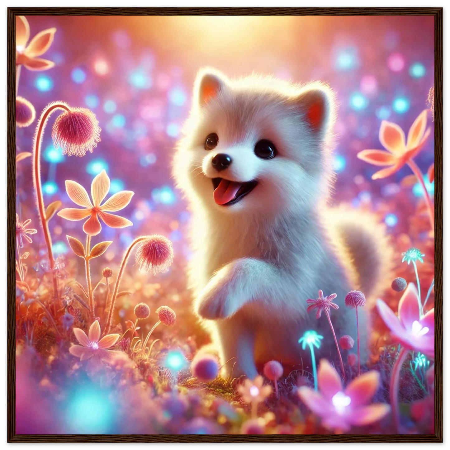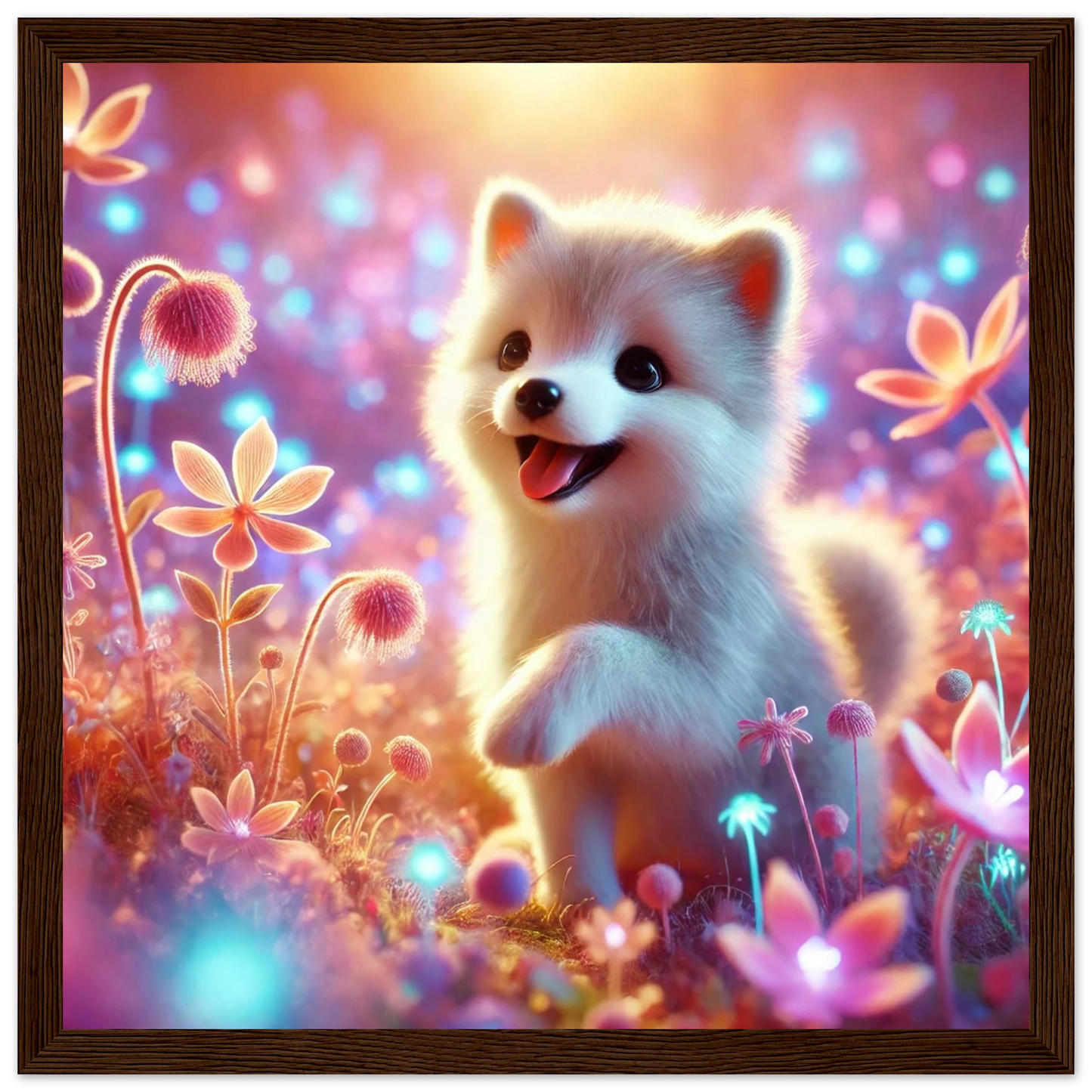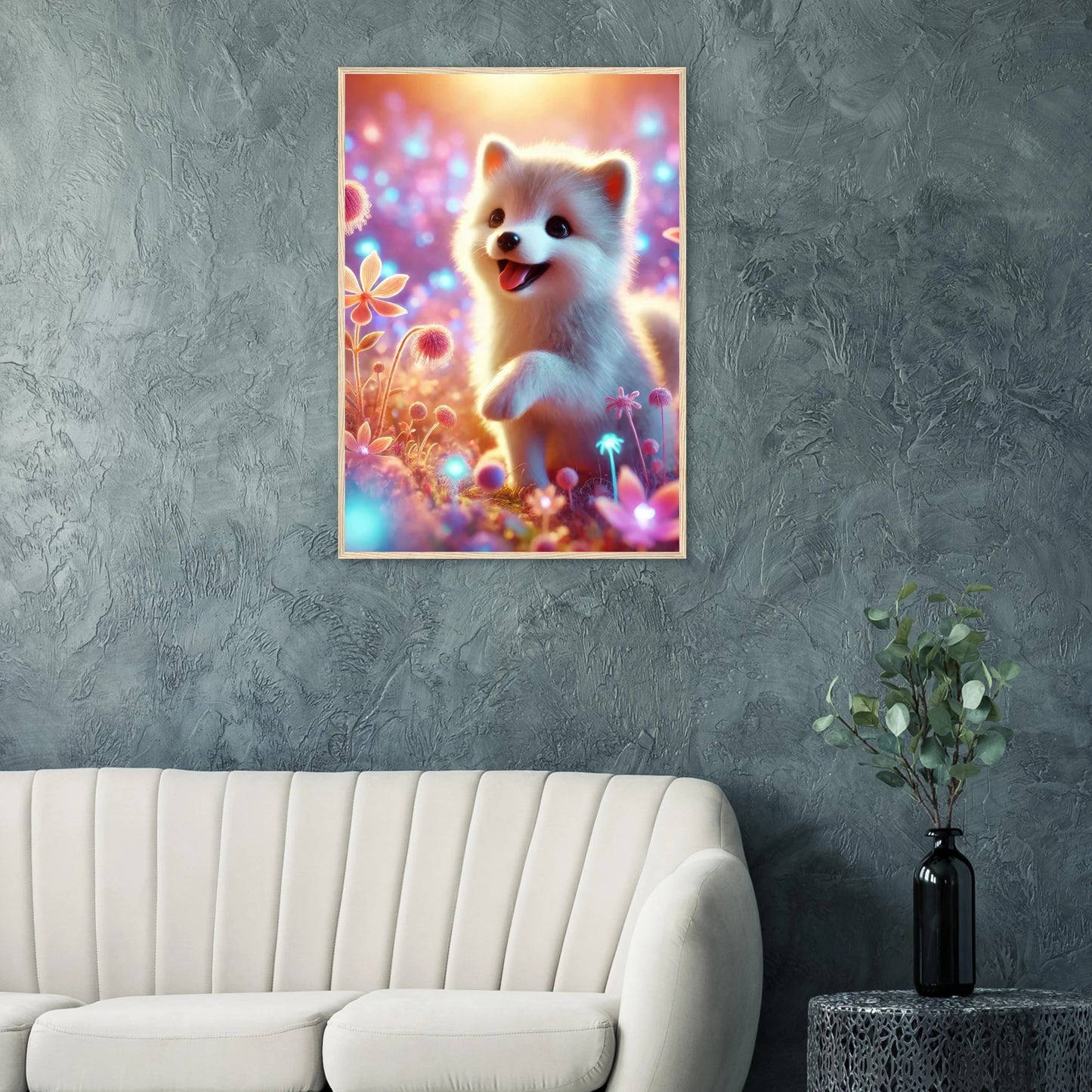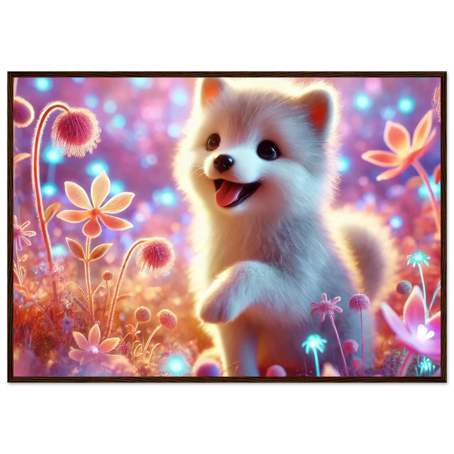 Hol dir Licht, Wärme und pure Lebensfreude an deine Wände – mit diesem detailreichen, holzgerahmten Kunstdruck von Nuki, dem kleinen Wolfswelpen, der das Strahlen eines goldenen Morgens in sich trägt.