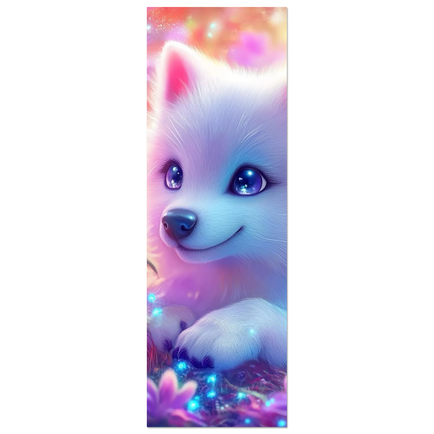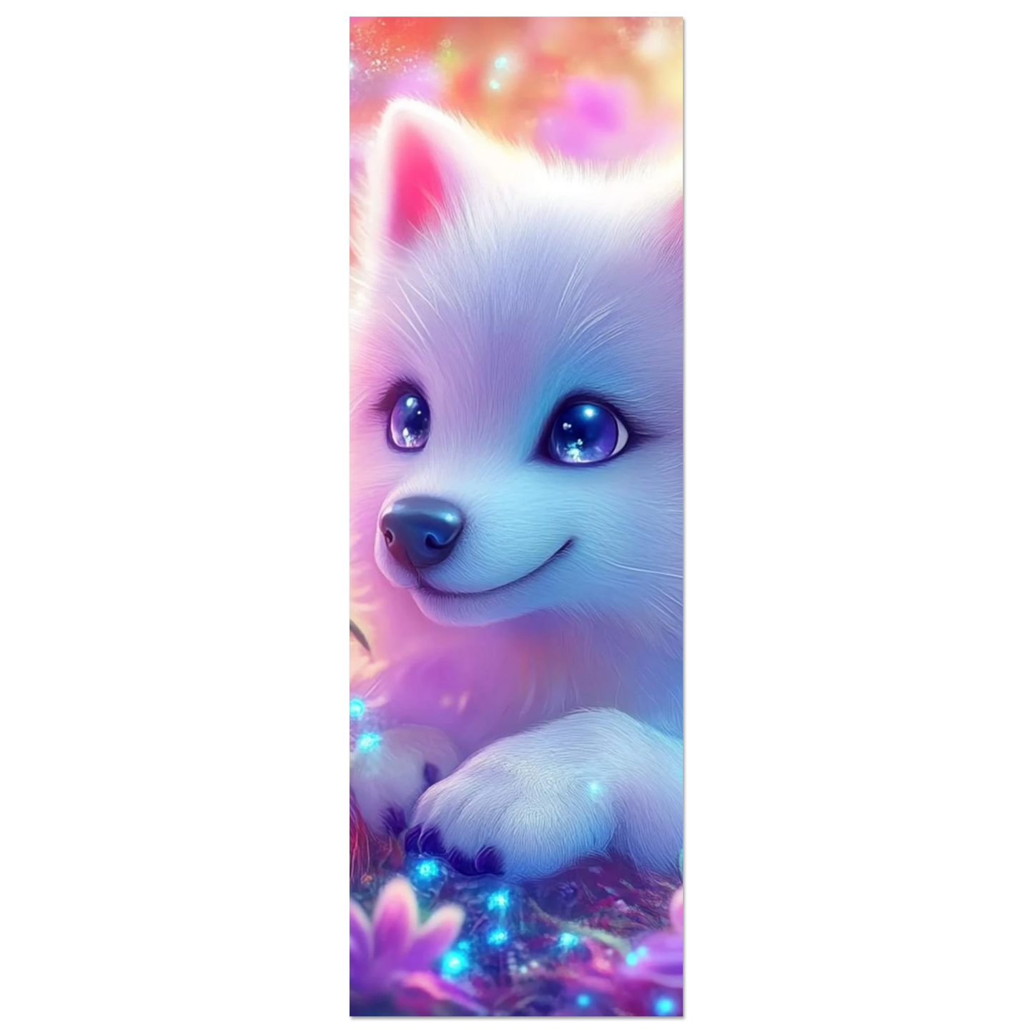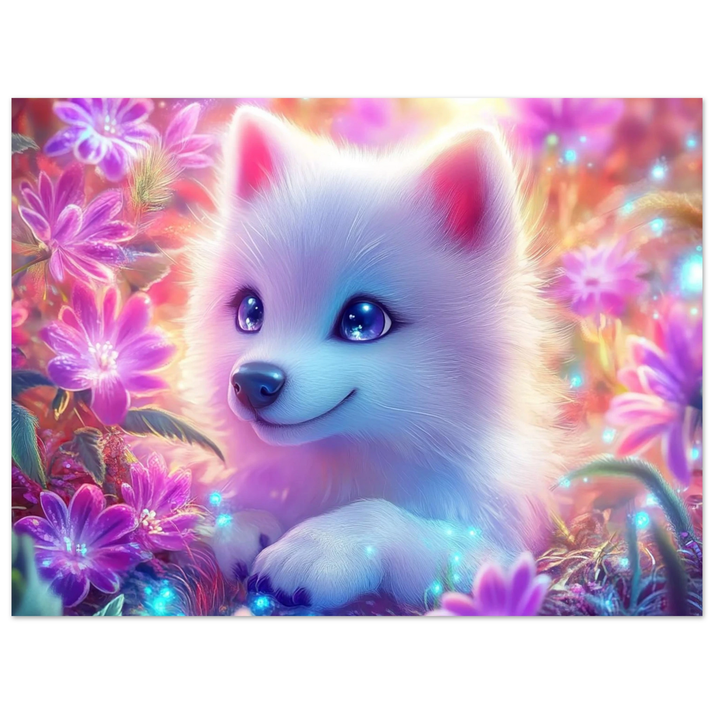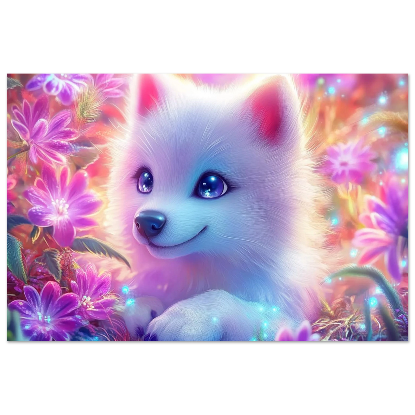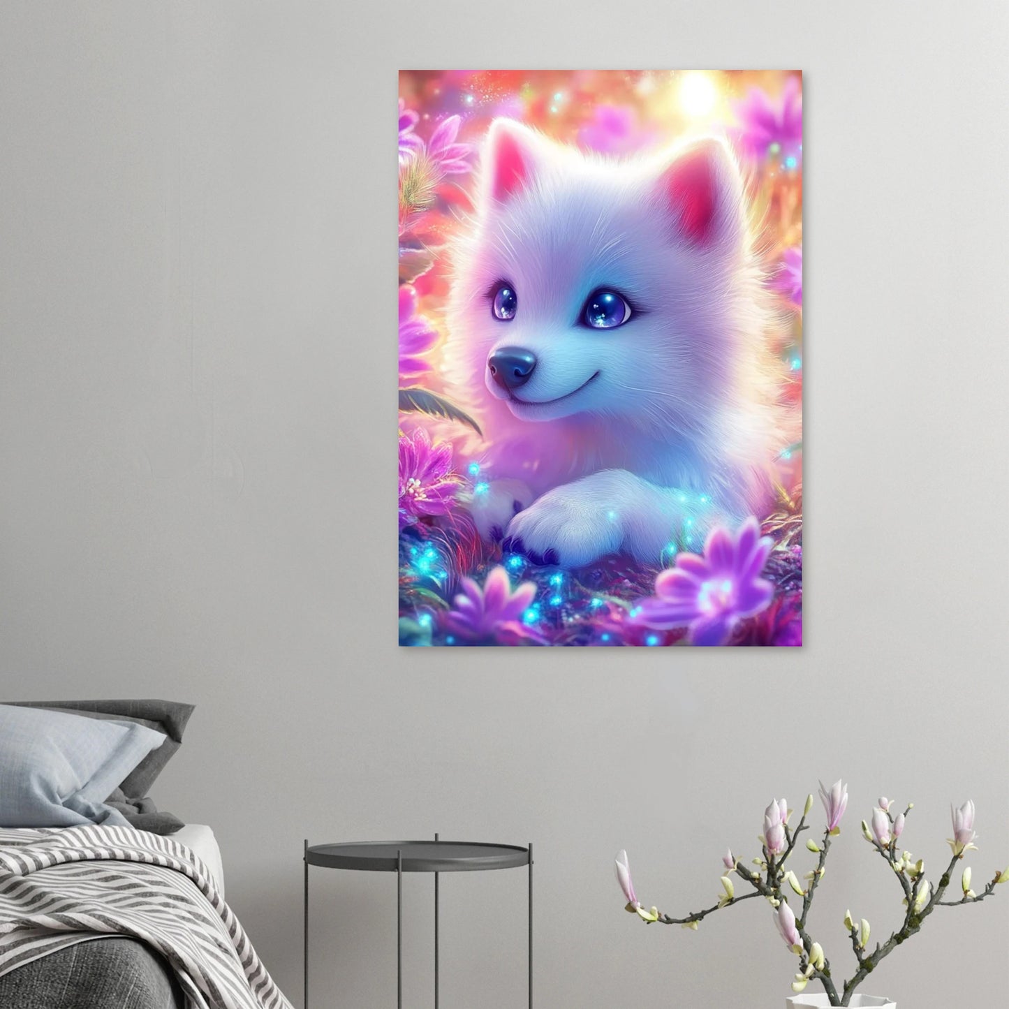 Tief im Herzen eines magischen Waldes, wo selbst in der Dämmerung Blumen leuchten, wurde Nuvia geboren – ein sanfter, schneeweißer Wolfswelpe mit Augen, die Neugier und Frieden ausstrahlen. Die Natur folgt ihrem stillen Zauber: Blüten öffnen sich, wenn sie vorbeizieht, und das Mondlicht scheint ihr stets treu zu sein.