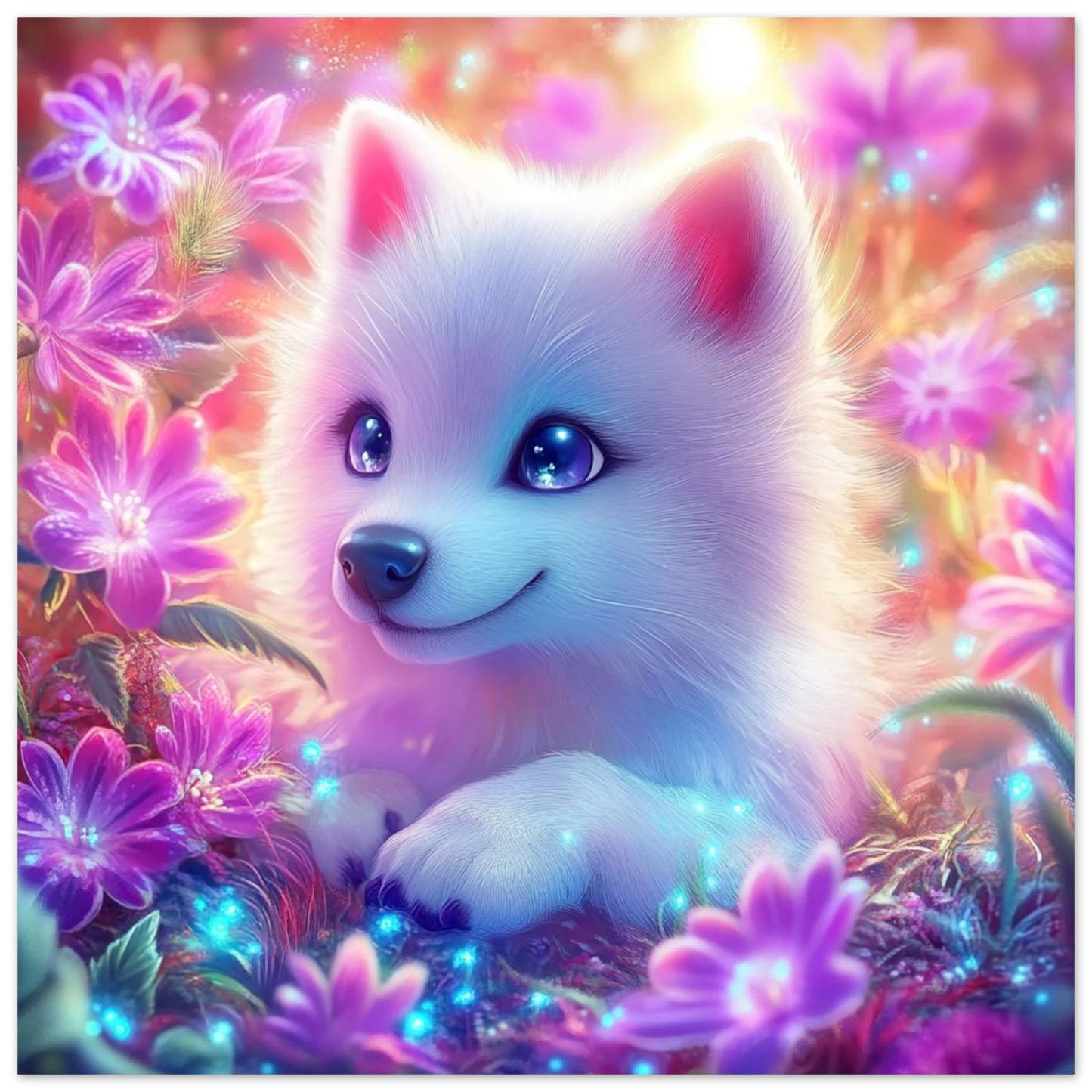 Nuvia ist ein strahlend weißer Wolfswelpe mit funkelnden Augen, eingebettet in ein Meer aus leuchtenden Blüten. Ihre Geschichte erzählt von einem verborgenen Wald, in dem sie als Hüterin des Friedens lebt – ein sanftes Wesen, das Hoffnung und Freude schenkt, wo Dunkelheit weilt.