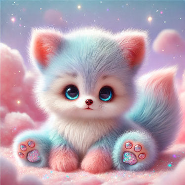 Nuvina ist ein kleiner magischer Wolf mit pastellfarbenem Fell, das aussieht, als sei es aus Zuckerwatte gesponnen. Mit ihren großen, glitzernden Augen und den funkelnden Tatzenpads ist sie der Inbegriff von Sanftmut und märchenhafter Schönheit.
