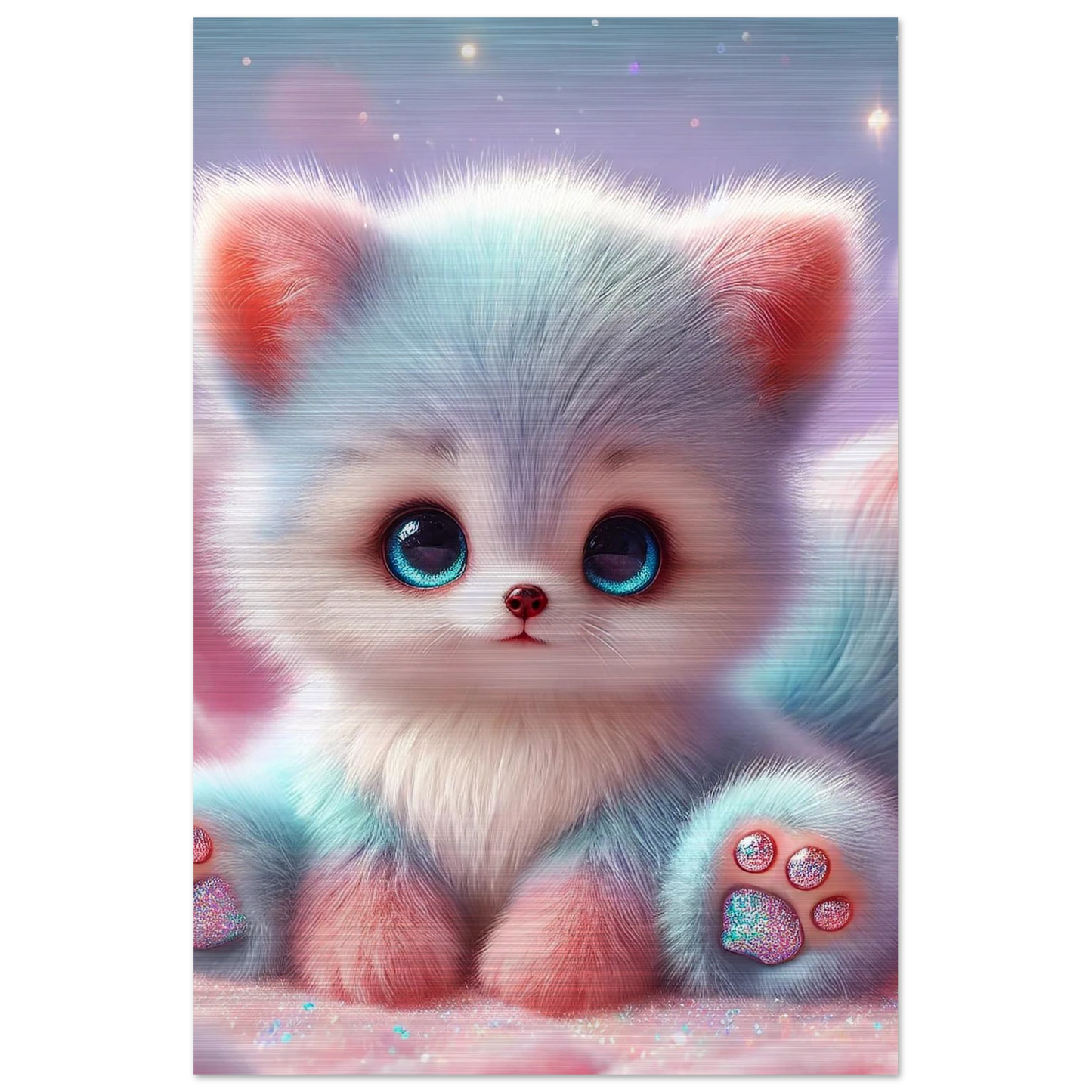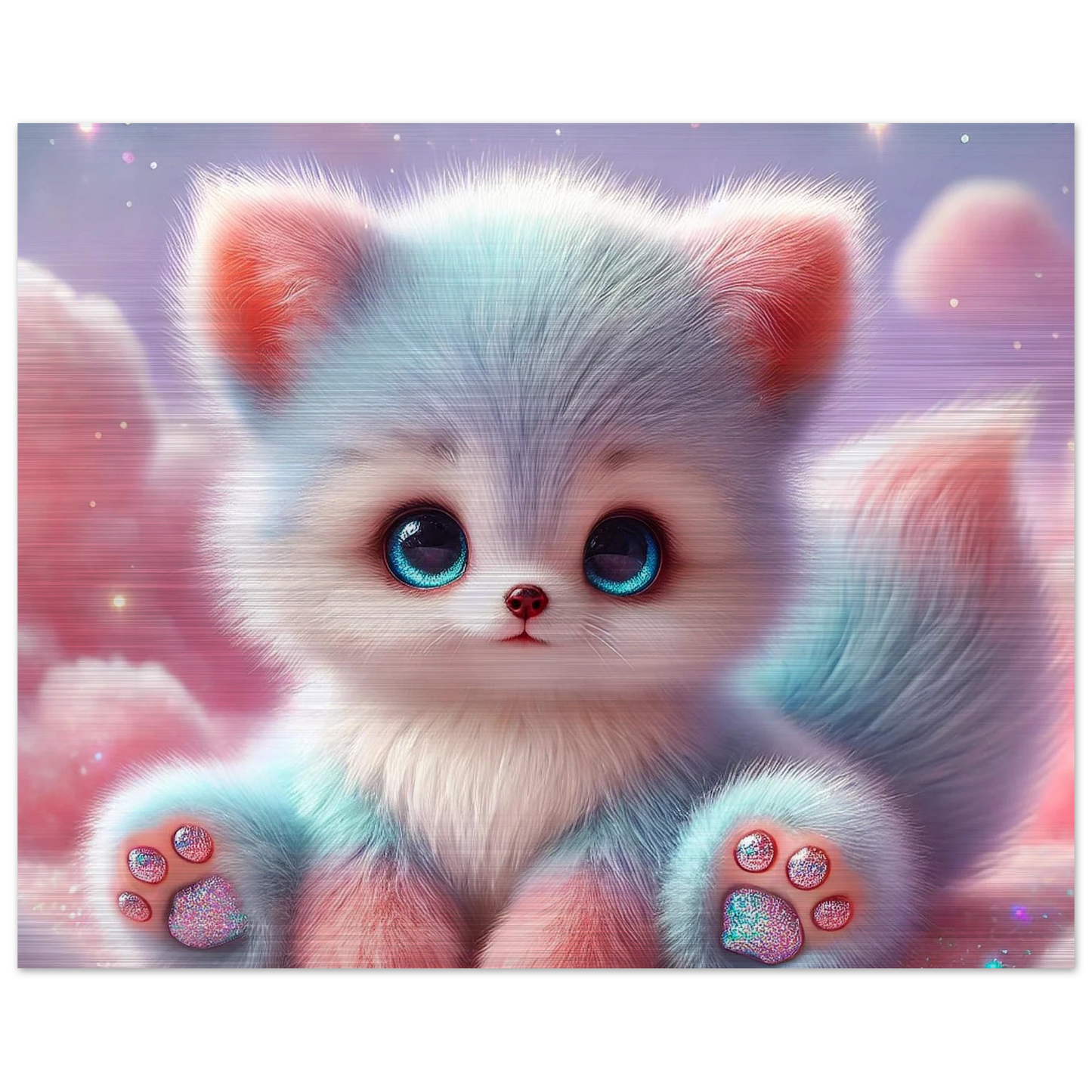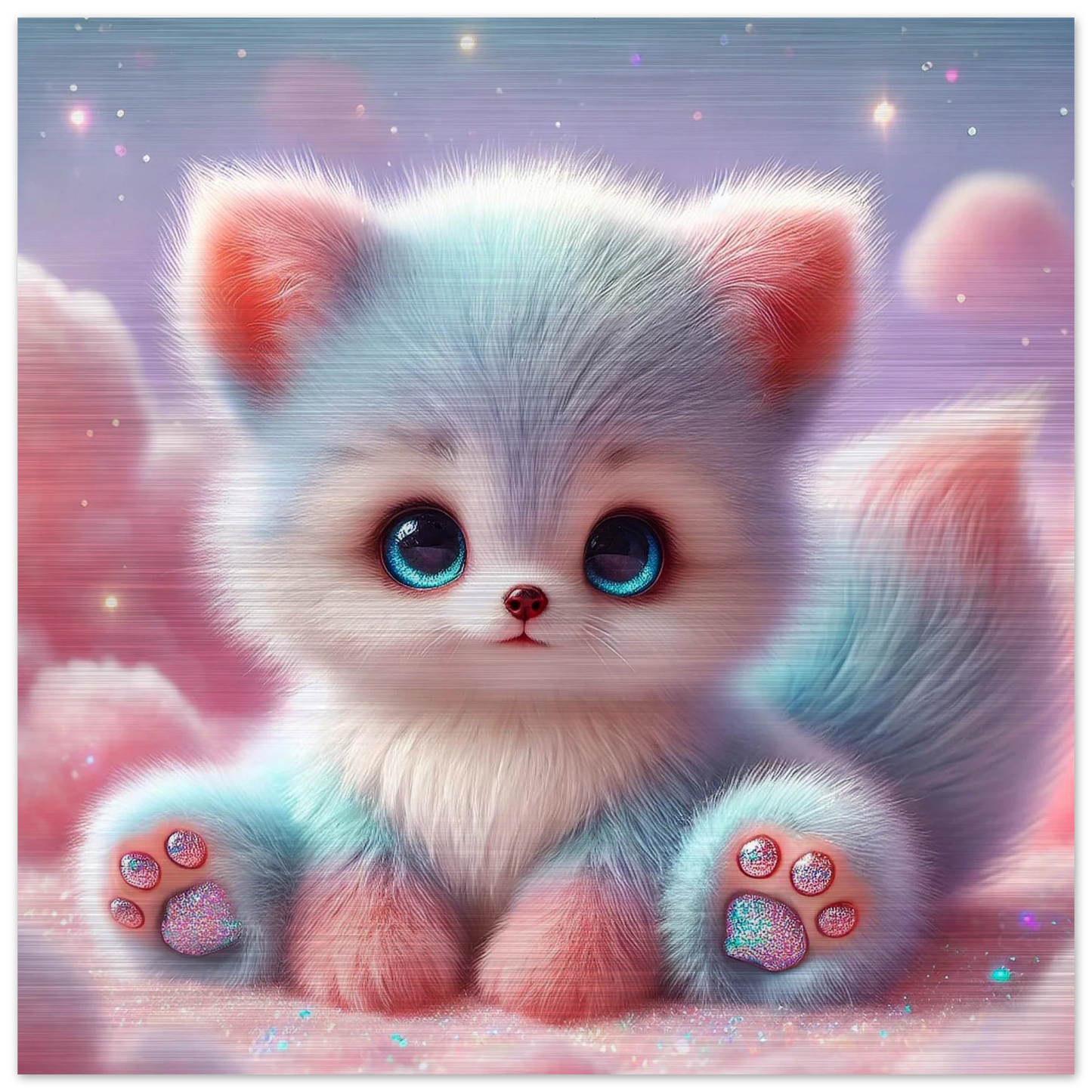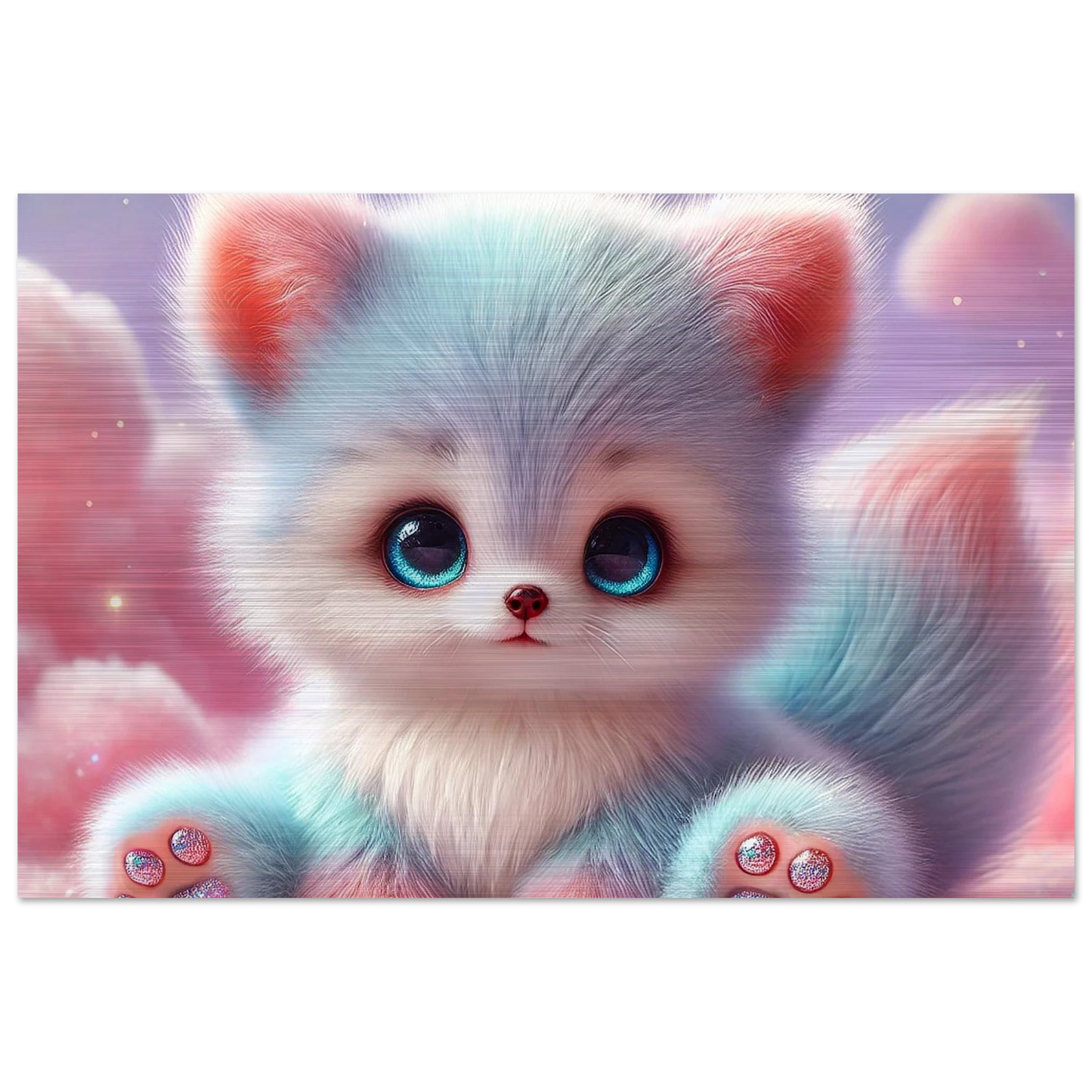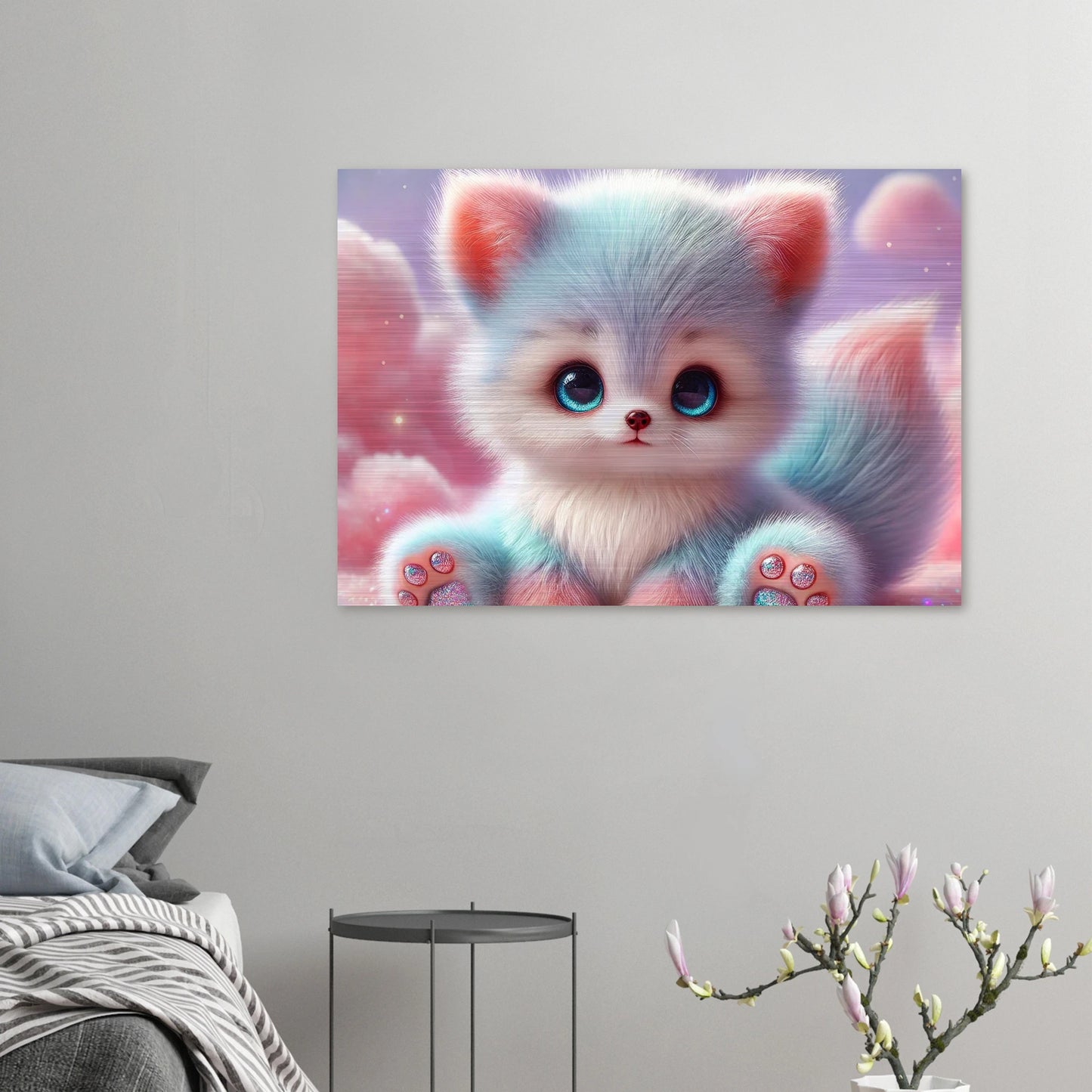 Erlebe Nuvinas märchenhafte Welt jetzt auf edlem, gebürstetem Aluminium – für eine Darstellung, die zugleich magisch, elegant und langlebig ist. Die kleine Wölfin mit ihrem pastellfarbenen Zuckerwatte-Fell und den funkelnden Augen stammt aus einer Welt aus rosa Wolken und sternenklaren Sonnenaufgängen.
