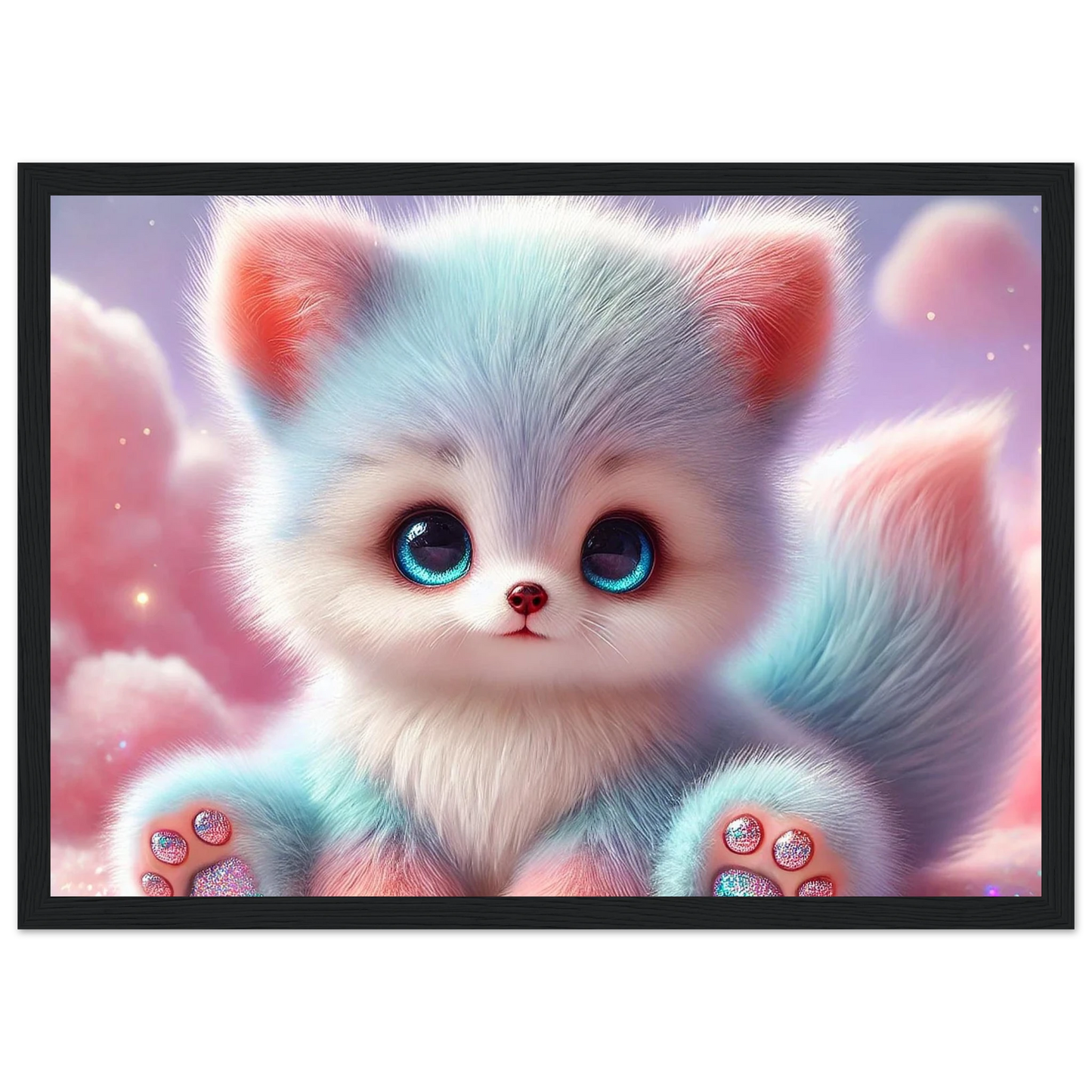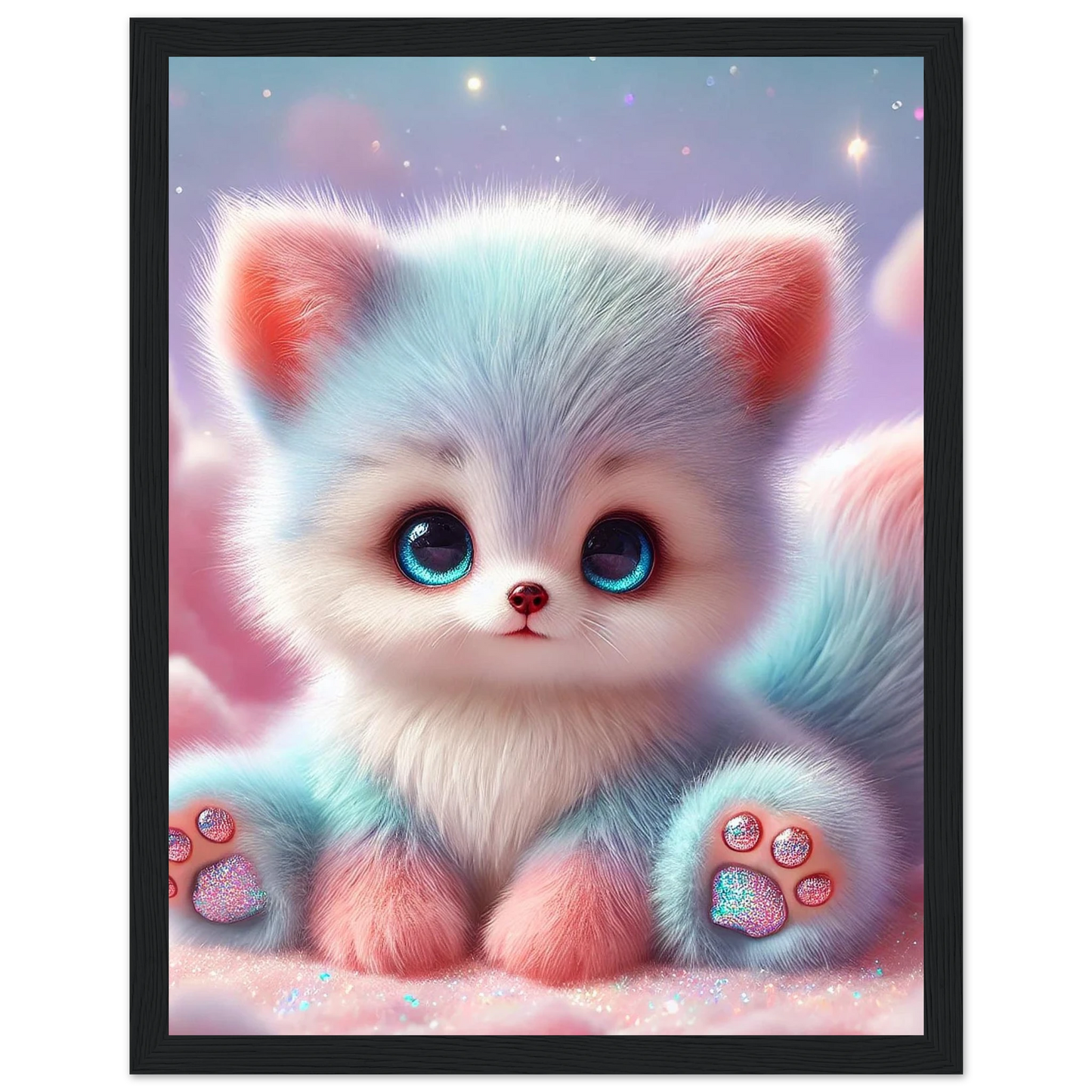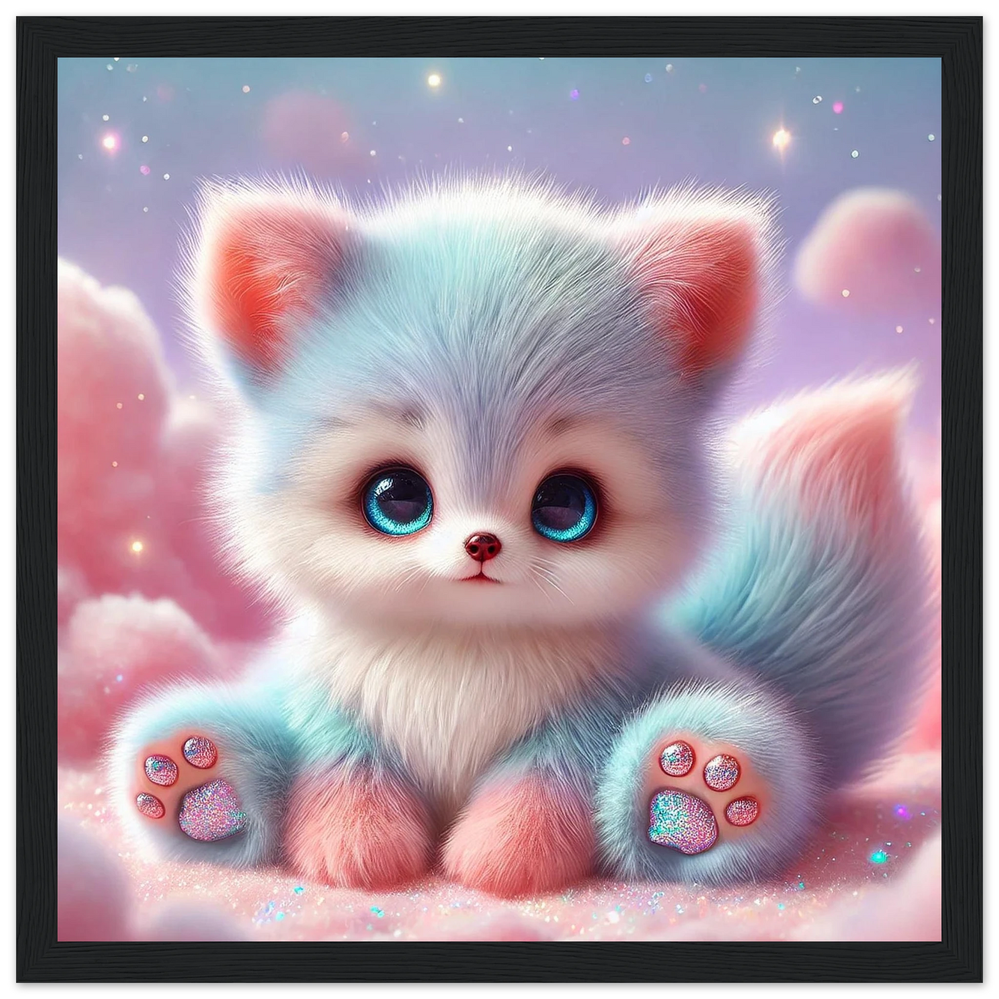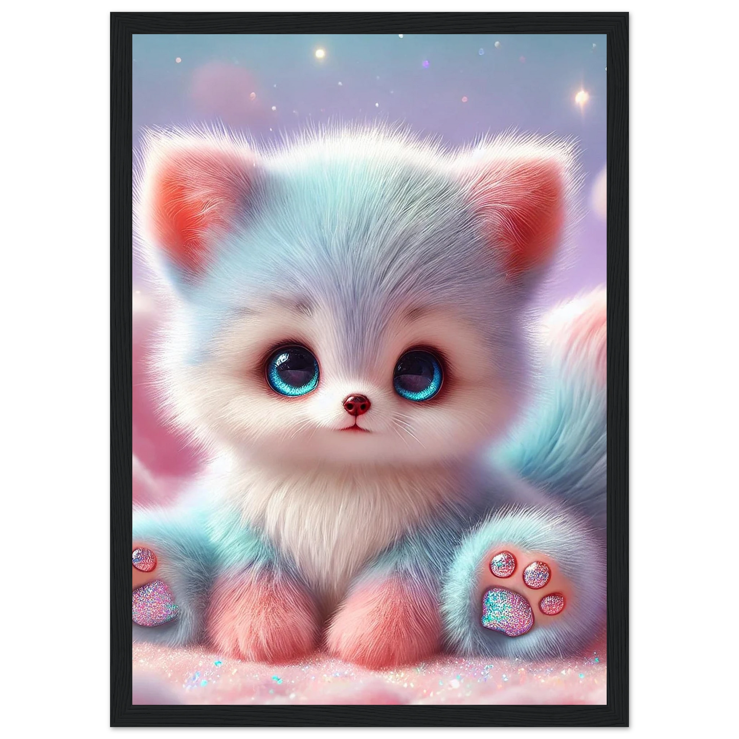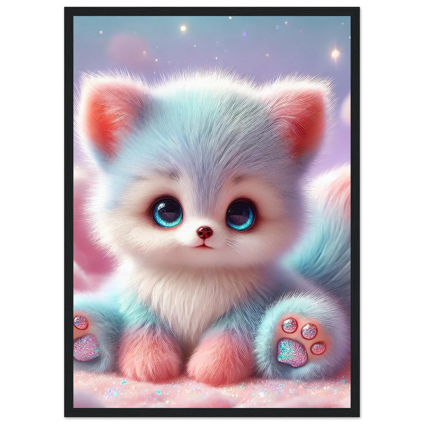 Bringe mit unseren holzgerahmten Kunstdrucken die märchenhafte Magie von Nuvina in dein Zuhause – einem kleinen, magischen Wolf mit pastellfarbenem Fell, das wie zarte Zuckerwatte schimmert. Mit glitzernden Augen und funkelnden Tatzenpads ist sie ein Sinnbild von Sanftmut und träumerischer Schönheit.