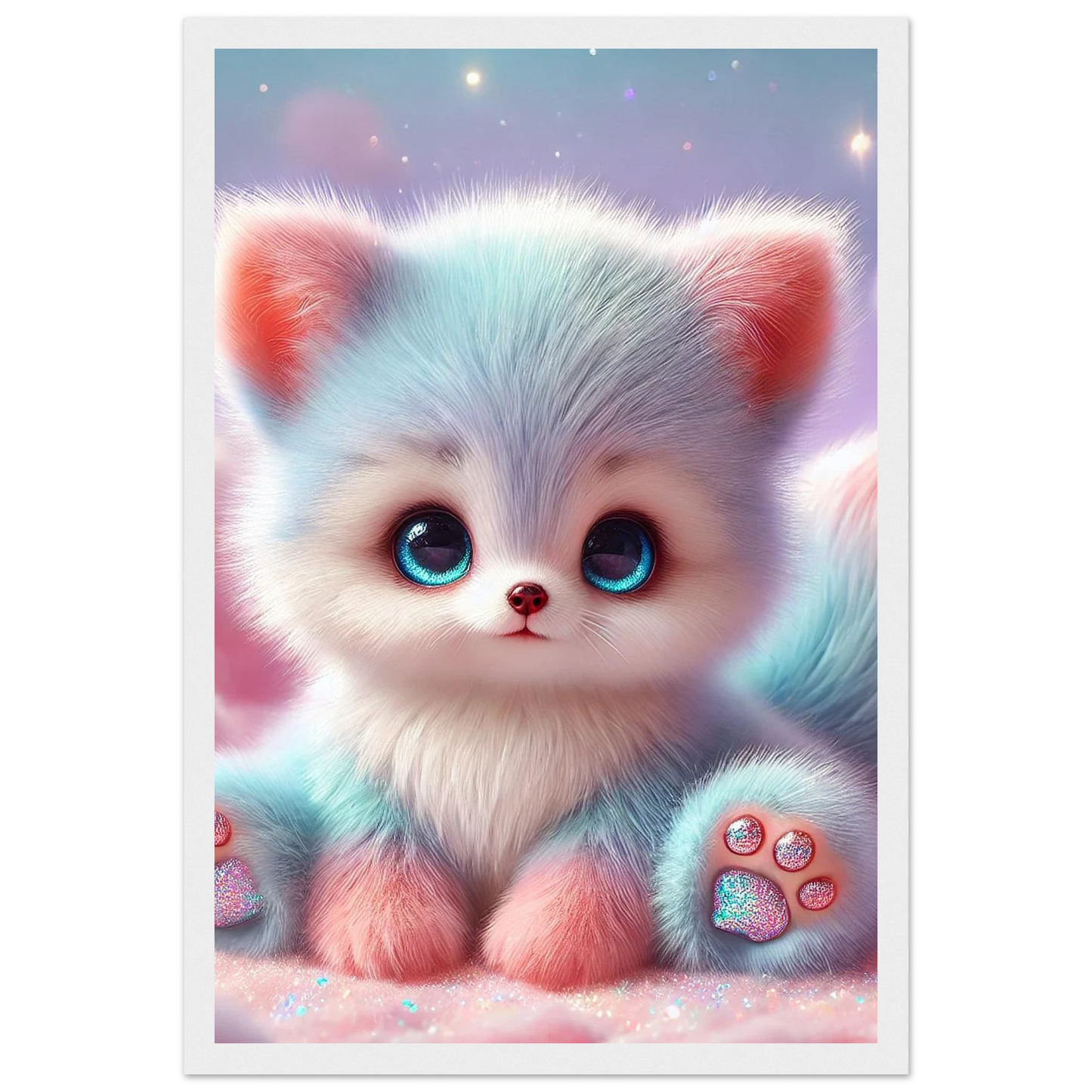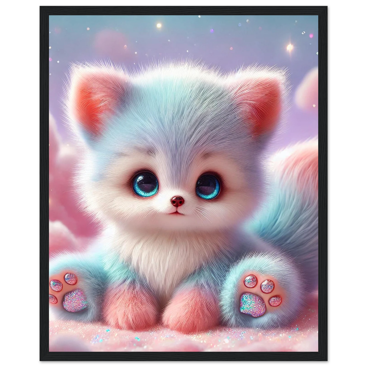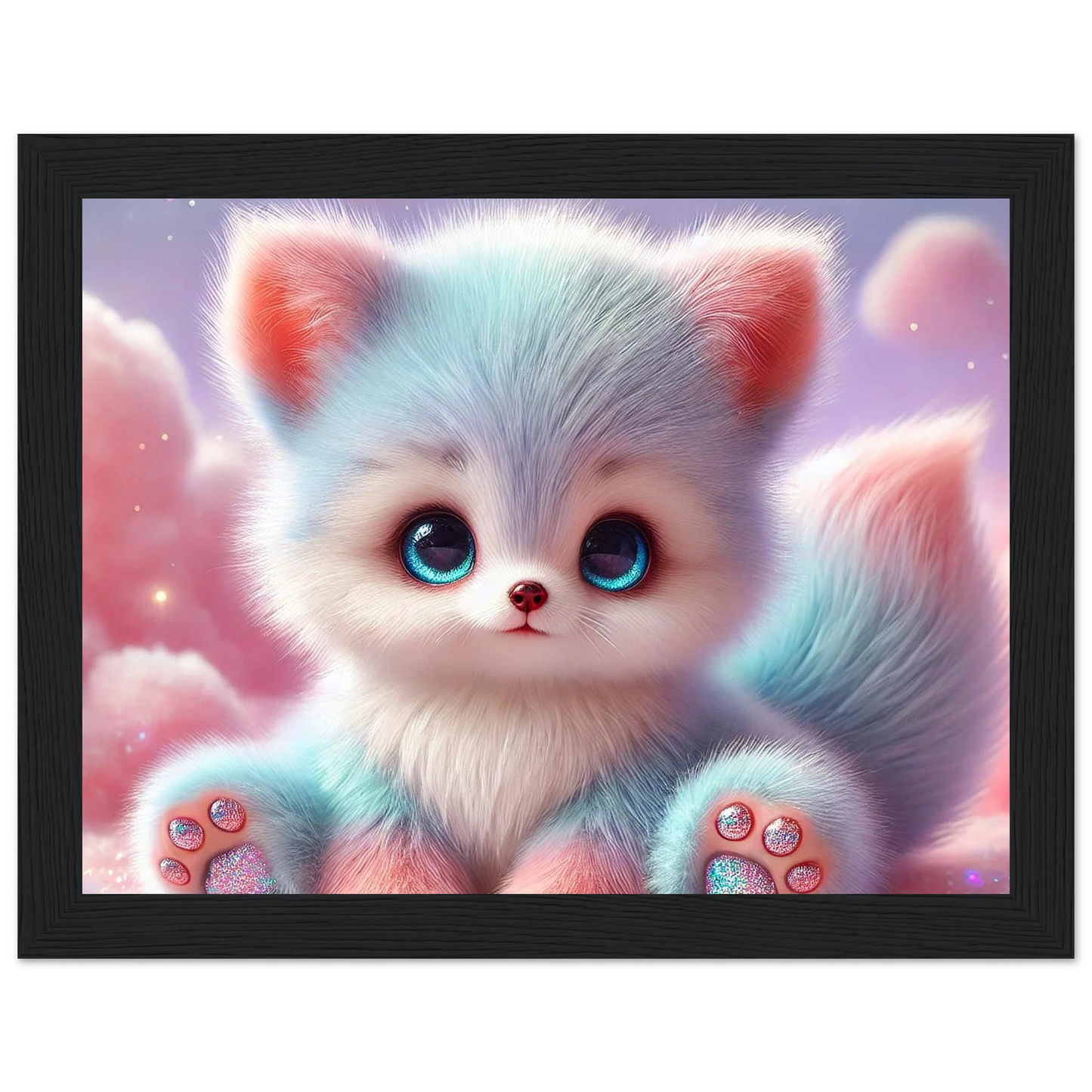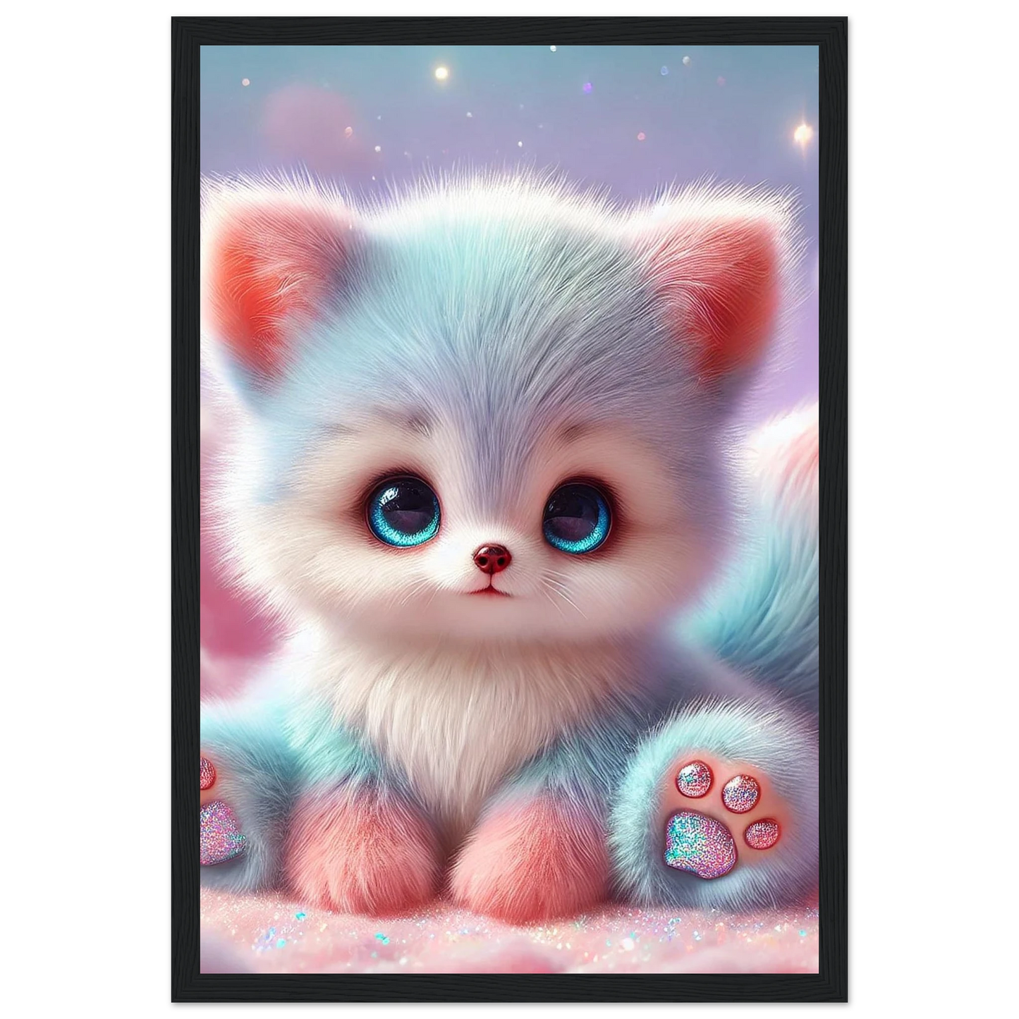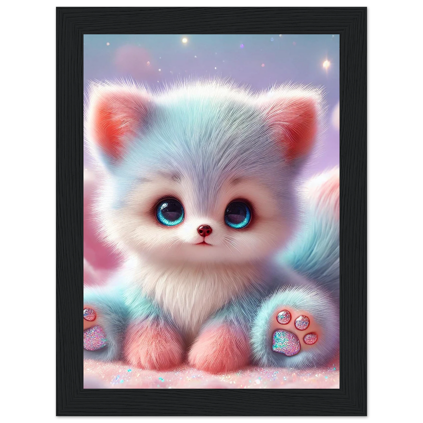Bringe mit unseren holzgerahmten Kunstdrucken die märchenhafte Magie von Nuvina in dein Zuhause – einem kleinen, magischen Wolf mit pastellfarbenem Fell, das wie zarte Zuckerwatte schimmert. Mit glitzernden Augen und funkelnden Tatzenpads ist sie ein Sinnbild von Sanftmut und träumerischer Schönheit.