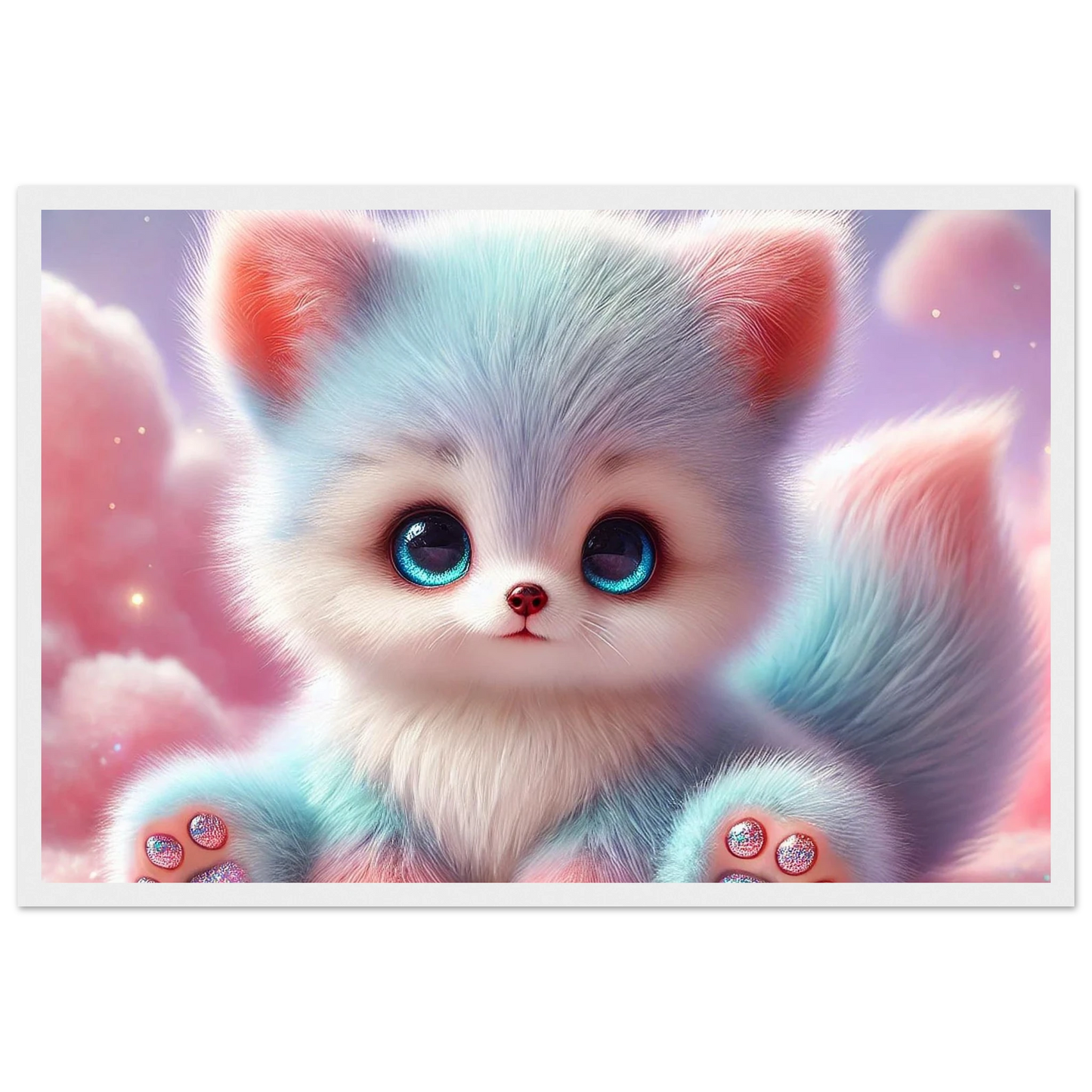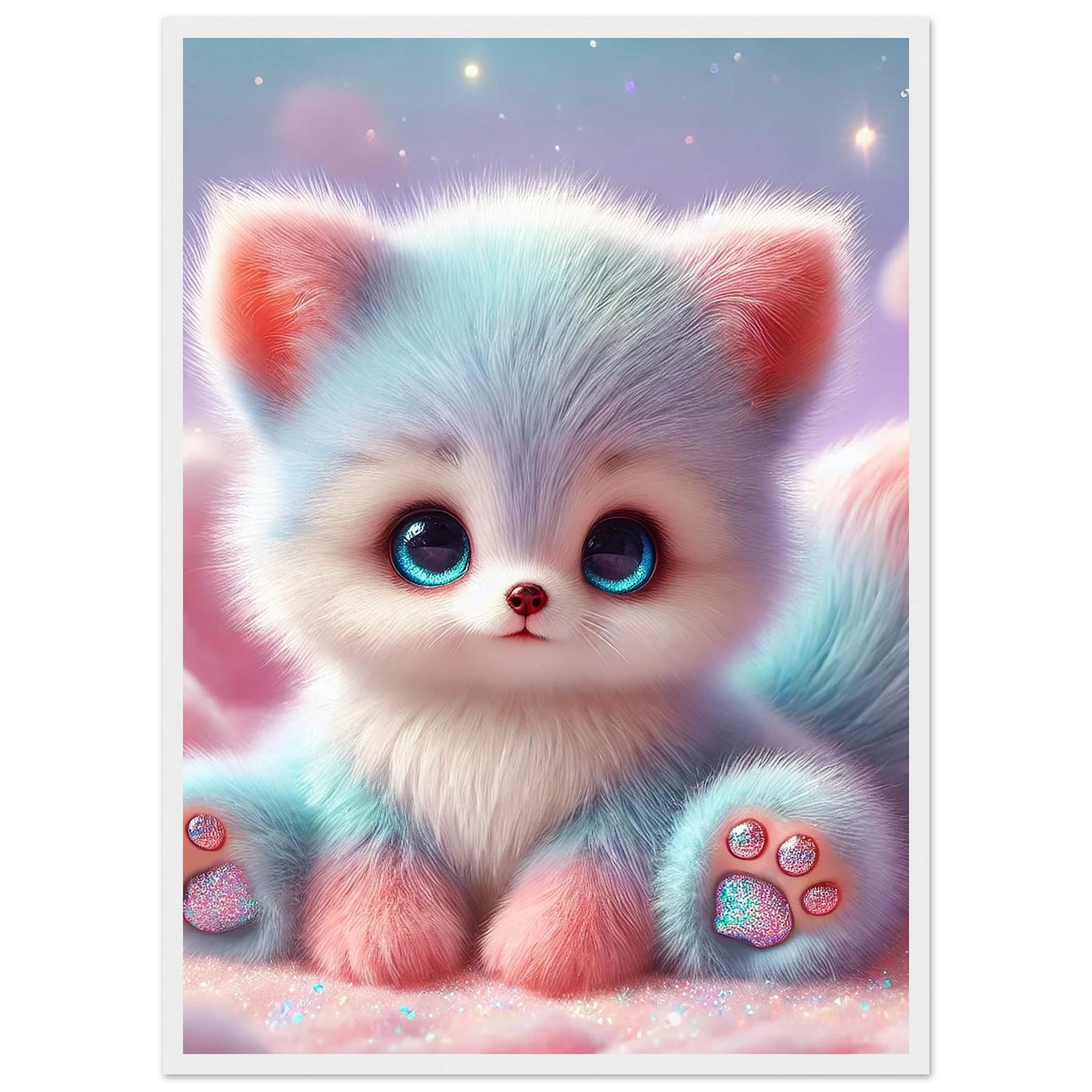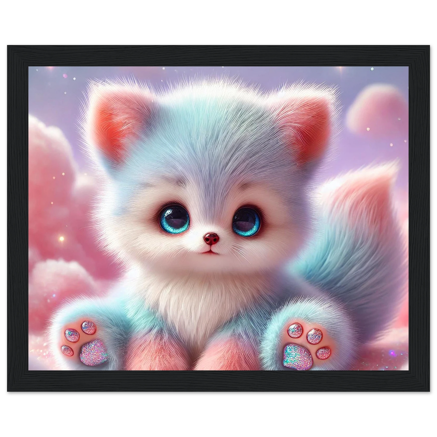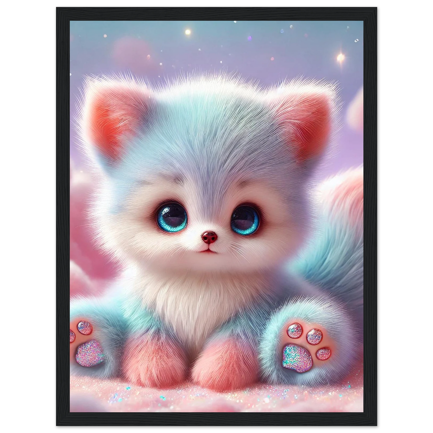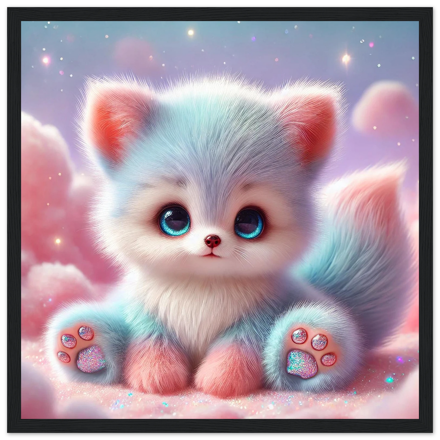 Bringe mit unseren holzgerahmten Kunstdrucken die märchenhafte Magie von Nuvina in dein Zuhause – einem kleinen, magischen Wolf mit pastellfarbenem Fell, das wie zarte Zuckerwatte schimmert. Mit glitzernden Augen und funkelnden Tatzenpads ist sie ein Sinnbild von Sanftmut und träumerischer Schönheit.