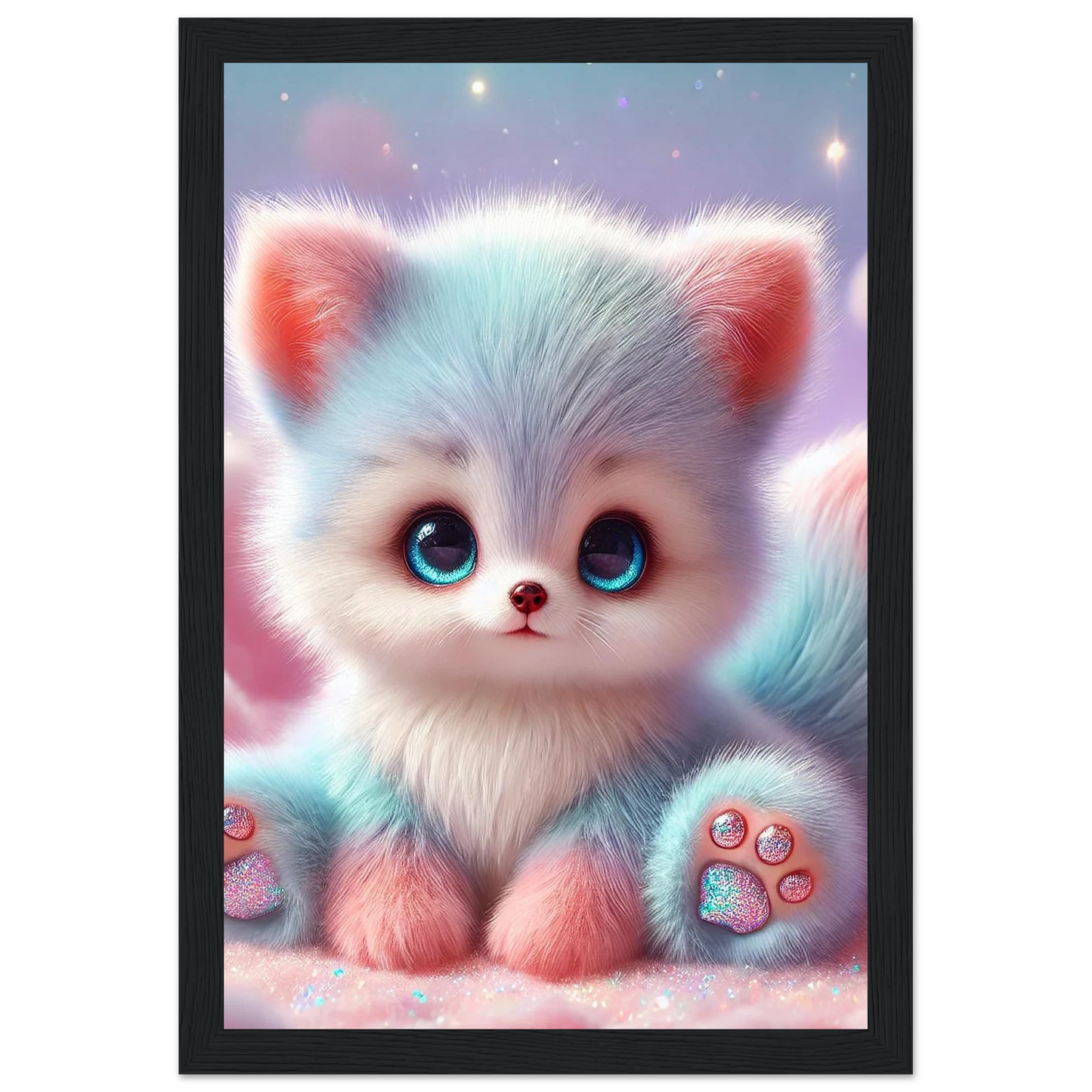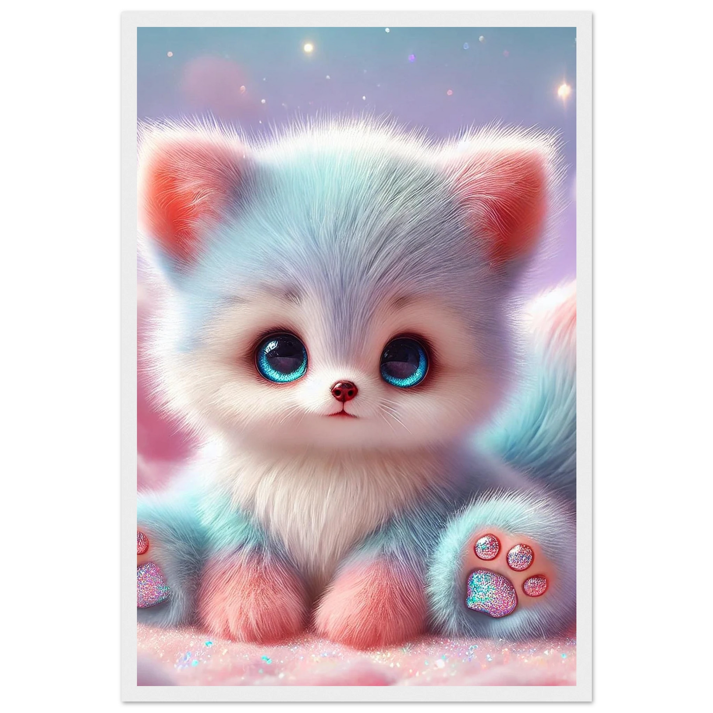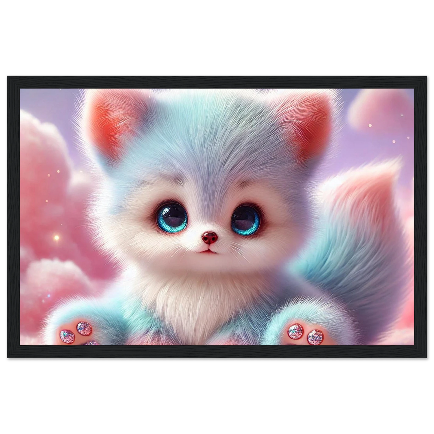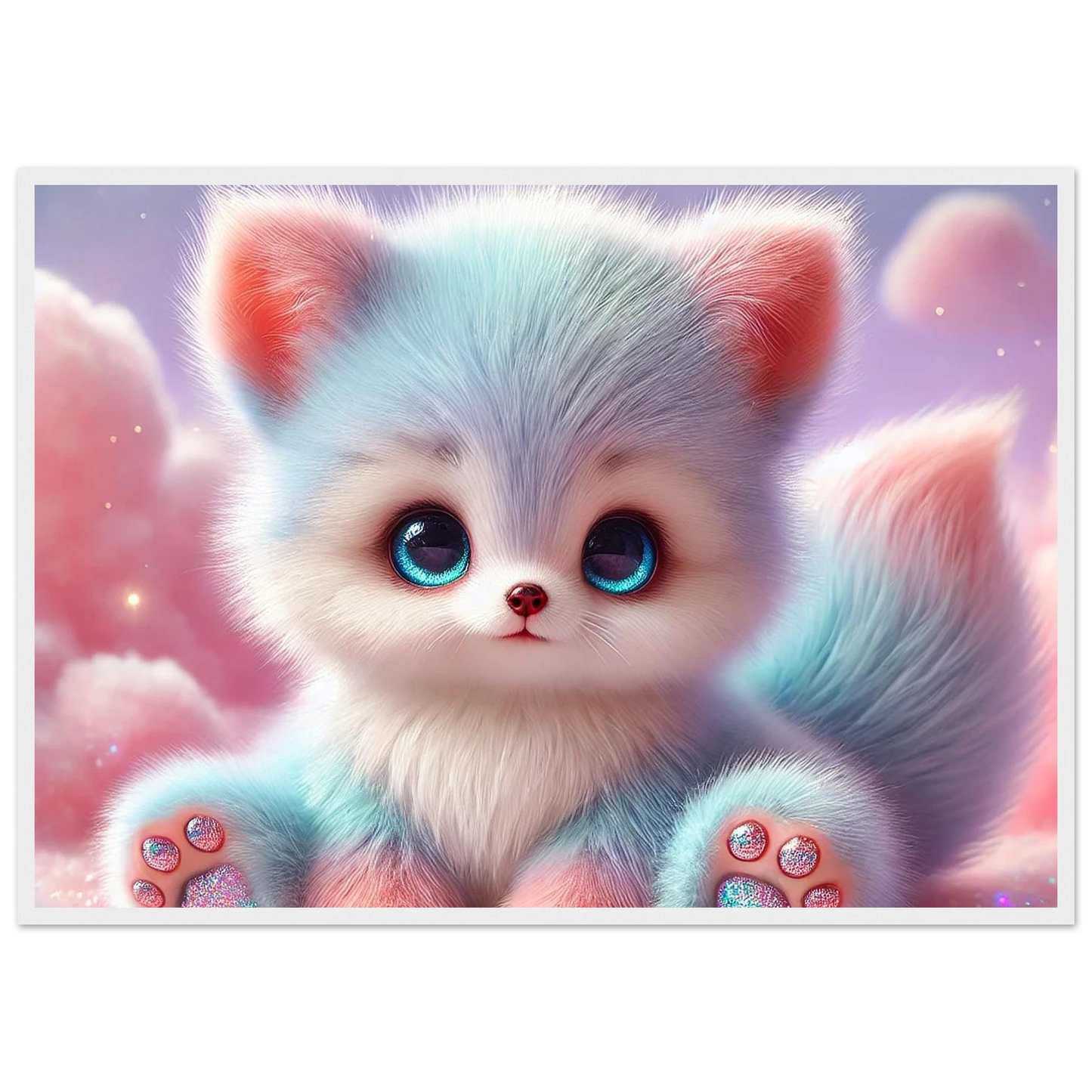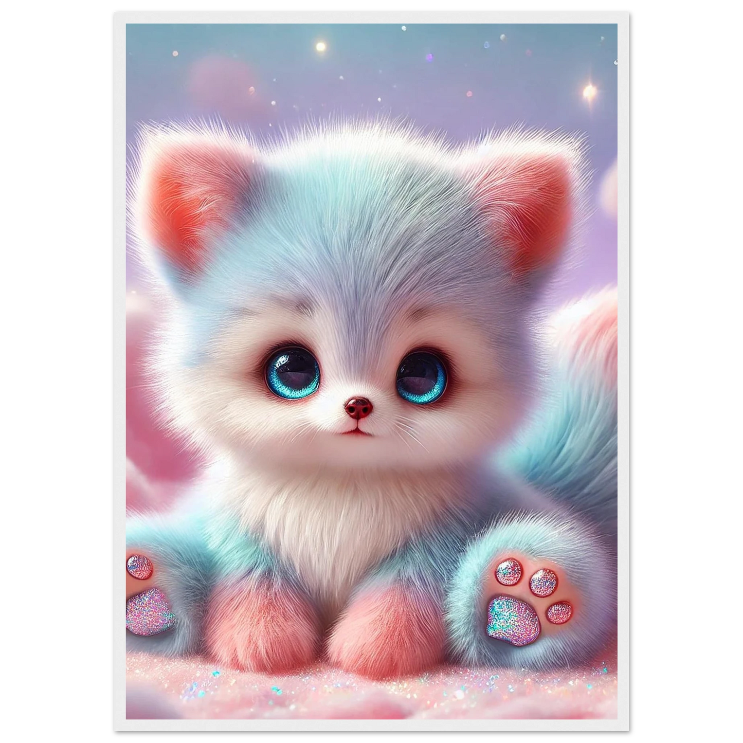 Bringe mit unseren holzgerahmten Kunstdrucken die märchenhafte Magie von Nuvina in dein Zuhause – einem kleinen, magischen Wolf mit pastellfarbenem Fell, das wie zarte Zuckerwatte schimmert. Mit glitzernden Augen und funkelnden Tatzenpads ist sie ein Sinnbild von Sanftmut und träumerischer Schönheit.