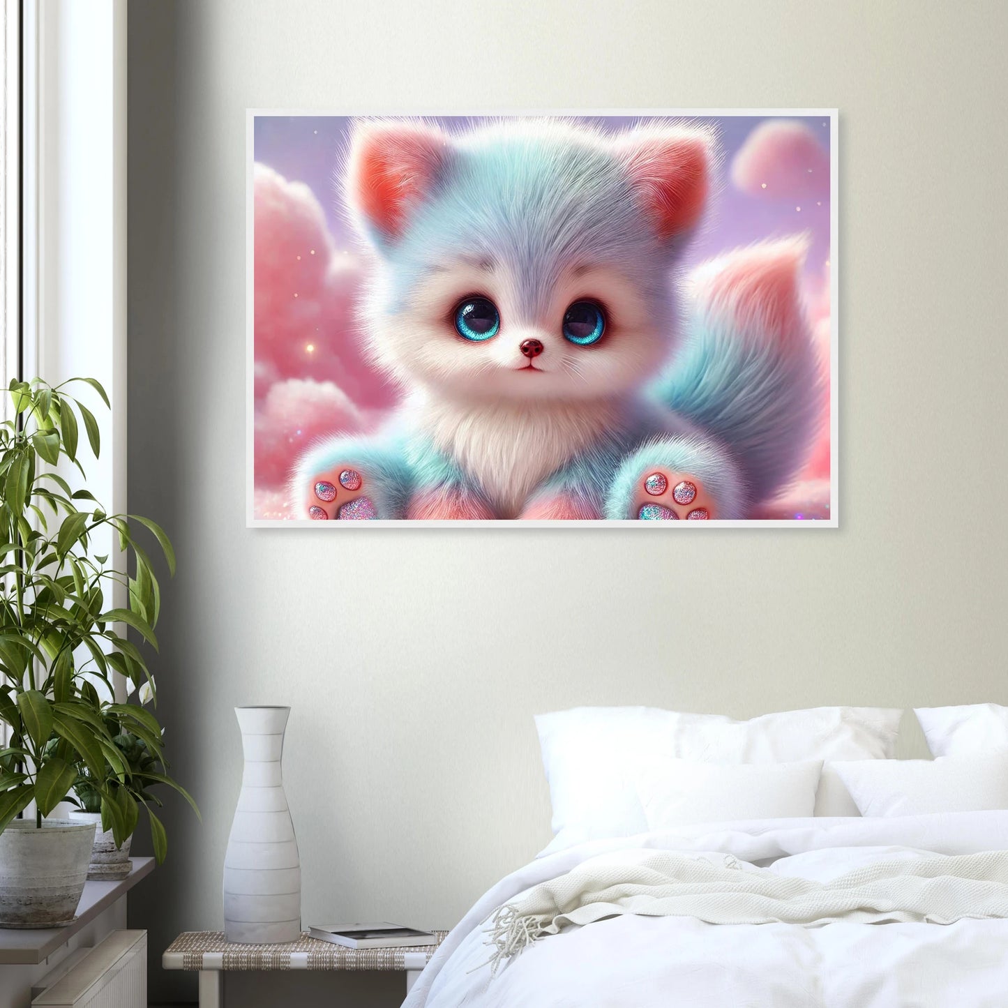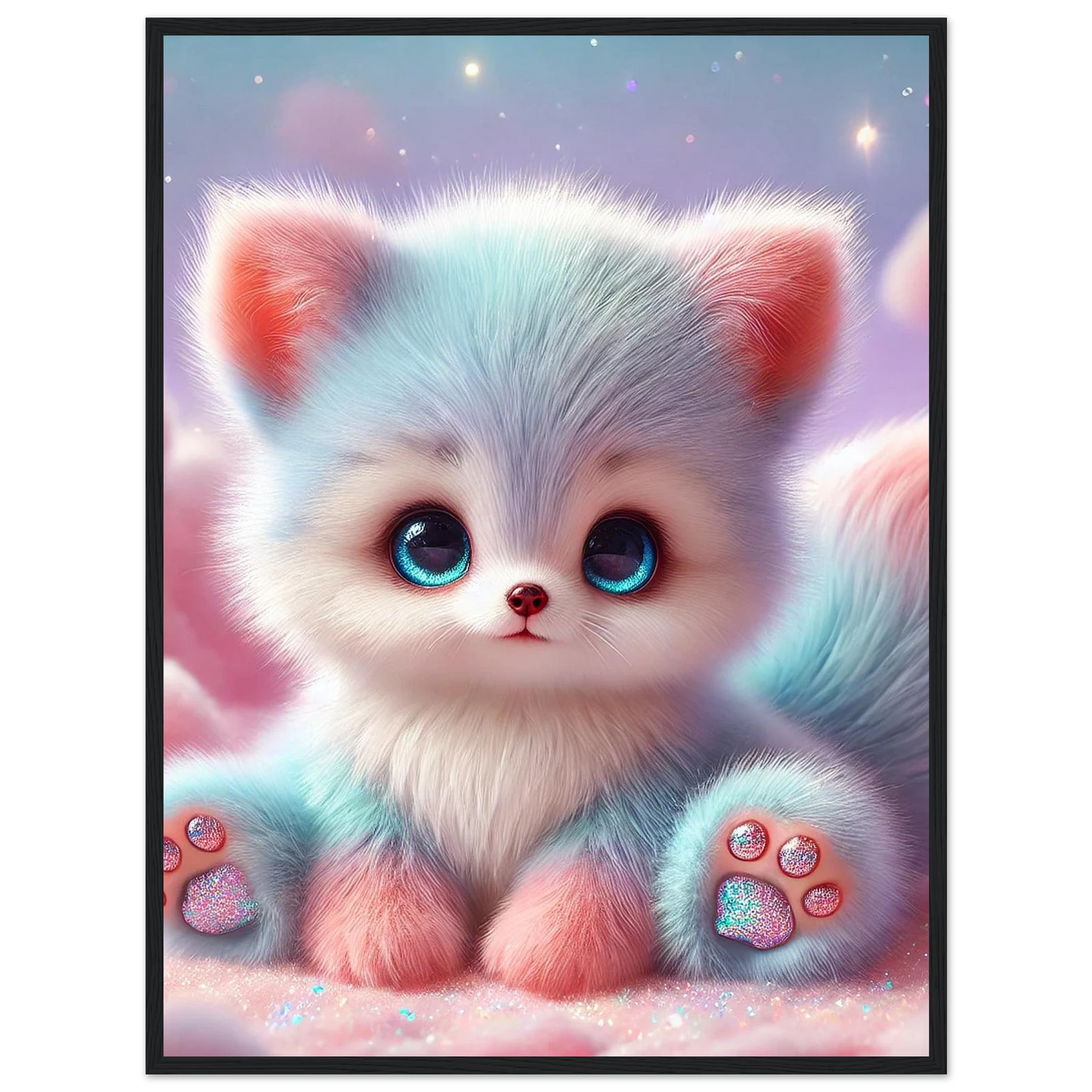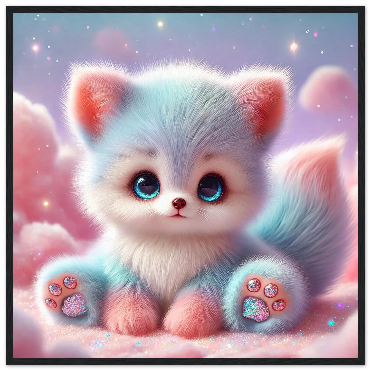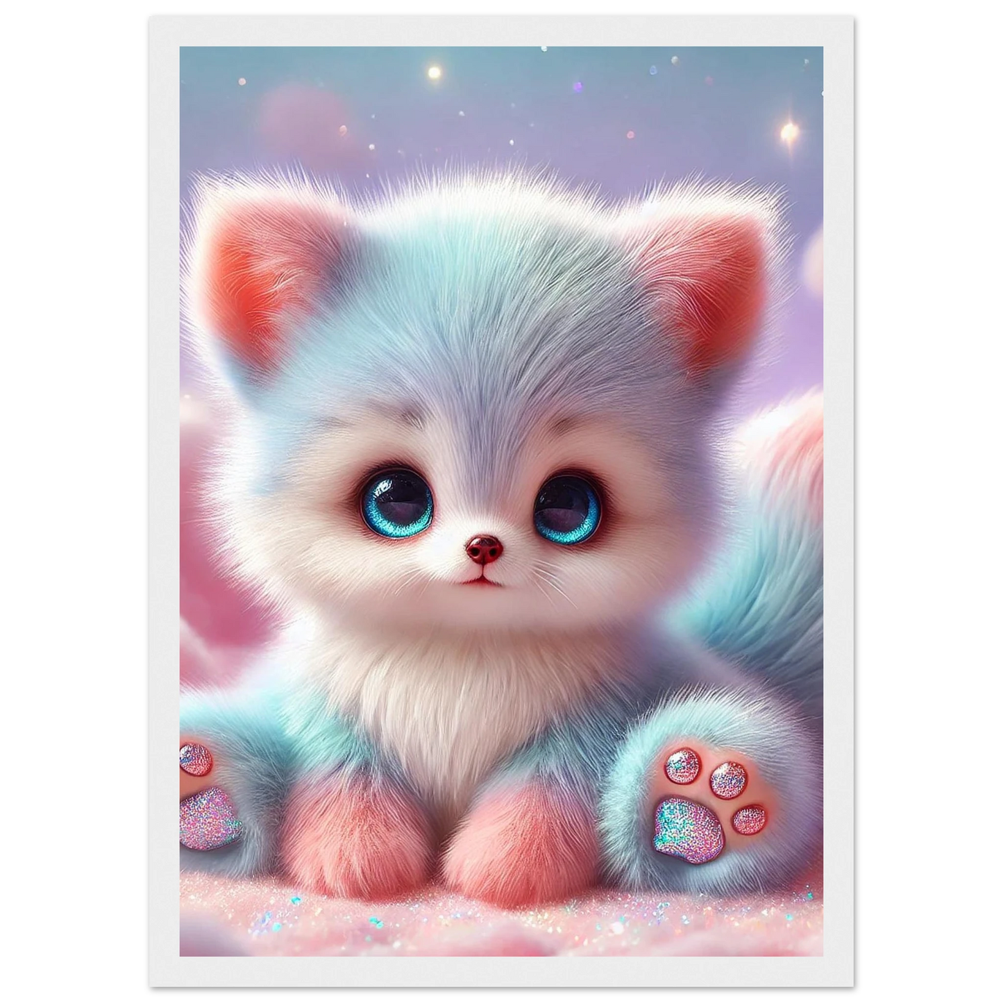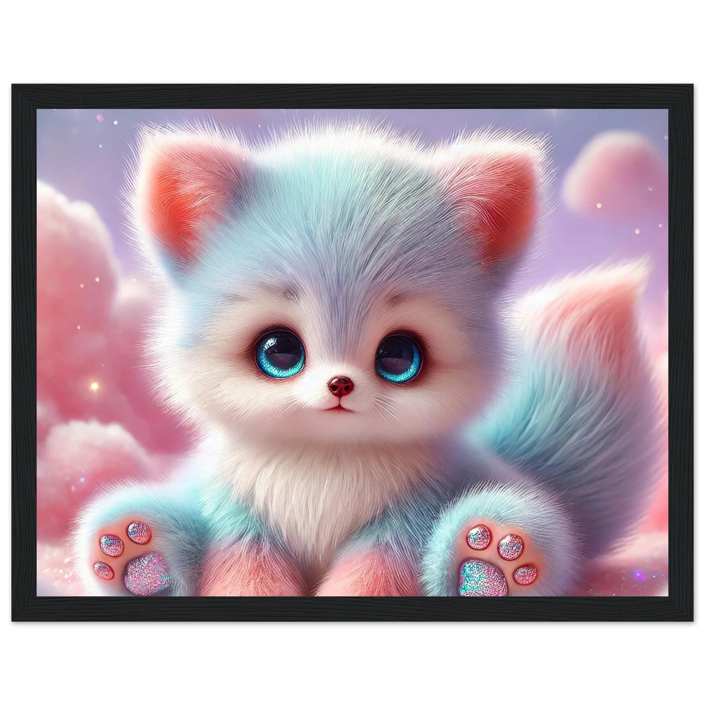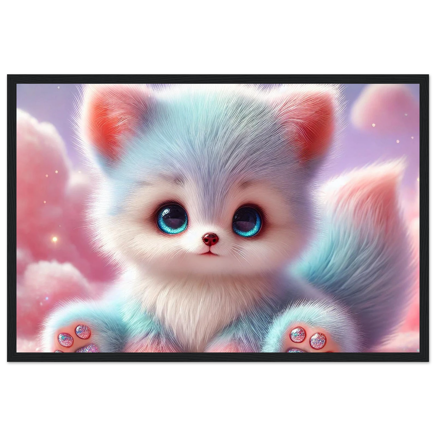 Bringe mit unseren holzgerahmten Kunstdrucken die märchenhafte Magie von Nuvina in dein Zuhause – einem kleinen, magischen Wolf mit pastellfarbenem Fell, das wie zarte Zuckerwatte schimmert. Mit glitzernden Augen und funkelnden Tatzenpads ist sie ein Sinnbild von Sanftmut und träumerischer Schönheit.