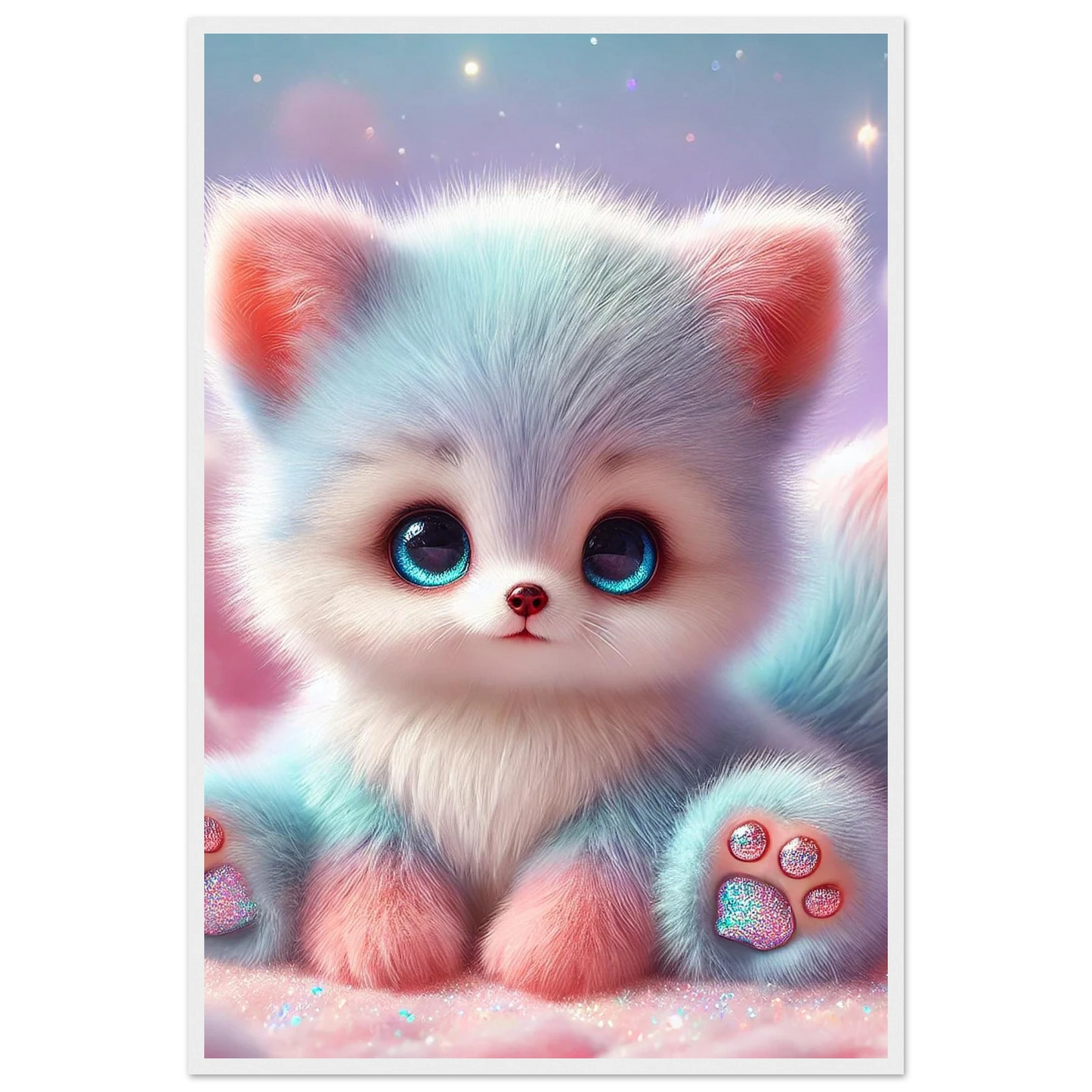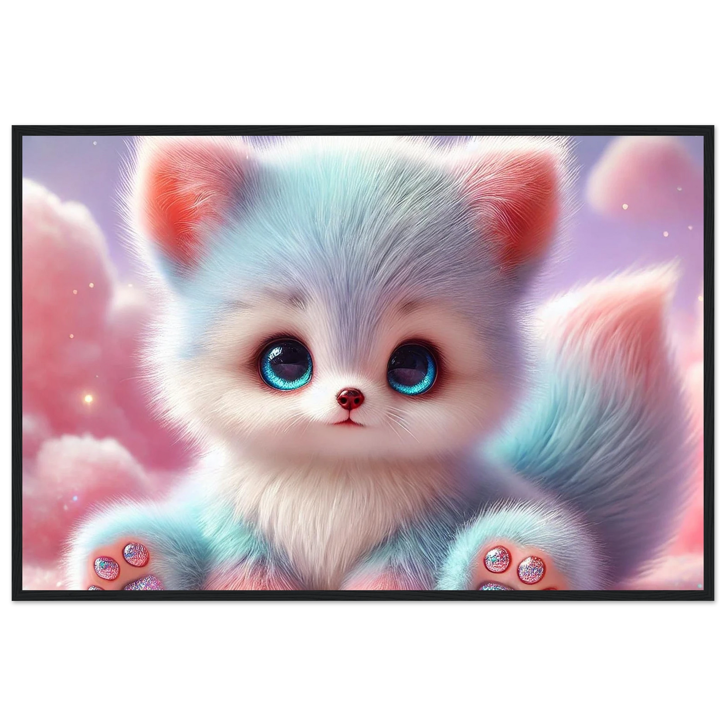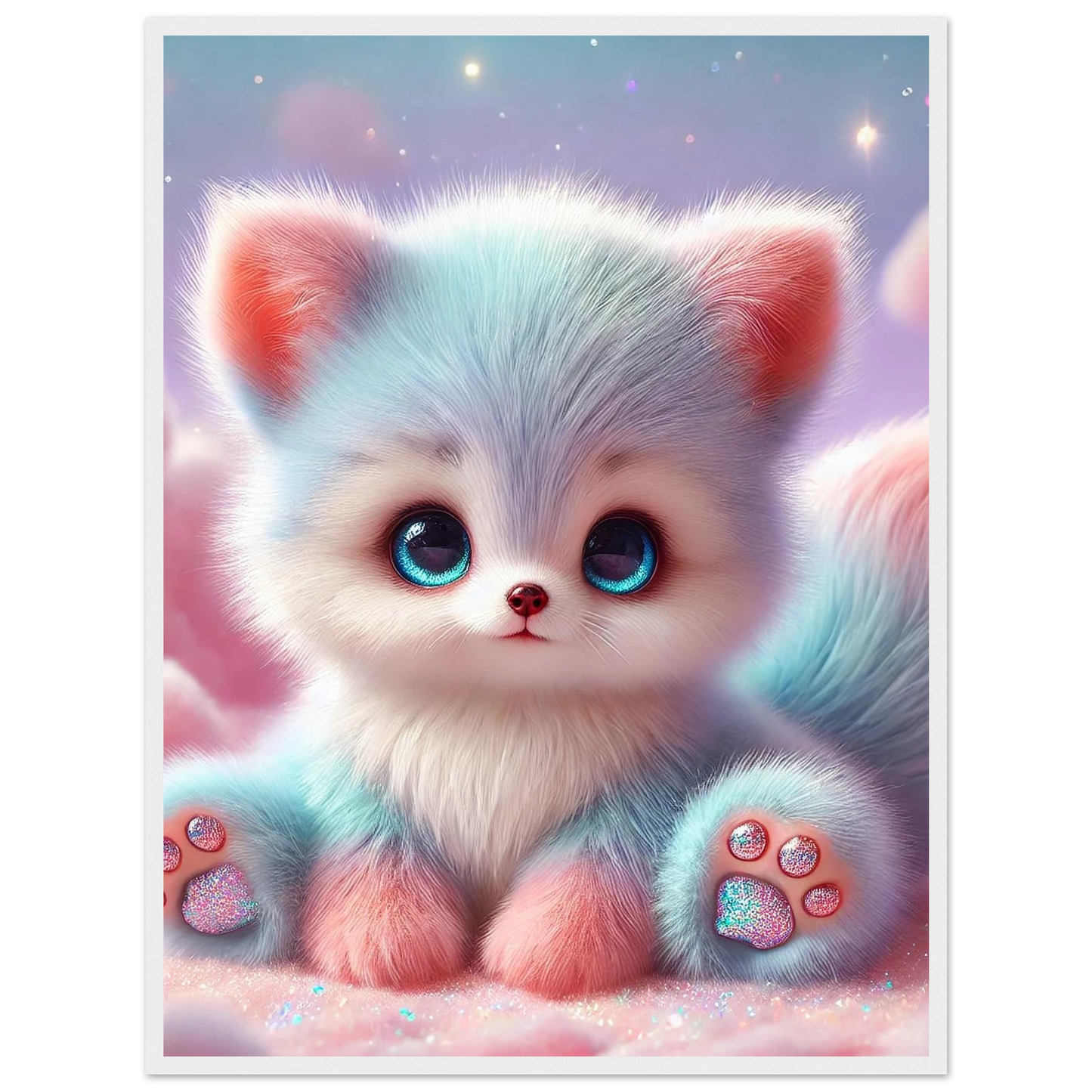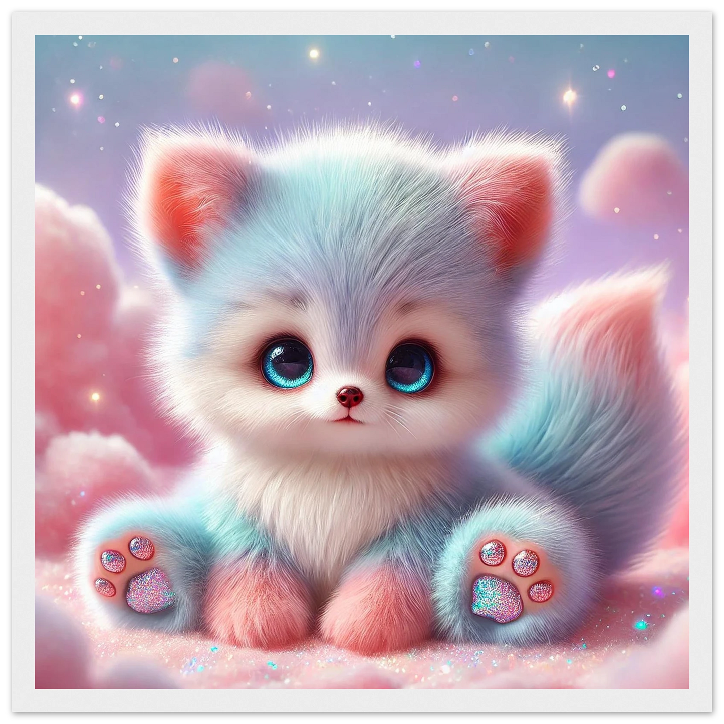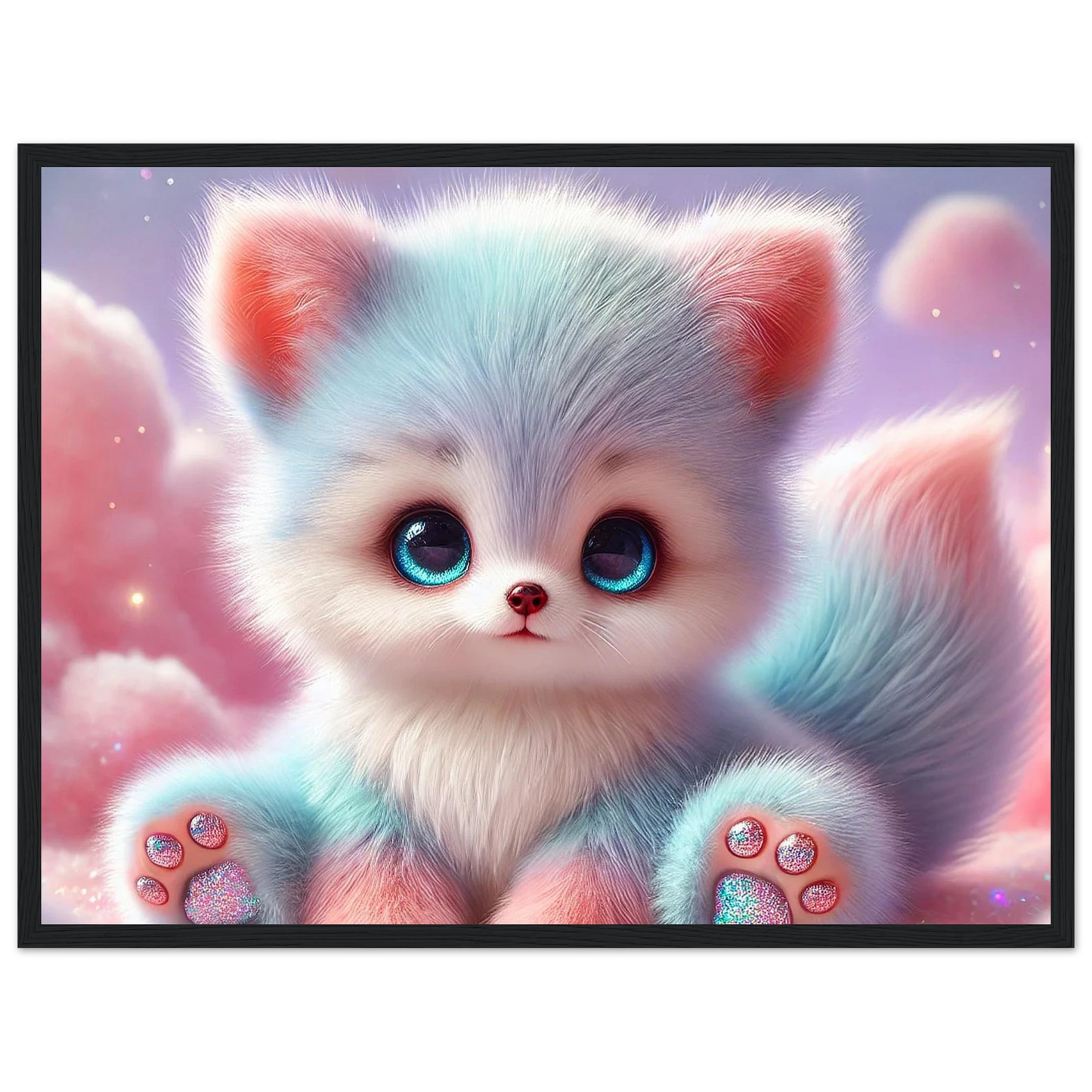 Bringe mit unseren holzgerahmten Kunstdrucken die märchenhafte Magie von Nuvina in dein Zuhause – einem kleinen, magischen Wolf mit pastellfarbenem Fell, das wie zarte Zuckerwatte schimmert. Mit glitzernden Augen und funkelnden Tatzenpads ist sie ein Sinnbild von Sanftmut und träumerischer Schönheit.