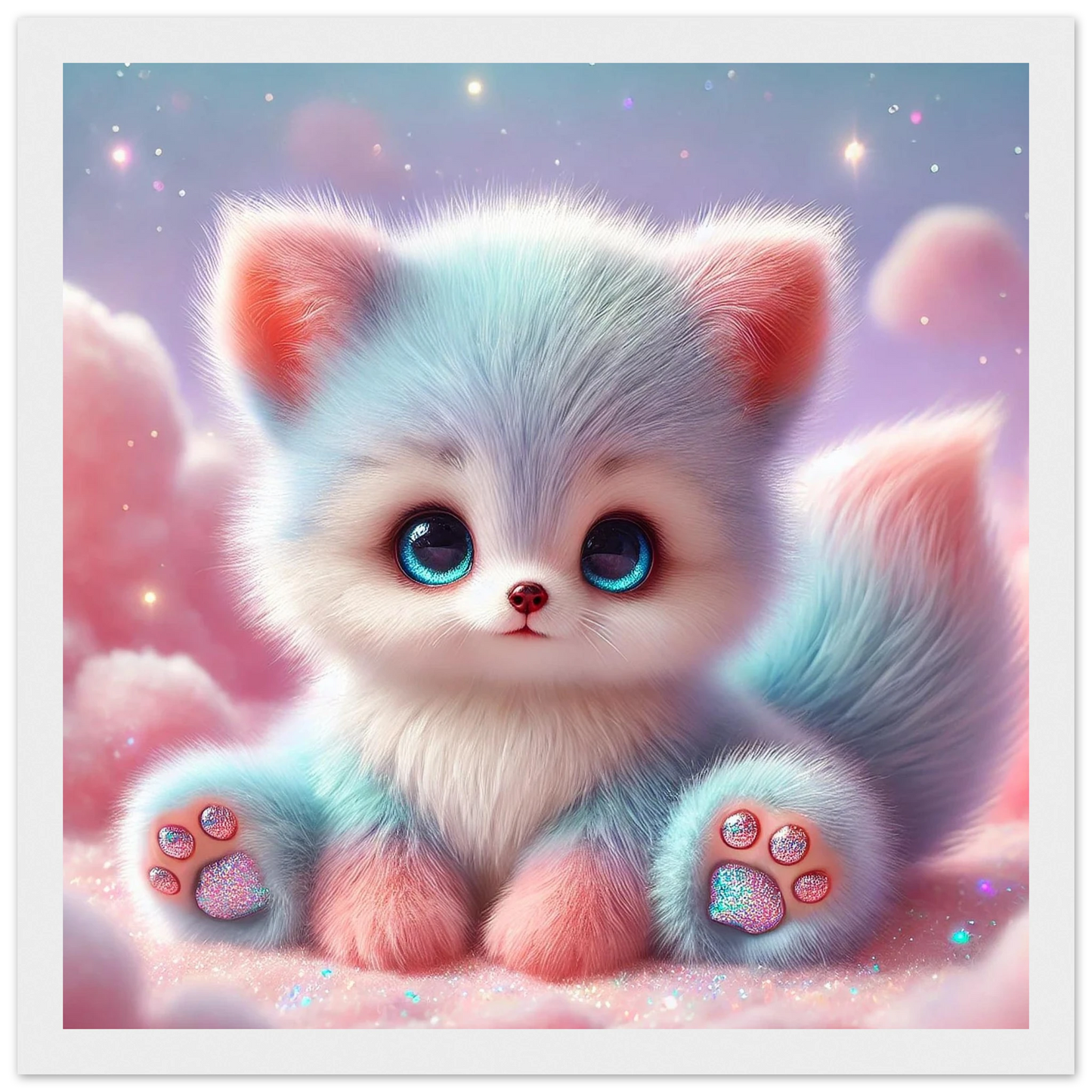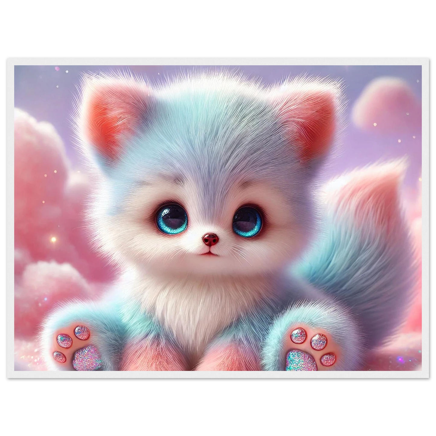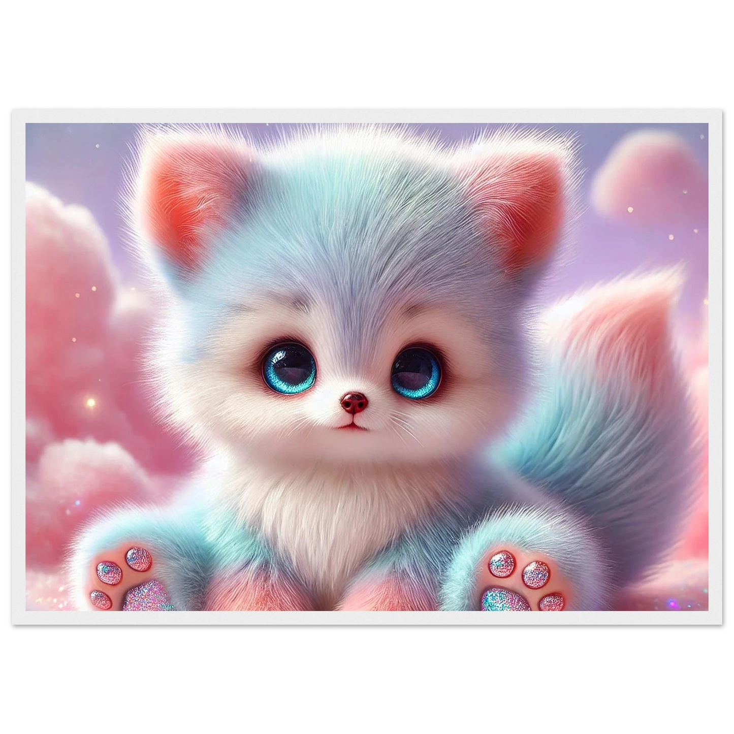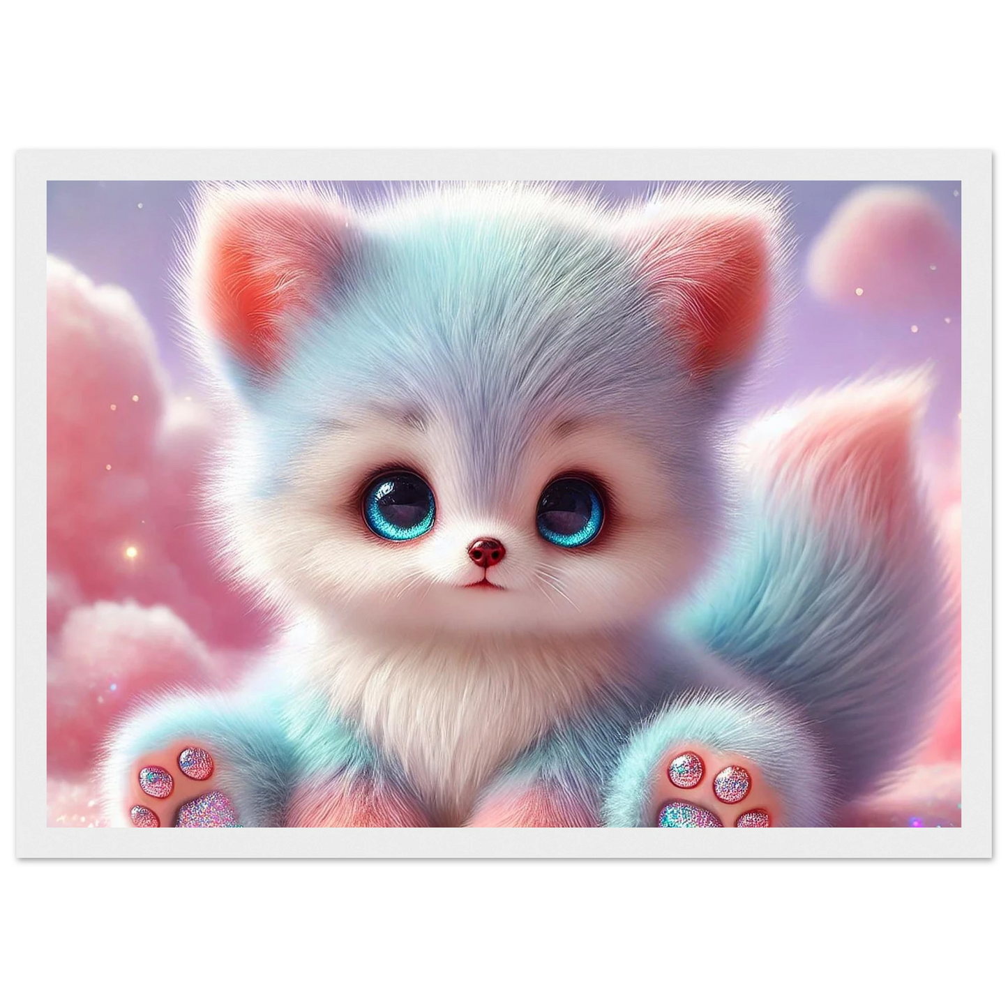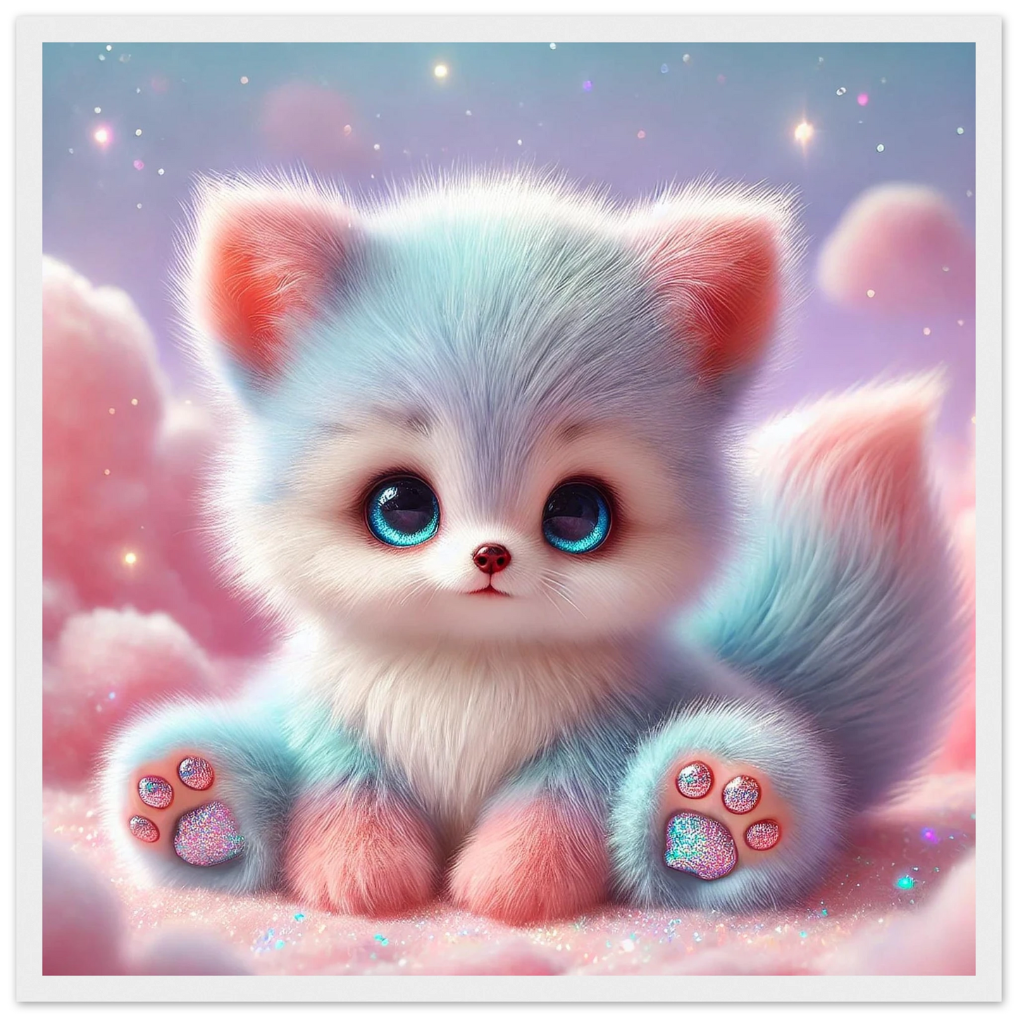 Bringe mit unseren holzgerahmten Kunstdrucken die märchenhafte Magie von Nuvina in dein Zuhause – einem kleinen, magischen Wolf mit pastellfarbenem Fell, das wie zarte Zuckerwatte schimmert. Mit glitzernden Augen und funkelnden Tatzenpads ist sie ein Sinnbild von Sanftmut und träumerischer Schönheit.