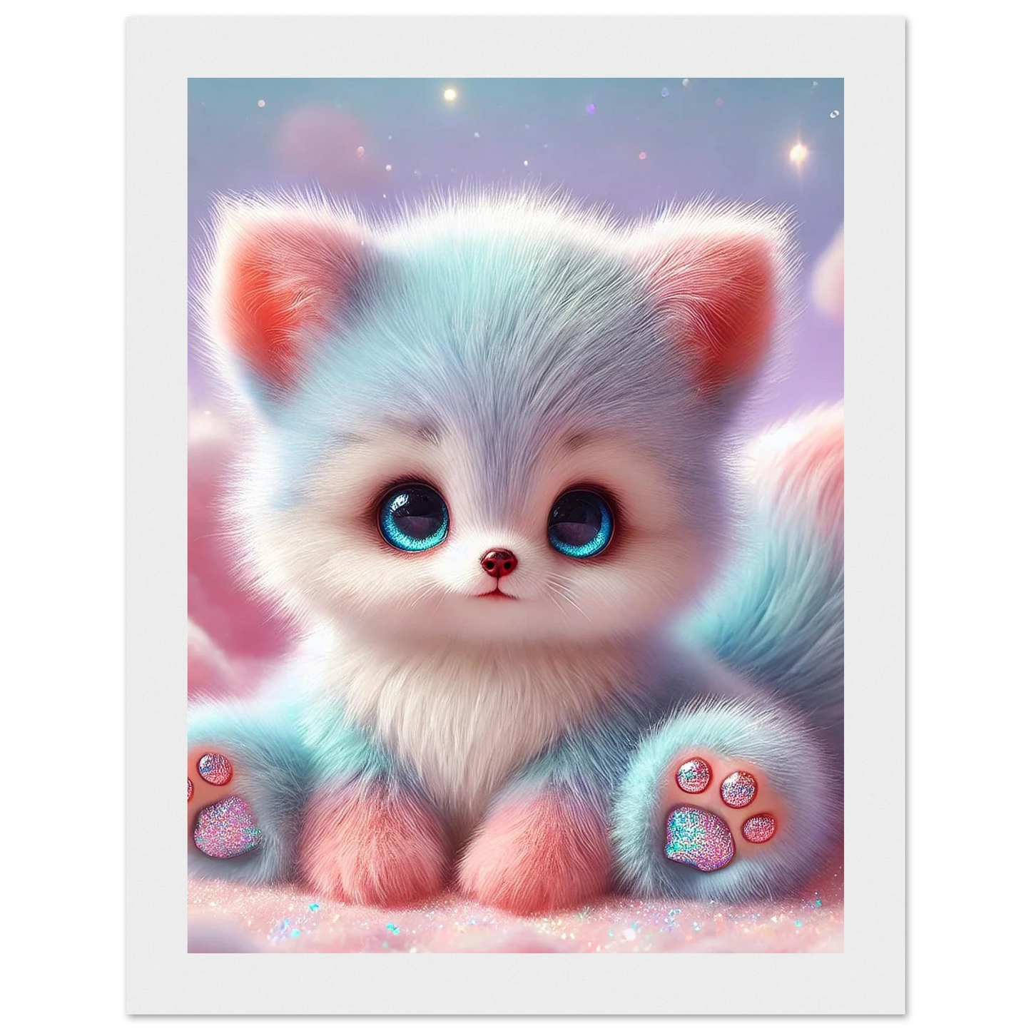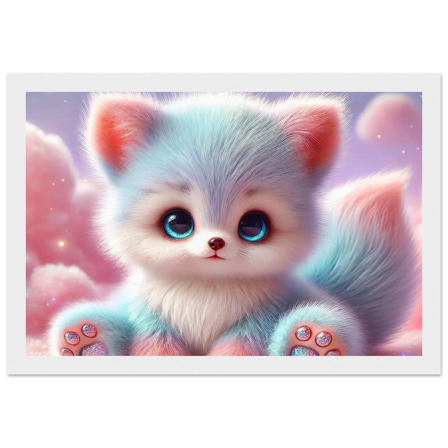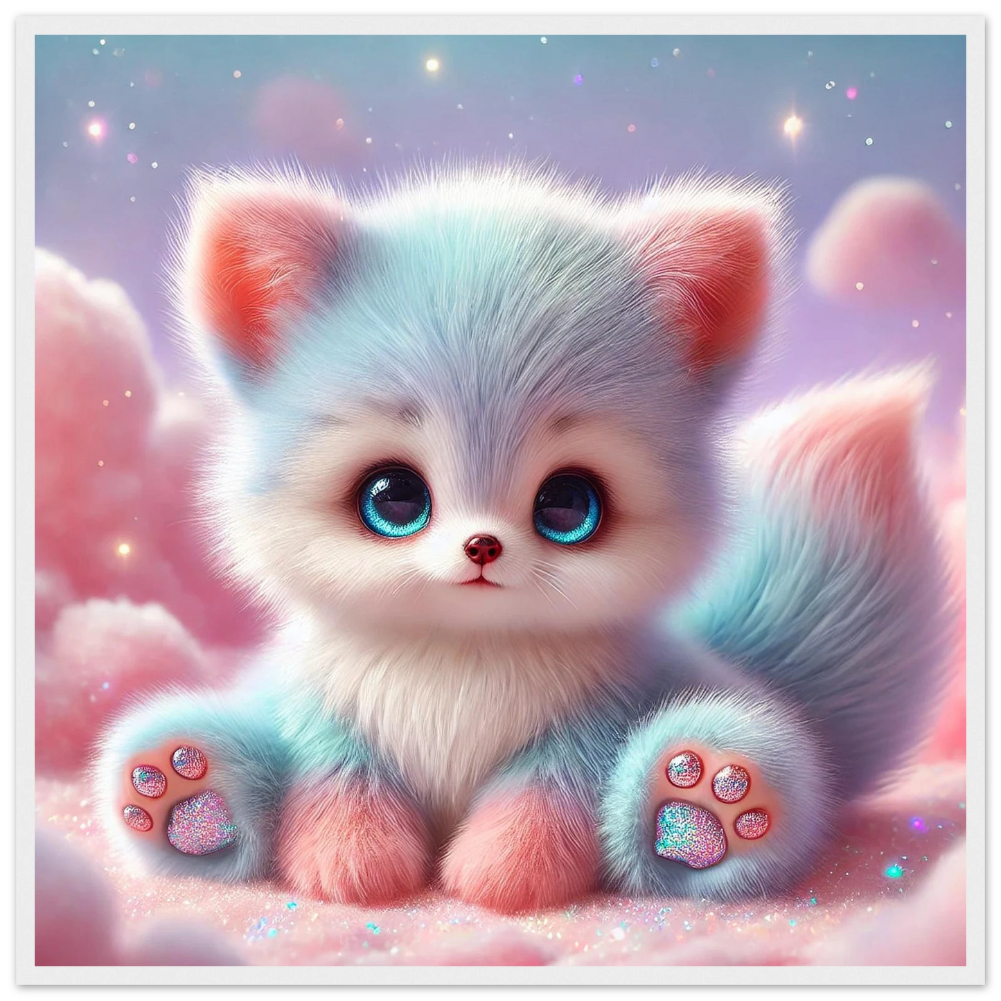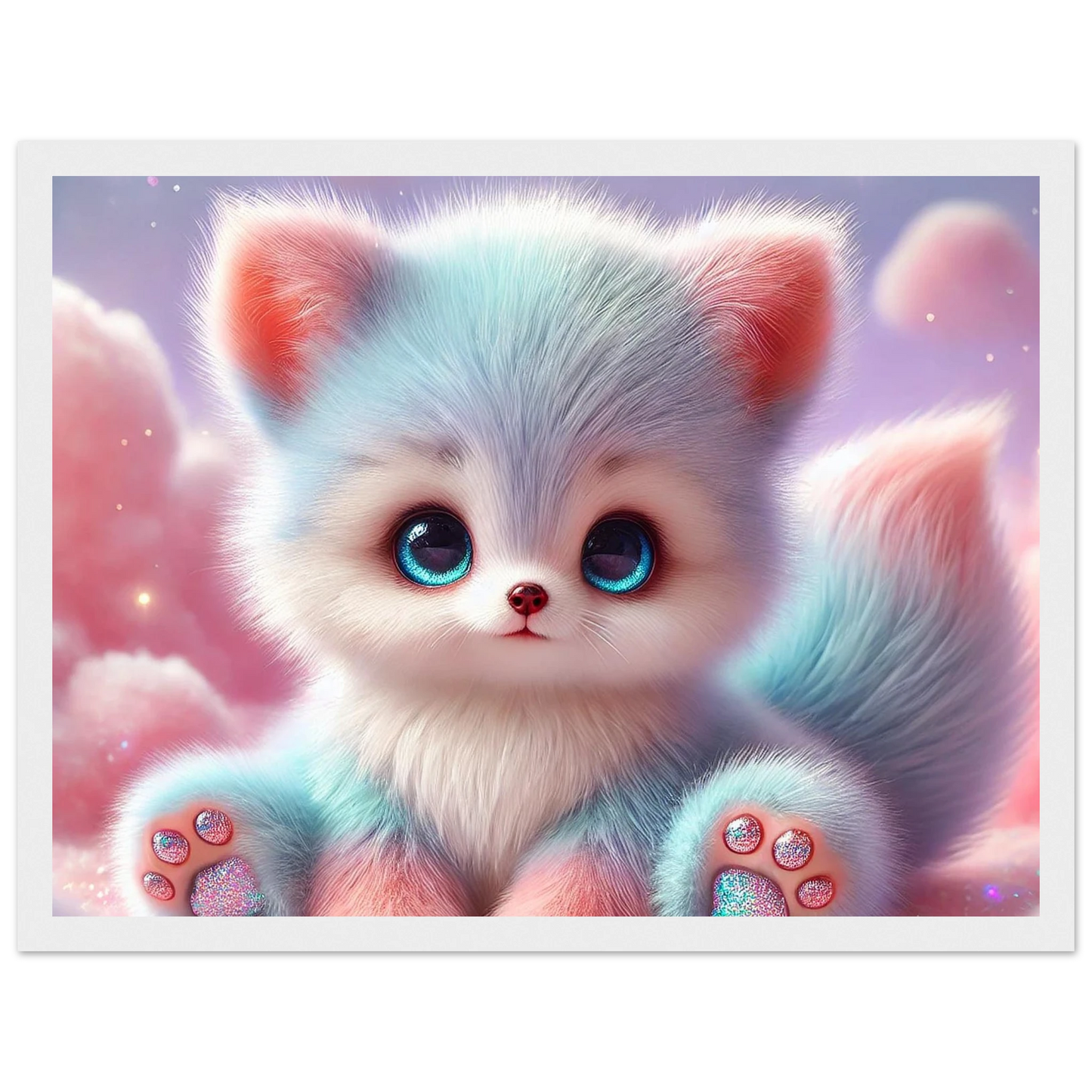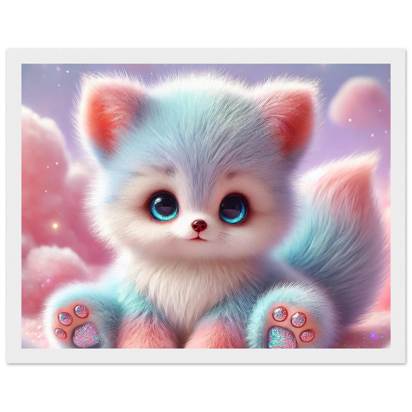 Bringe mit unseren holzgerahmten Kunstdrucken die märchenhafte Magie von Nuvina in dein Zuhause – einem kleinen, magischen Wolf mit pastellfarbenem Fell, das wie zarte Zuckerwatte schimmert. Mit glitzernden Augen und funkelnden Tatzenpads ist sie ein Sinnbild von Sanftmut und träumerischer Schönheit.