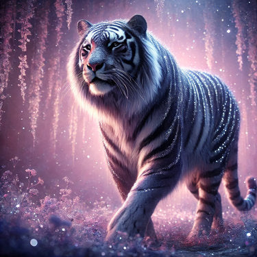 Nyaro ist ein kraftvoller, silberner Tiger, dessen Fell im Licht wie mit funkelnden Kristallen bestäubt wirkt. Umgeben von hängenden Kristallblüten und schimmerndem Nebel schreitet er mit ruhiger Eleganz durch eine Welt zwischen Nacht und Traum.