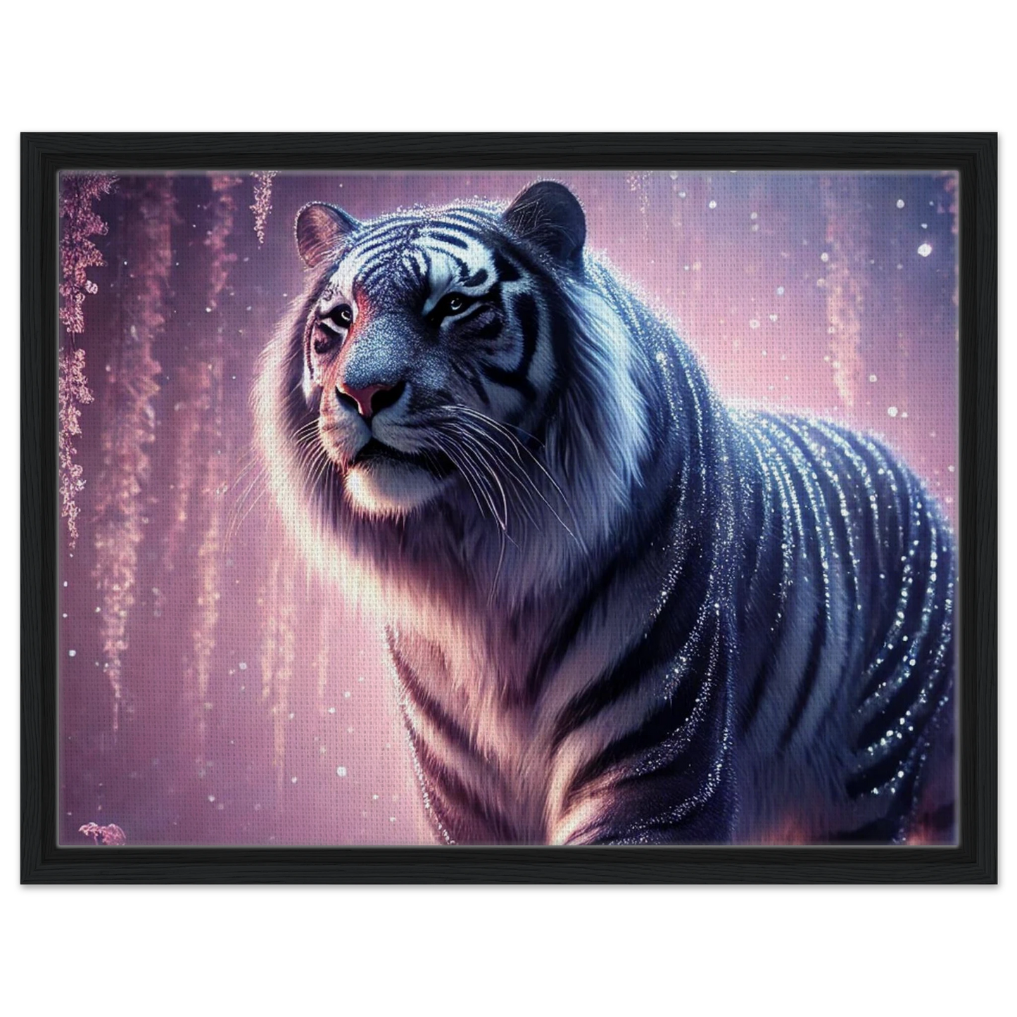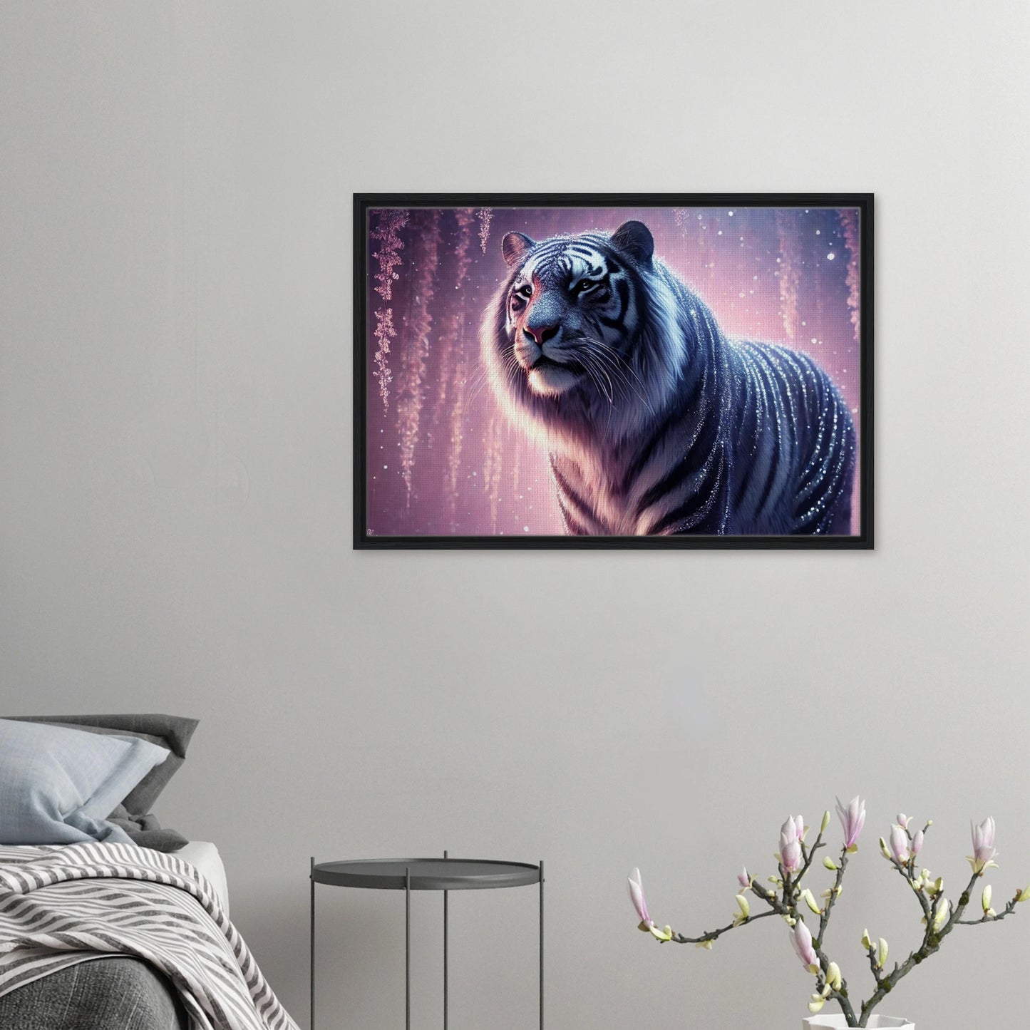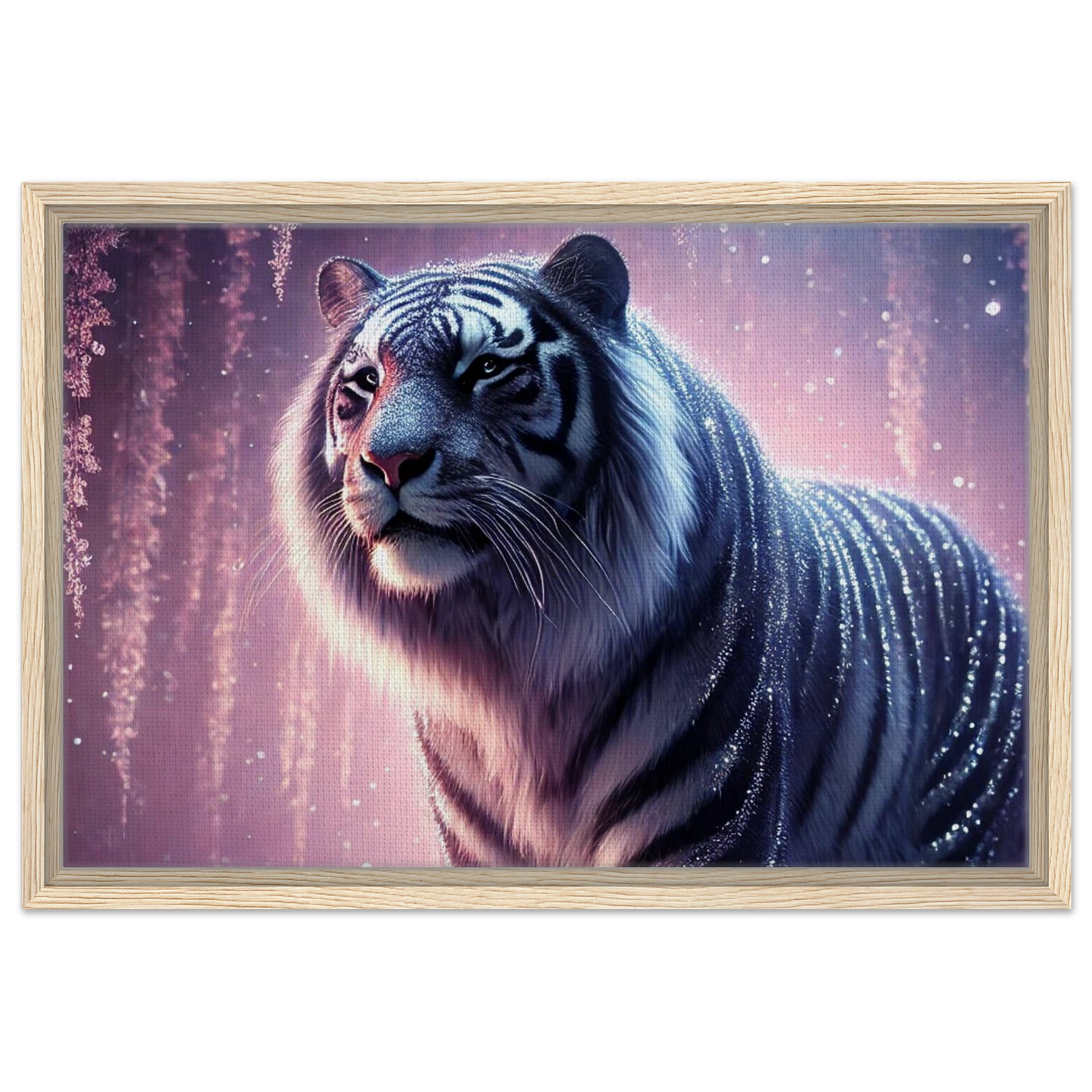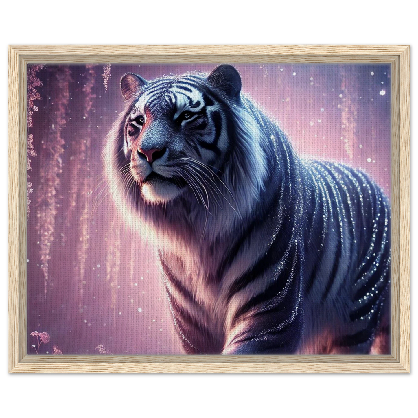 Bring die Magie von Nyaro in dein Zuhause – dem silbernen Tiger, dessen Fell im Mondlicht wie Kristalle glänzt und dessen stille Präsenz Frieden und Harmonie schenkt. Die elegante Rahmung hebt das Kunstwerk hervor und macht es zu einem luxuriösen Blickfang in jedem Raum.