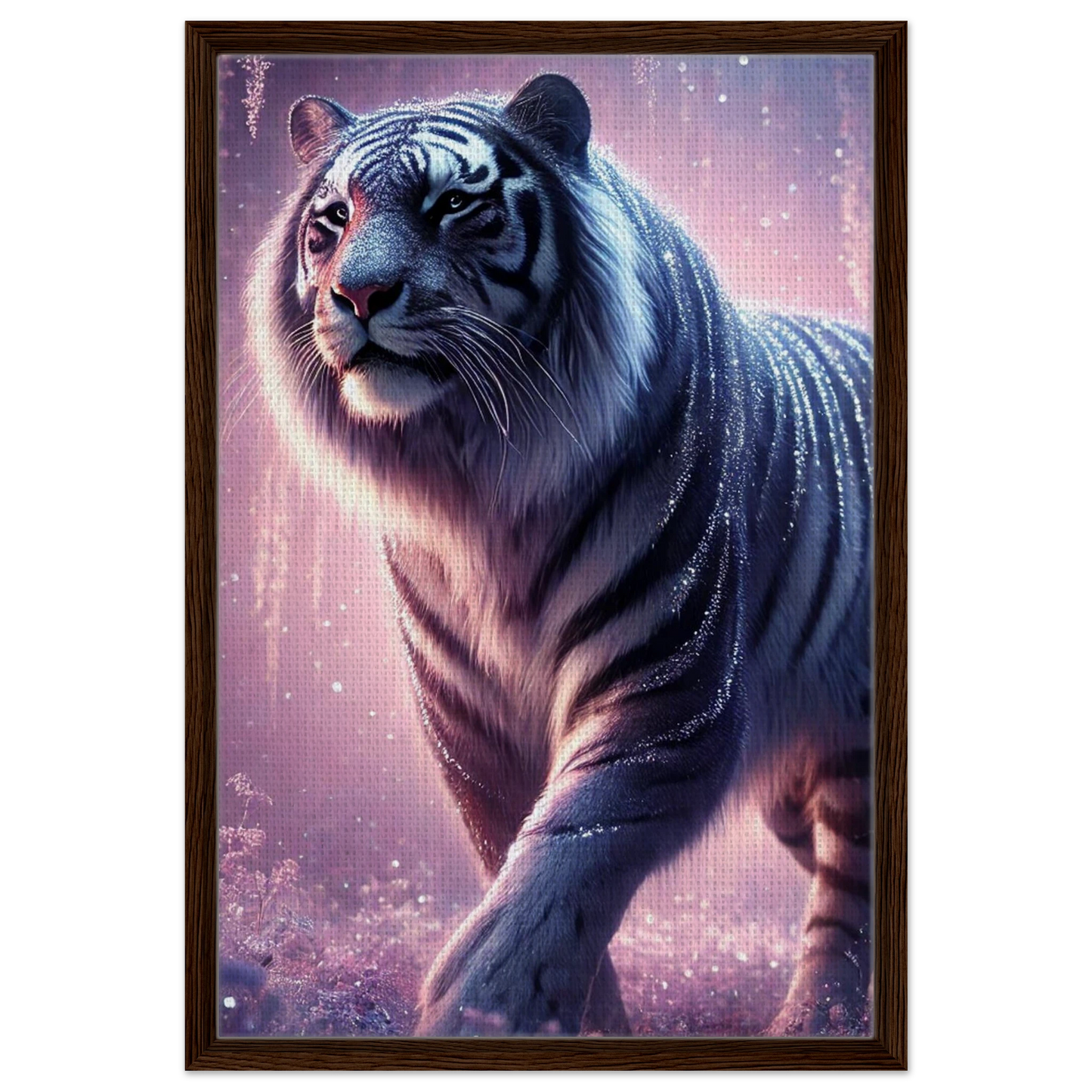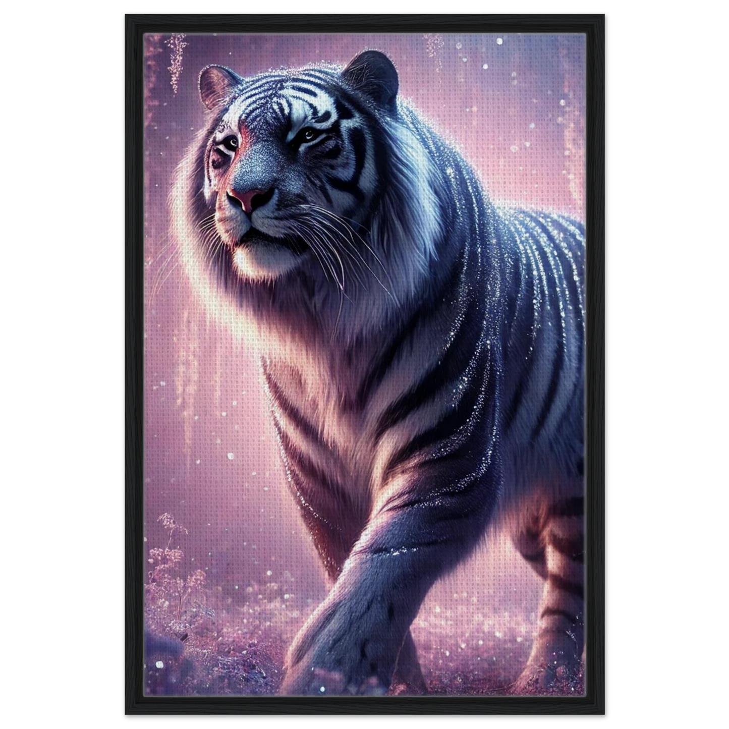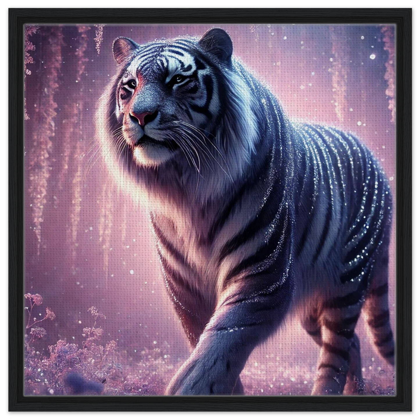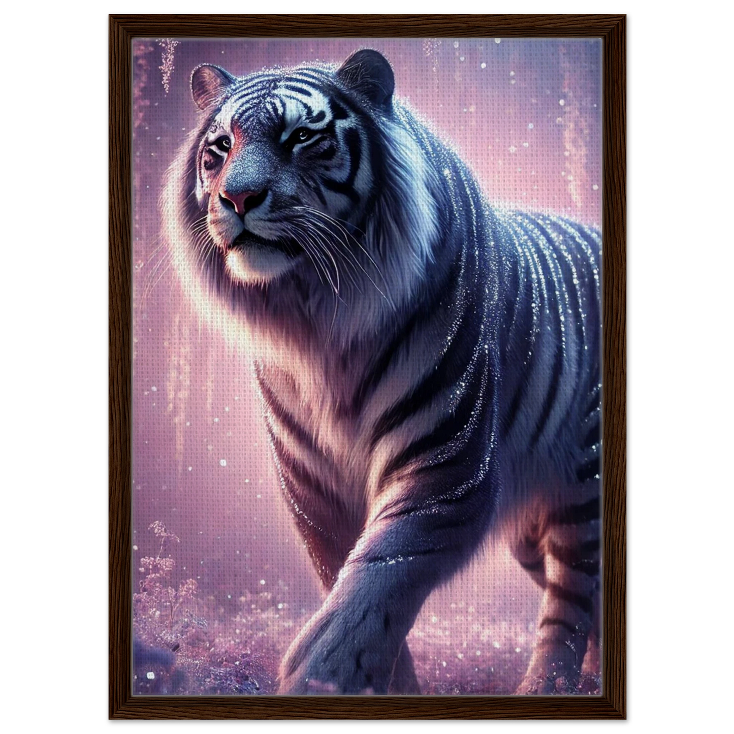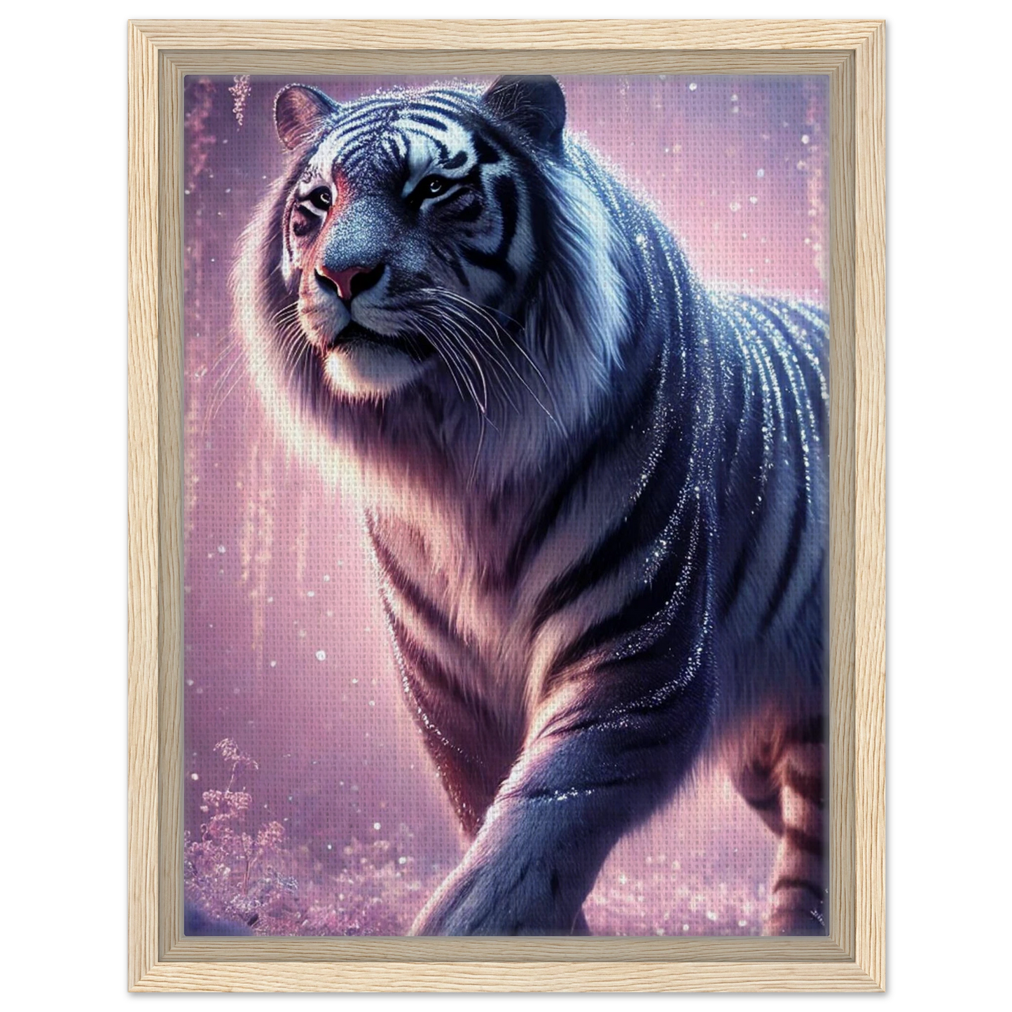 Bring die Magie von Nyaro in dein Zuhause – dem silbernen Tiger, dessen Fell im Mondlicht wie Kristalle glänzt und dessen stille Präsenz Frieden und Harmonie schenkt. Die elegante Rahmung hebt das Kunstwerk hervor und macht es zu einem luxuriösen Blickfang in jedem Raum.