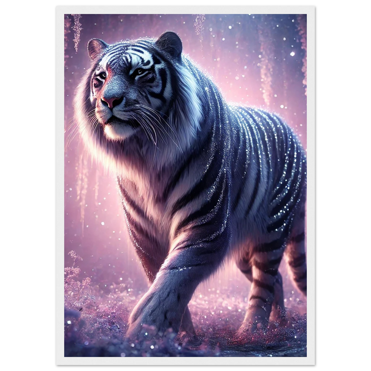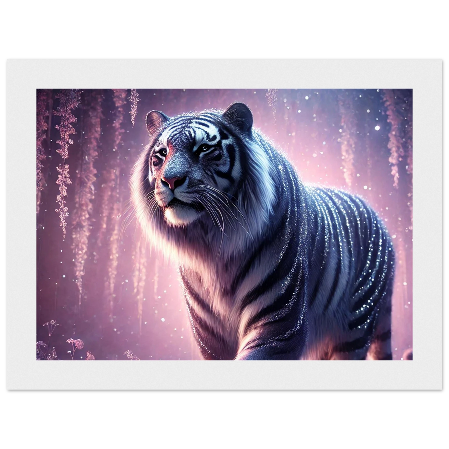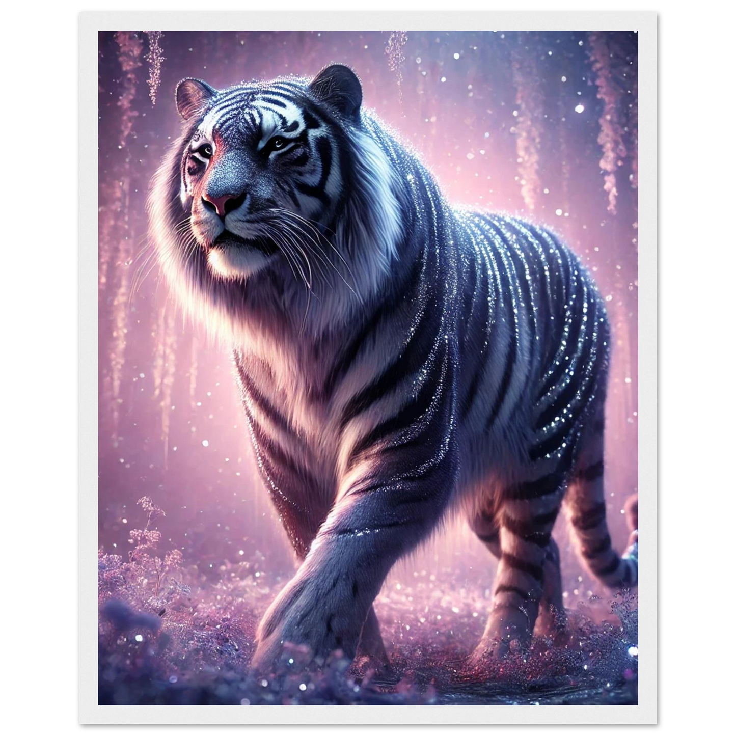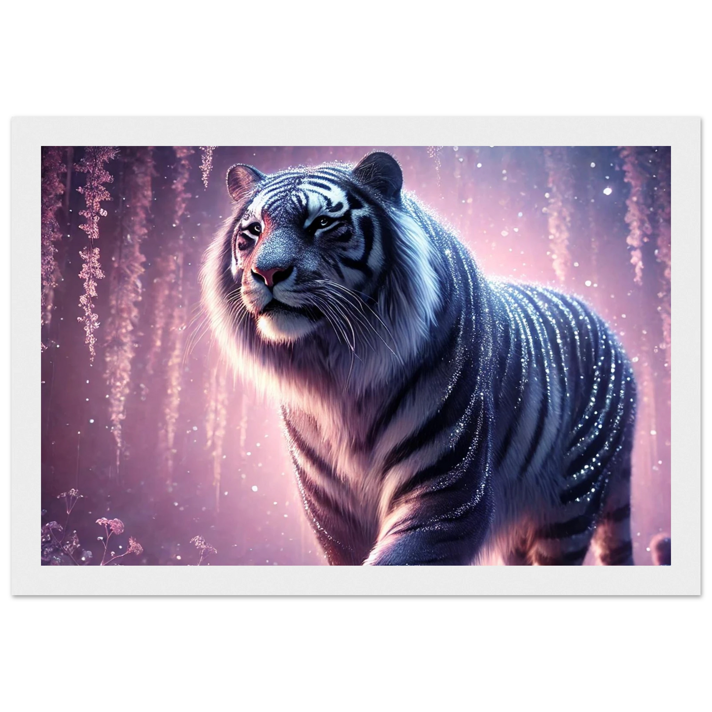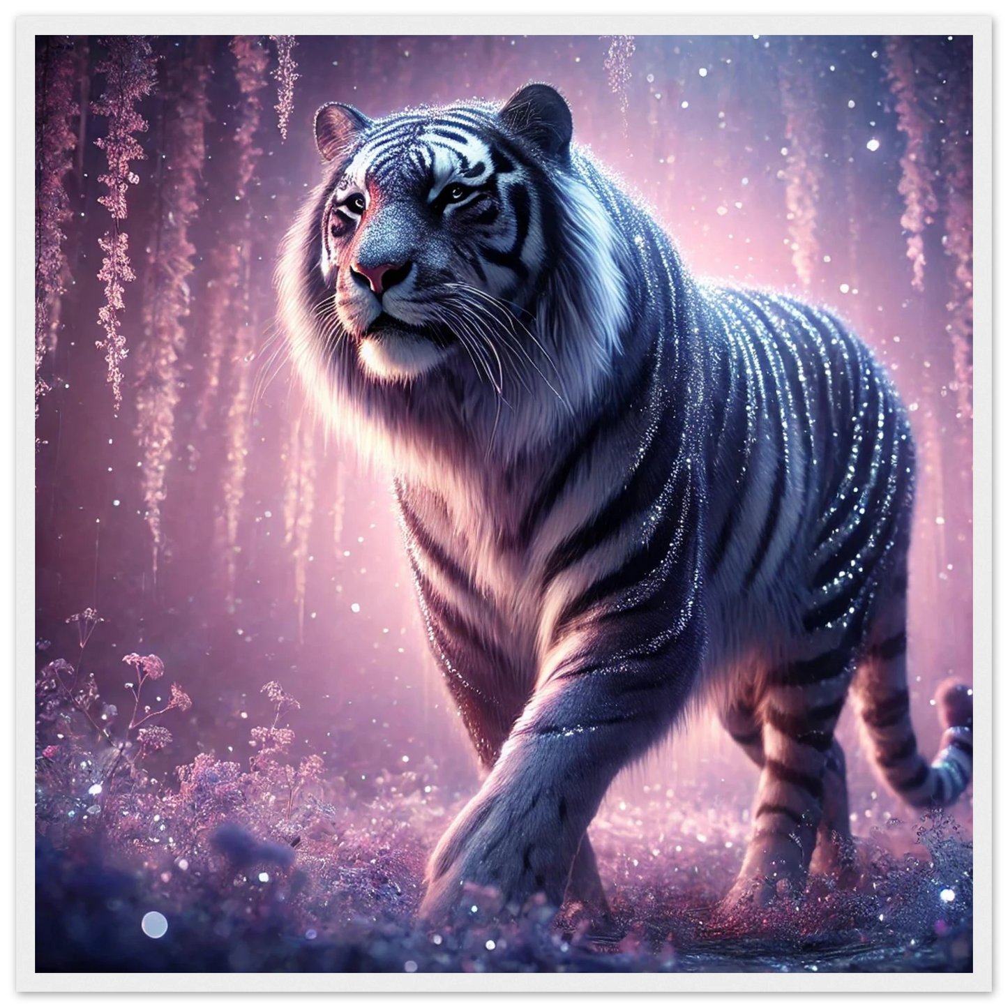 Nyaro ist ein silberner Tiger, dessen Fell wie von funkelndem Kristallstaub überzogen ist. Er wandelt durch einen Traumwald voller hängender Kristallblüten und schimmerndem Nebel. Als Hüter der Stille schenkt er Harmonie und inneren Frieden – und wer ihm begegnet, trägt seine Weisheit still im Herzen.