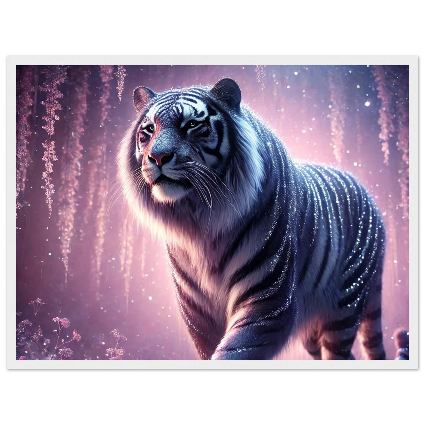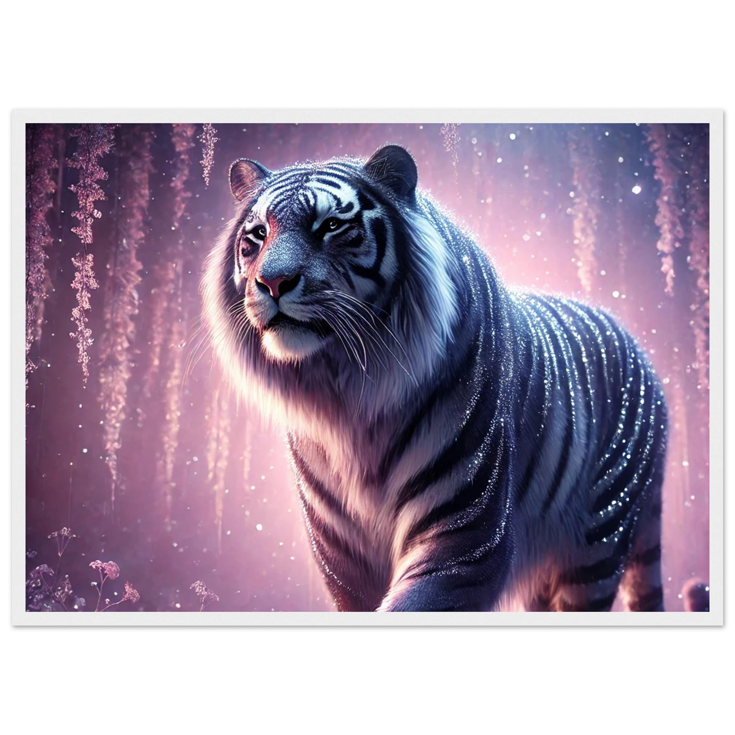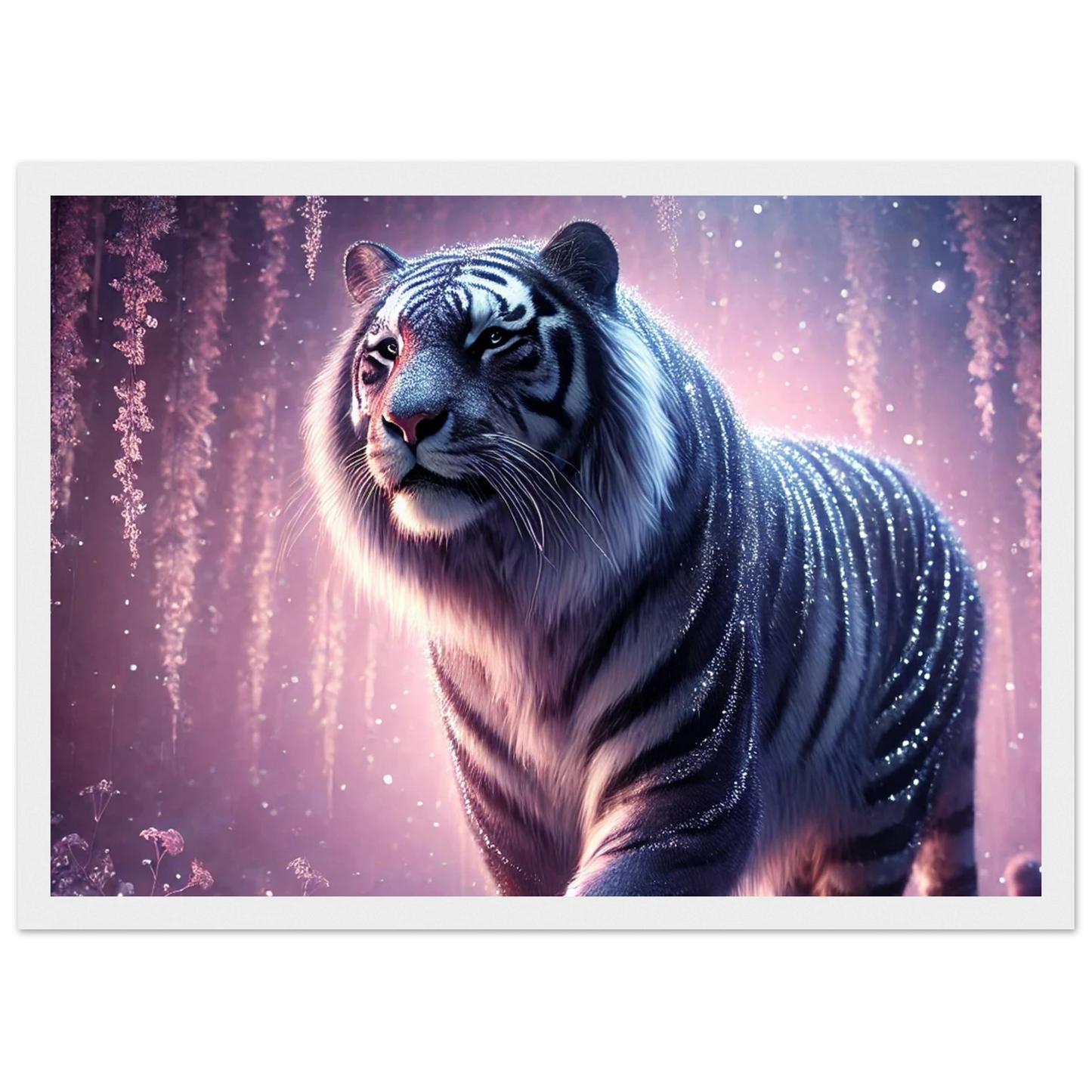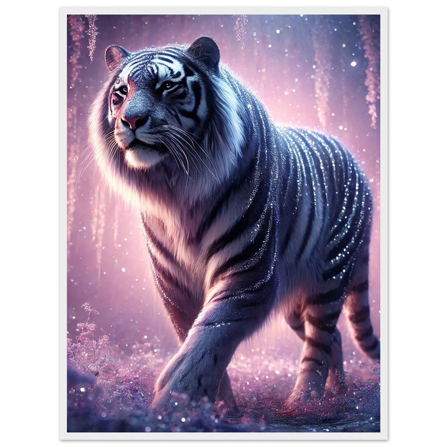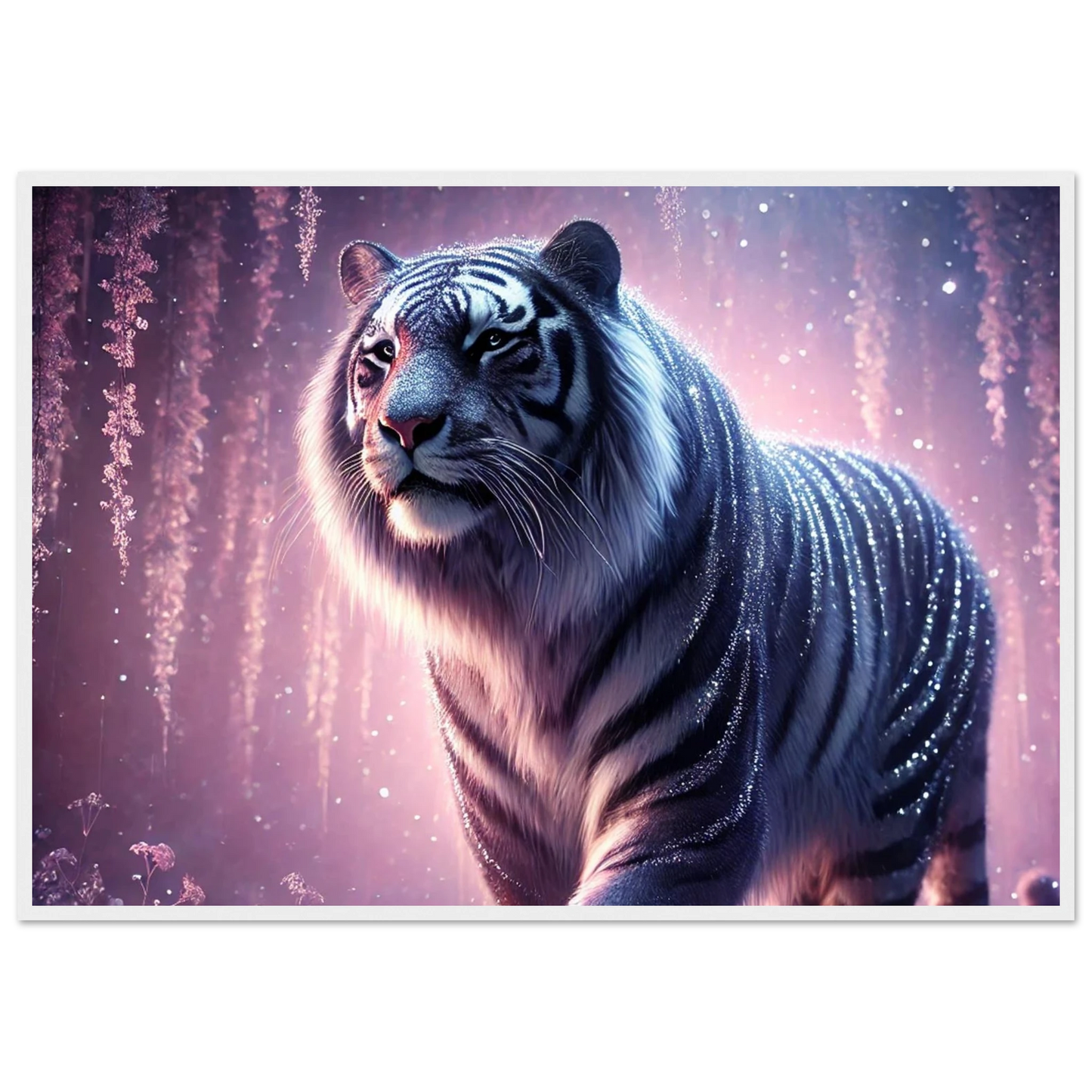 Nyaro ist ein silberner Tiger, dessen Fell wie von funkelndem Kristallstaub überzogen ist. Er wandelt durch einen Traumwald voller hängender Kristallblüten und schimmerndem Nebel. Als Hüter der Stille schenkt er Harmonie und inneren Frieden – und wer ihm begegnet, trägt seine Weisheit still im Herzen.