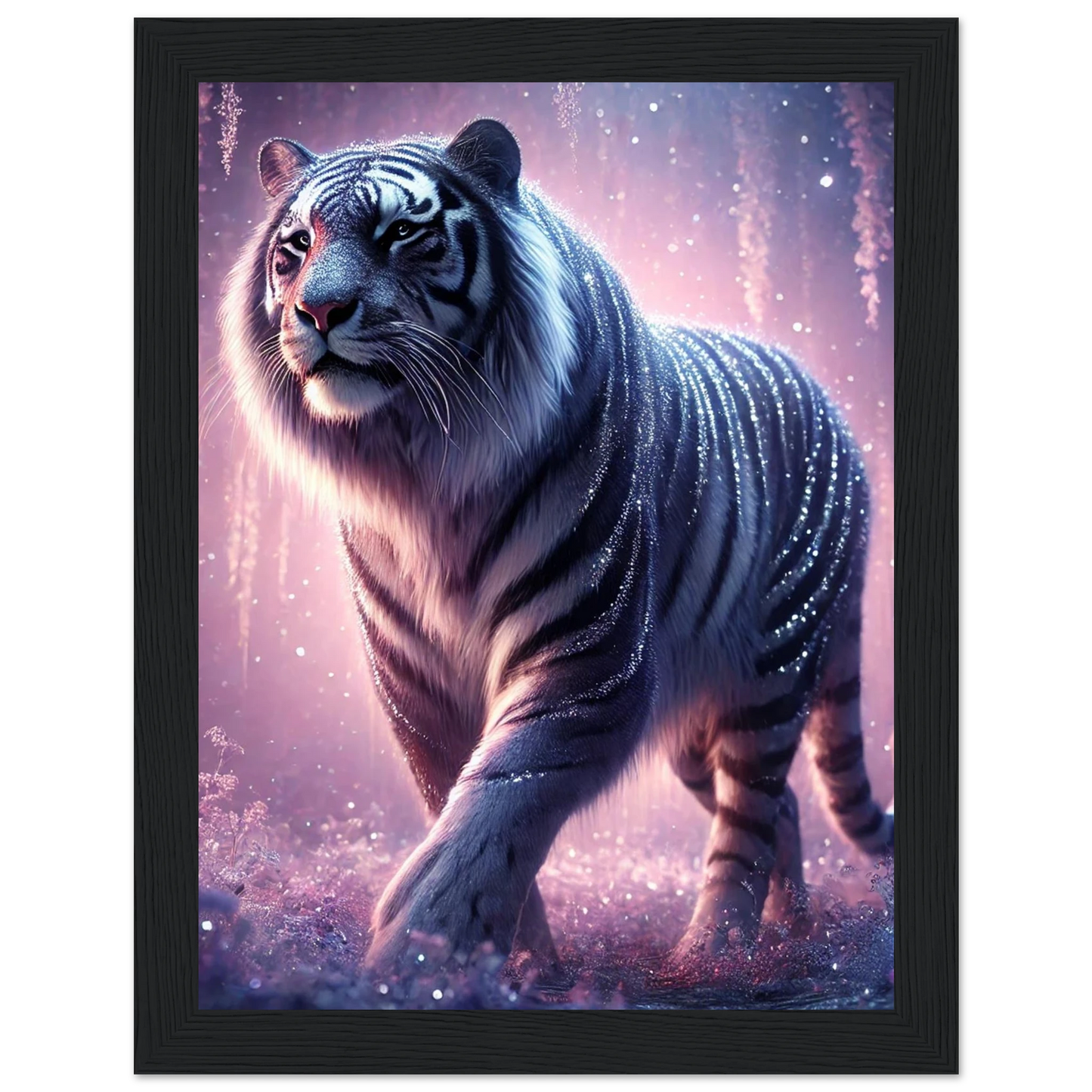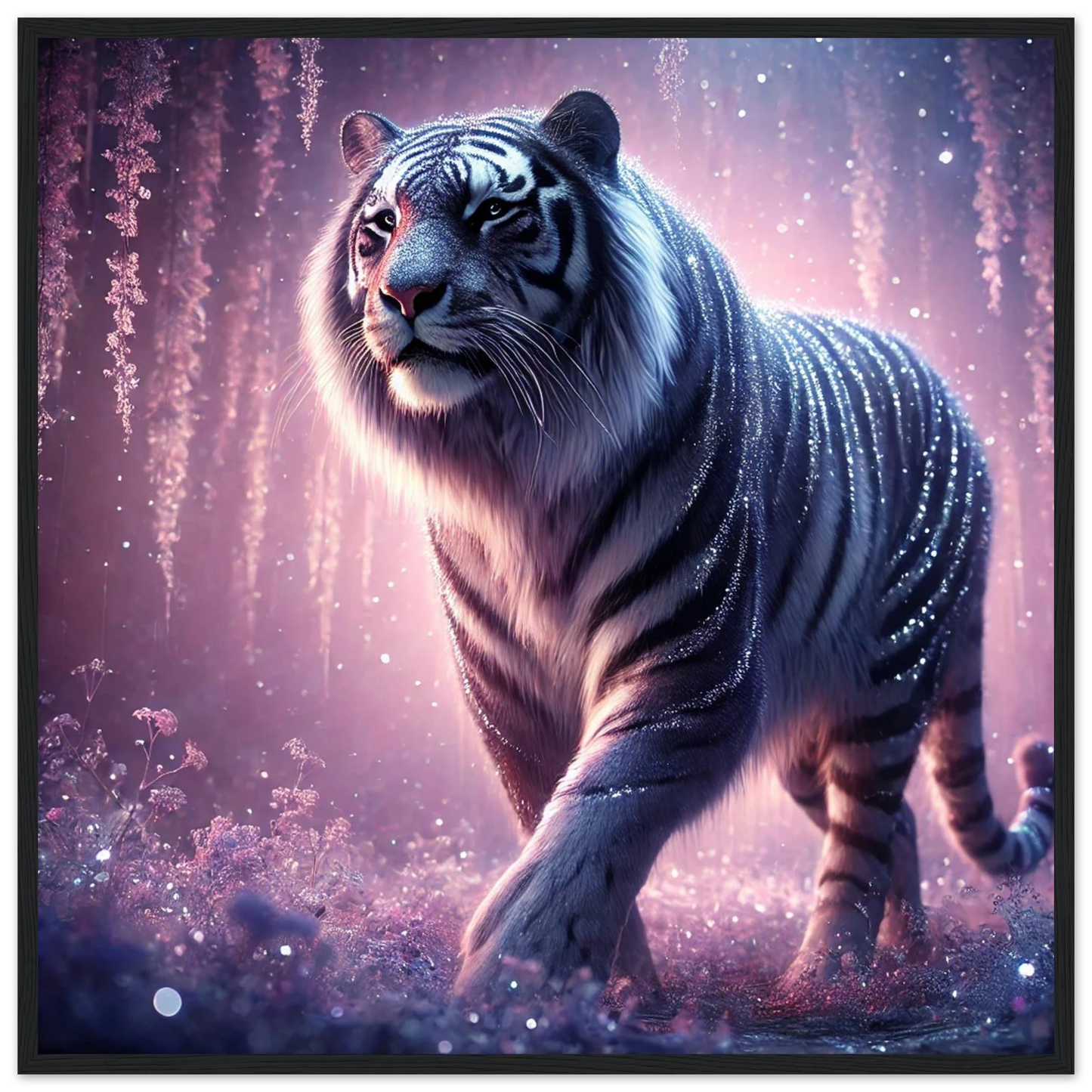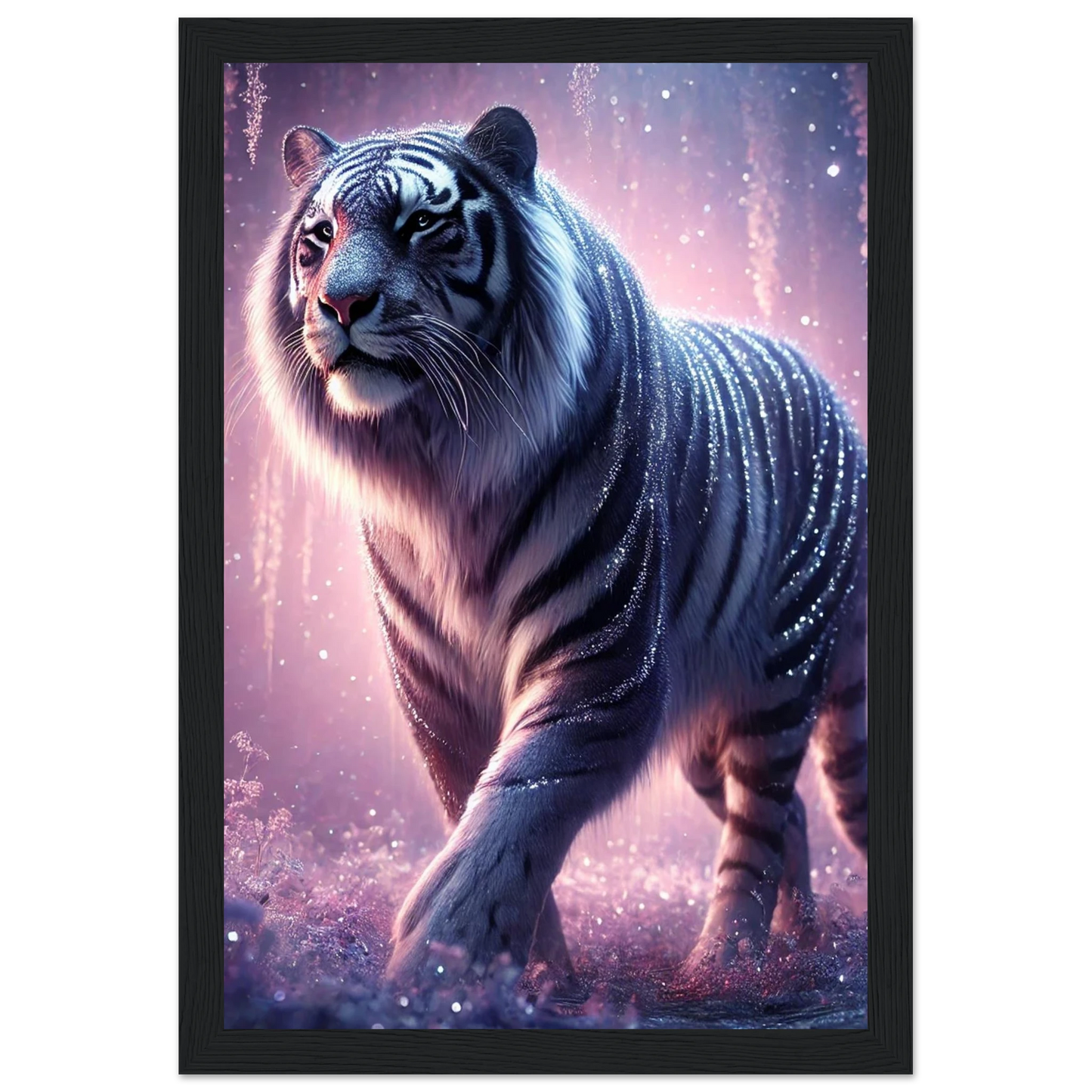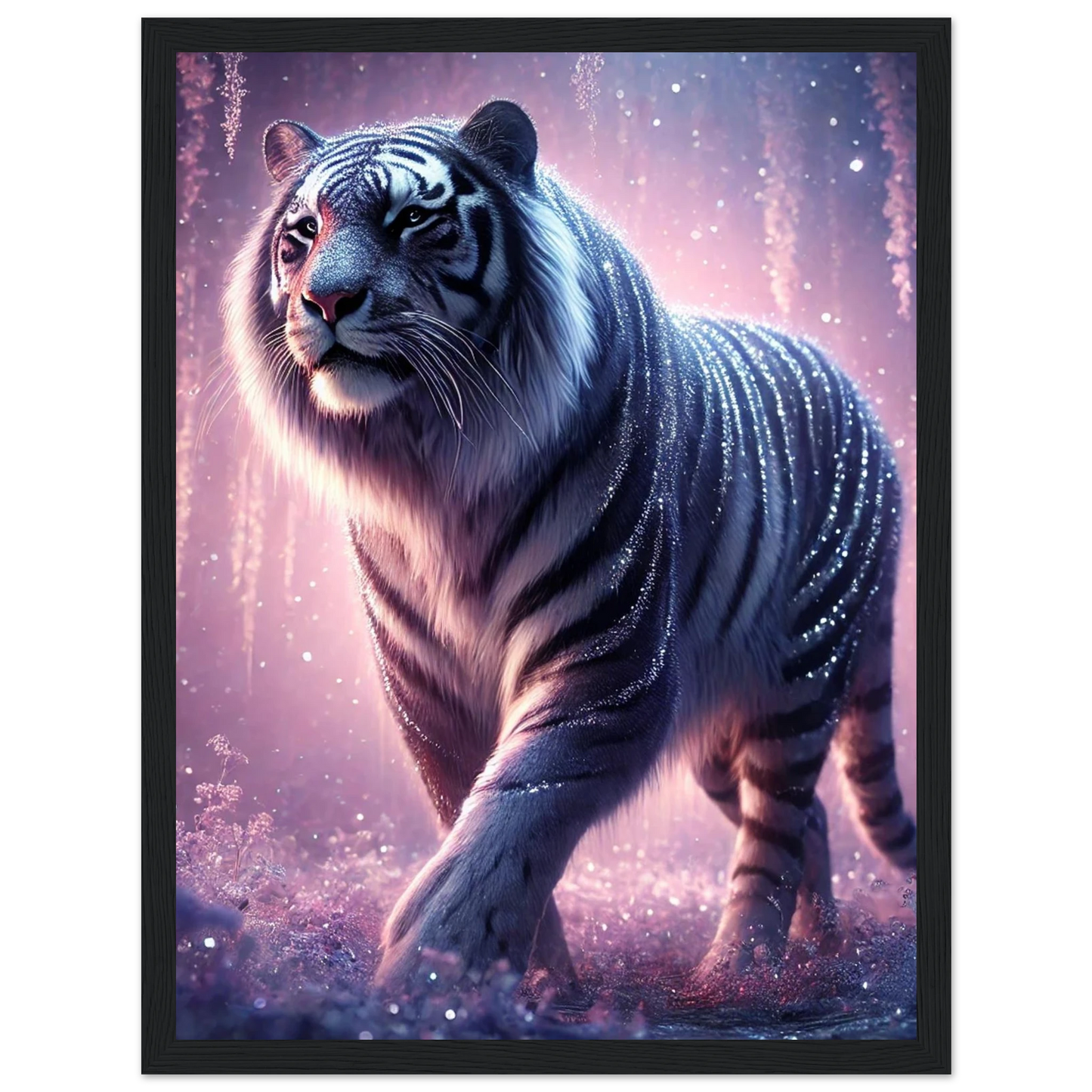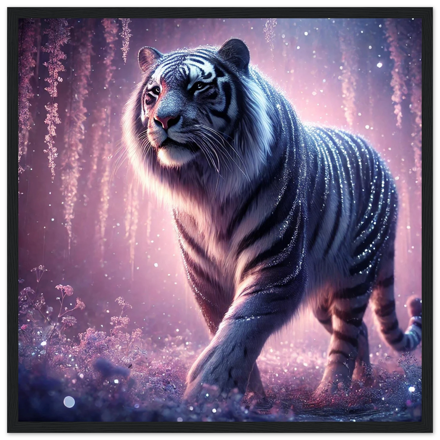 Nyaro ist ein silberner Tiger, dessen Fell wie von funkelndem Kristallstaub überzogen ist. Er wandelt durch einen Traumwald voller hängender Kristallblüten und schimmerndem Nebel. Als Hüter der Stille schenkt er Harmonie und inneren Frieden – und wer ihm begegnet, trägt seine Weisheit still im Herzen.